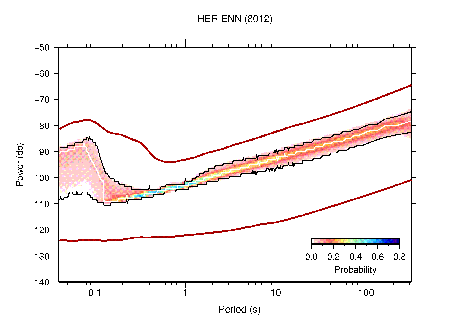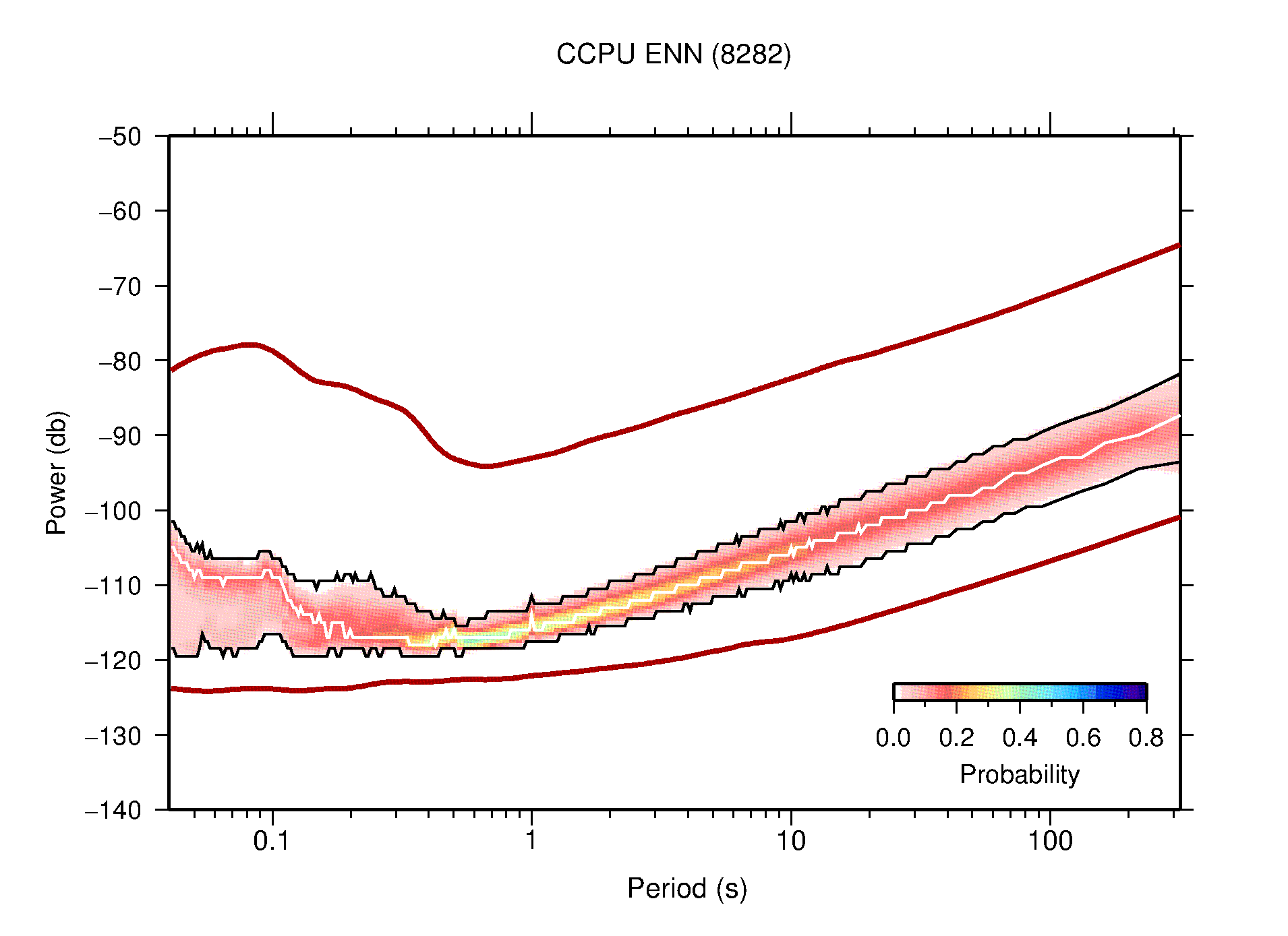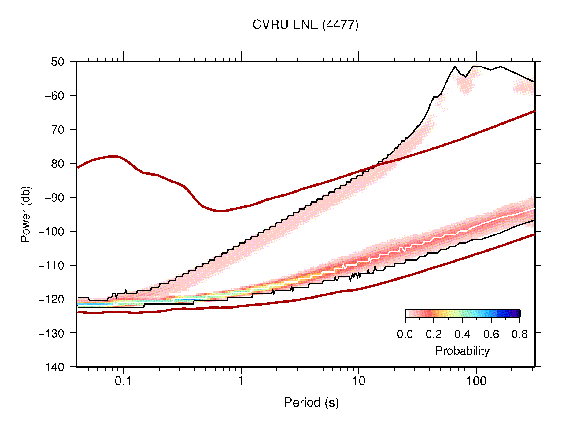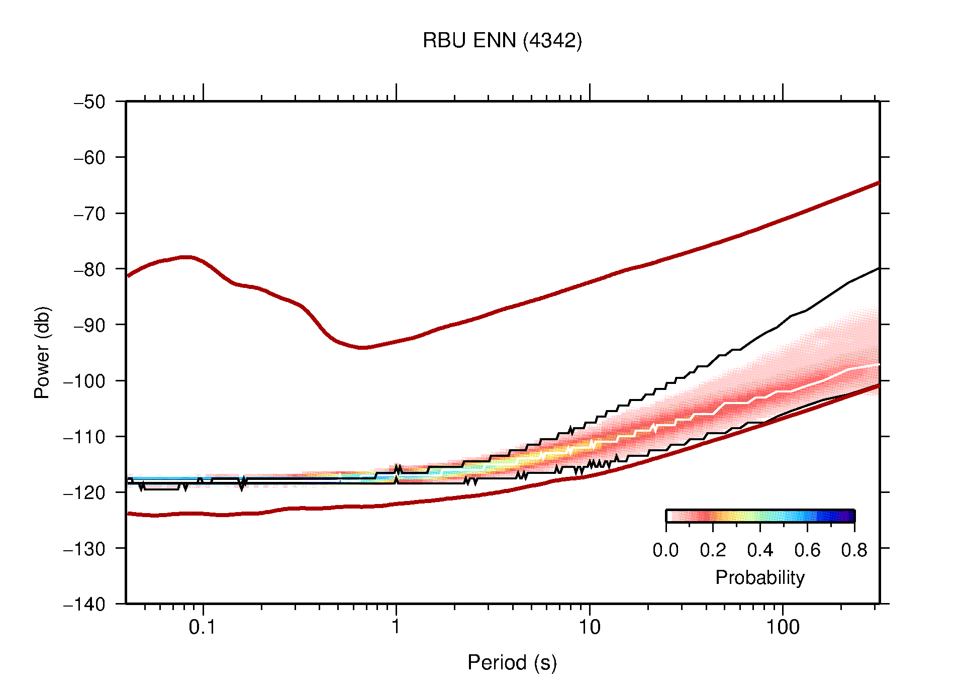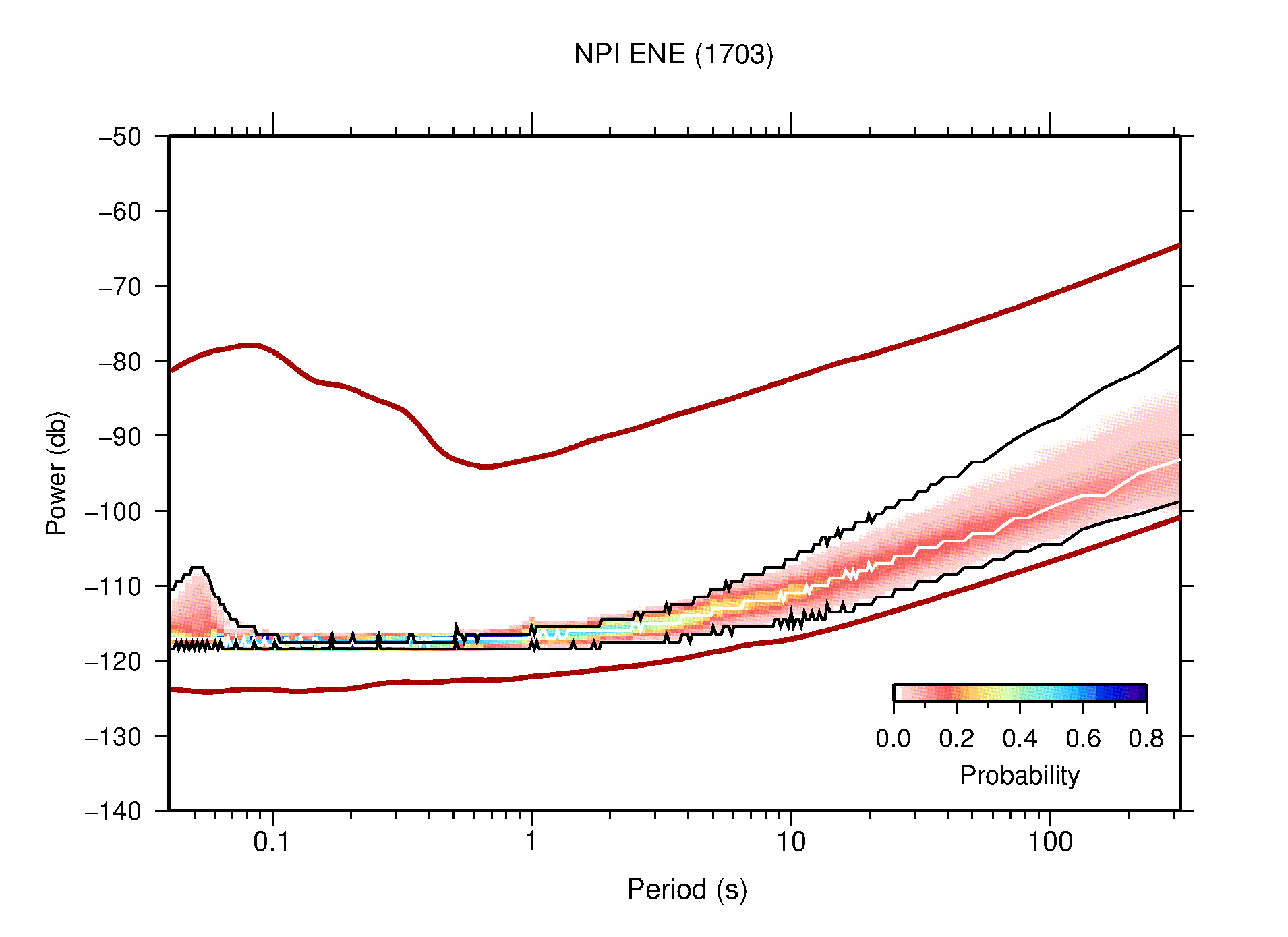 The following figures are full year PDFs for each of the 363 channels processed in this work. The same color scale is used thoughout. The black curves show 0.5 and 99.5 percentiles while the white curve shows the mode. The number of PSDs contributing to the PDF is shown in parentheses next to the station and channel names. The y-axes represent spectral acceleration amplitudes in units of db relative to 1 m/s2 [10log10(m2/s4/Hz)]. The five channels that were not included in the network PDF because of known problems were CCUT ENE,N,Z; HCSU ENE; and HER ENE.