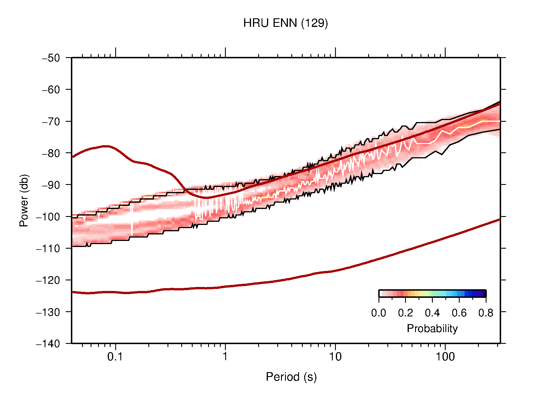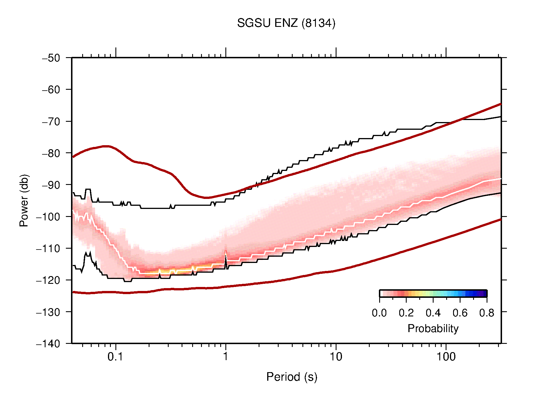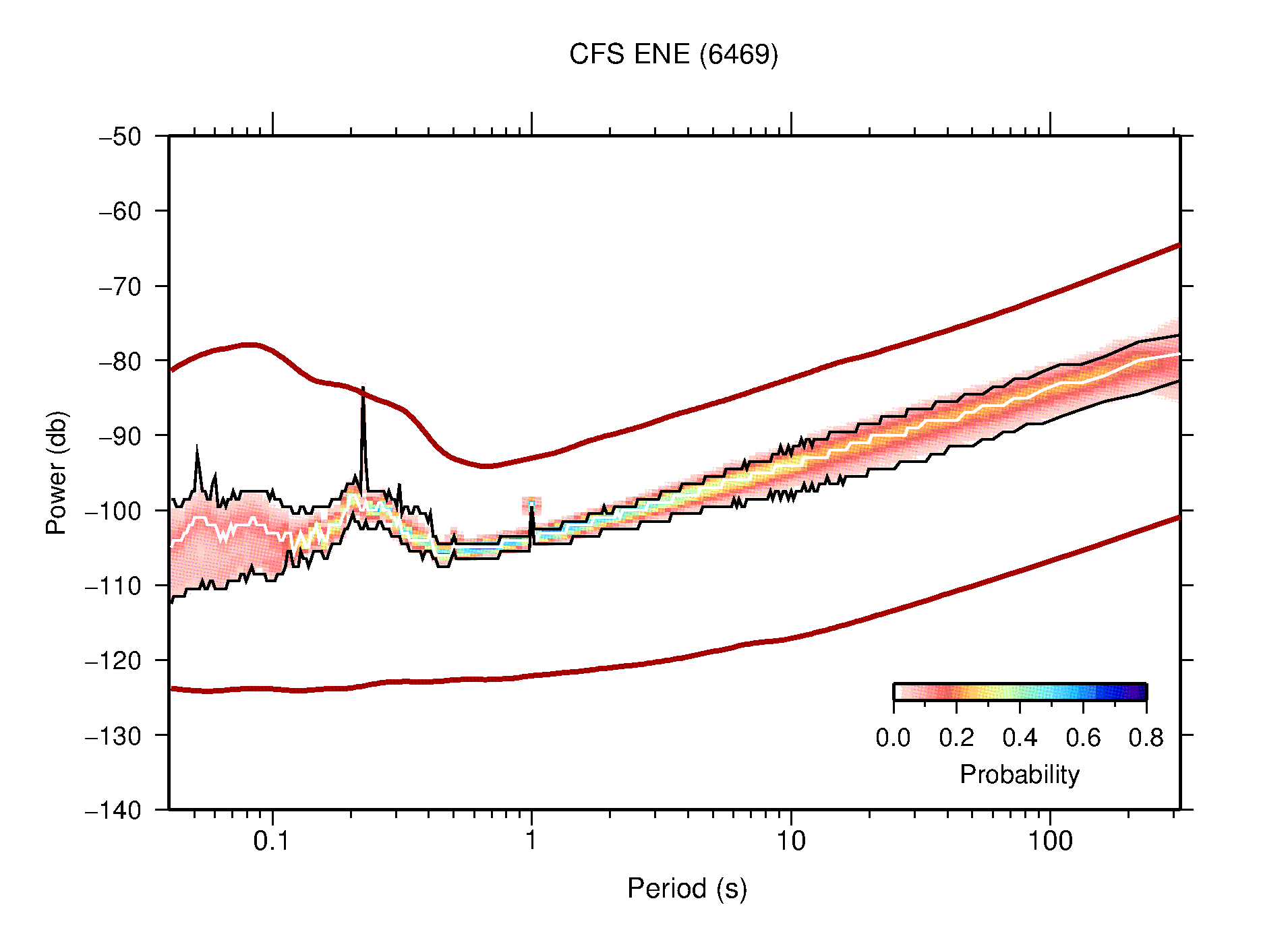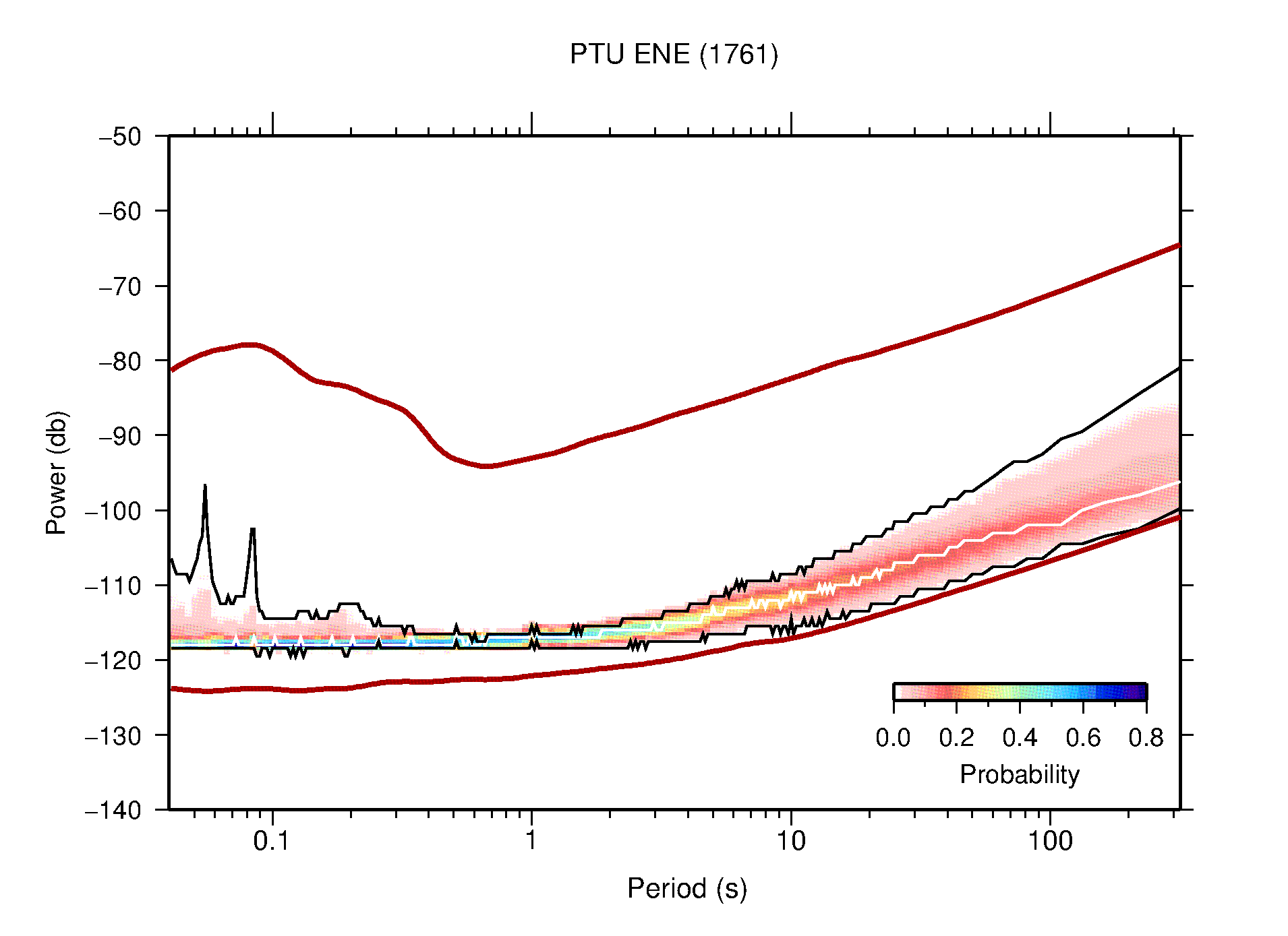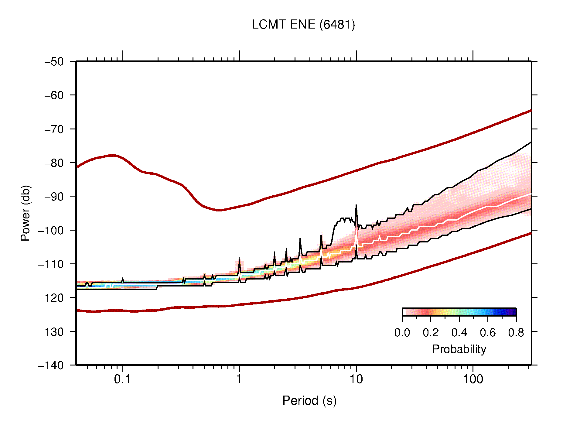 The following figures are full year PDFs for each of the 363 channels processed in this work. The same color scale is used thoughout. The black curves show 0.5 and 99.5 percentiles while the white curve shows the mode. The number of PSDs contributing to the PDF is shown in parentheses next to the station and channel names. The y-axes represent spectral acceleration amplitudes in units of db relative to 1 m/s2 [10log10(m2/s4/Hz)]. The five channels that were not included in the network PDF because of known problems were CCUT ENE,N,Z; HCSU ENE; and HER ENE.
