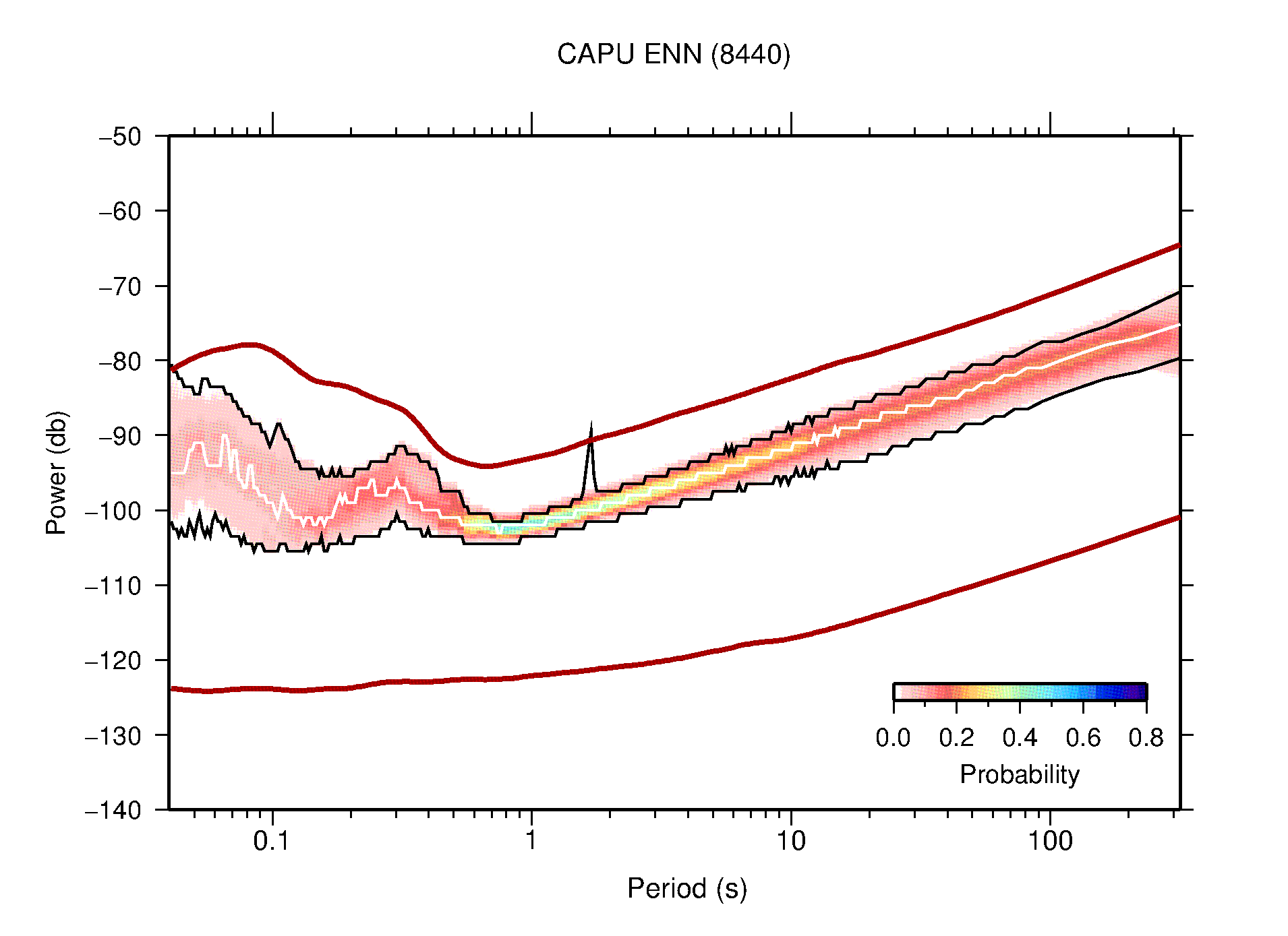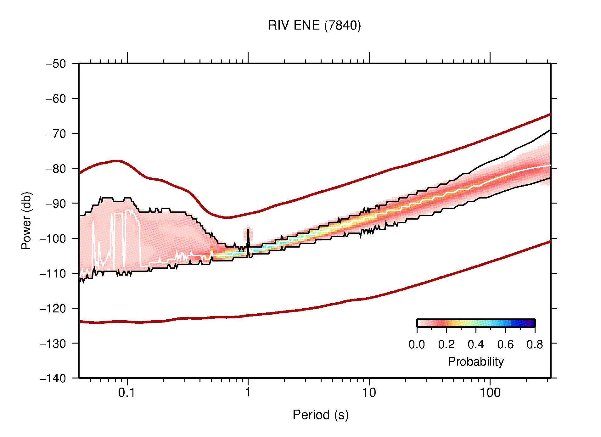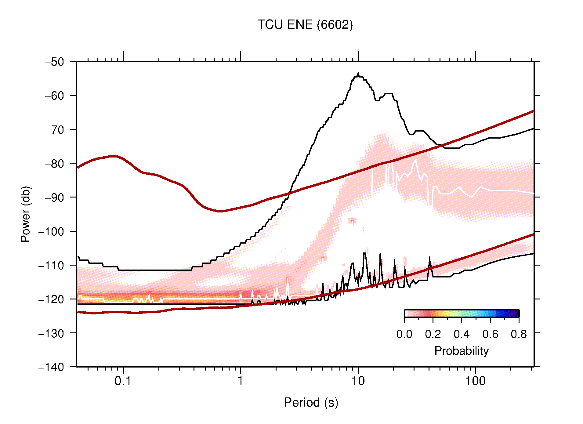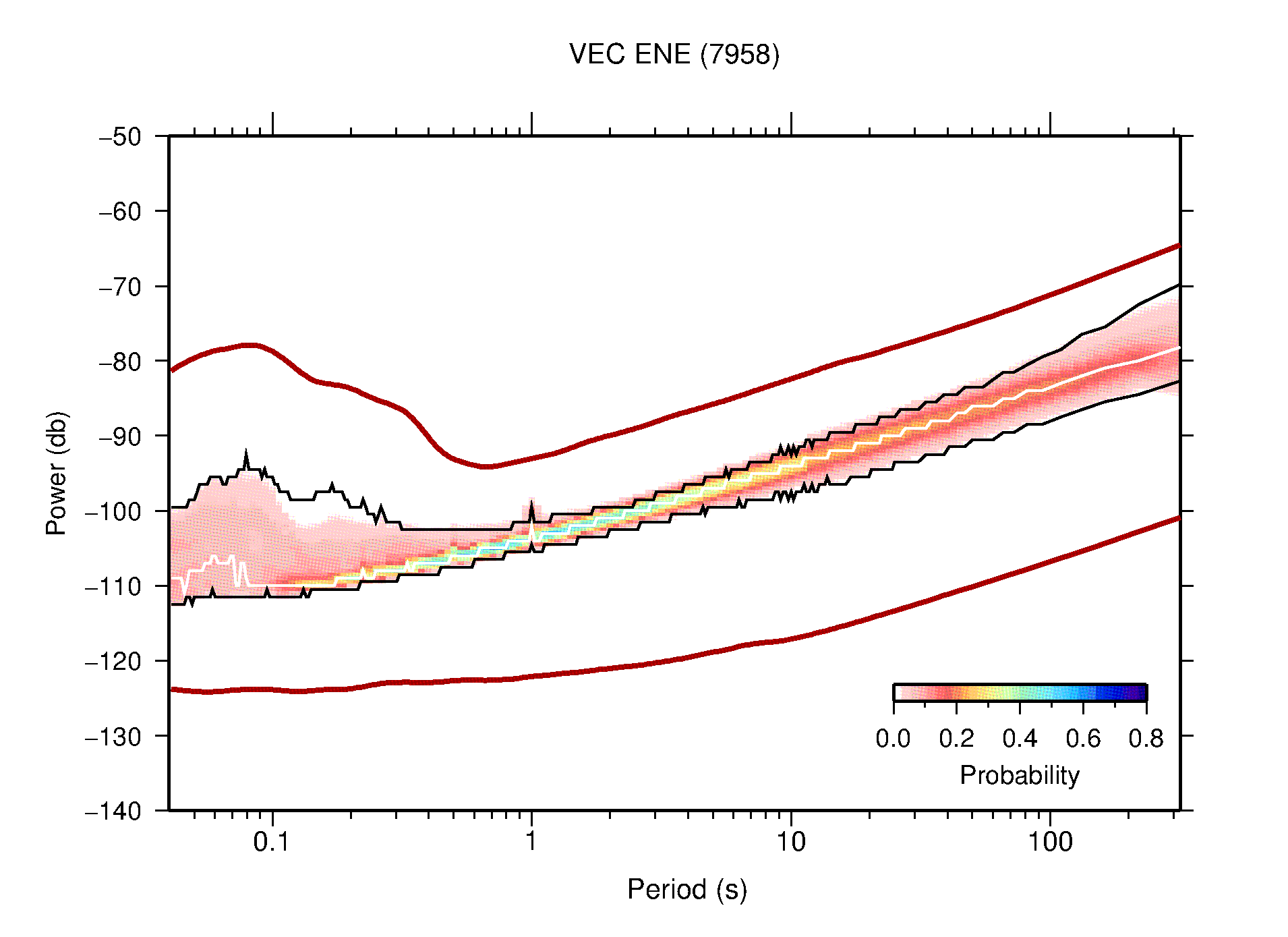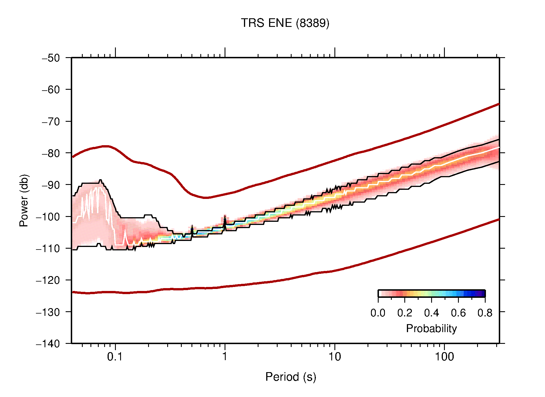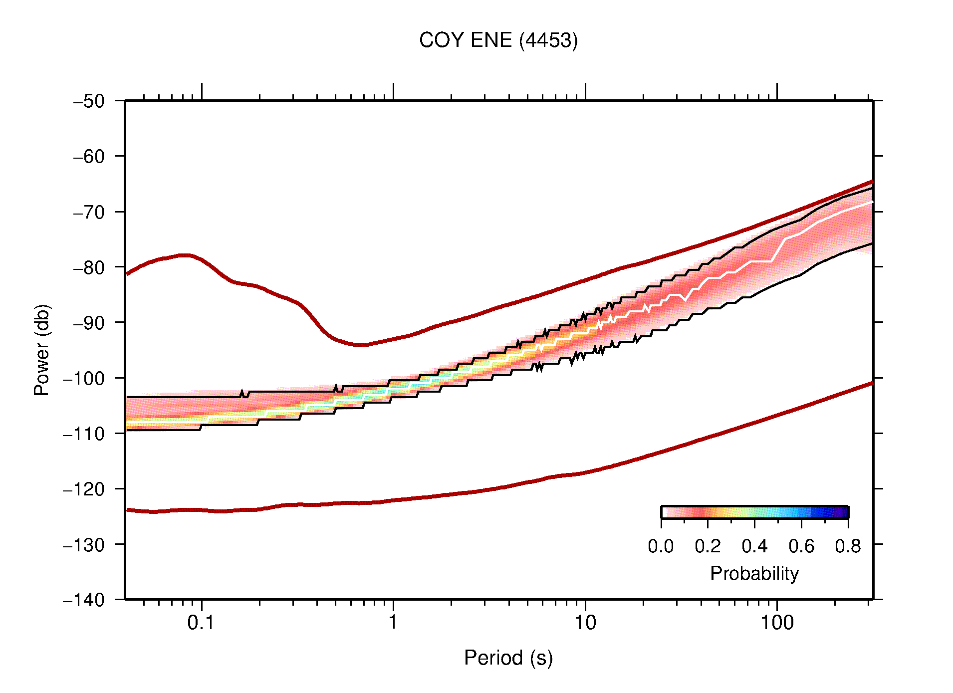 The following figures are full year PDFs for each of the 363 channels processed in this work. The same color scale is used thoughout. The black curves show 0.5 and 99.5 percentiles while the white curve shows the mode. The number of PSDs contributing to the PDF is shown in parentheses next to the station and channel names. The y-axes represent spectral acceleration amplitudes in units of db relative to 1 m/s2 [10log10(m2/s4/Hz)]. The five channels that were not included in the network PDF because of known problems were CCUT ENE,N,Z; HCSU ENE; and HER ENE.