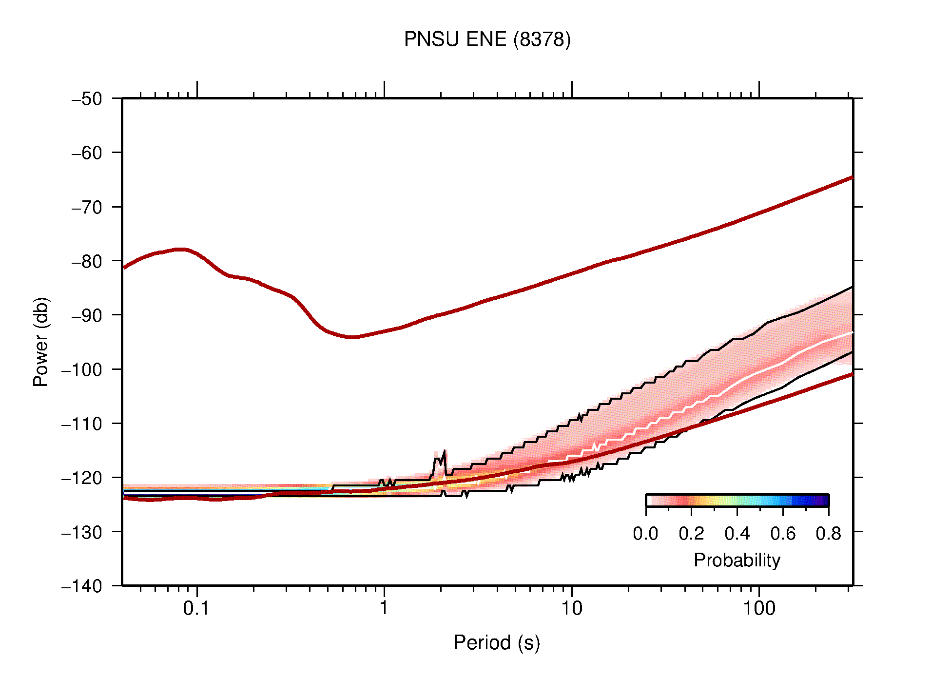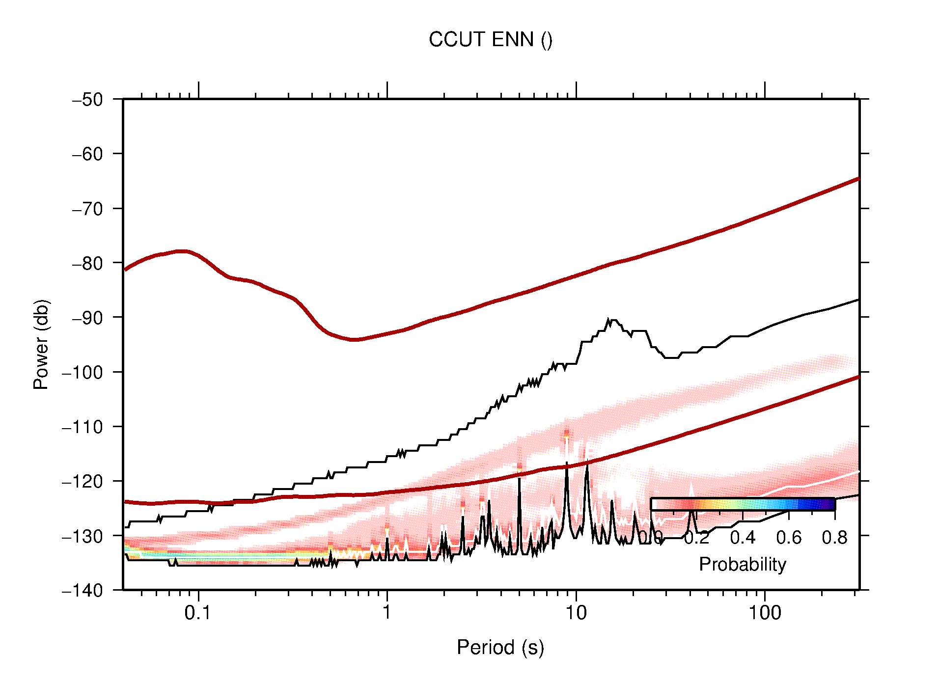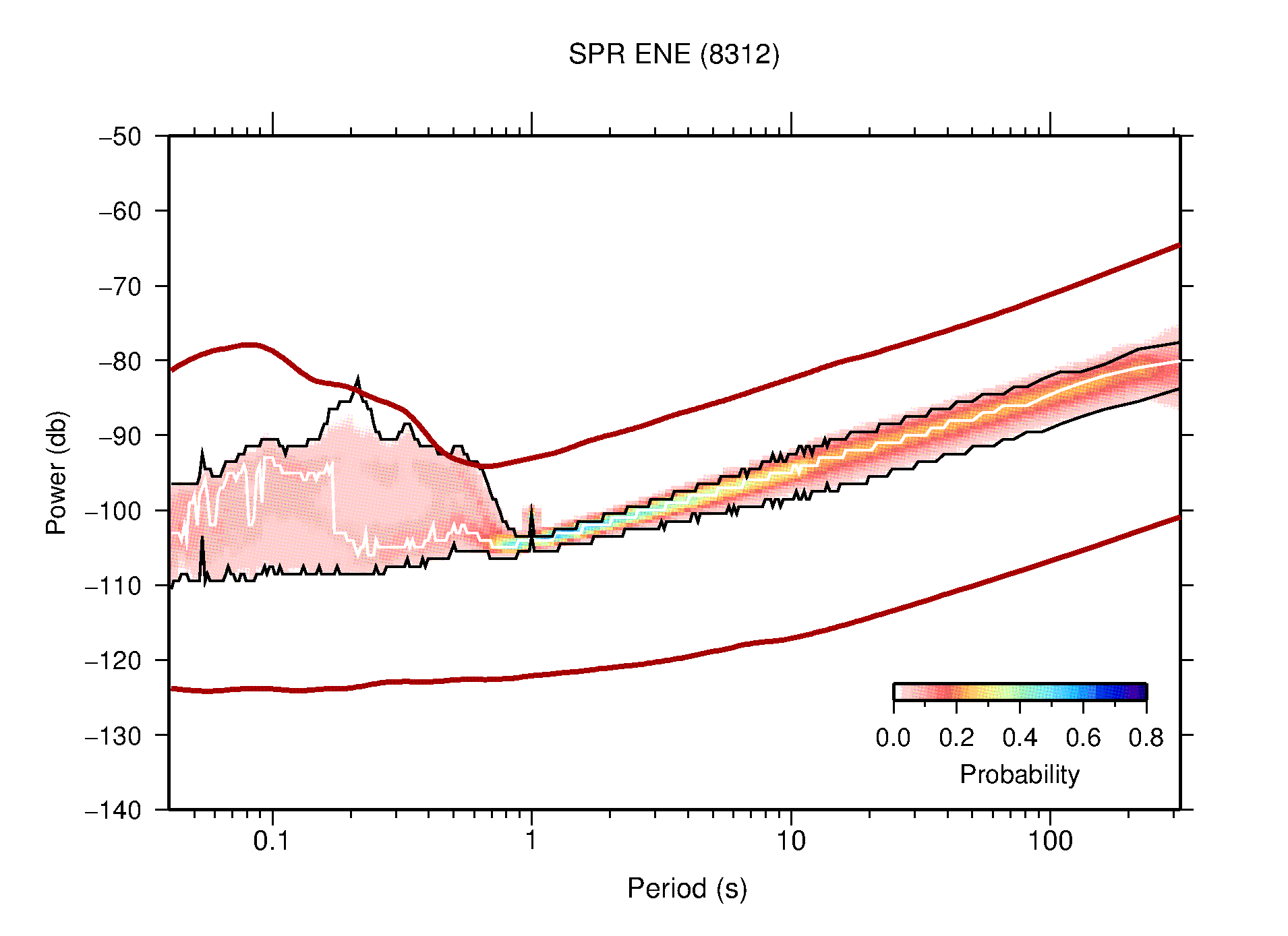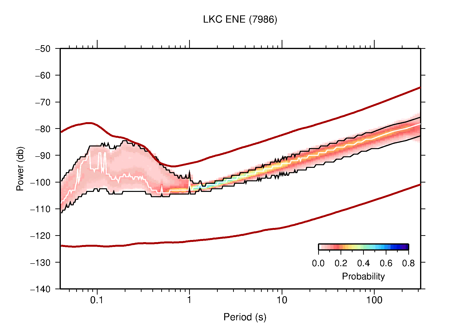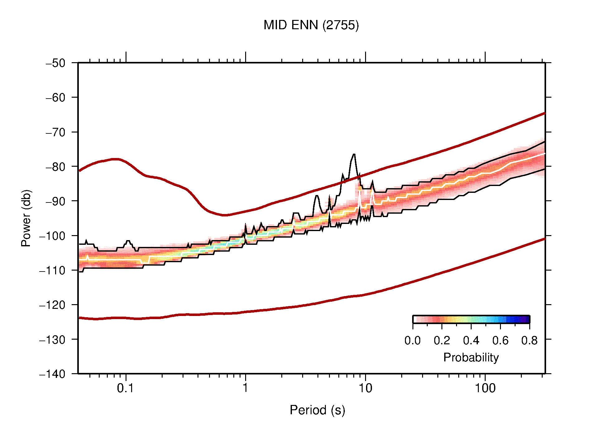 The following figures are full year PDFs for each of the 363 channels processed in this work. The same color scale is used thoughout. The black curves show 0.5 and 99.5 percentiles while the white curve shows the mode. The number of PSDs contributing to the PDF is shown in parentheses next to the station and channel names. The y-axes represent spectral acceleration amplitudes in units of db relative to 1 m/s2 [10log10(m2/s4/Hz)]. The five channels that were not included in the network PDF because of known problems were CCUT ENE,N,Z; HCSU ENE; and HER ENE.