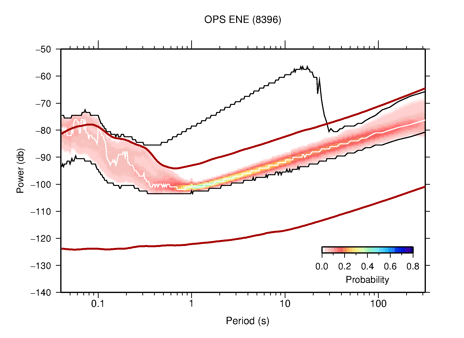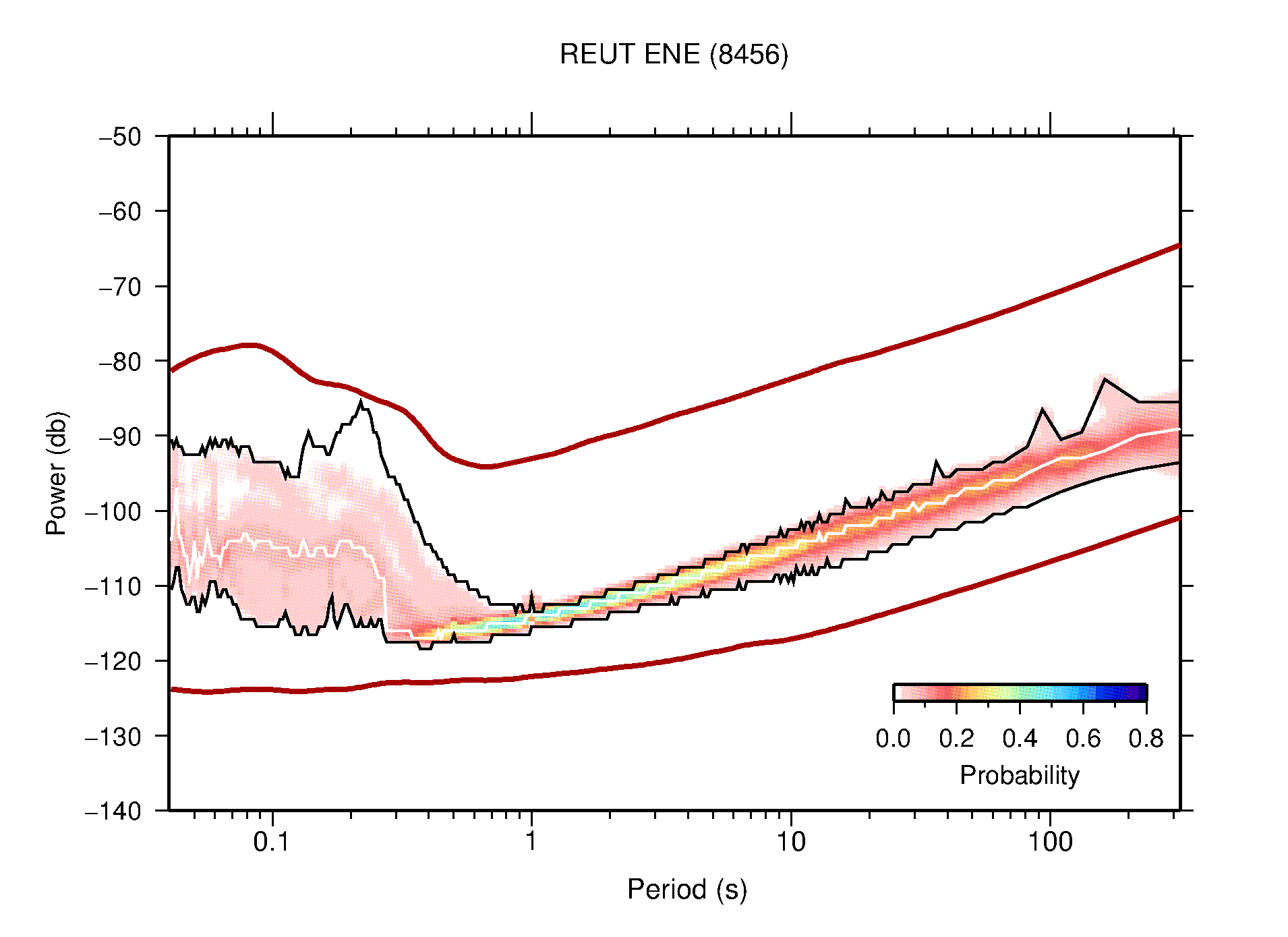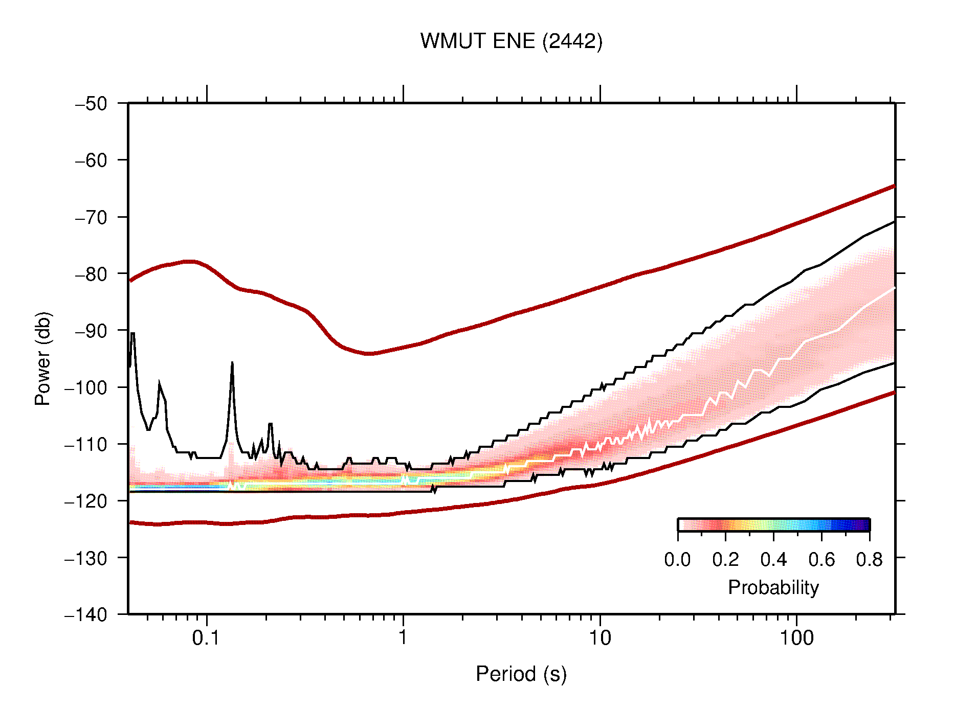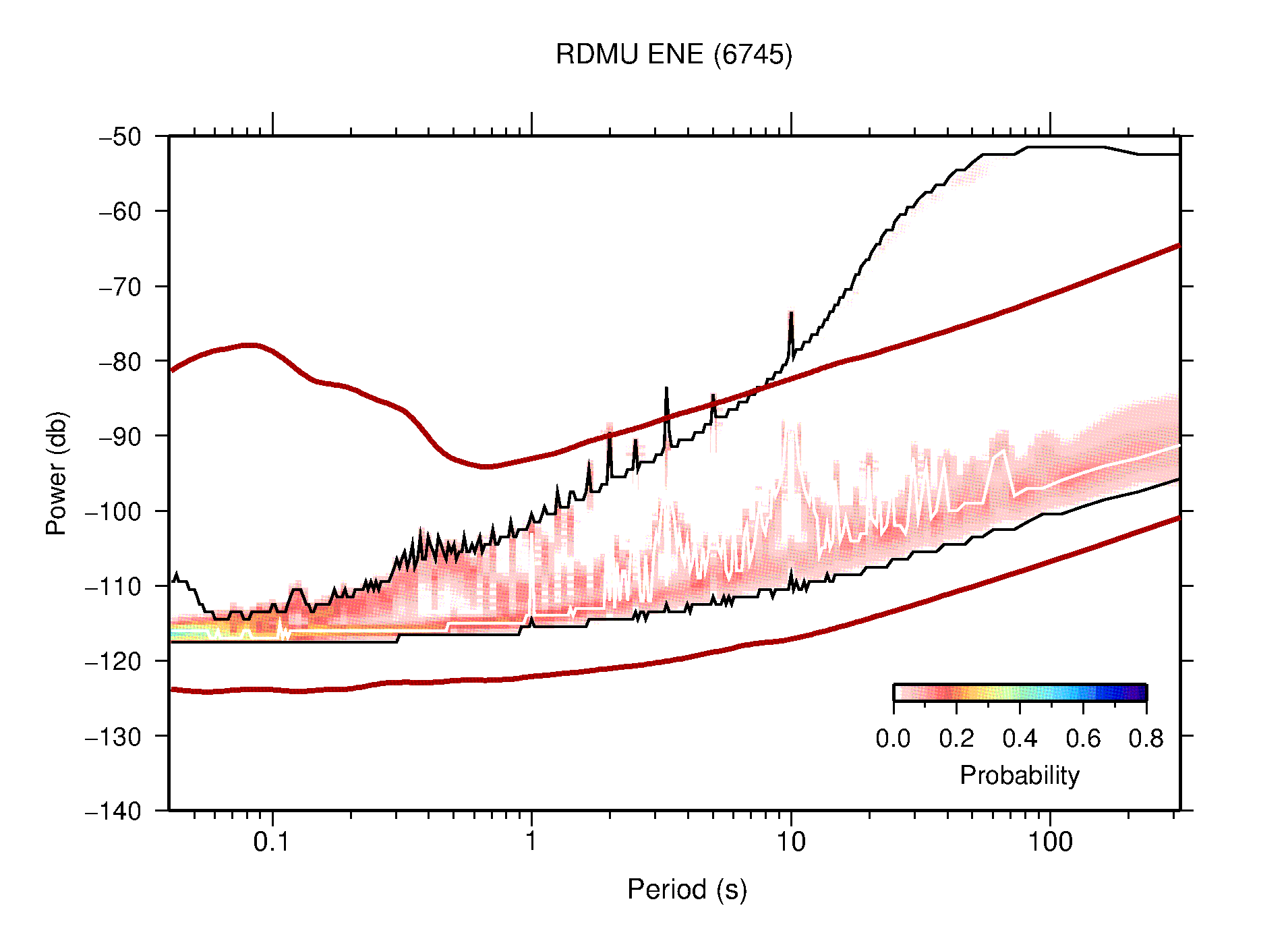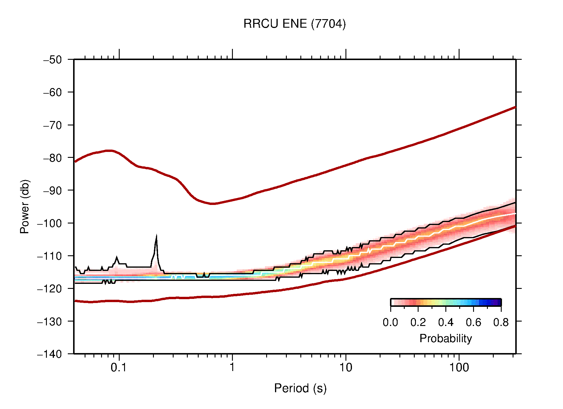 The following figures are full year PDFs for each of the 363 channels processed in this work. The same color scale is used thoughout. The black curves show 0.5 and 99.5 percentiles while the white curve shows the mode. The number of PSDs contributing to the PDF is shown in parentheses next to the station and channel names. The y-axes represent spectral acceleration amplitudes in units of db relative to 1 m/s2 [10log10(m2/s4/Hz)]. The five channels that were not included in the network PDF because of known problems were CCUT ENE,N,Z; HCSU ENE; and HER ENE.