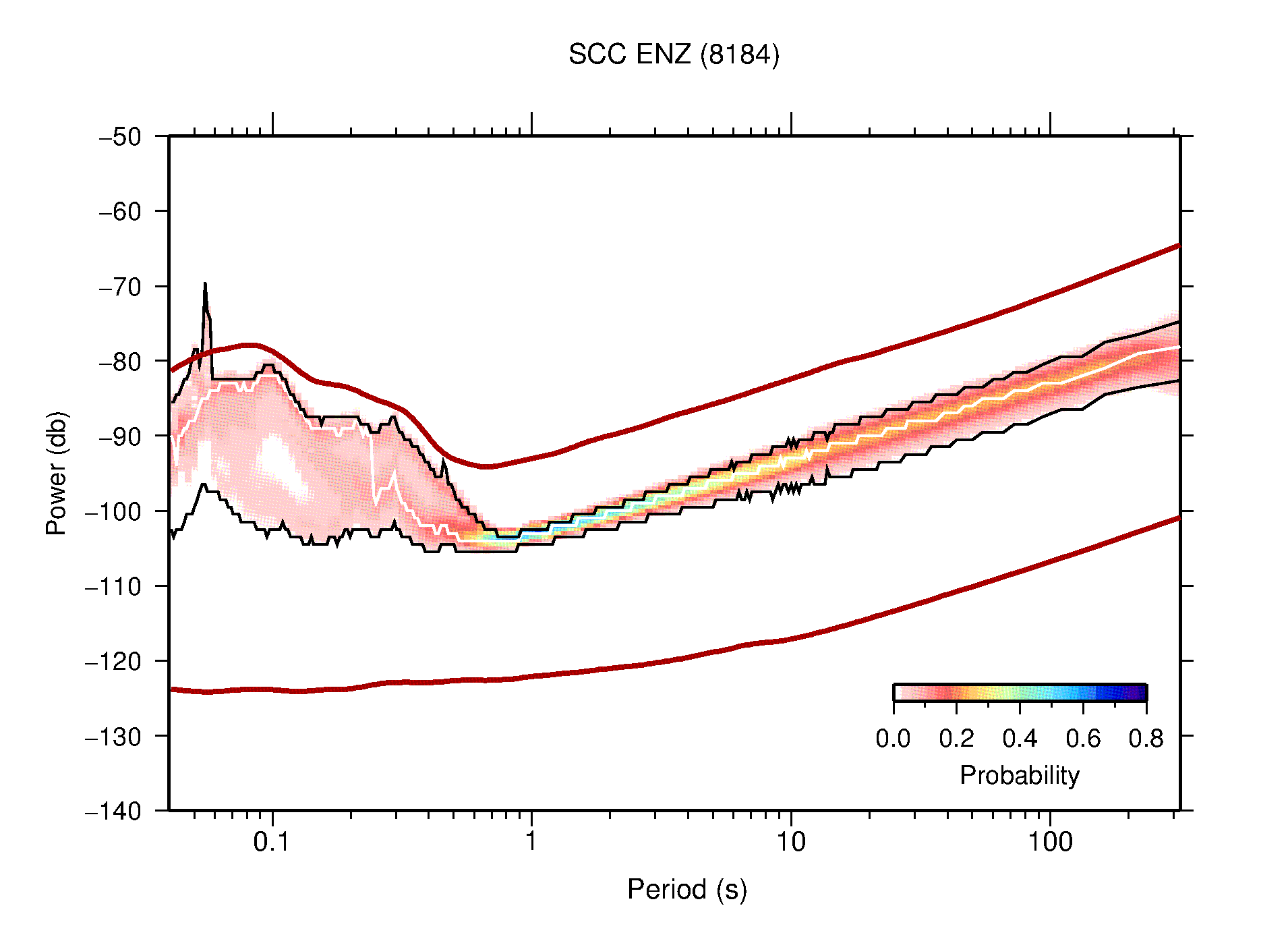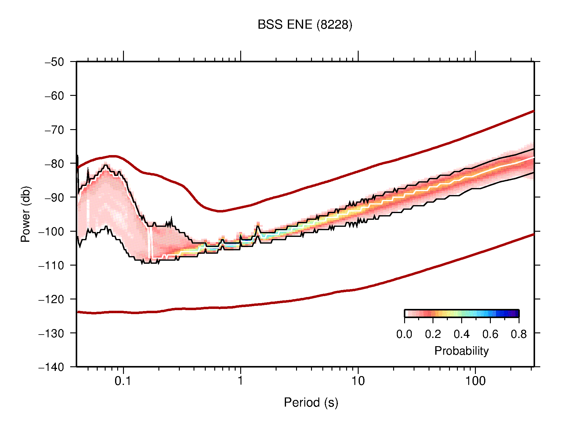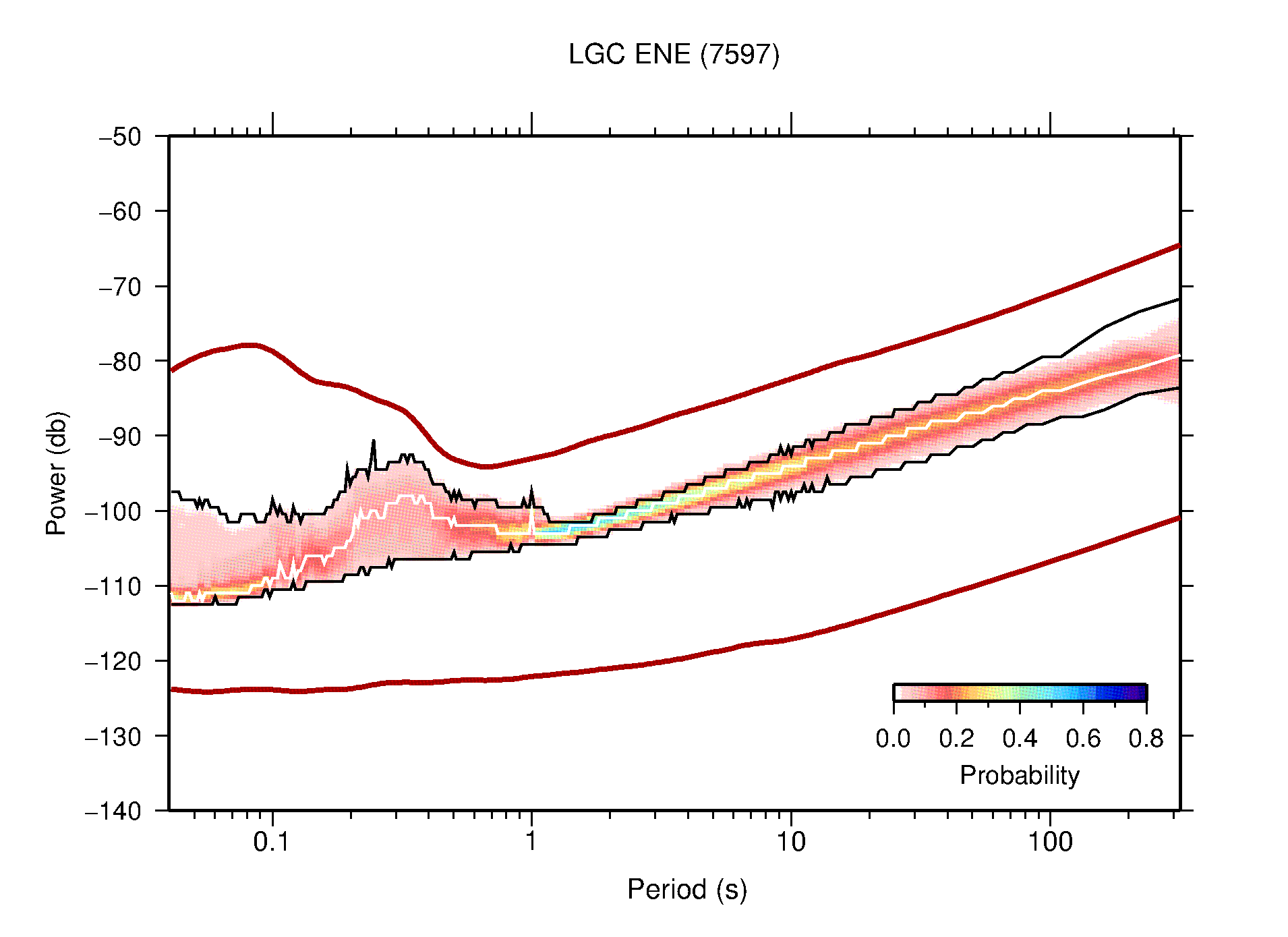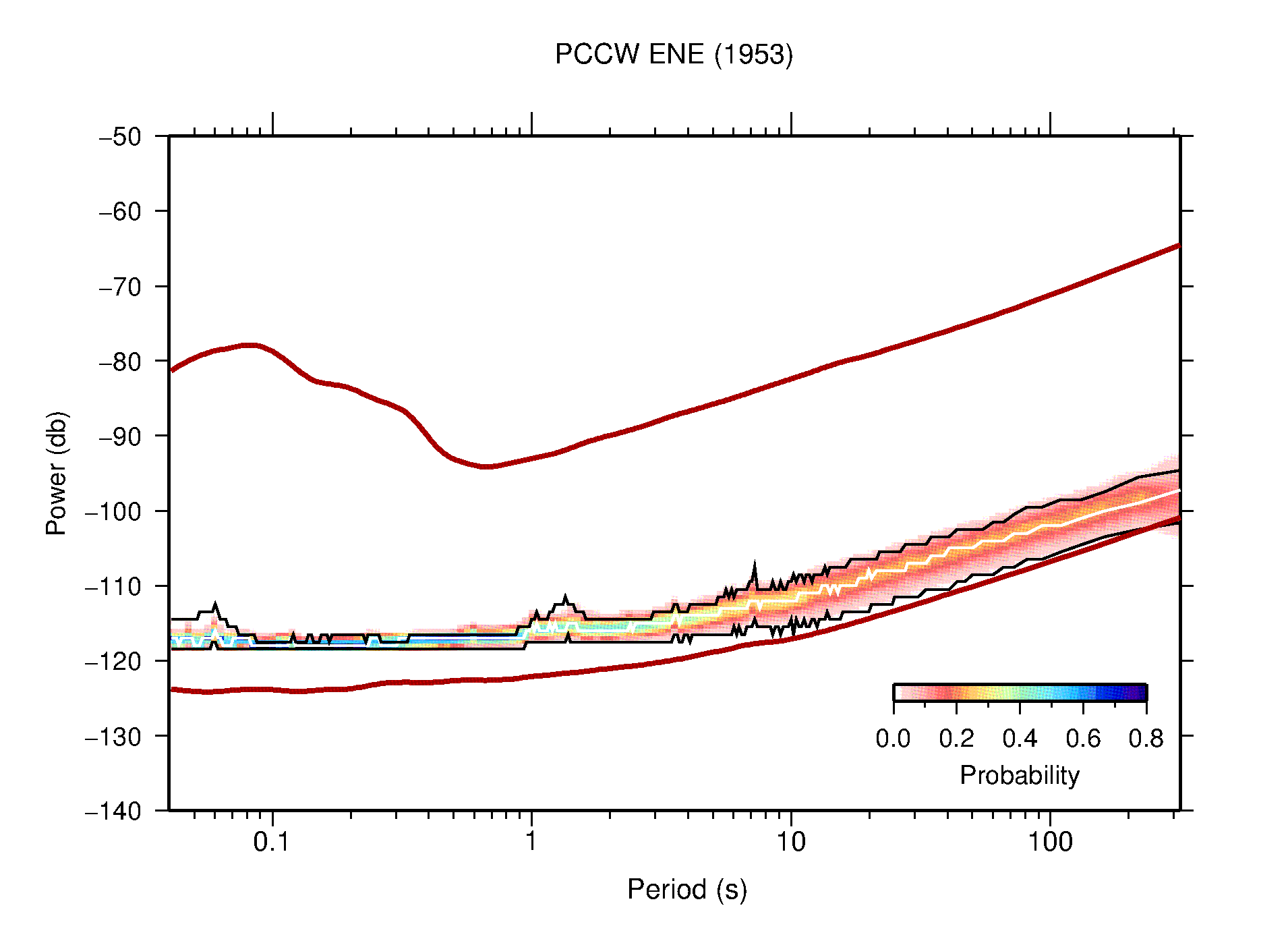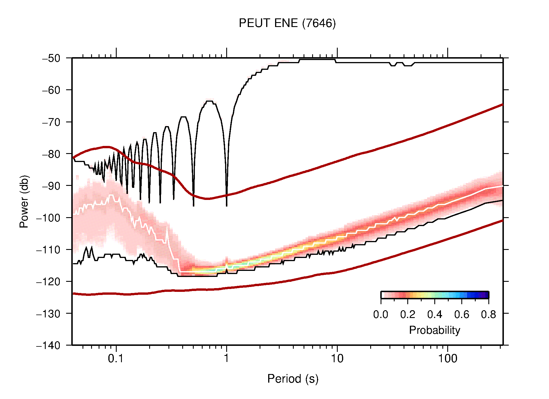 The following figures are full year PDFs for each of the 363 channels processed in this work. The same color scale is used thoughout. The black curves show 0.5 and 99.5 percentiles while the white curve shows the mode. The number of PSDs contributing to the PDF is shown in parentheses next to the station and channel names. The y-axes represent spectral acceleration amplitudes in units of db relative to 1 m/s2 [10log10(m2/s4/Hz)]. The five channels that were not included in the network PDF because of known problems were CCUT ENE,N,Z; HCSU ENE; and HER ENE.