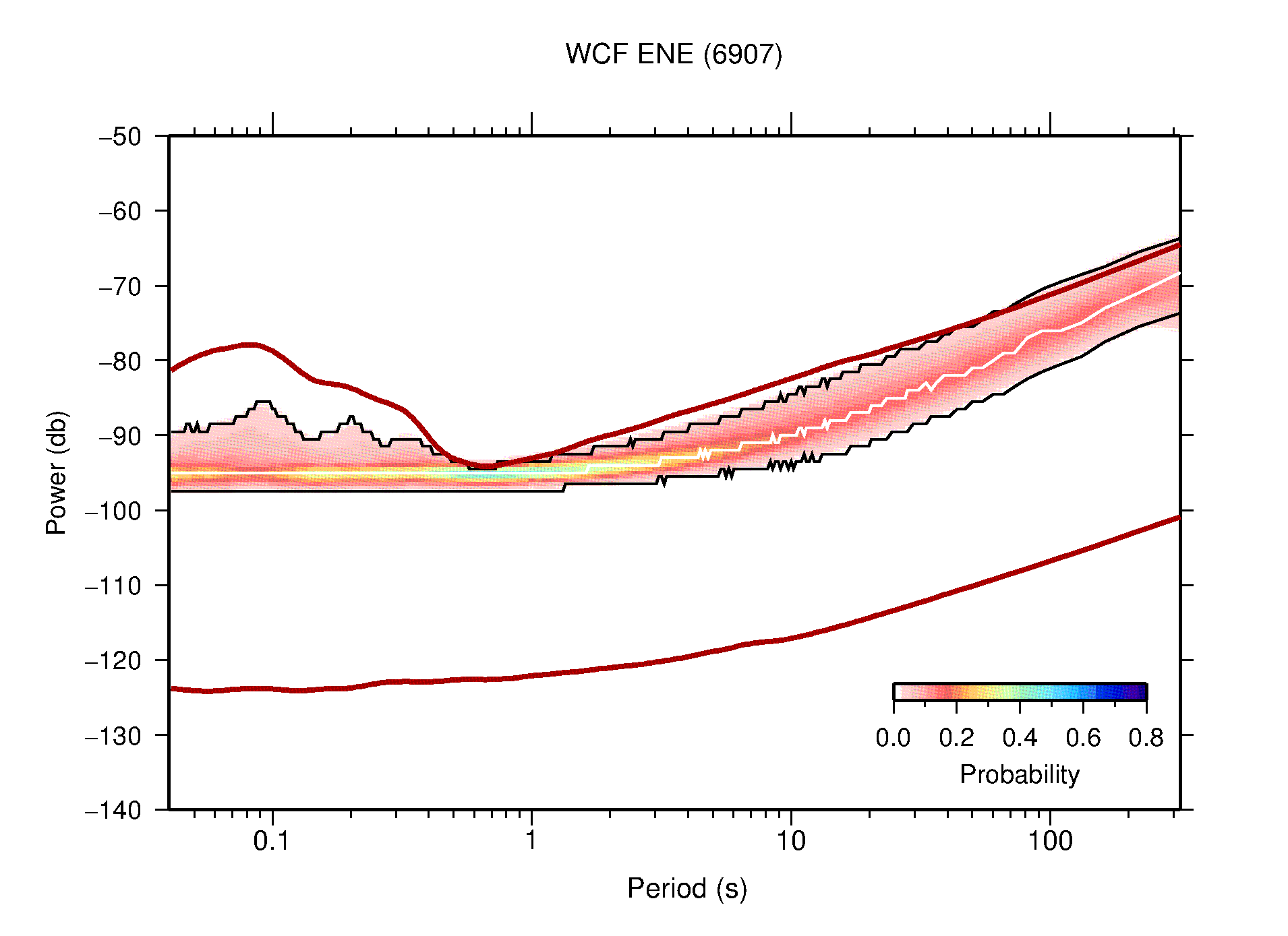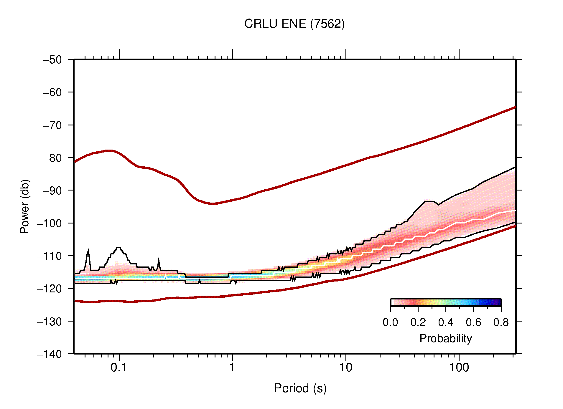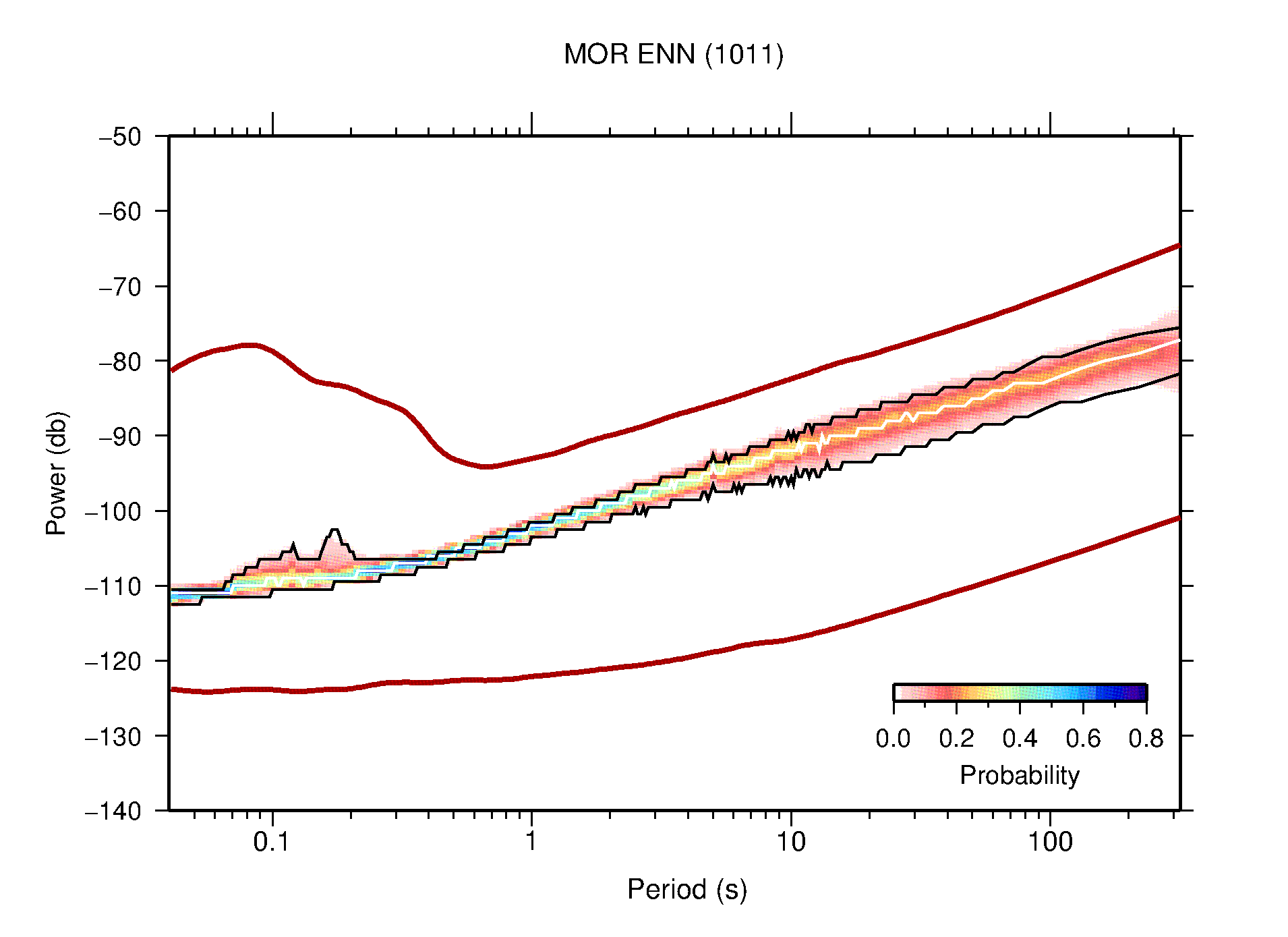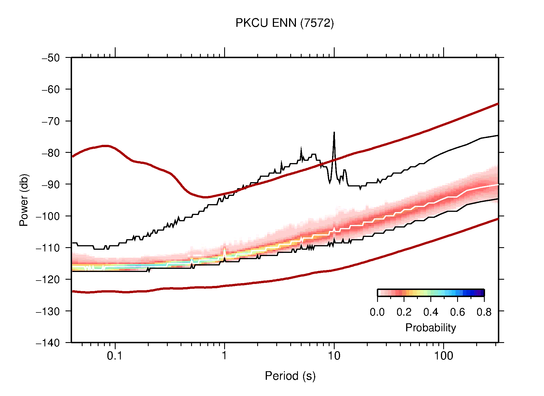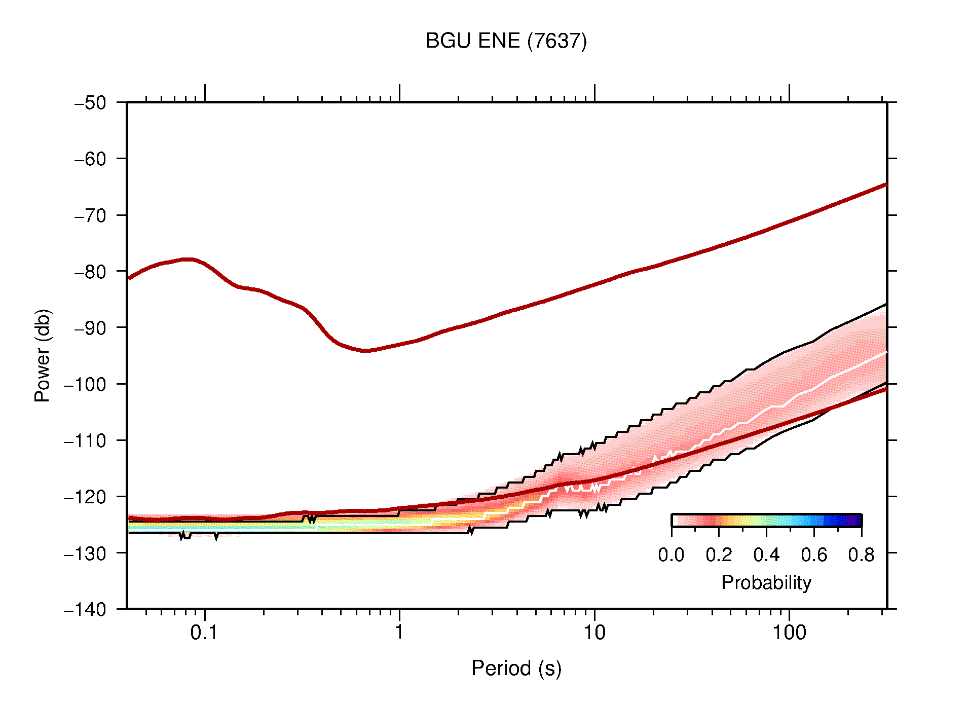 The following figures are full year PDFs for each of the 363 channels processed in this work. The same color scale is used thoughout. The black curves show 0.5 and 99.5 percentiles while the white curve shows the mode. The number of PSDs contributing to the PDF is shown in parentheses next to the station and channel names. The y-axes represent spectral acceleration amplitudes in units of db relative to 1 m/s2 [10log10(m2/s4/Hz)]. The five channels that were not included in the network PDF because of known problems were CCUT ENE,N,Z; HCSU ENE; and HER ENE.