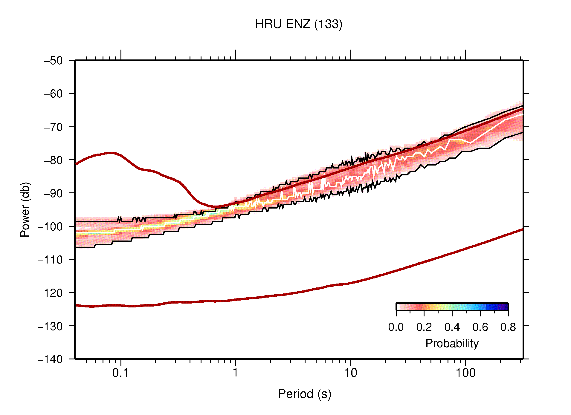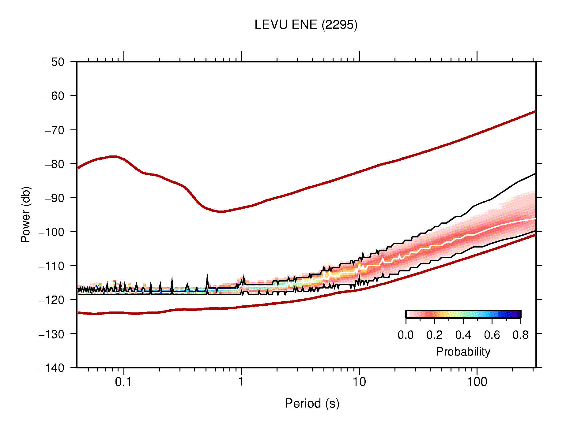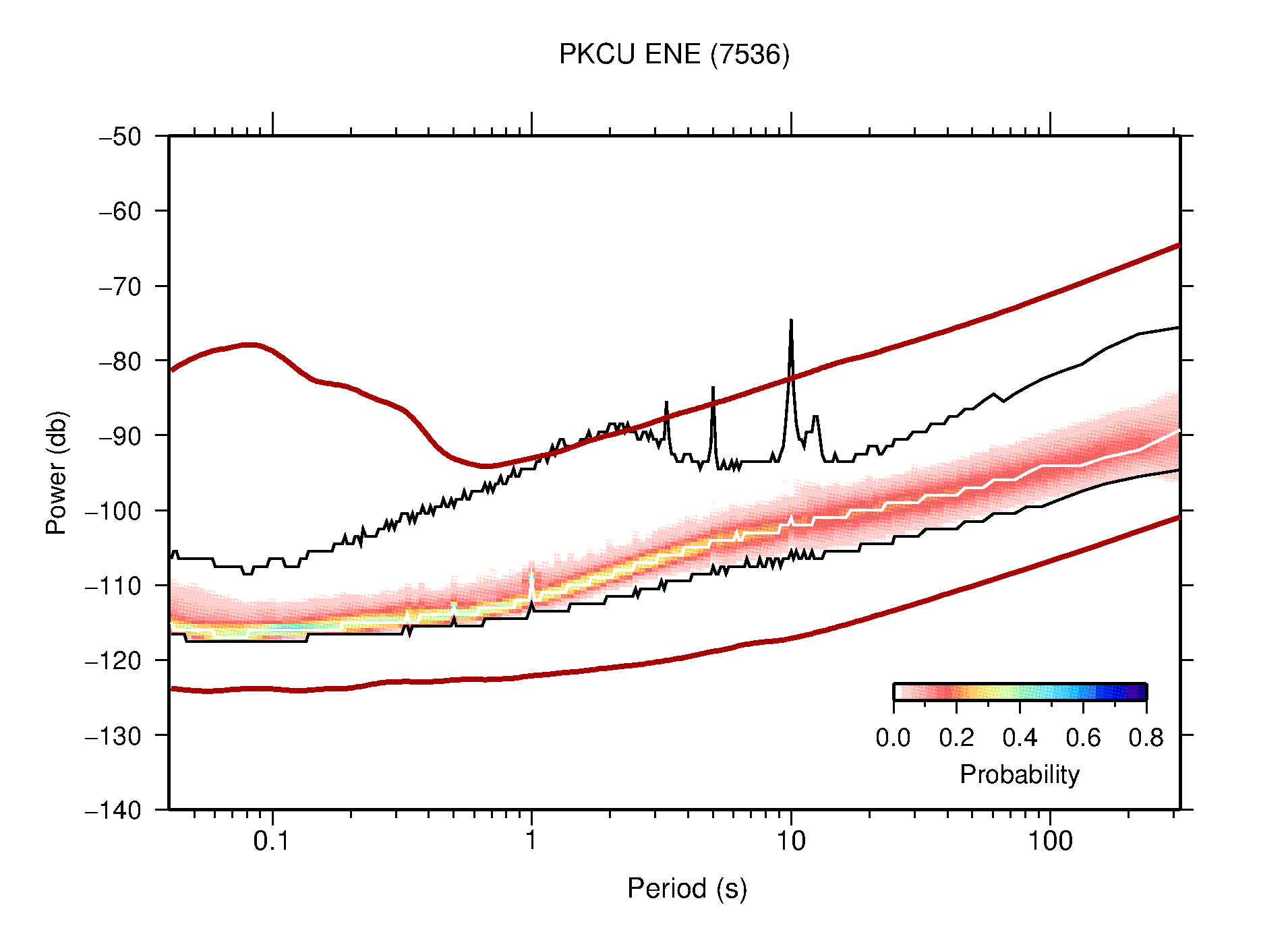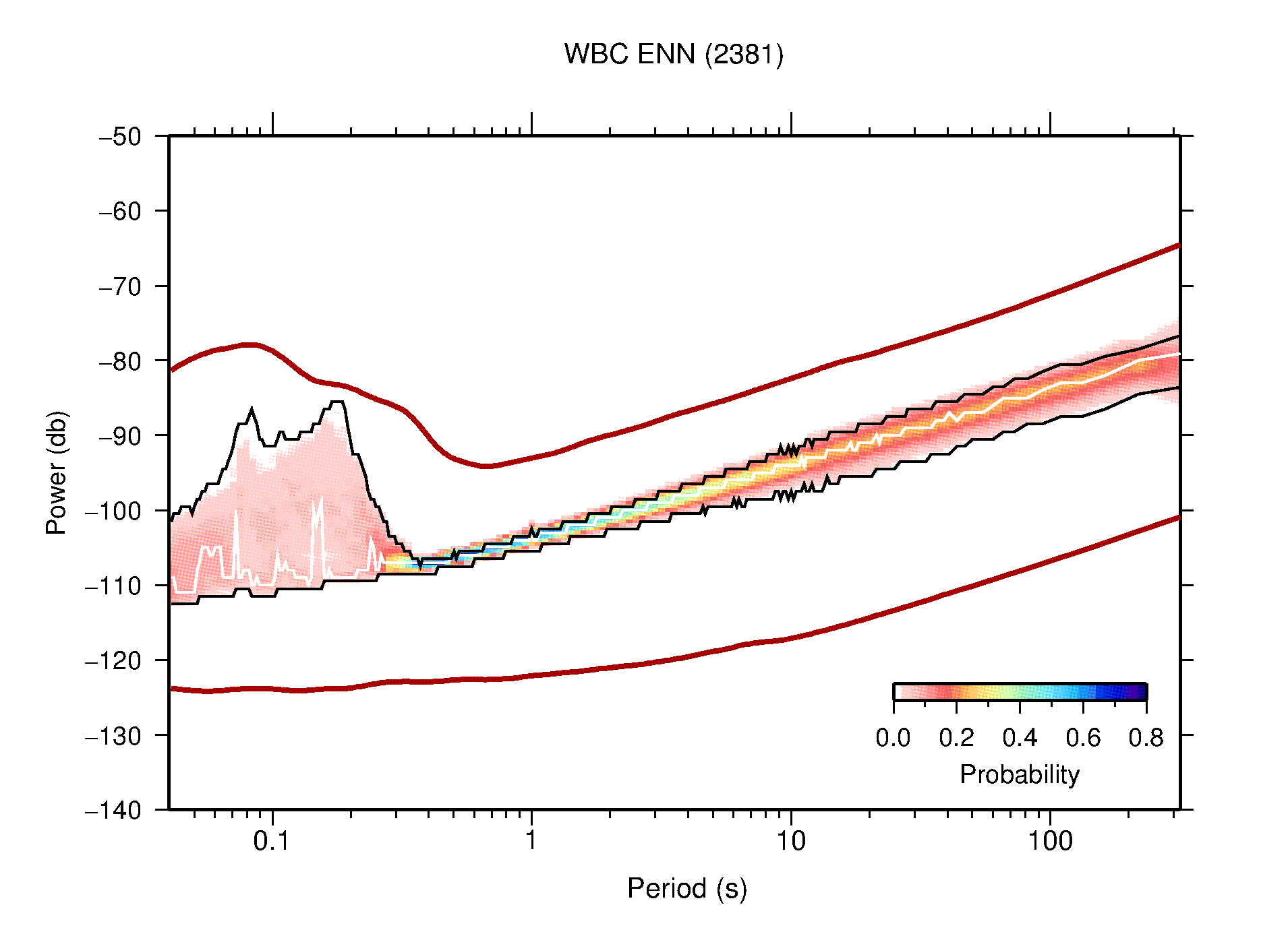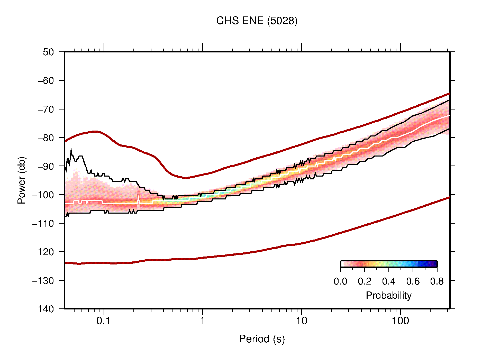 The following figures are full year PDFs for each of the 363 channels processed in this work. The same color scale is used thoughout. The black curves show 0.5 and 99.5 percentiles while the white curve shows the mode. The number of PSDs contributing to the PDF is shown in parentheses next to the station and channel names. The y-axes represent spectral acceleration amplitudes in units of db relative to 1 m/s2 [10log10(m2/s4/Hz)]. The five channels that were not included in the network PDF because of known problems were CCUT ENE,N,Z; HCSU ENE; and HER ENE.