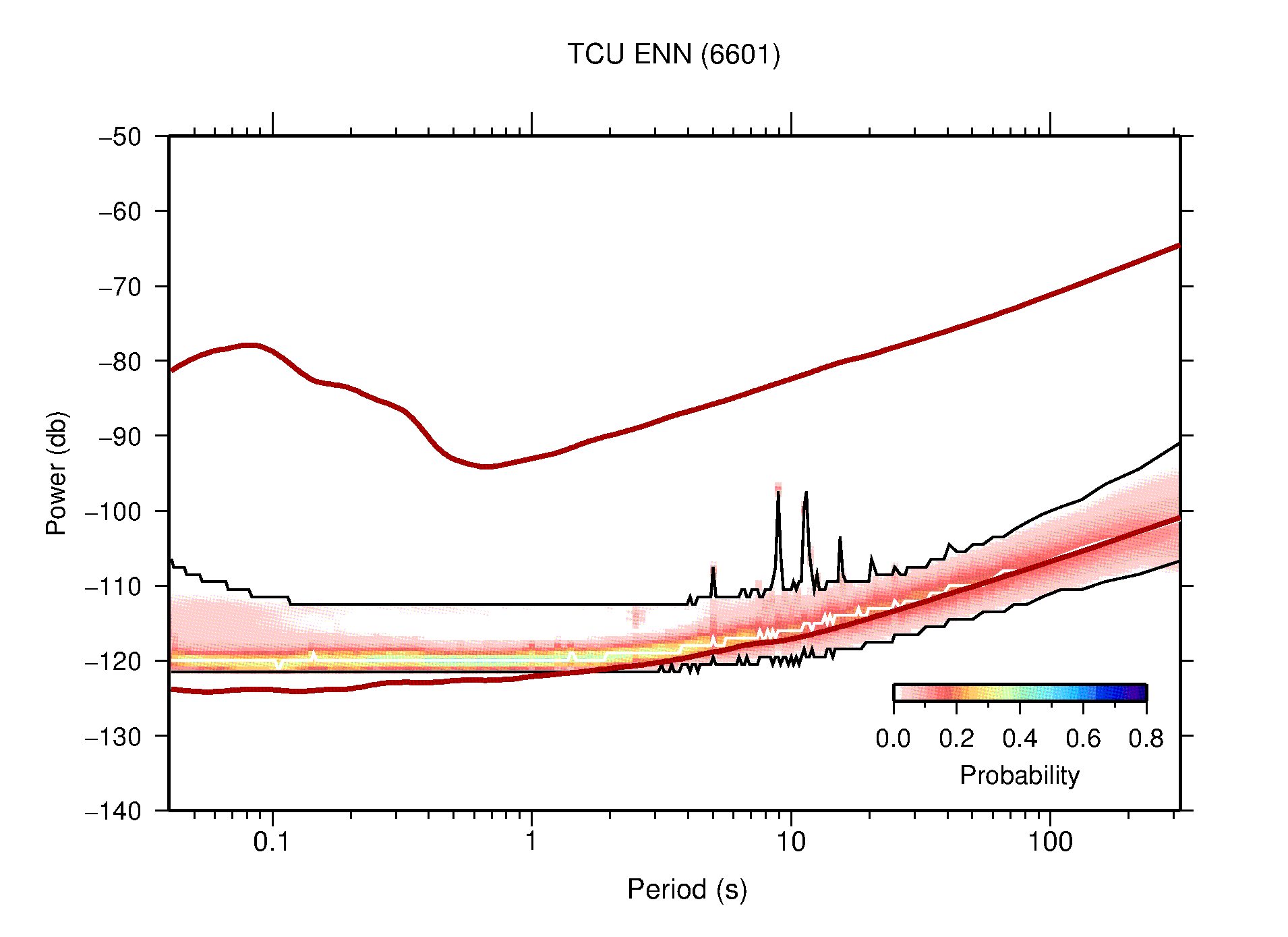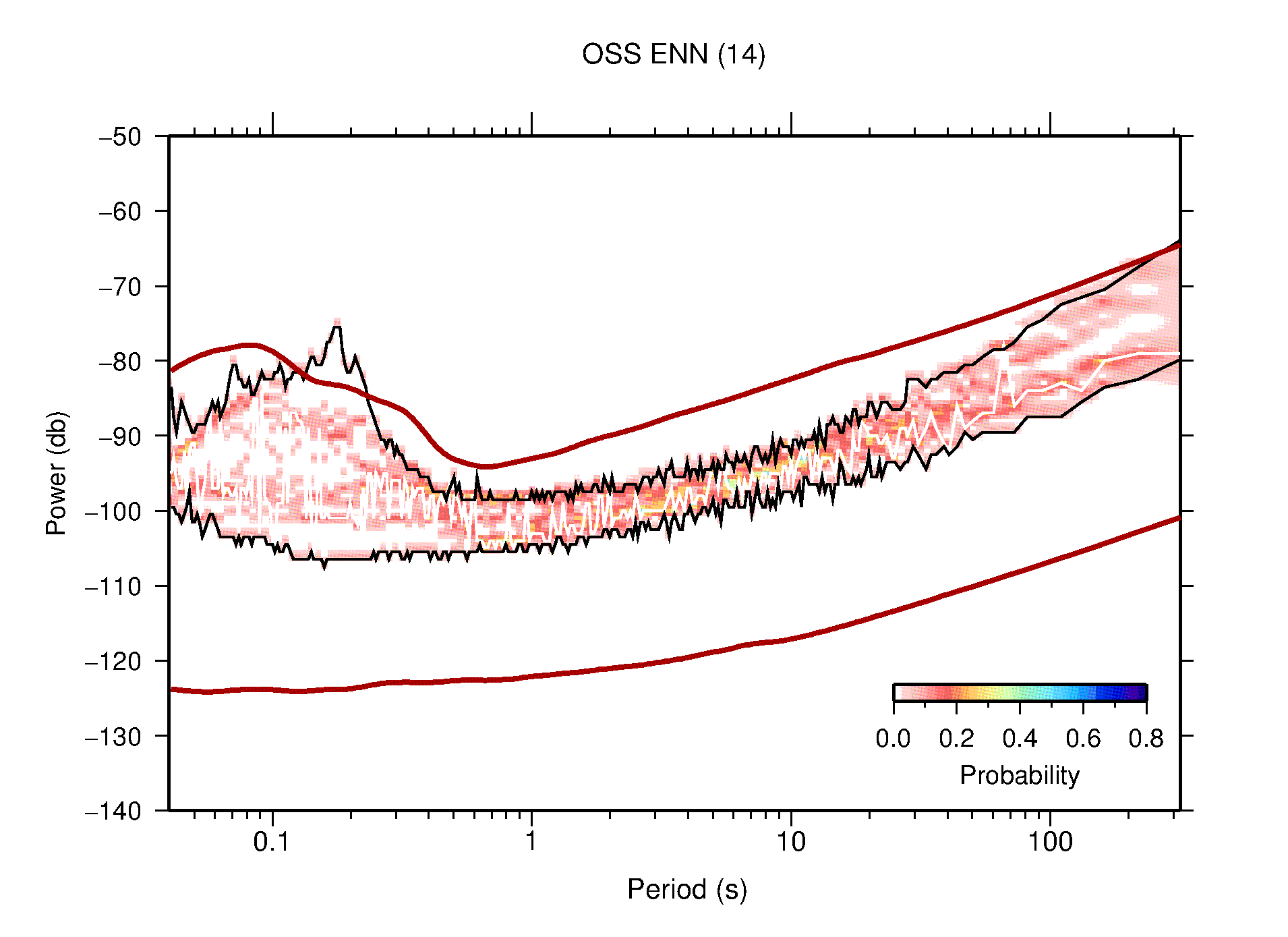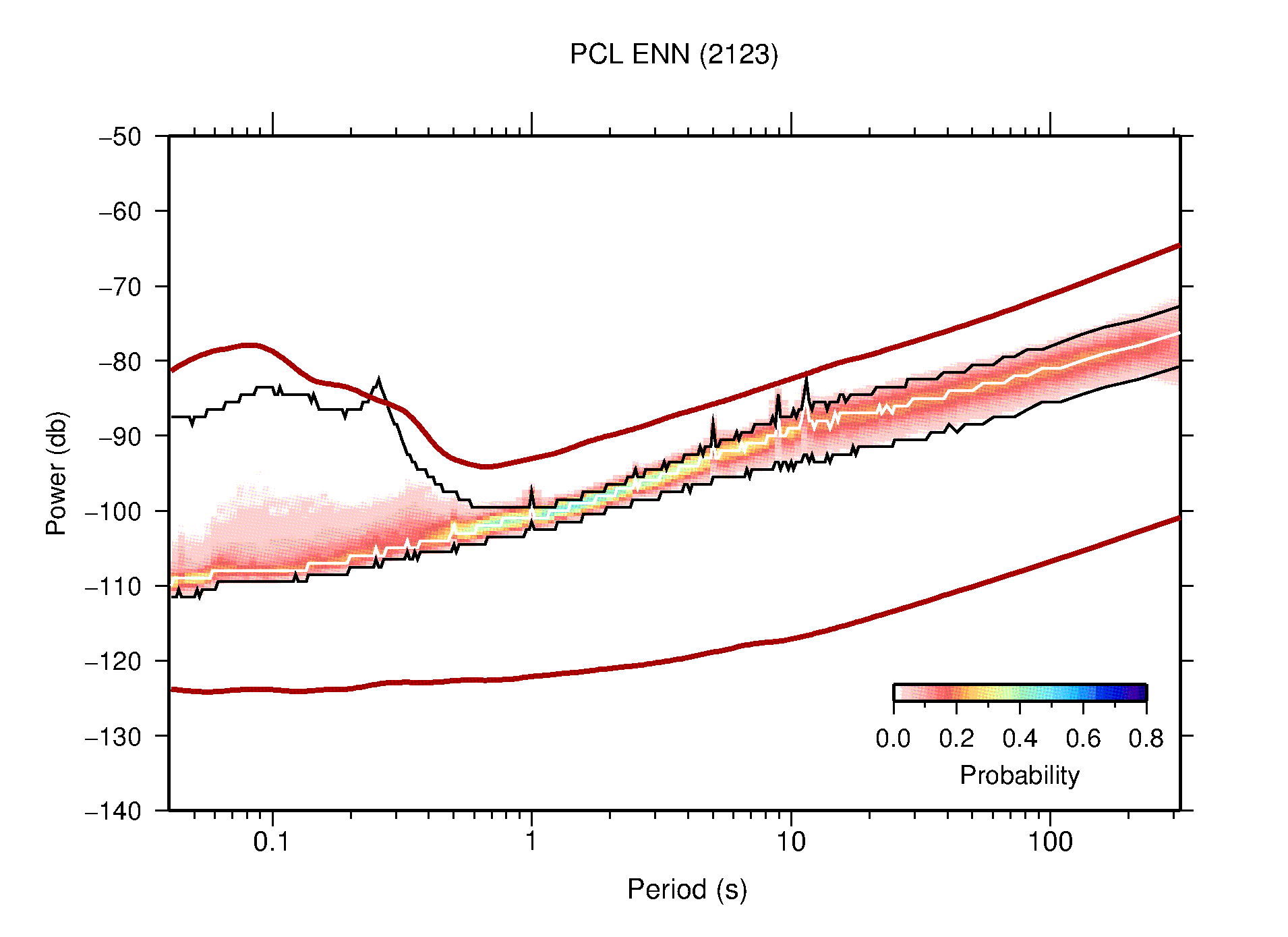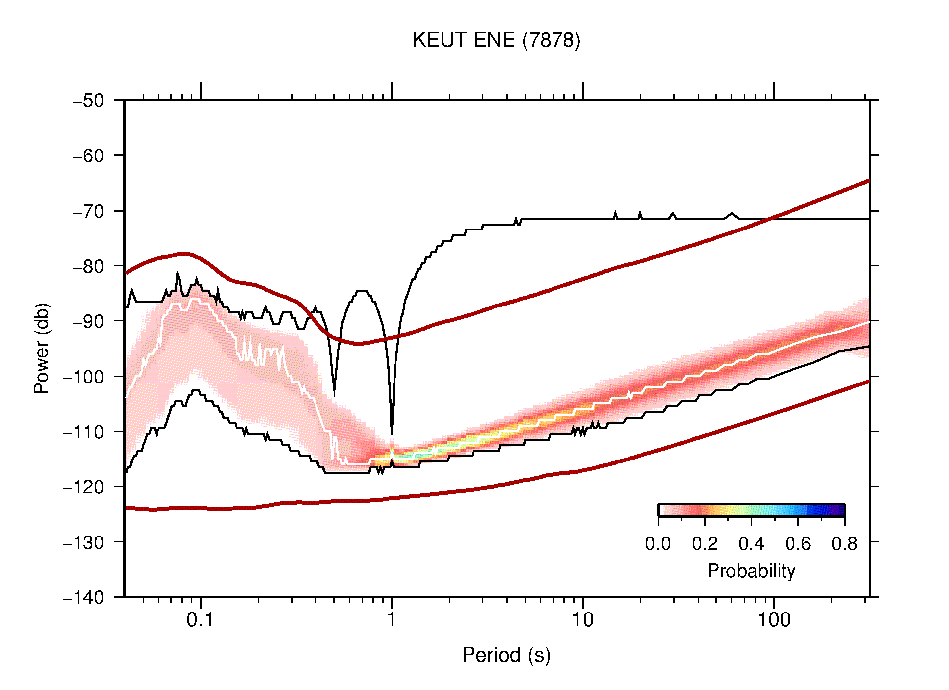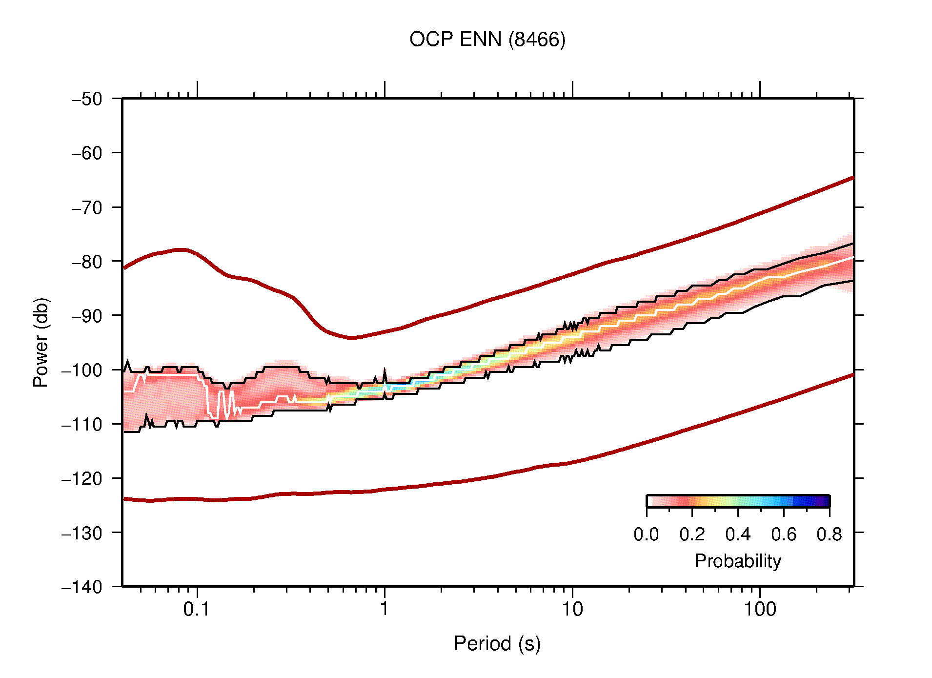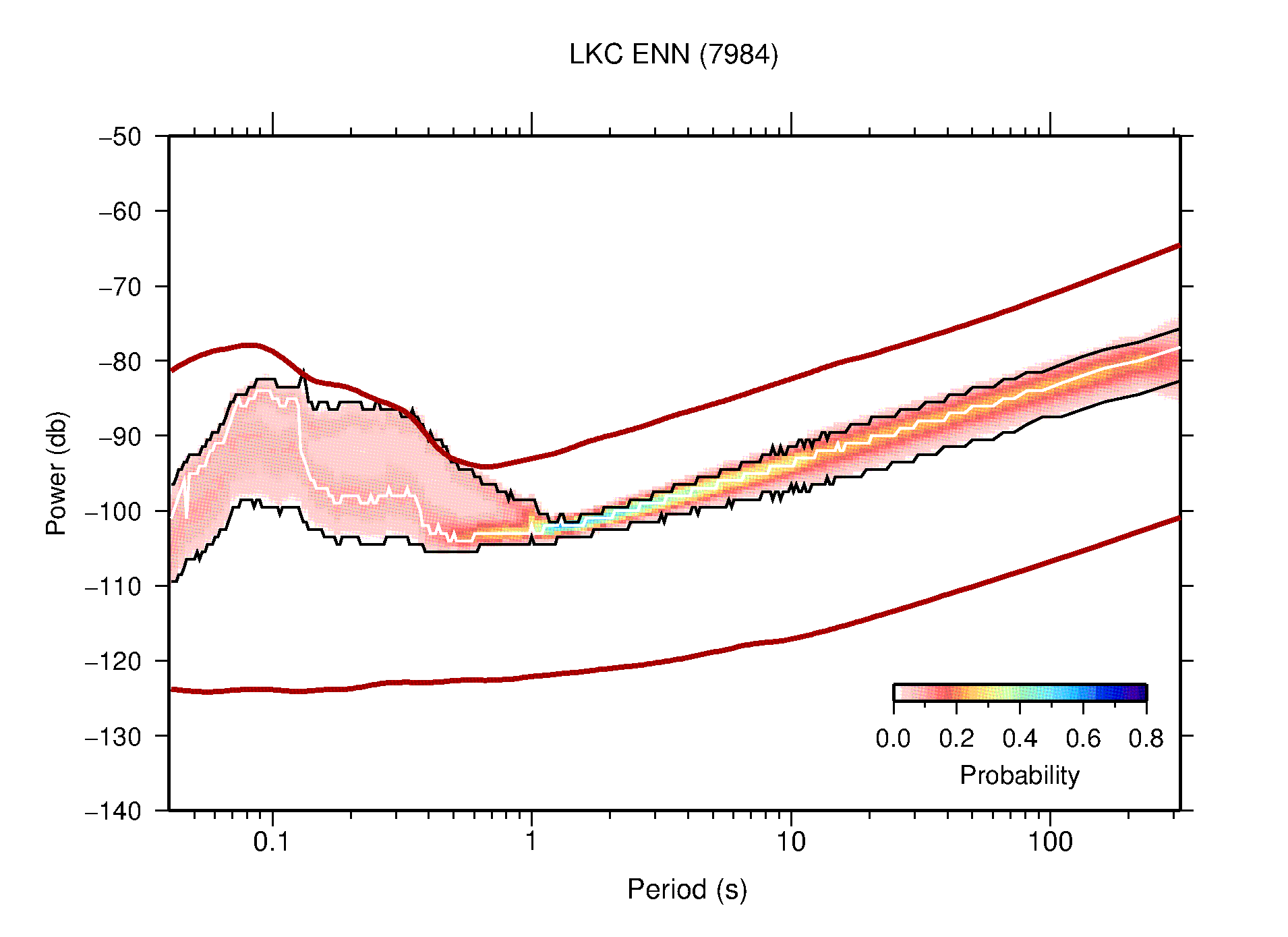 The following figures are full year PDFs for each of the 363 channels processed in this work. The same color scale is used thoughout. The black curves show 0.5 and 99.5 percentiles while the white curve shows the mode. The number of PSDs contributing to the PDF is shown in parentheses next to the station and channel names. The y-axes represent spectral acceleration amplitudes in units of db relative to 1 m/s2 [10log10(m2/s4/Hz)]. The five channels that were not included in the network PDF because of known problems were CCUT ENE,N,Z; HCSU ENE; and HER ENE.