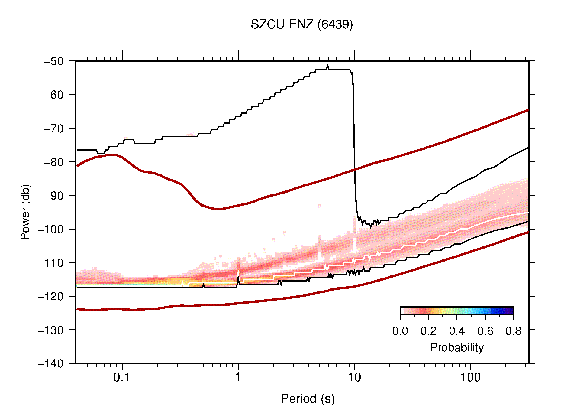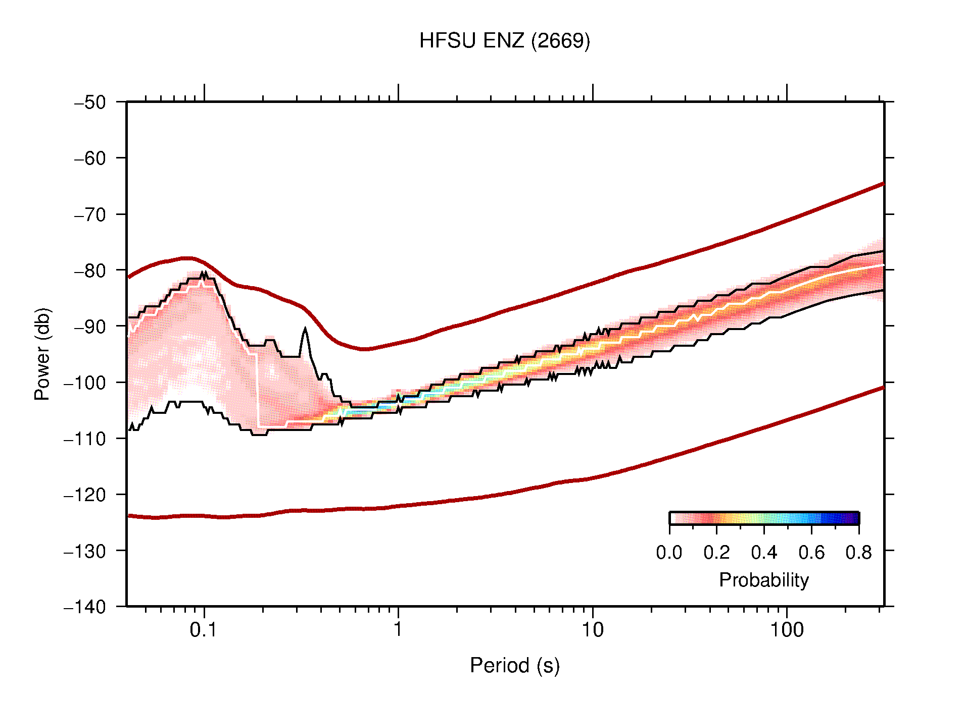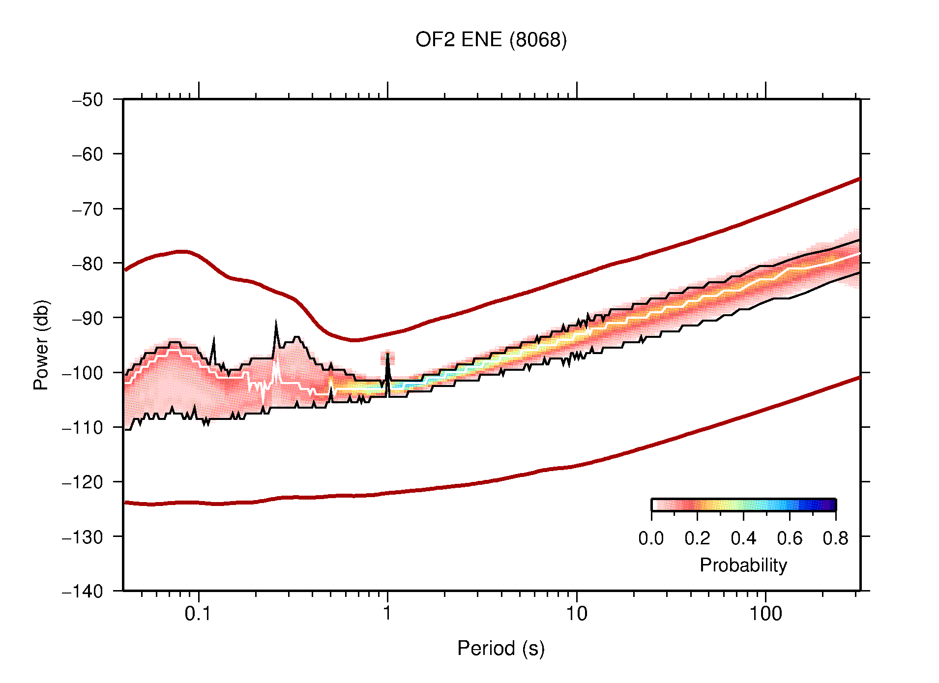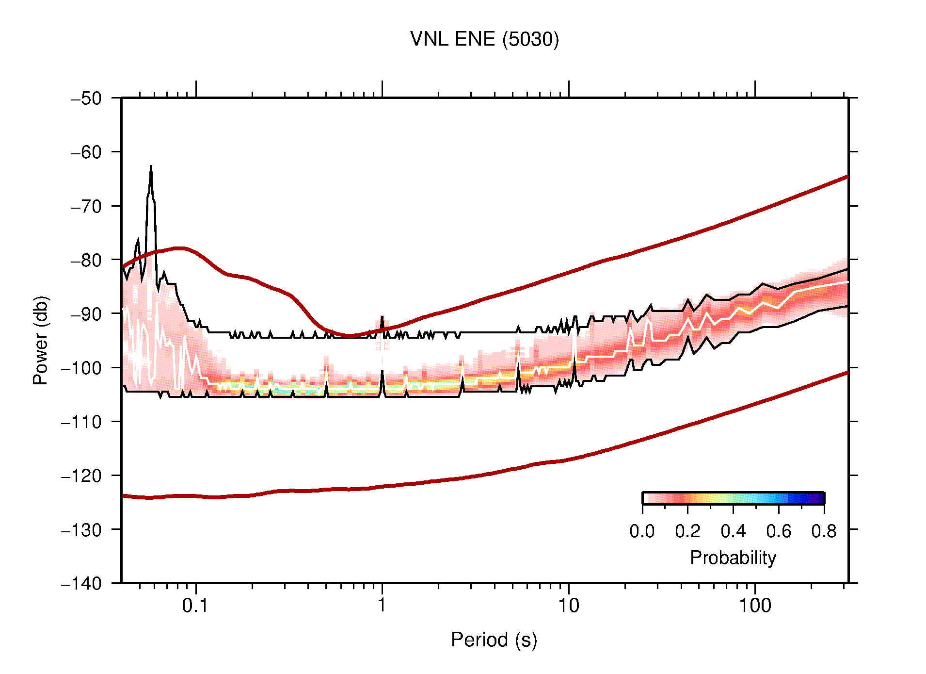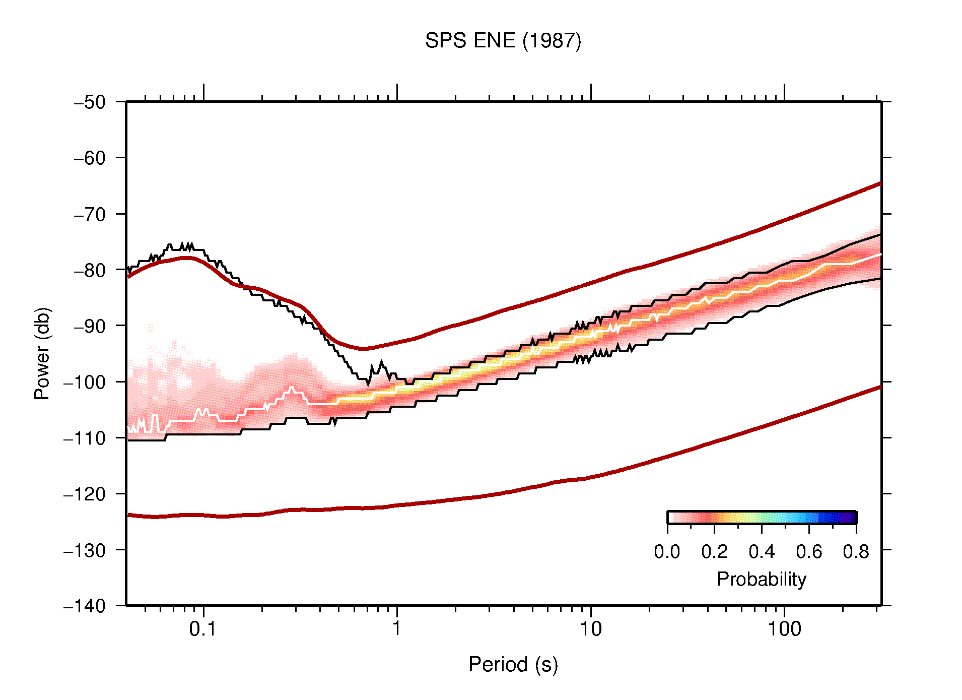 The following figures are full year PDFs for each of the 363 channels processed in this work. The same color scale is used thoughout. The black curves show 0.5 and 99.5 percentiles while the white curve shows the mode. The number of PSDs contributing to the PDF is shown in parentheses next to the station and channel names. The y-axes represent spectral acceleration amplitudes in units of db relative to 1 m/s2 [10log10(m2/s4/Hz)]. The five channels that were not included in the network PDF because of known problems were CCUT ENE,N,Z; HCSU ENE; and HER ENE.
