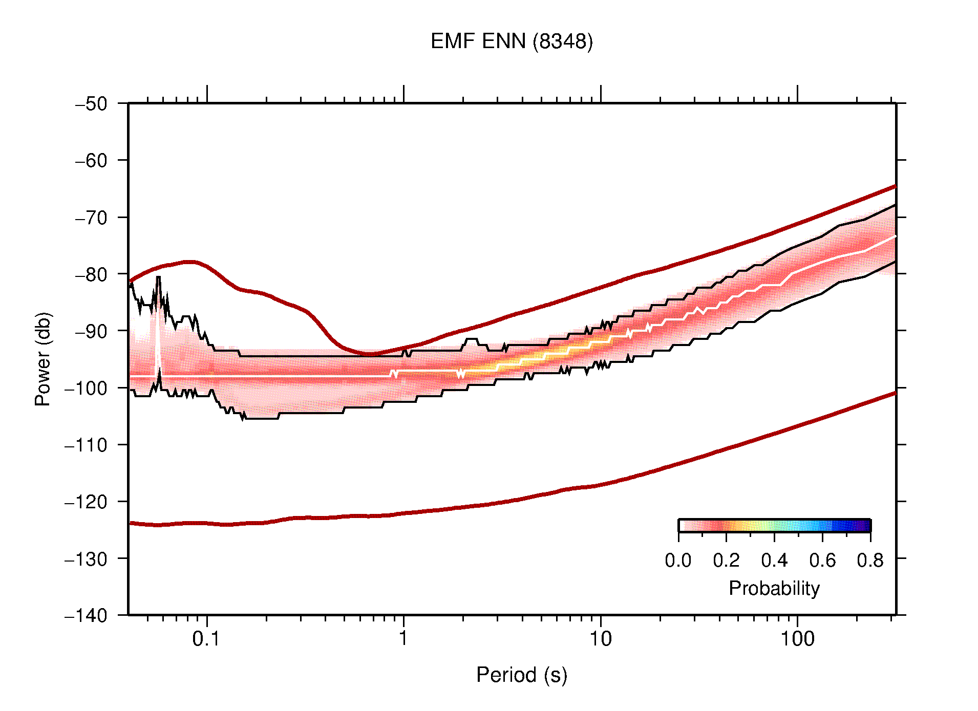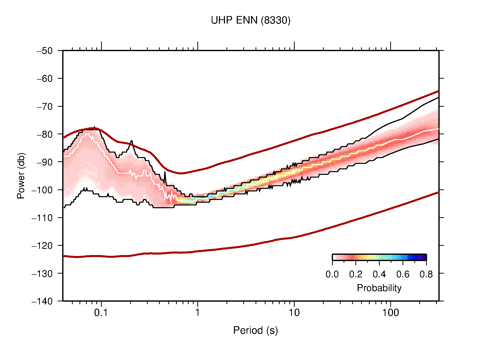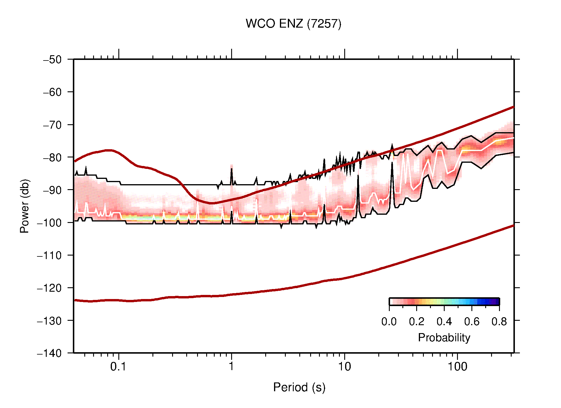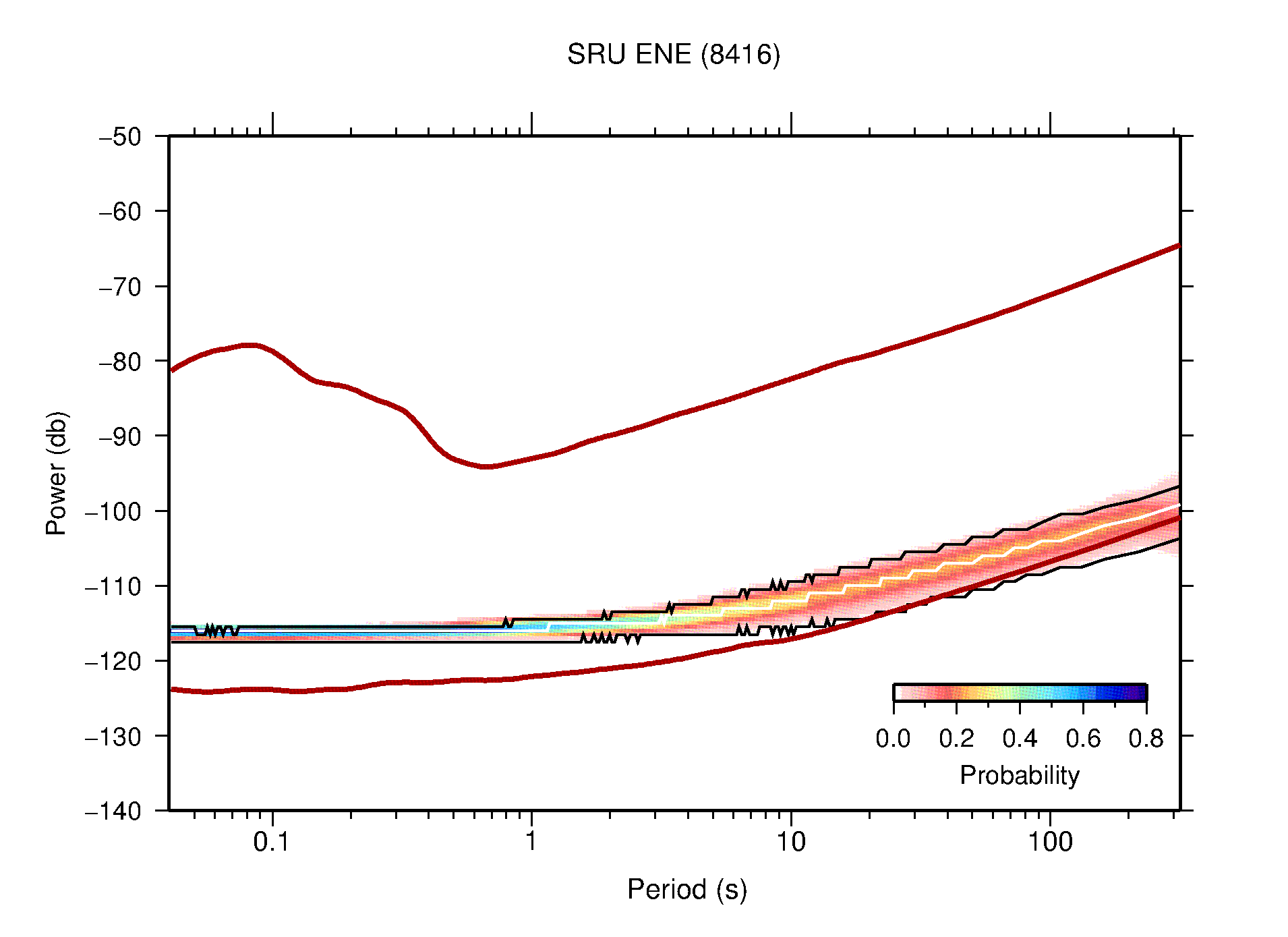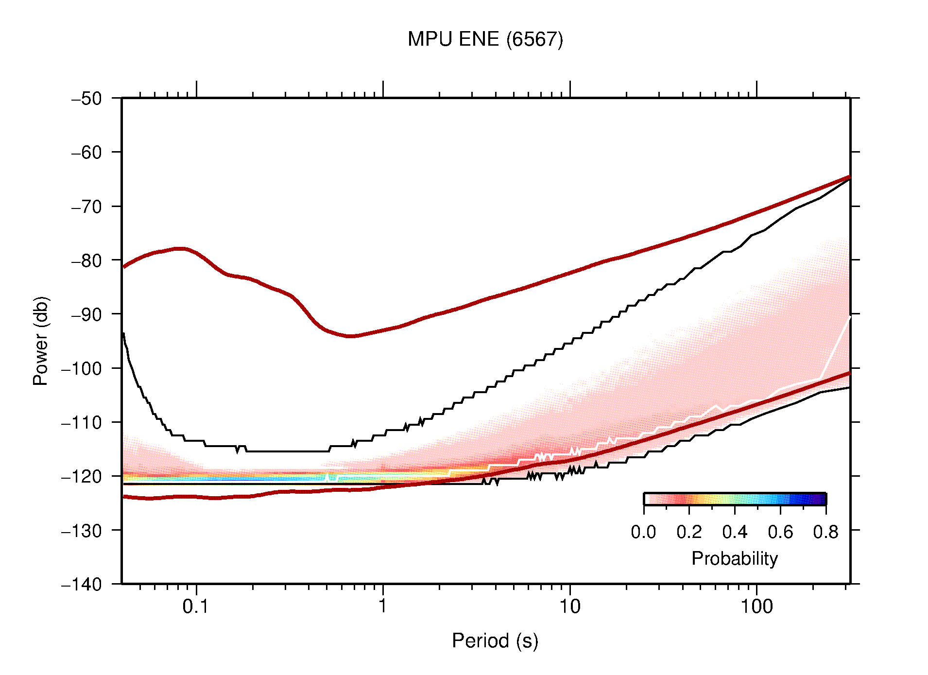 The following figures are full year PDFs for each of the 363 channels processed in this work. The same color scale is used thoughout. The black curves show 0.5 and 99.5 percentiles while the white curve shows the mode. The number of PSDs contributing to the PDF is shown in parentheses next to the station and channel names. The y-axes represent spectral acceleration amplitudes in units of db relative to 1 m/s2 [10log10(m2/s4/Hz)]. The five channels that were not included in the network PDF because of known problems were CCUT ENE,N,Z; HCSU ENE; and HER ENE.