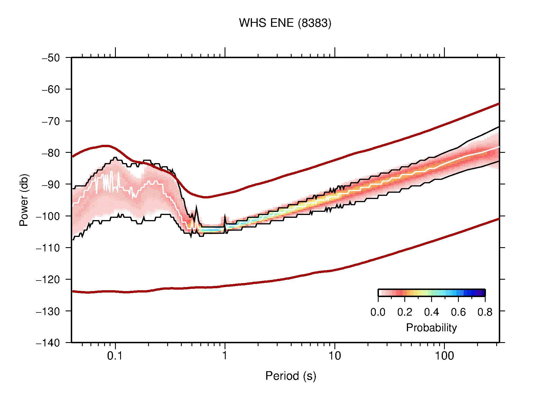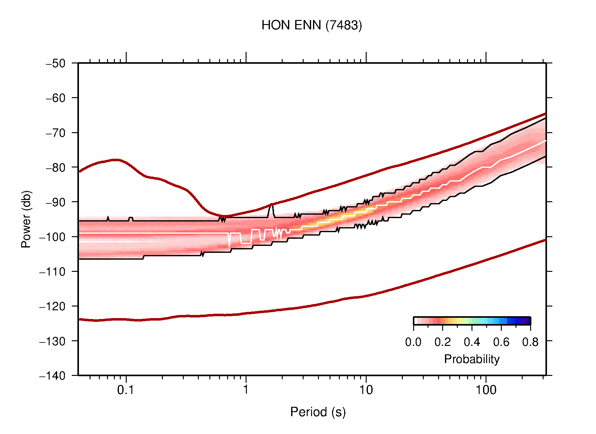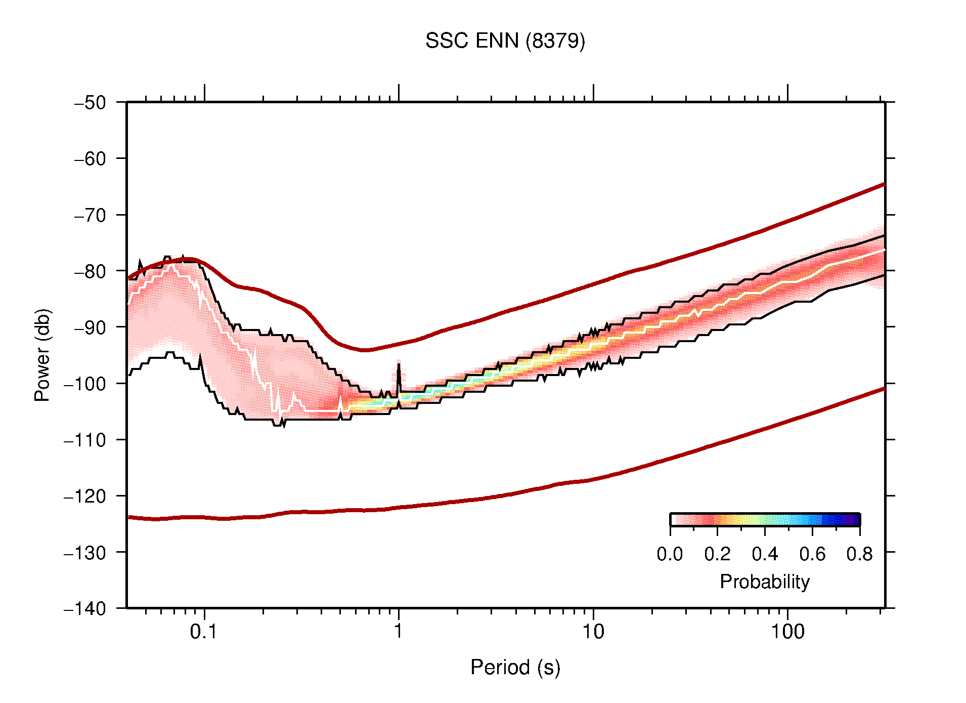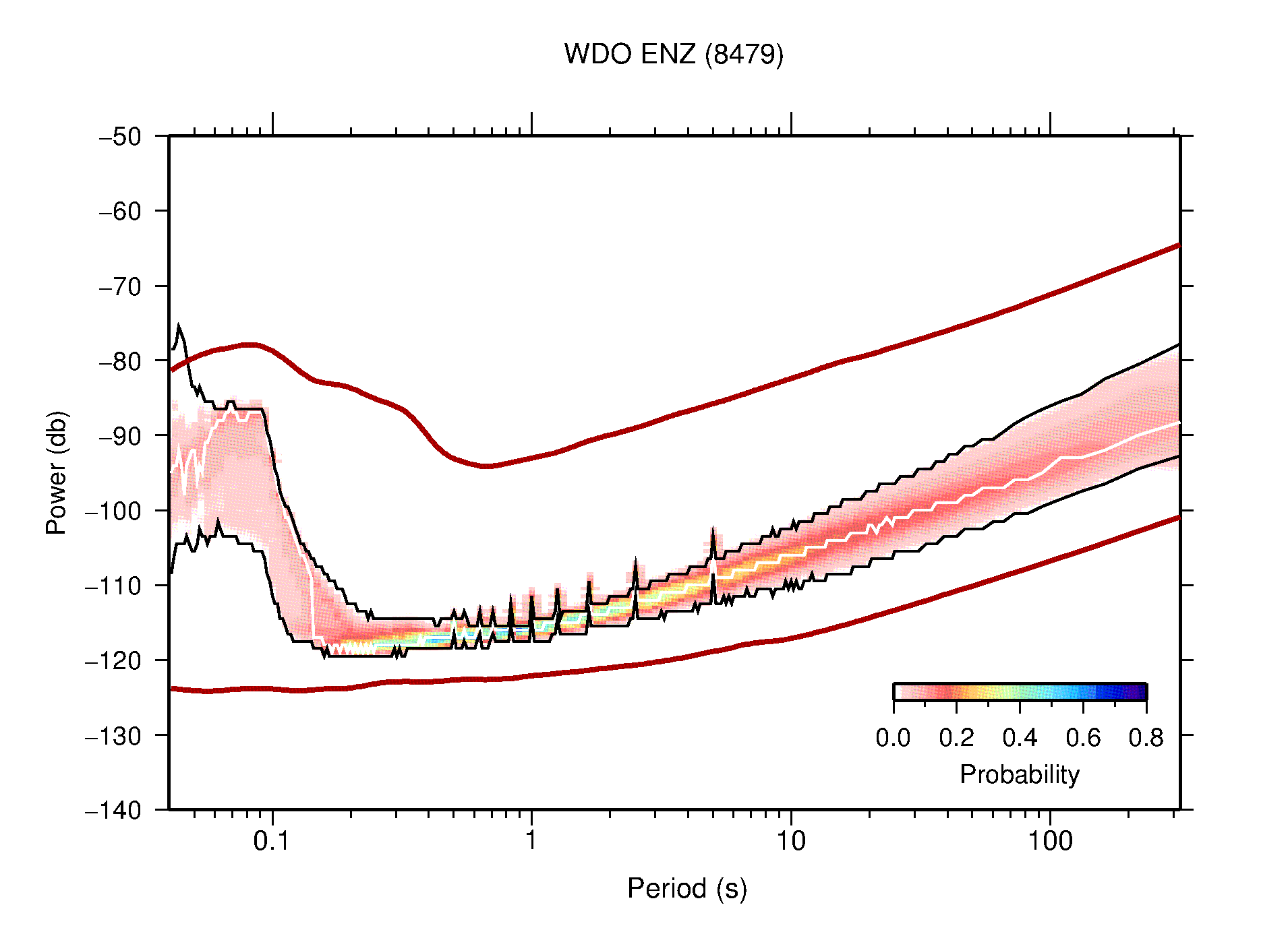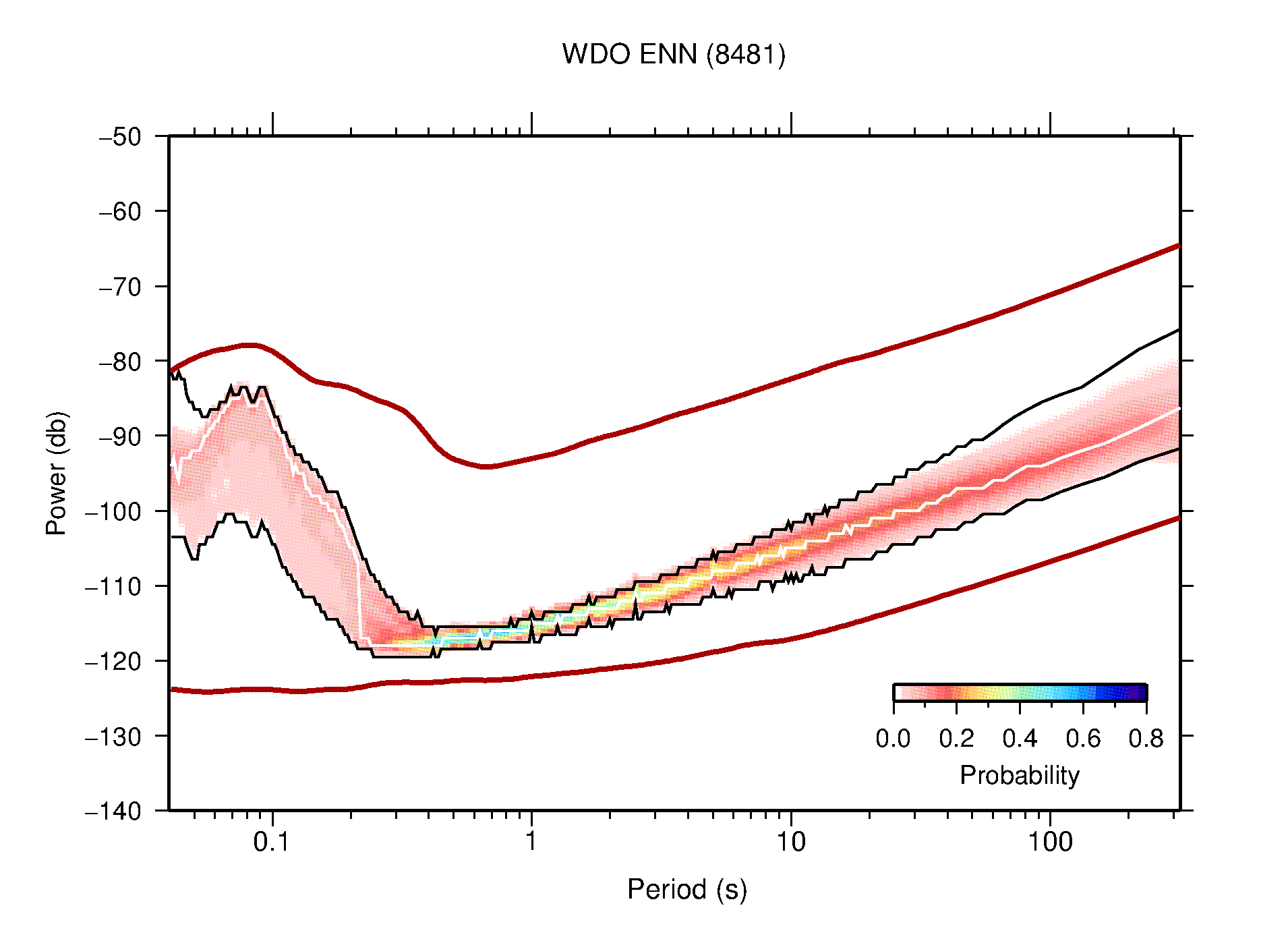 The following figures are full year PDFs for each of the 363 channels processed in this work. The same color scale is used thoughout. The black curves show 0.5 and 99.5 percentiles while the white curve shows the mode. The number of PSDs contributing to the PDF is shown in parentheses next to the station and channel names. The y-axes represent spectral acceleration amplitudes in units of db relative to 1 m/s2 [10log10(m2/s4/Hz)]. The five channels that were not included in the network PDF because of known problems were CCUT ENE,N,Z; HCSU ENE; and HER ENE.