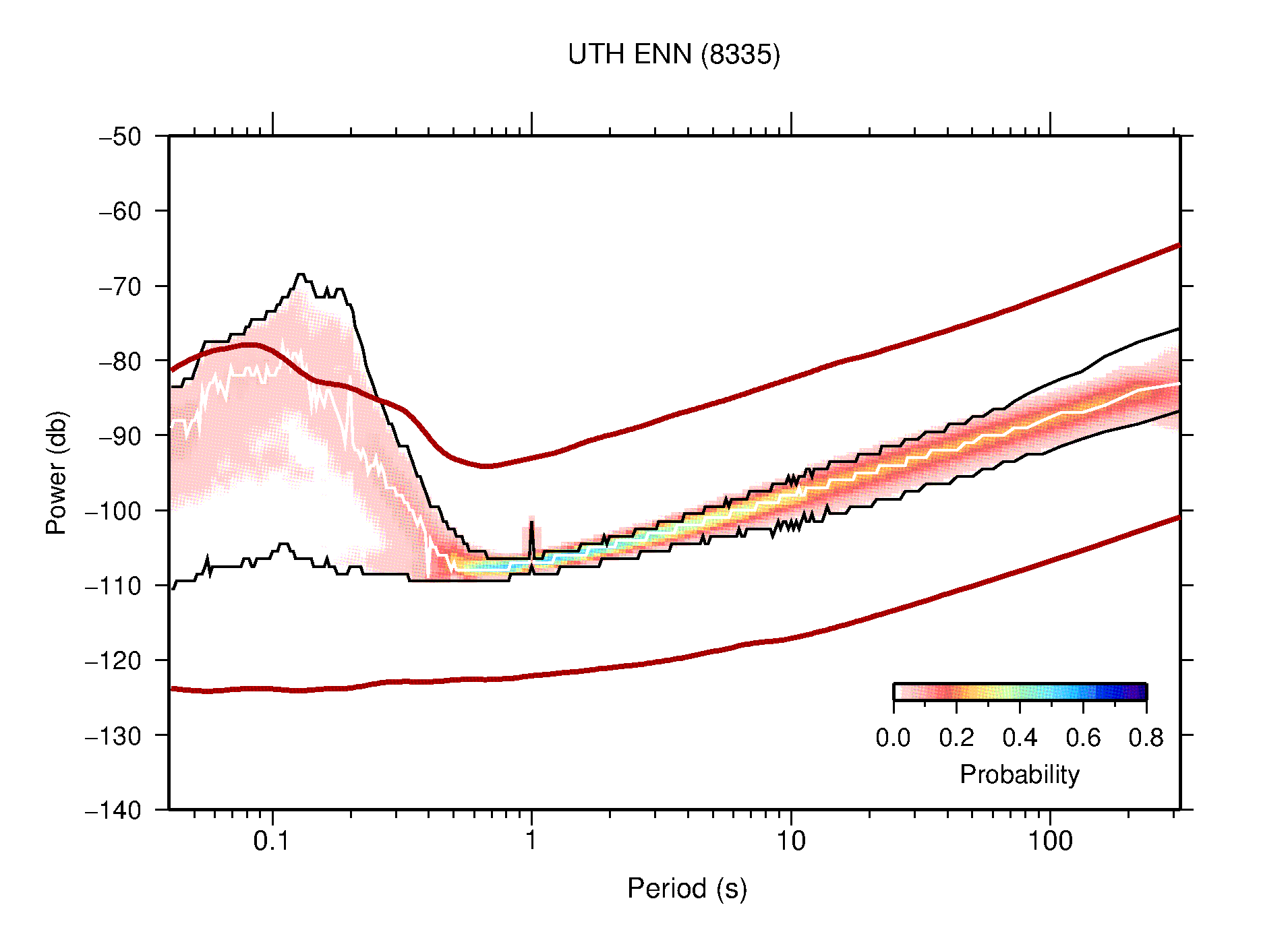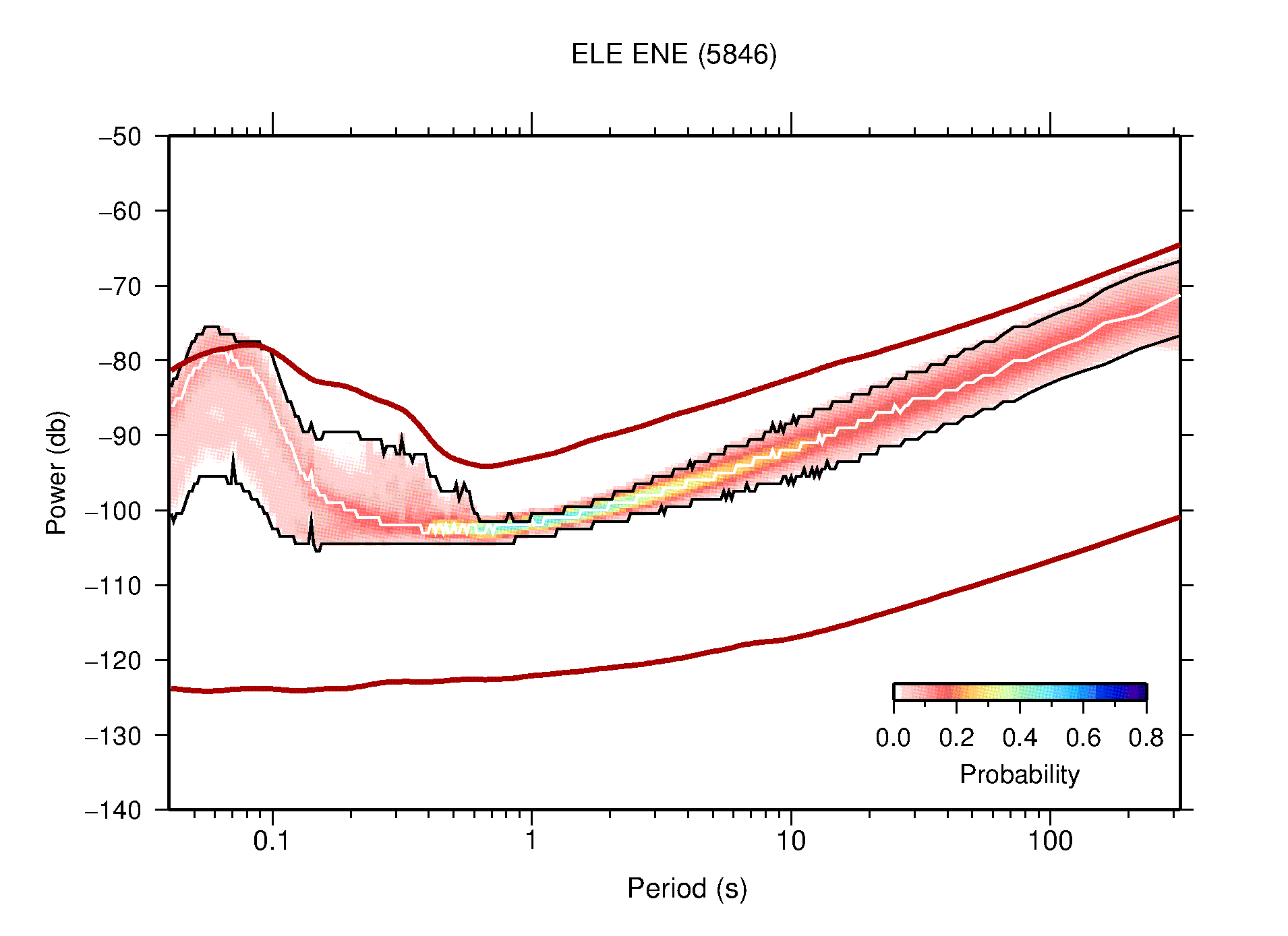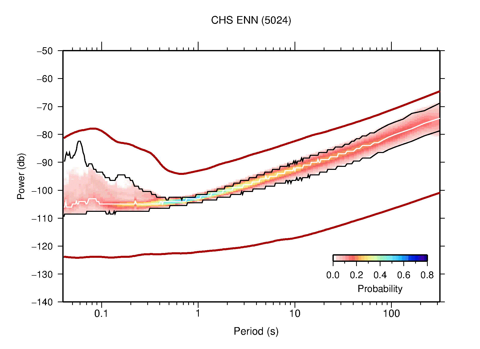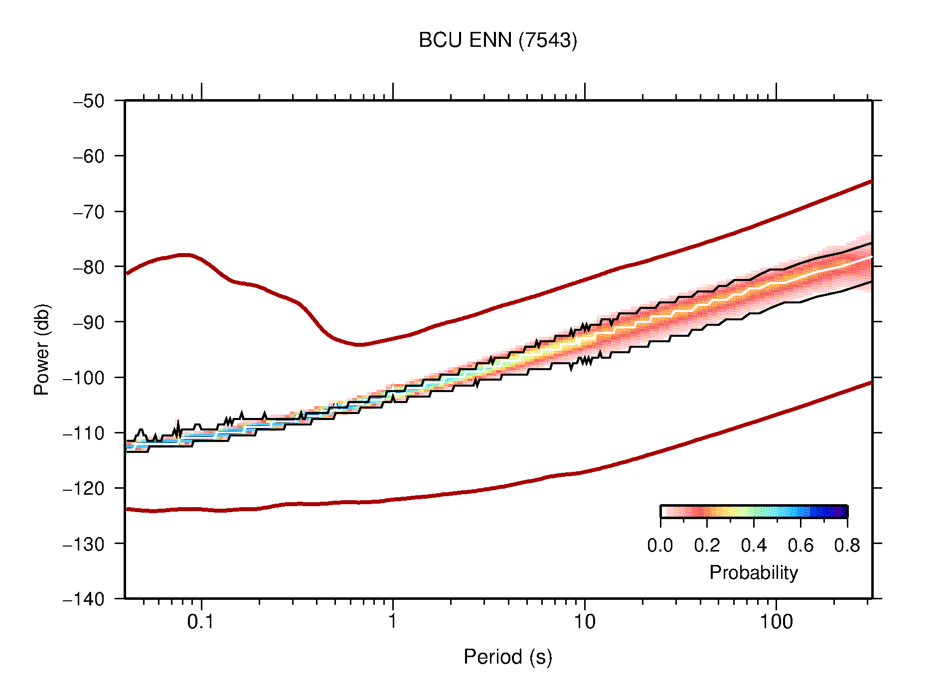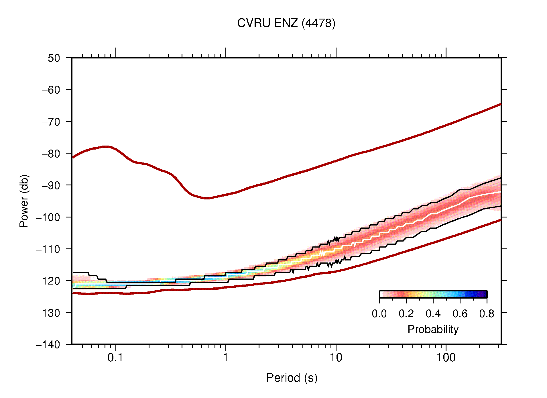 The following figures are full year PDFs for each of the 363 channels processed in this work. The same color scale is used thoughout. The black curves show 0.5 and 99.5 percentiles while the white curve shows the mode. The number of PSDs contributing to the PDF is shown in parentheses next to the station and channel names. The y-axes represent spectral acceleration amplitudes in units of db relative to 1 m/s2 [10log10(m2/s4/Hz)]. The five channels that were not included in the network PDF because of known problems were CCUT ENE,N,Z; HCSU ENE; and HER ENE.