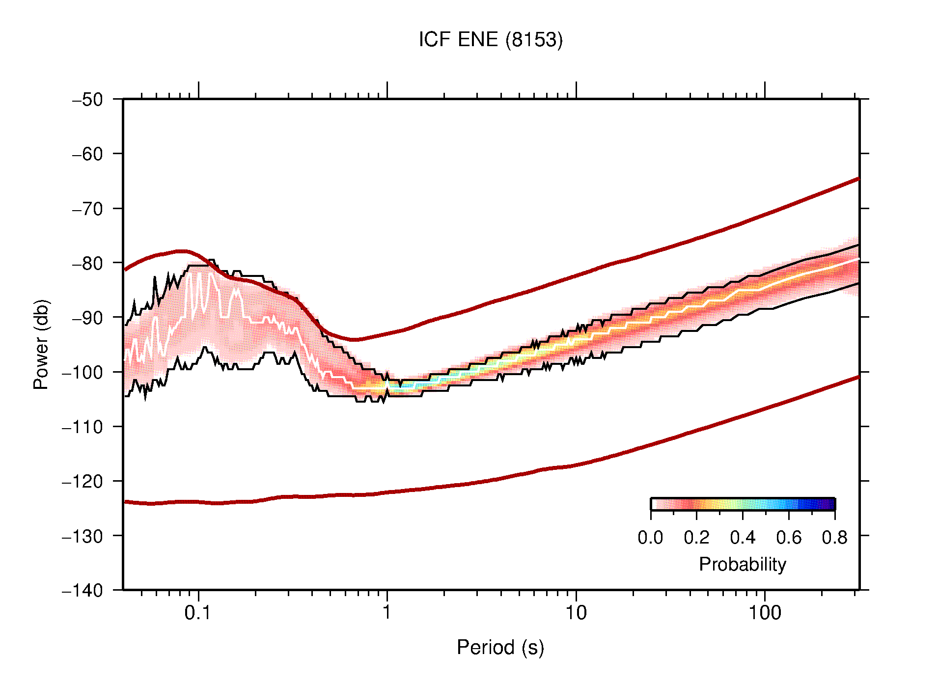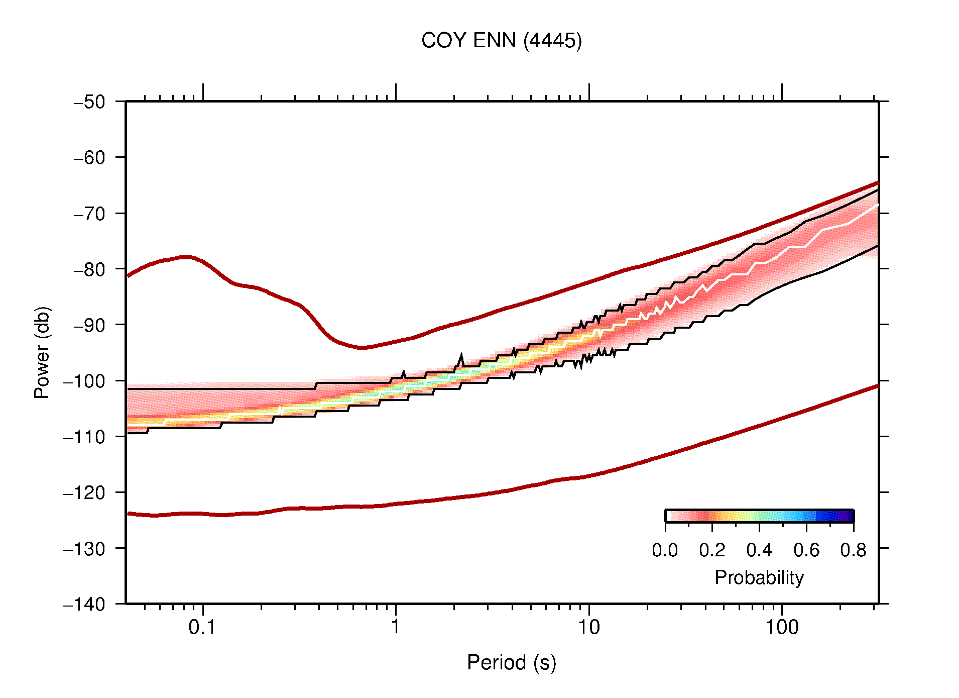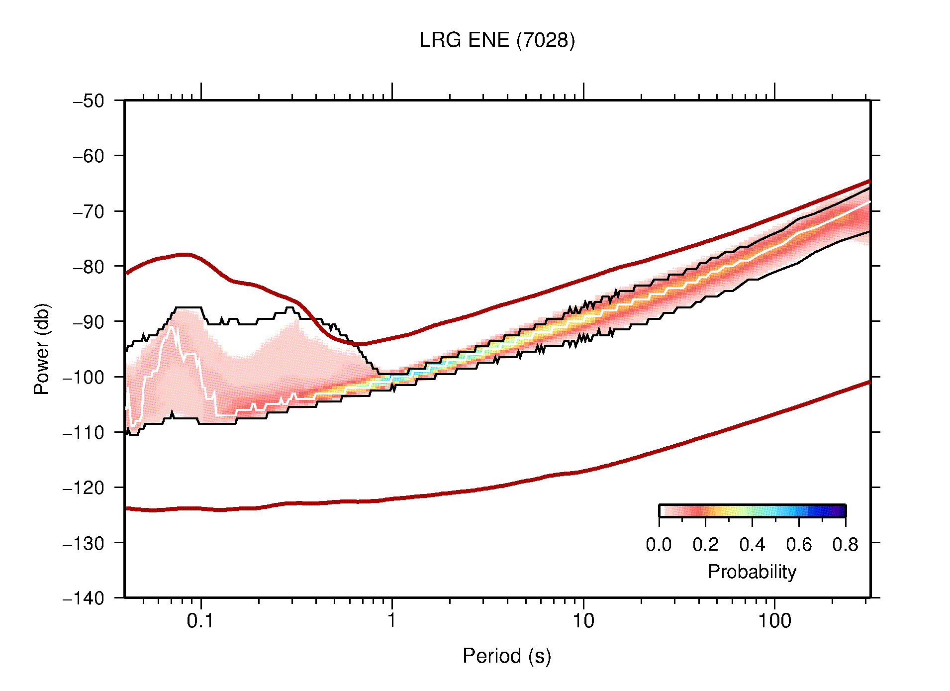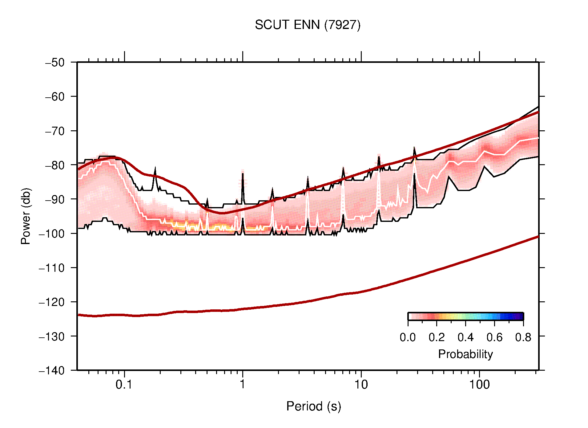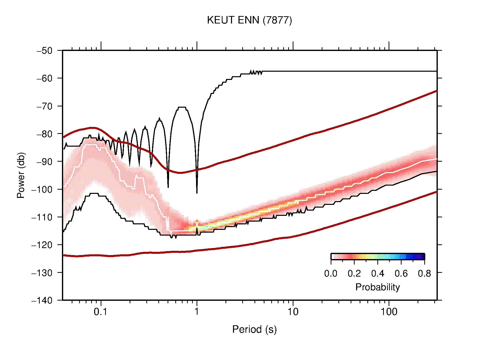 The following figures are full year PDFs for each of the 363 channels processed in this work. The same color scale is used thoughout. The black curves show 0.5 and 99.5 percentiles while the white curve shows the mode. The number of PSDs contributing to the PDF is shown in parentheses next to the station and channel names. The y-axes represent spectral acceleration amplitudes in units of db relative to 1 m/s2 [10log10(m2/s4/Hz)]. The five channels that were not included in the network PDF because of known problems were CCUT ENE,N,Z; HCSU ENE; and HER ENE.