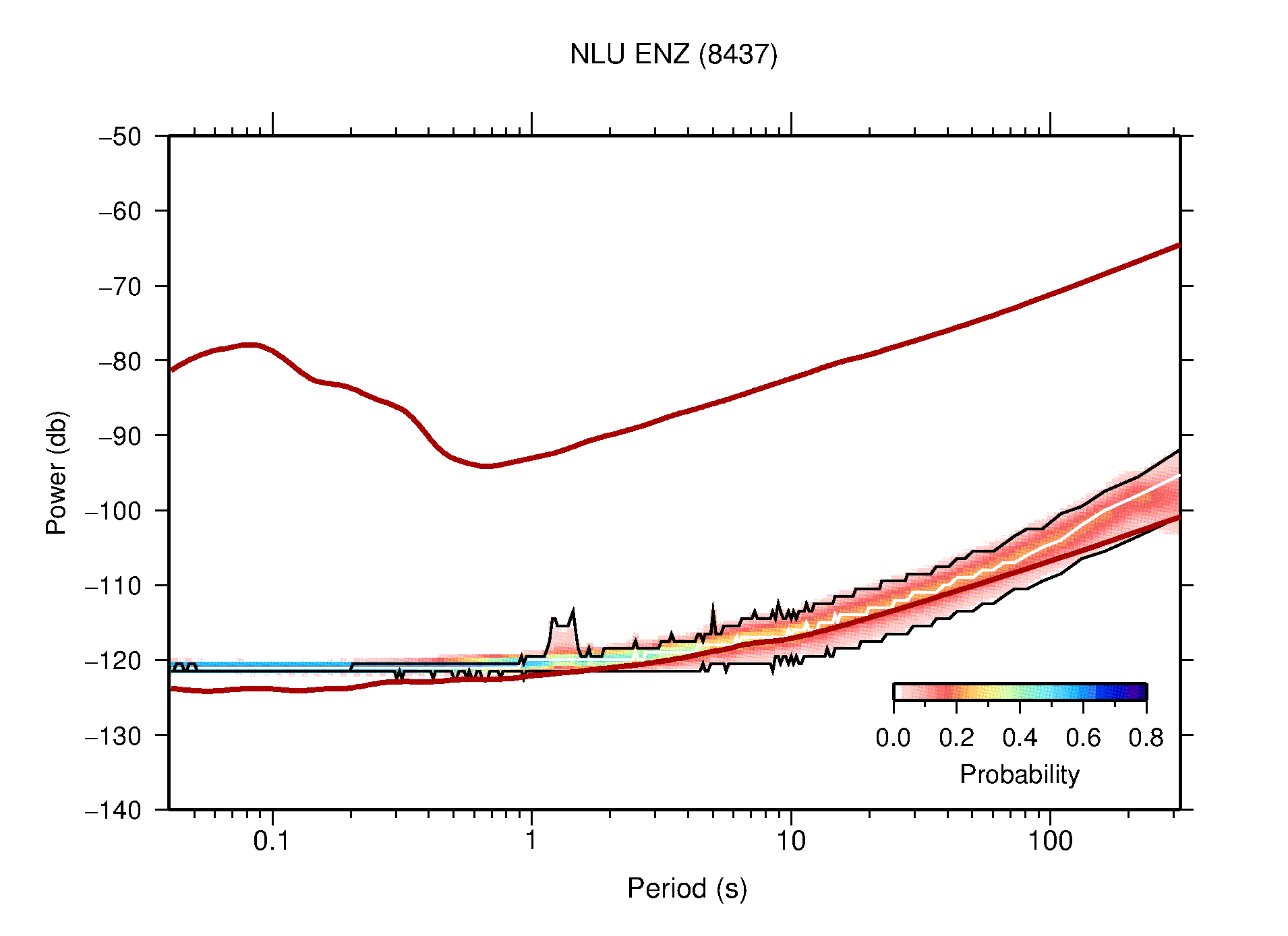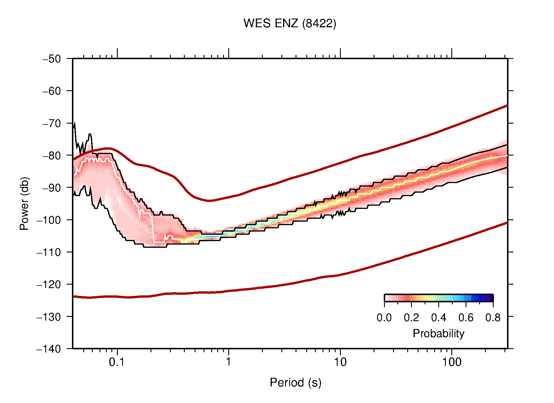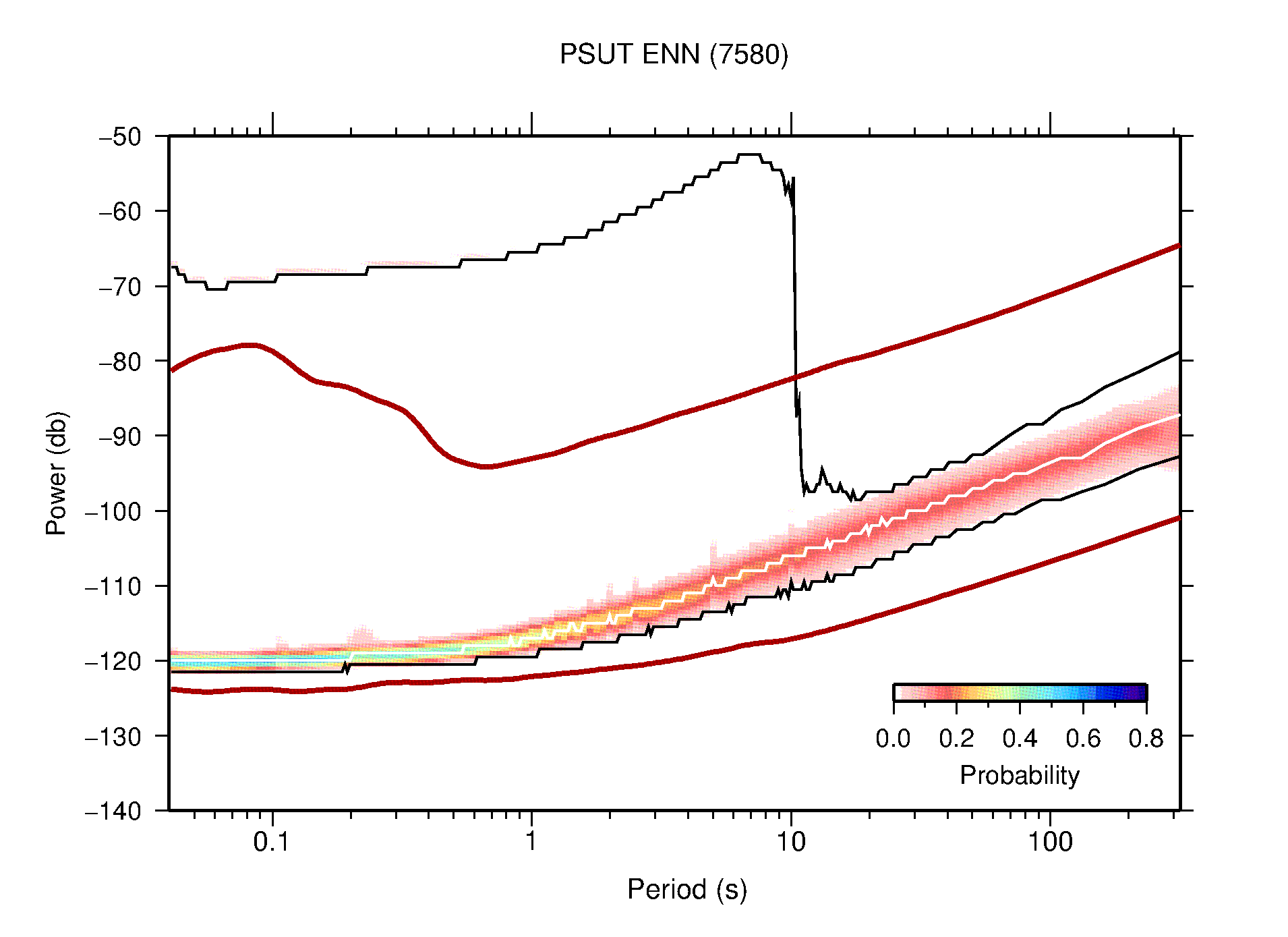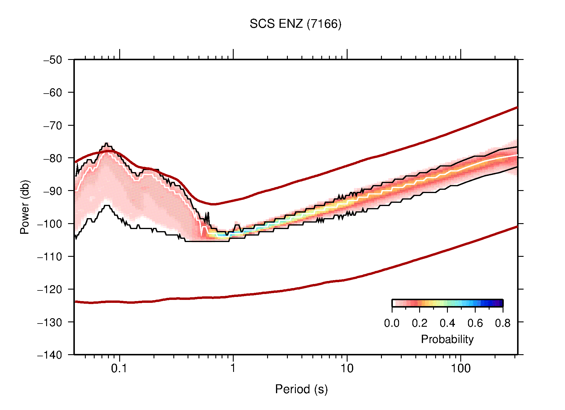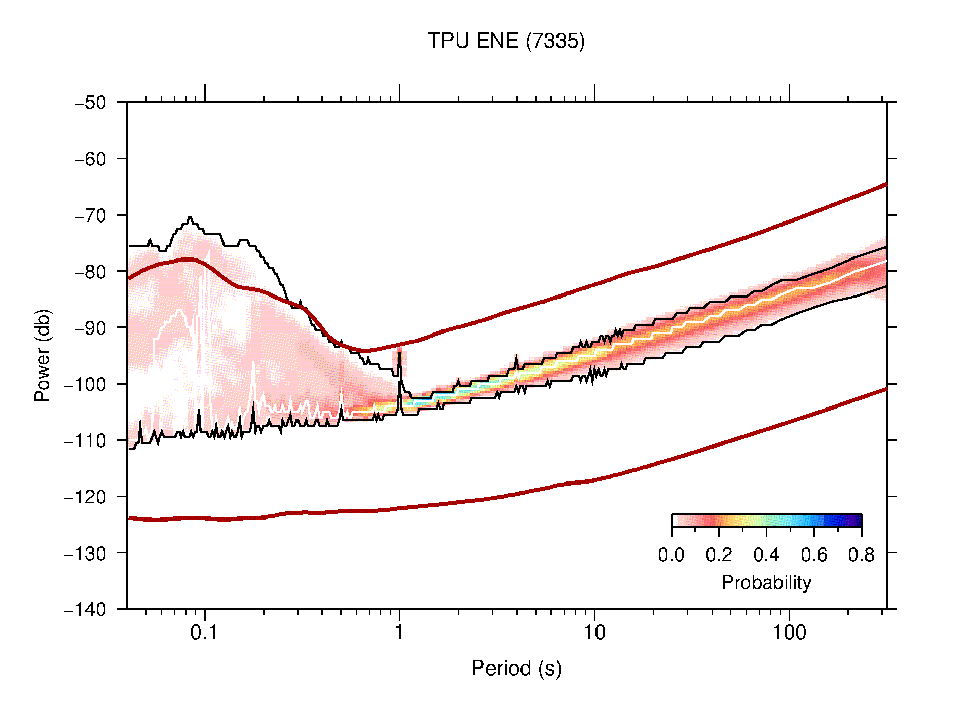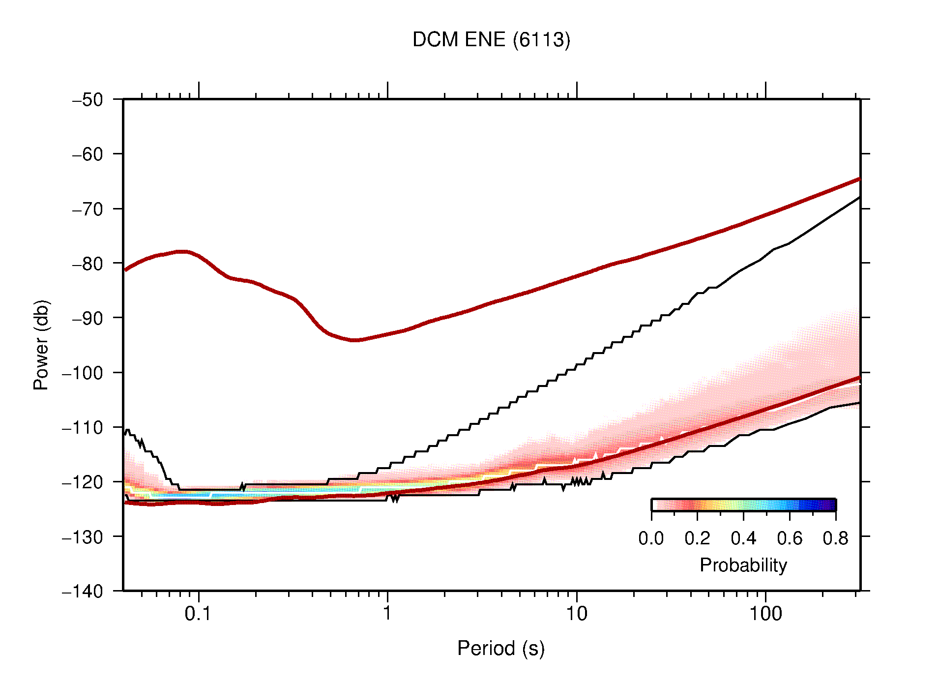 The following figures are full year PDFs for each of the 363 channels processed in this work. The same color scale is used thoughout. The black curves show 0.5 and 99.5 percentiles while the white curve shows the mode. The number of PSDs contributing to the PDF is shown in parentheses next to the station and channel names. The y-axes represent spectral acceleration amplitudes in units of db relative to 1 m/s2 [10log10(m2/s4/Hz)]. The five channels that were not included in the network PDF because of known problems were CCUT ENE,N,Z; HCSU ENE; and HER ENE.