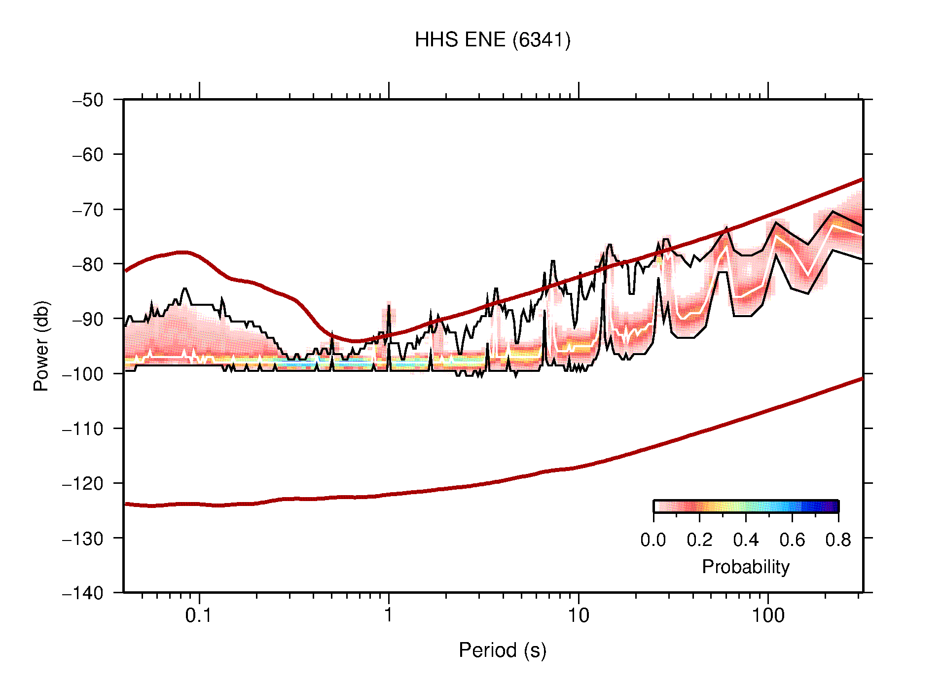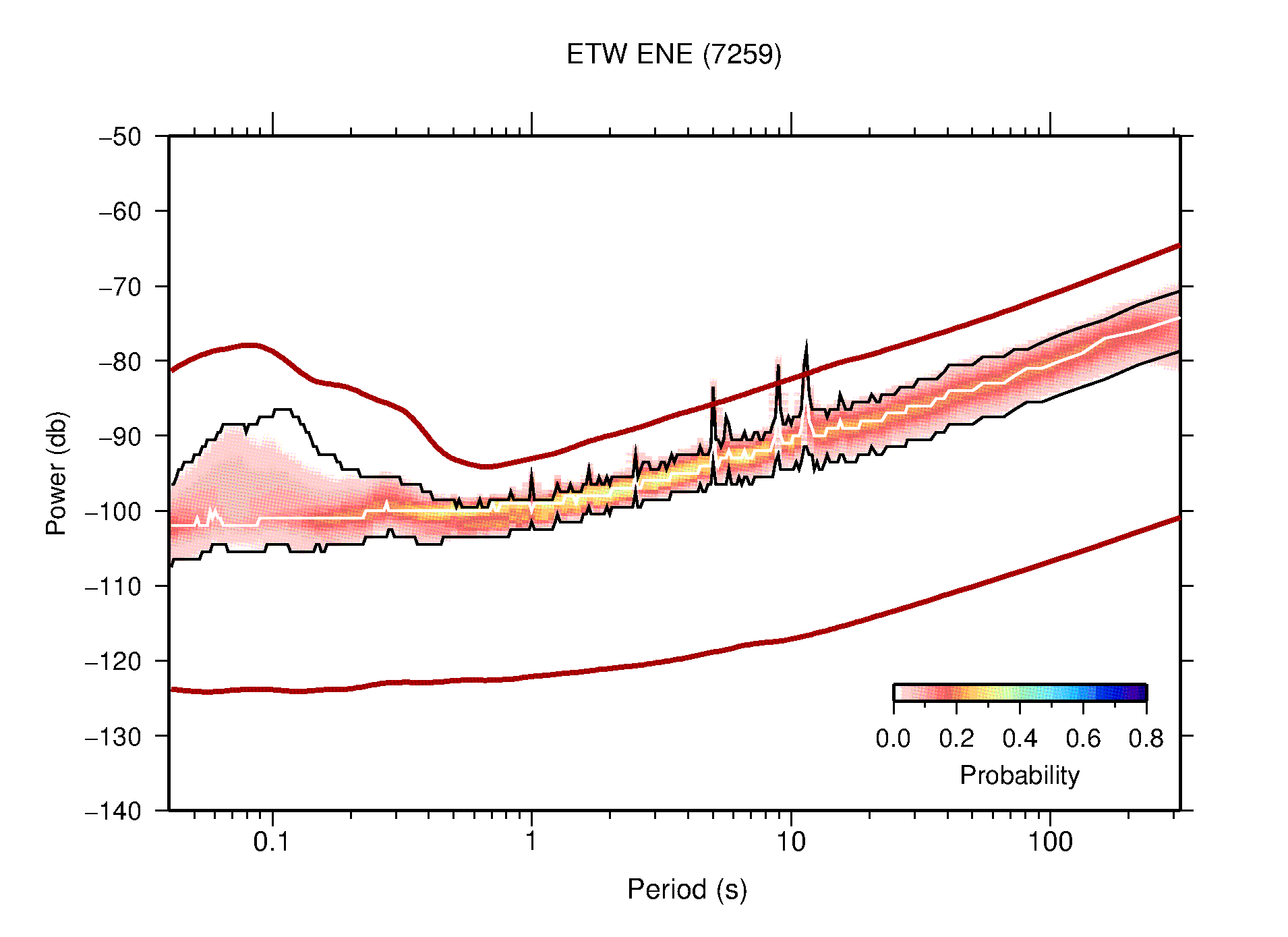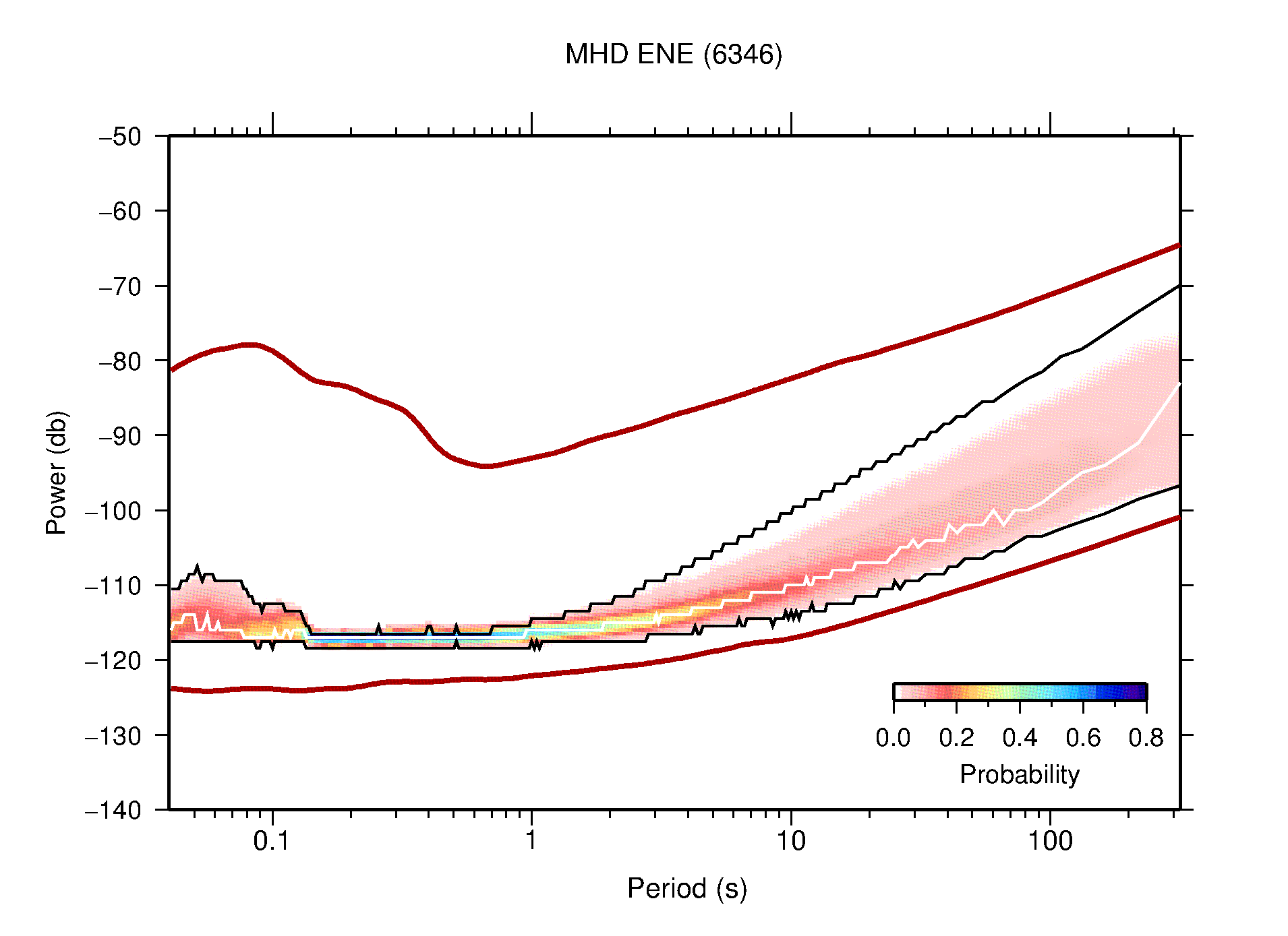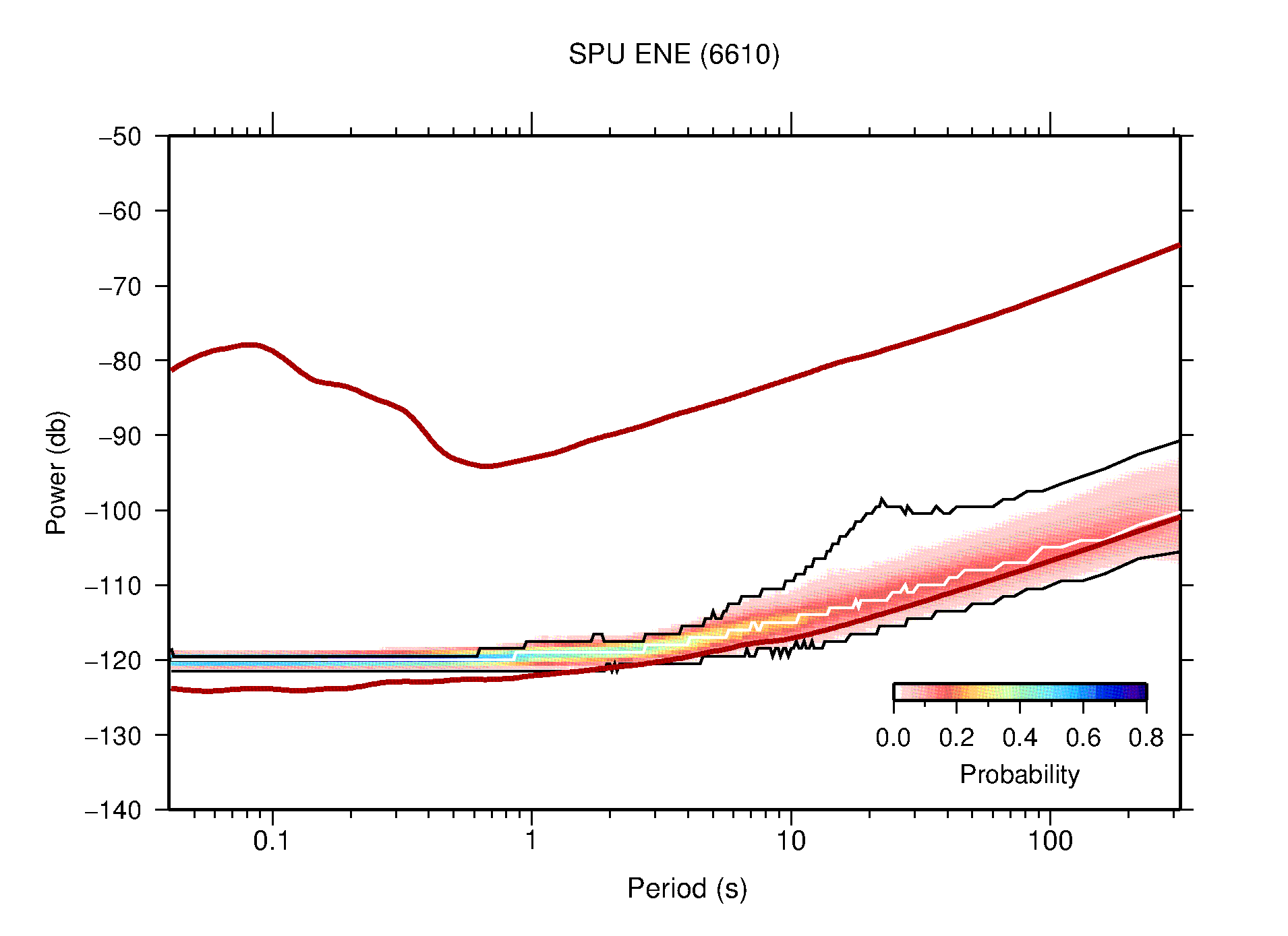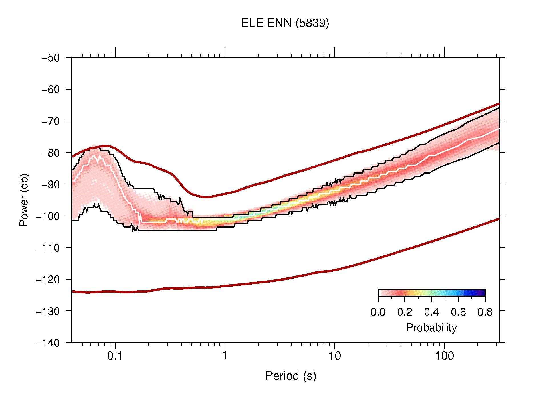 The following figures are full year PDFs for each of the 363 channels processed in this work. The same color scale is used thoughout. The black curves show 0.5 and 99.5 percentiles while the white curve shows the mode. The number of PSDs contributing to the PDF is shown in parentheses next to the station and channel names. The y-axes represent spectral acceleration amplitudes in units of db relative to 1 m/s2 [10log10(m2/s4/Hz)]. The five channels that were not included in the network PDF because of known problems were CCUT ENE,N,Z; HCSU ENE; and HER ENE.