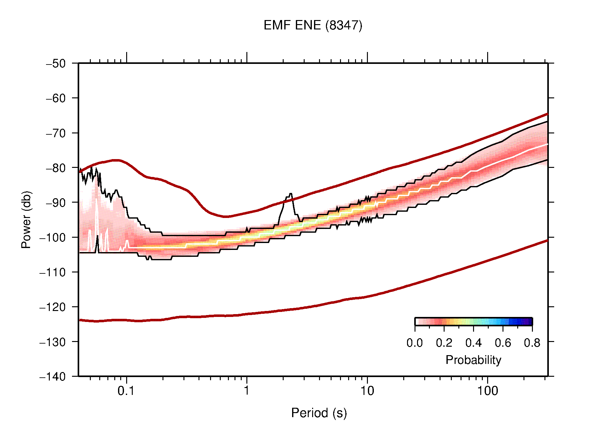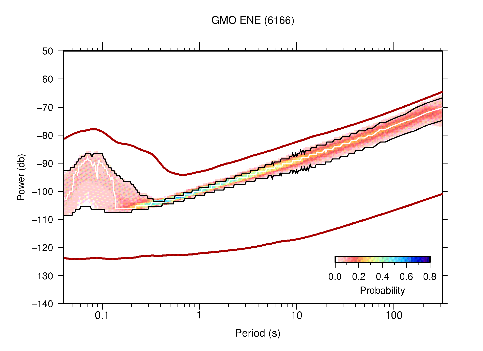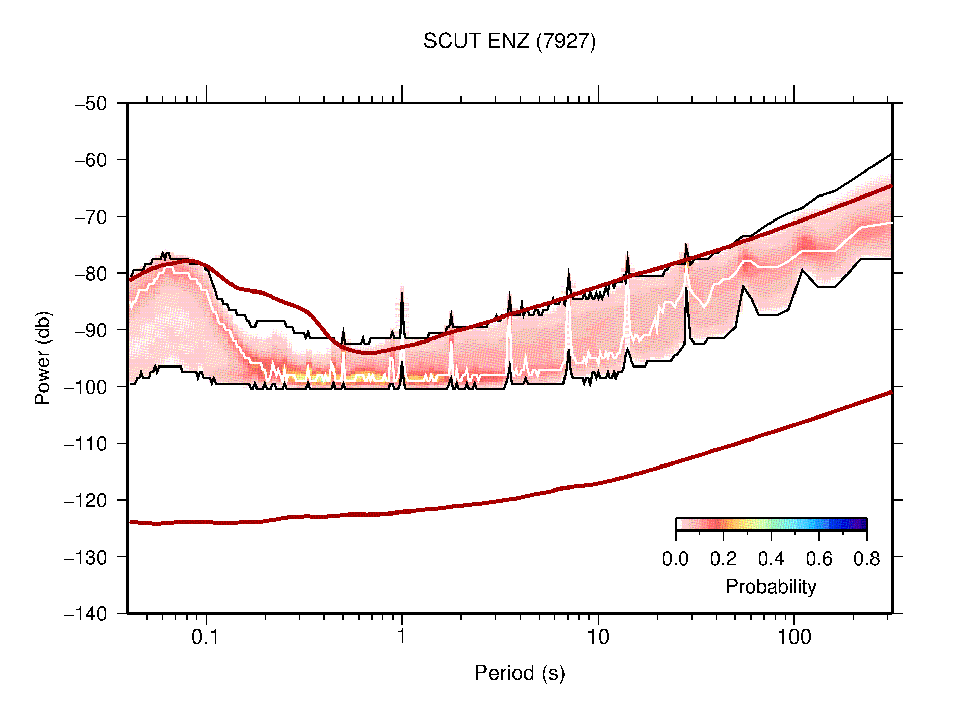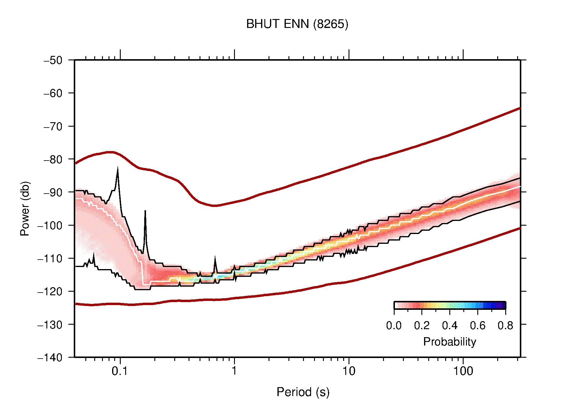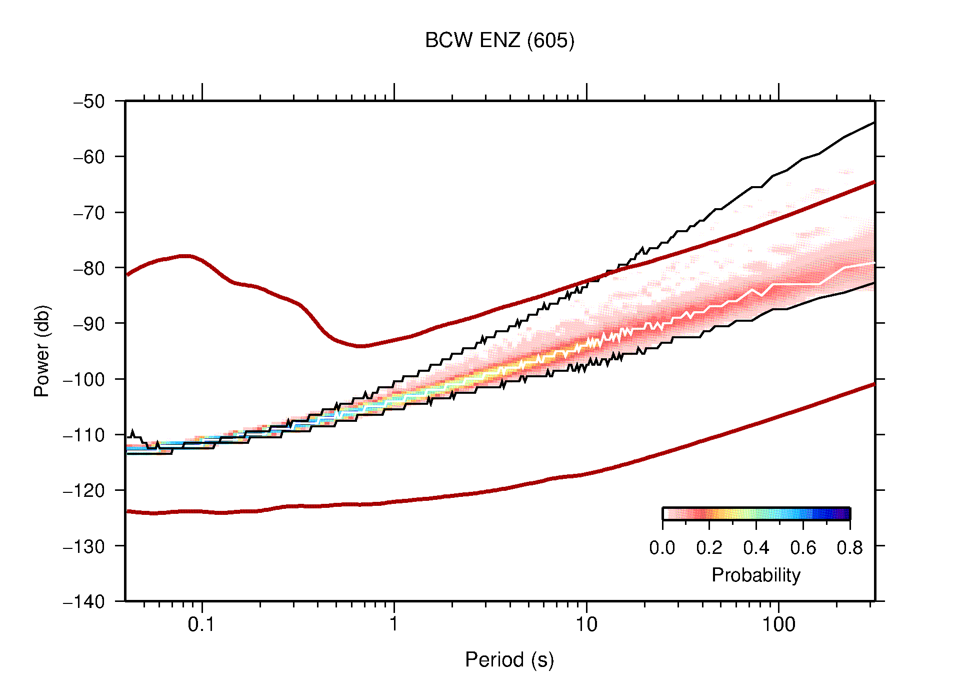 The following figures are full year PDFs for each of the 363 channels processed in this work. The same color scale is used thoughout. The black curves show 0.5 and 99.5 percentiles while the white curve shows the mode. The number of PSDs contributing to the PDF is shown in parentheses next to the station and channel names. The y-axes represent spectral acceleration amplitudes in units of db relative to 1 m/s2 [10log10(m2/s4/Hz)]. The five channels that were not included in the network PDF because of known problems were CCUT ENE,N,Z; HCSU ENE; and HER ENE.