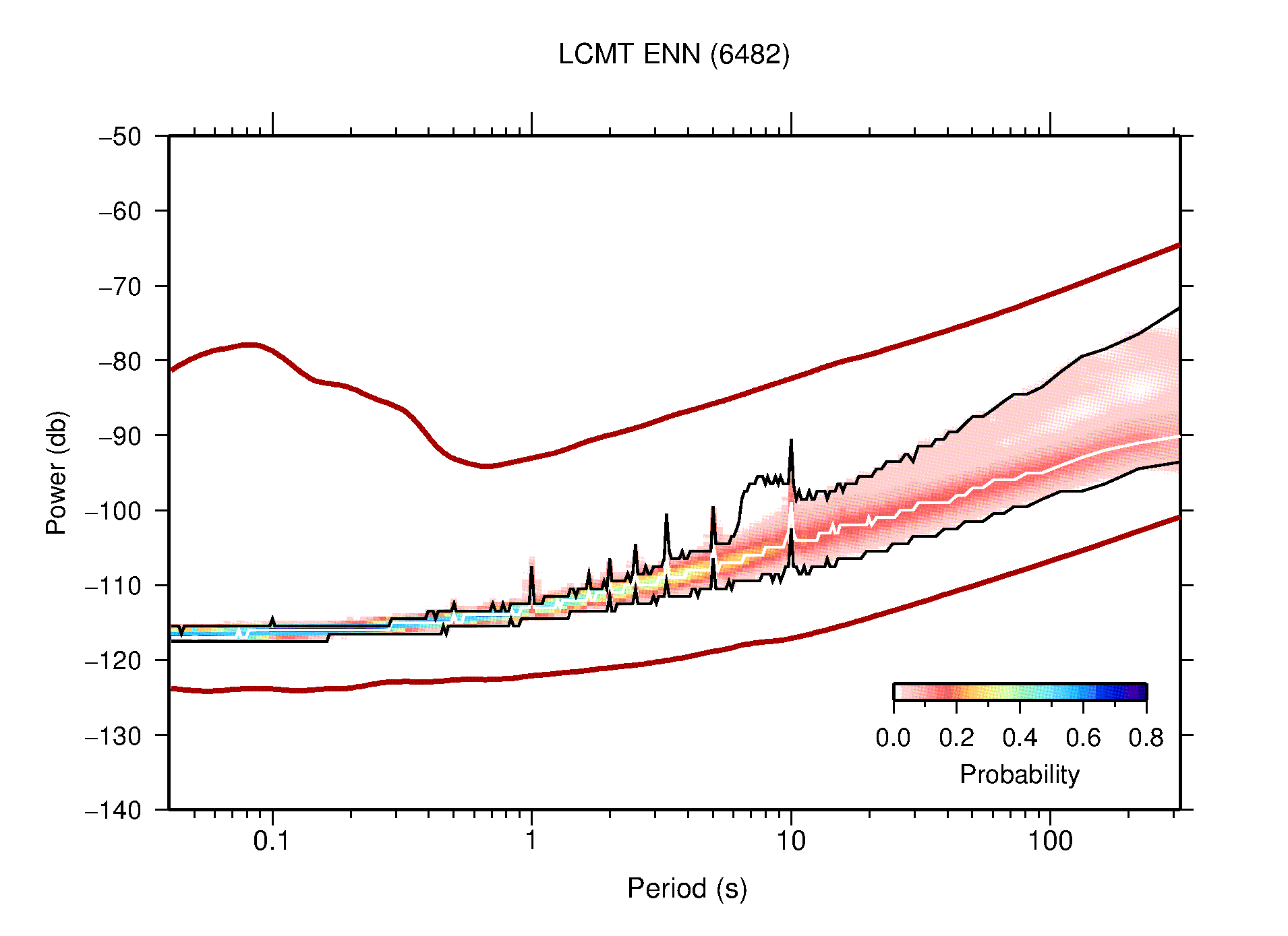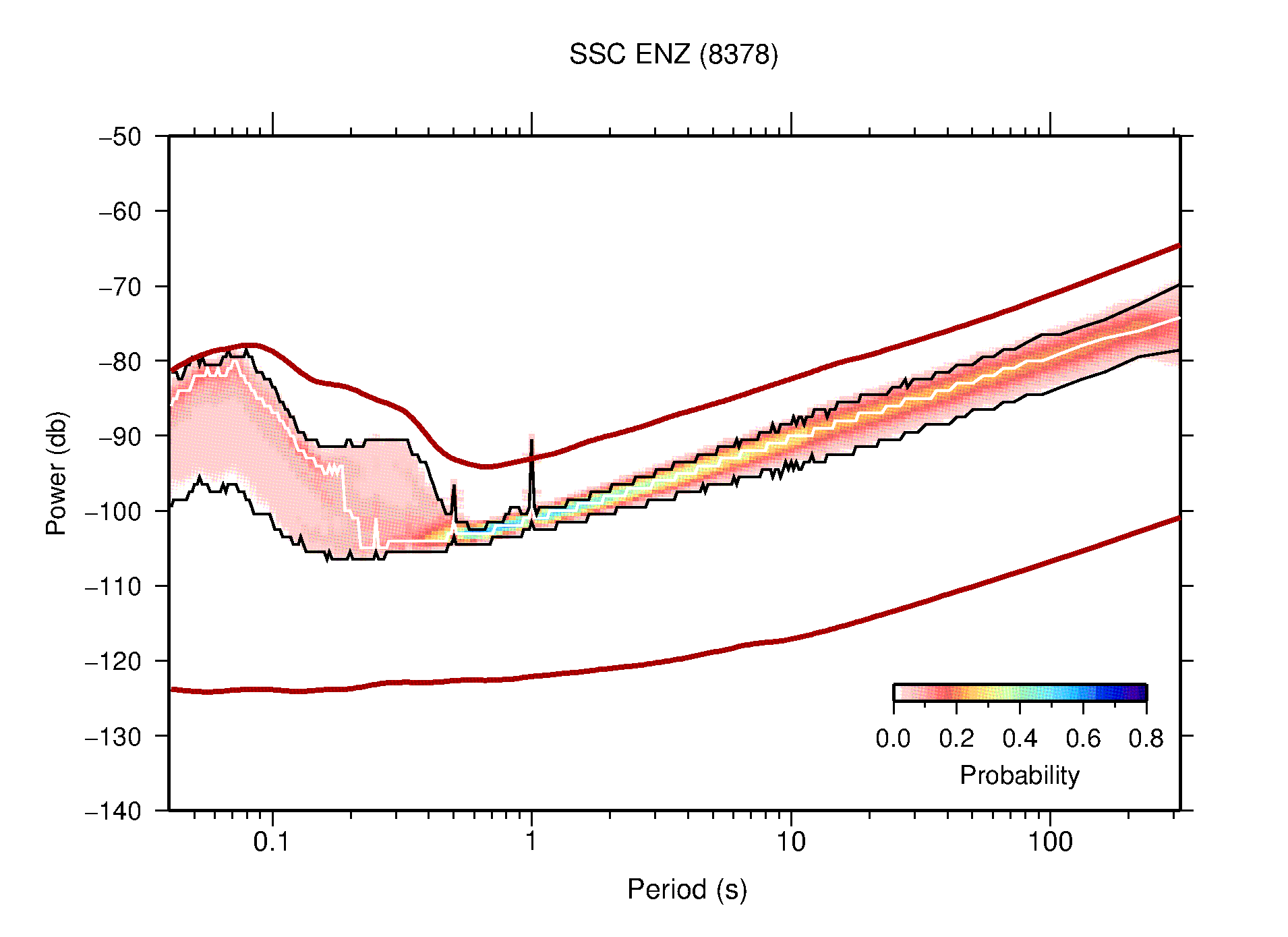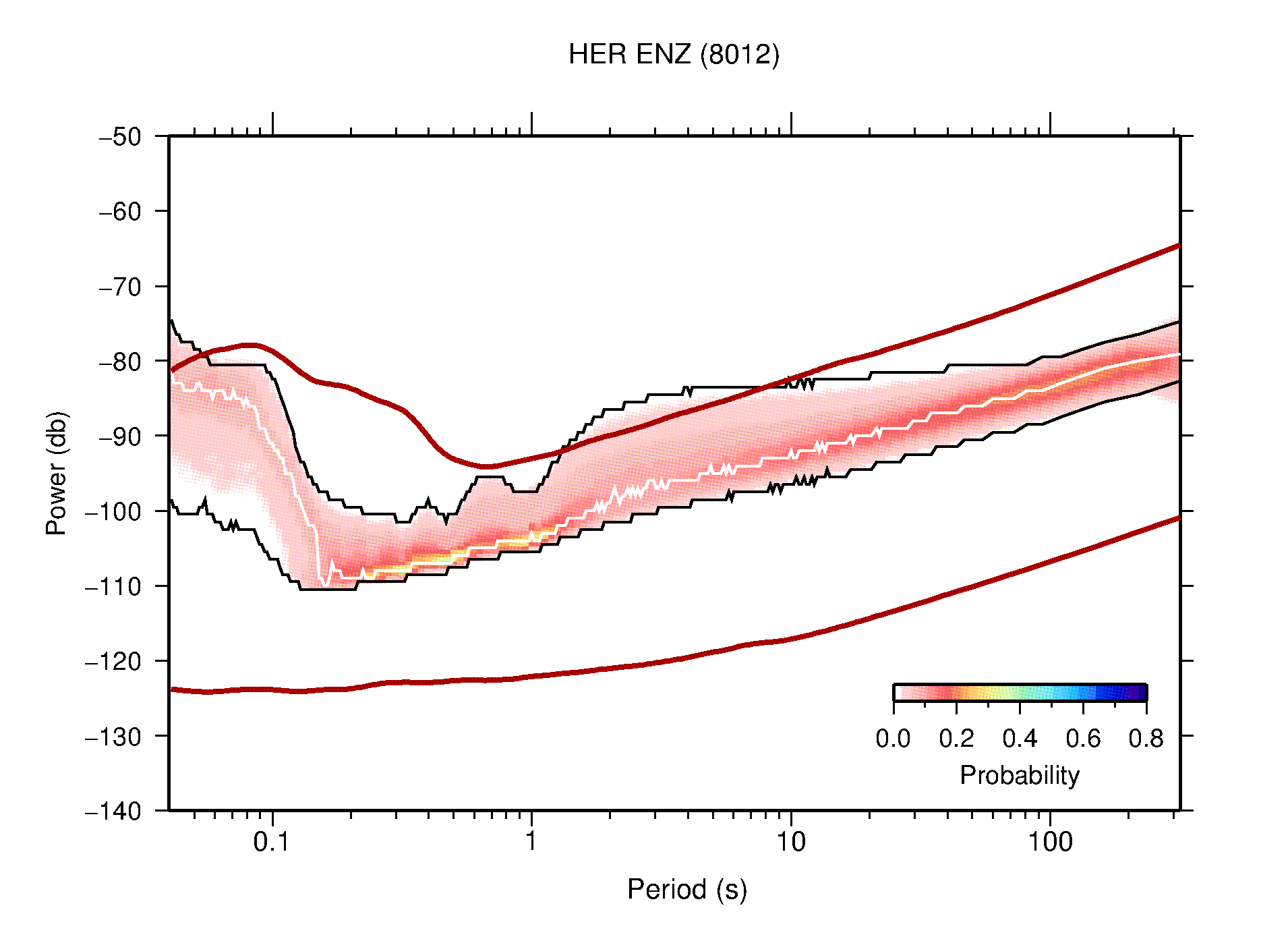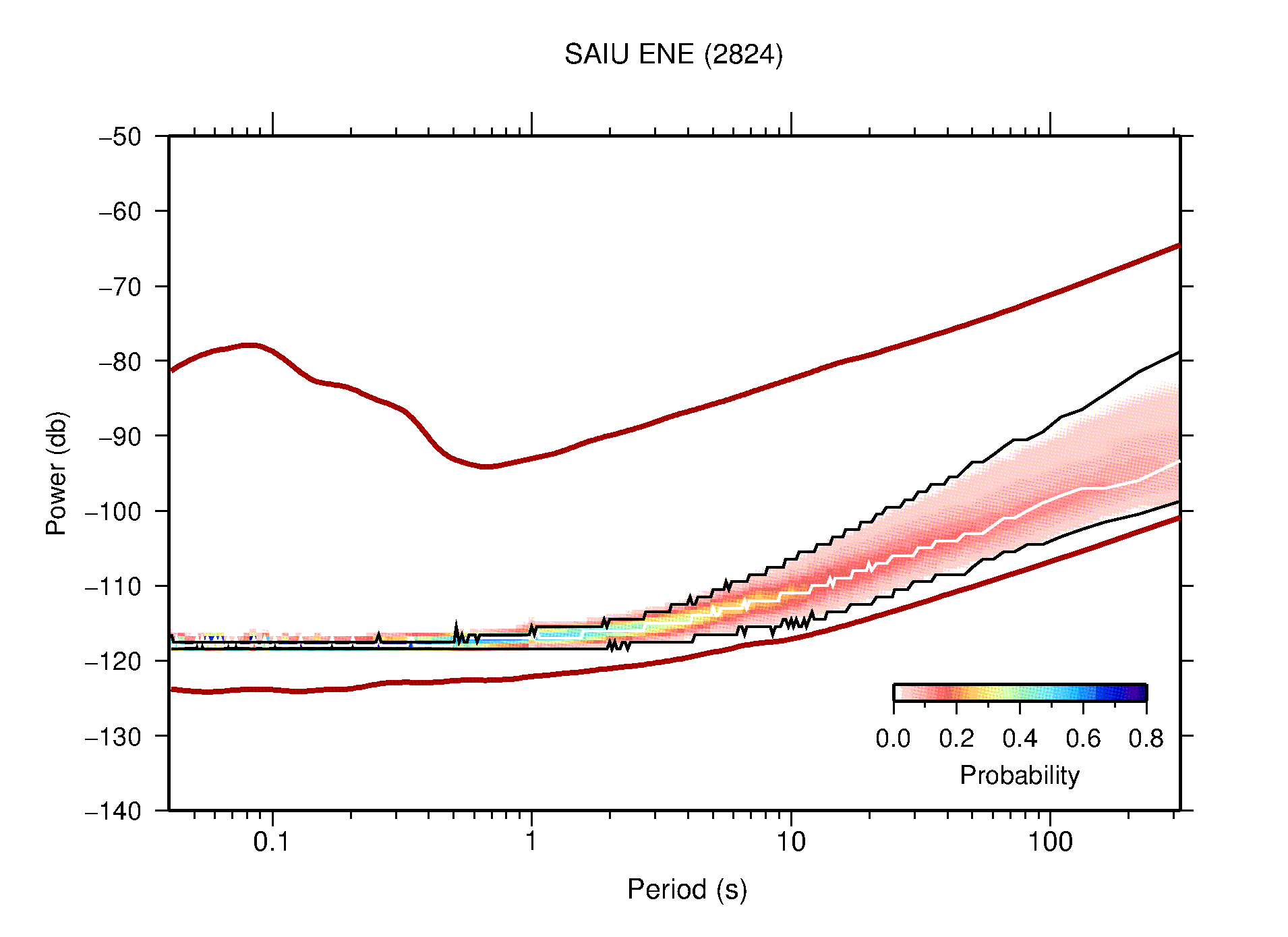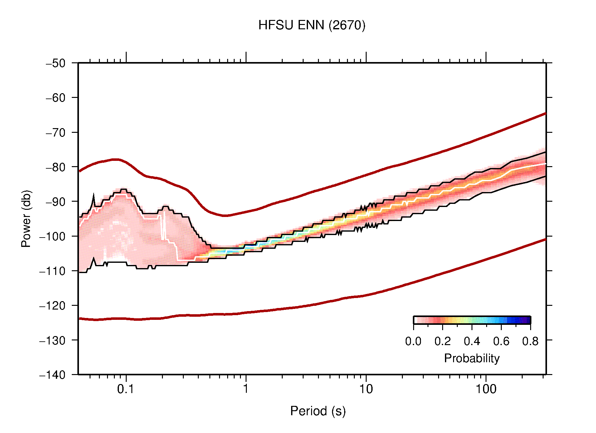 The following figures are full year PDFs for each of the 363 channels processed in this work. The same color scale is used thoughout. The black curves show 0.5 and 99.5 percentiles while the white curve shows the mode. The number of PSDs contributing to the PDF is shown in parentheses next to the station and channel names. The y-axes represent spectral acceleration amplitudes in units of db relative to 1 m/s2 [10log10(m2/s4/Hz)]. The five channels that were not included in the network PDF because of known problems were CCUT ENE,N,Z; HCSU ENE; and HER ENE.
