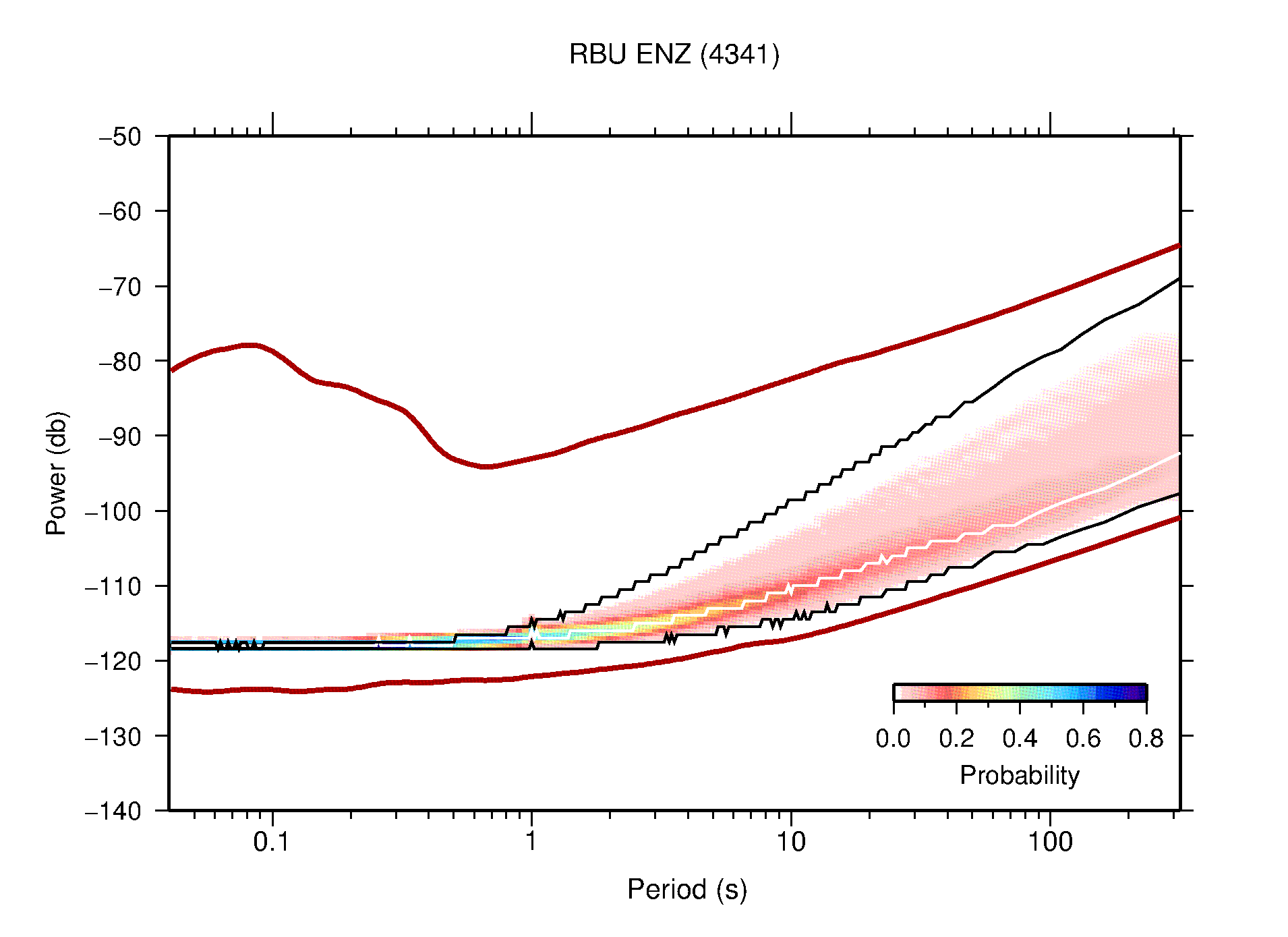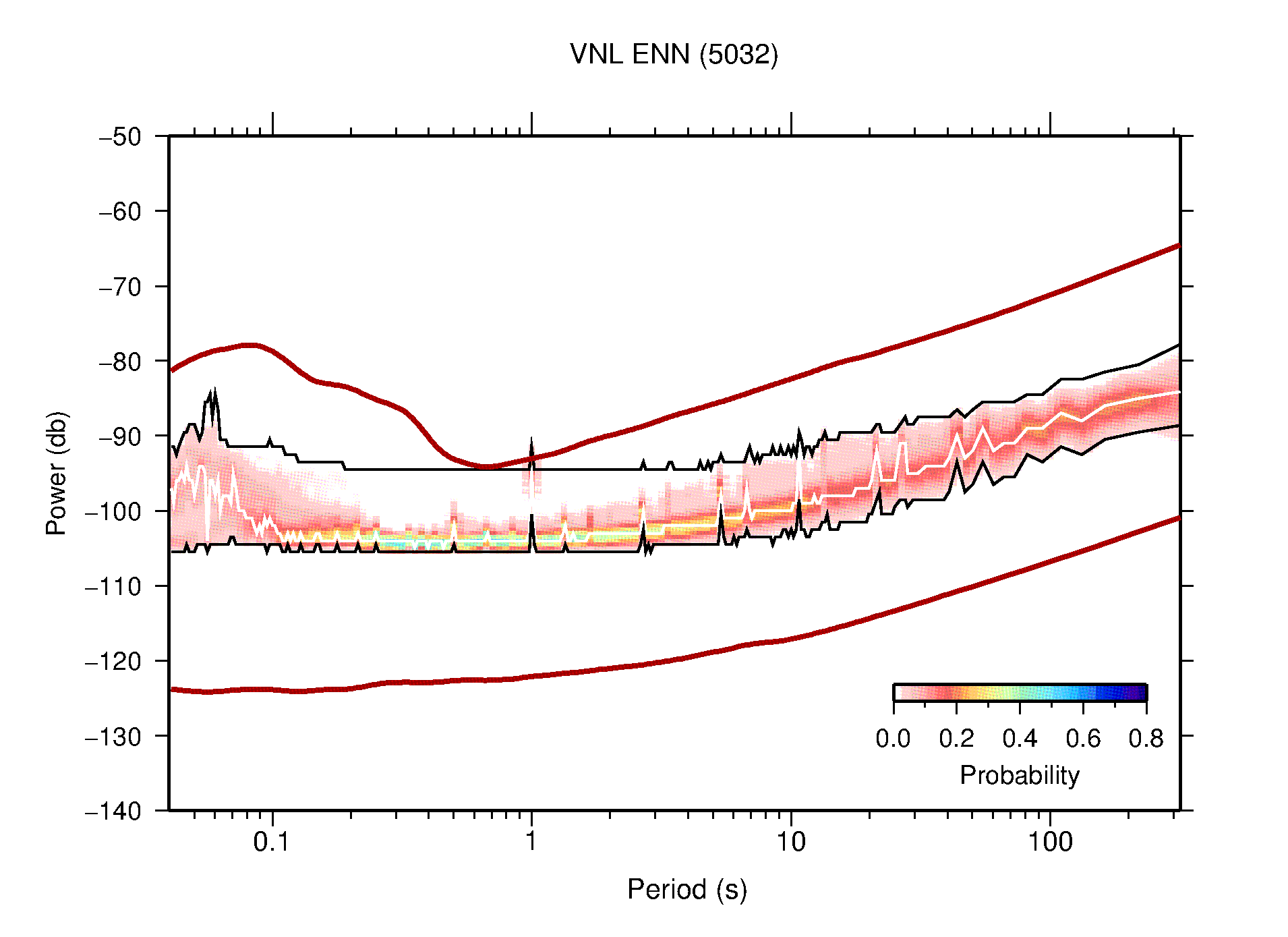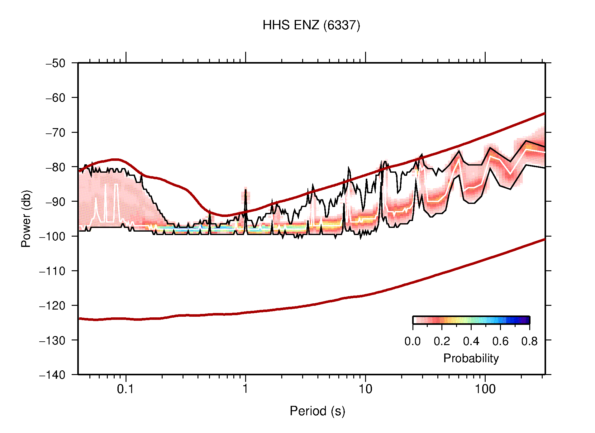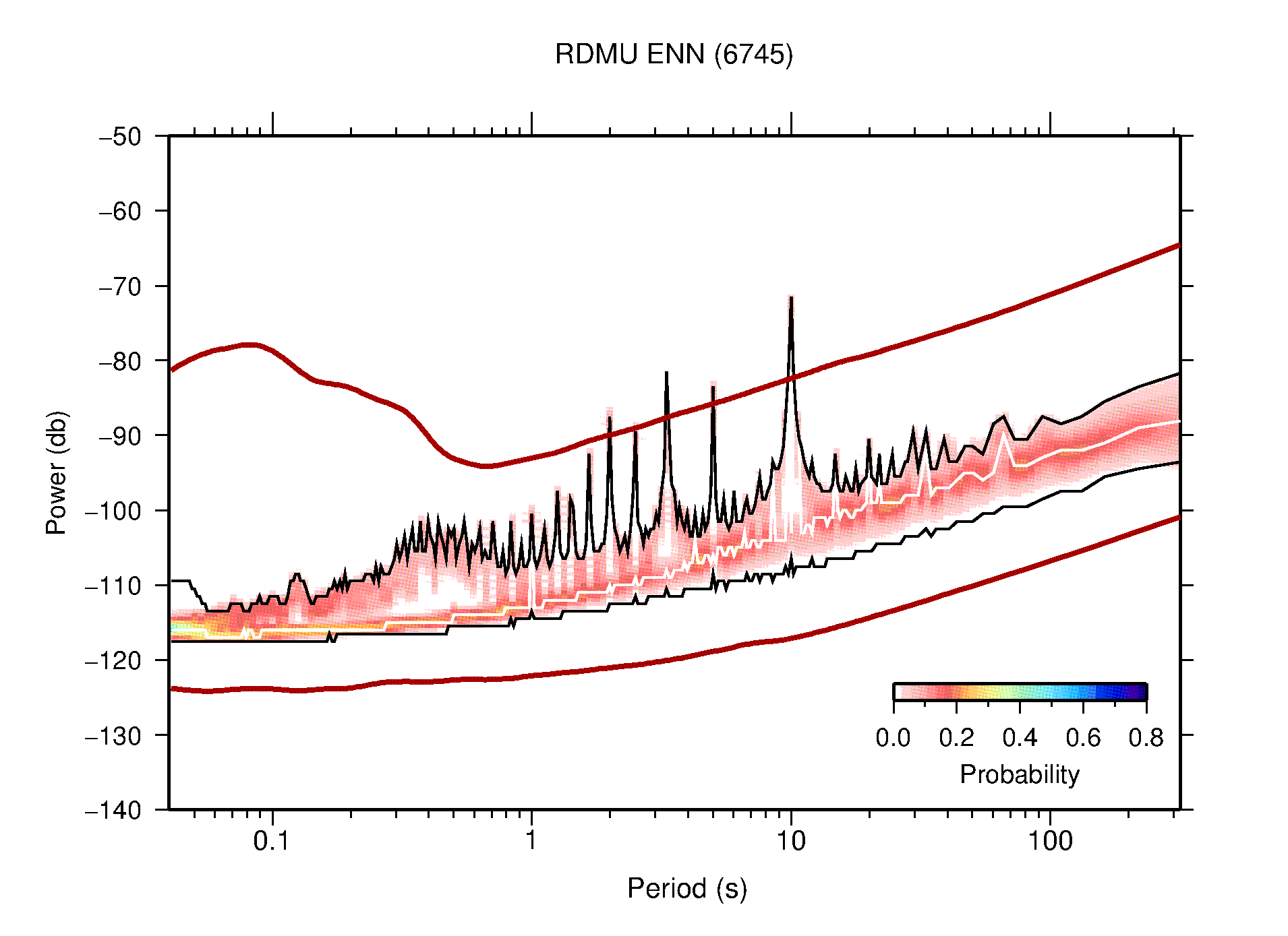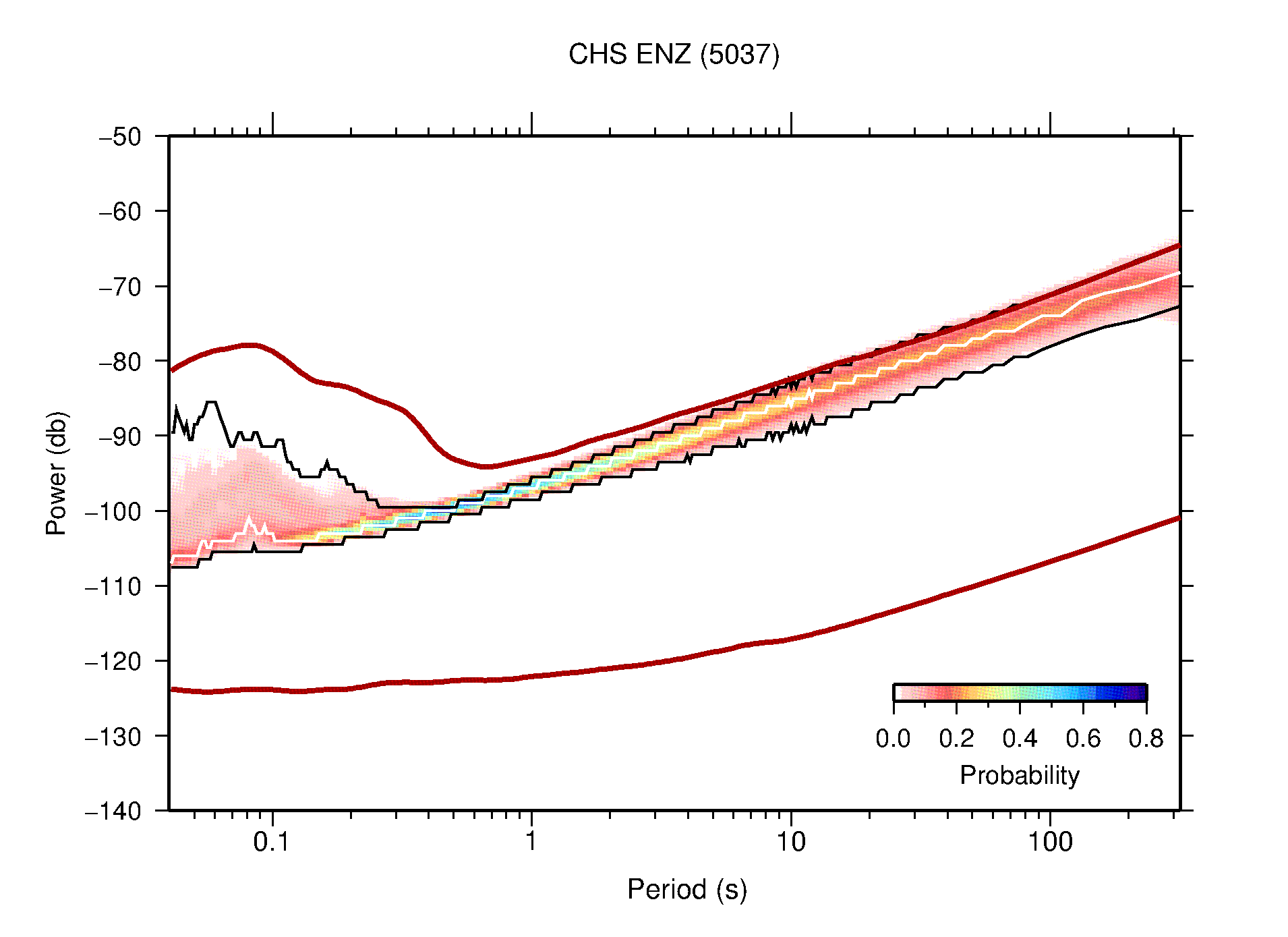 The following figures are full year PDFs for each of the 363 channels processed in this work. The same color scale is used thoughout. The black curves show 0.5 and 99.5 percentiles while the white curve shows the mode. The number of PSDs contributing to the PDF is shown in parentheses next to the station and channel names. The y-axes represent spectral acceleration amplitudes in units of db relative to 1 m/s2 [10log10(m2/s4/Hz)]. The five channels that were not included in the network PDF because of known problems were CCUT ENE,N,Z; HCSU ENE; and HER ENE.