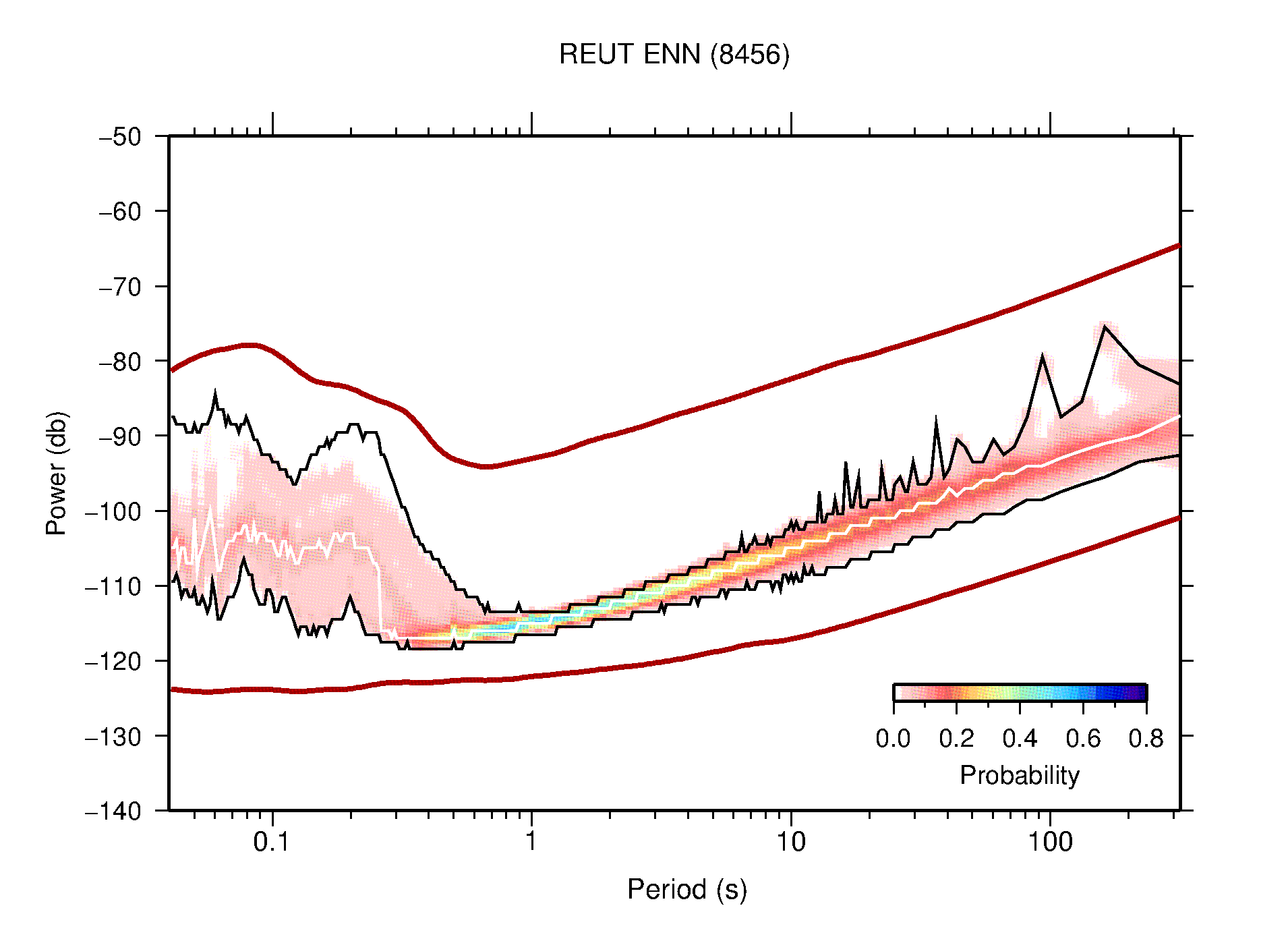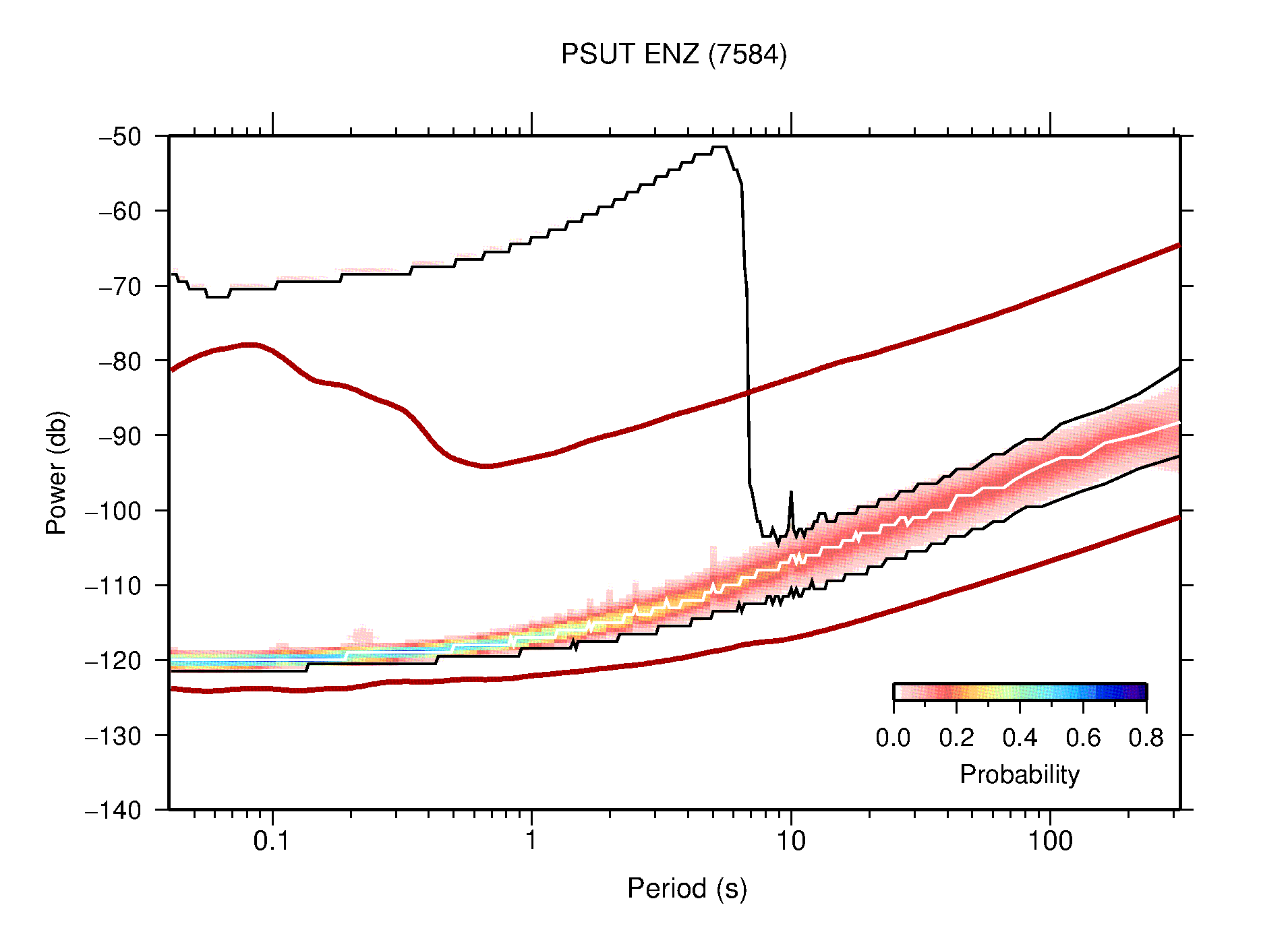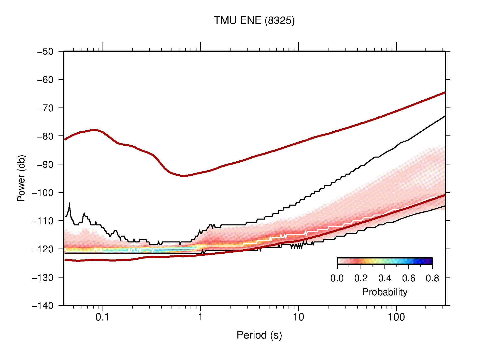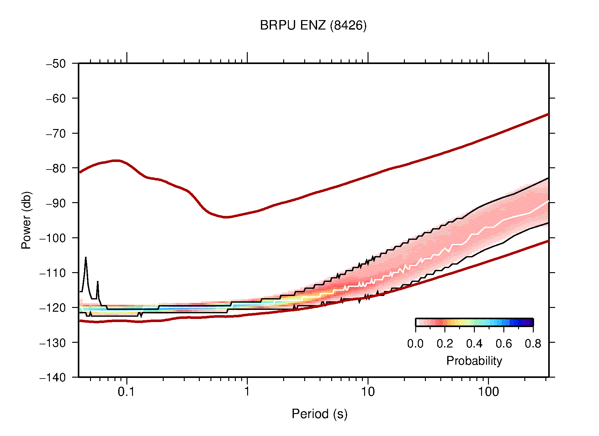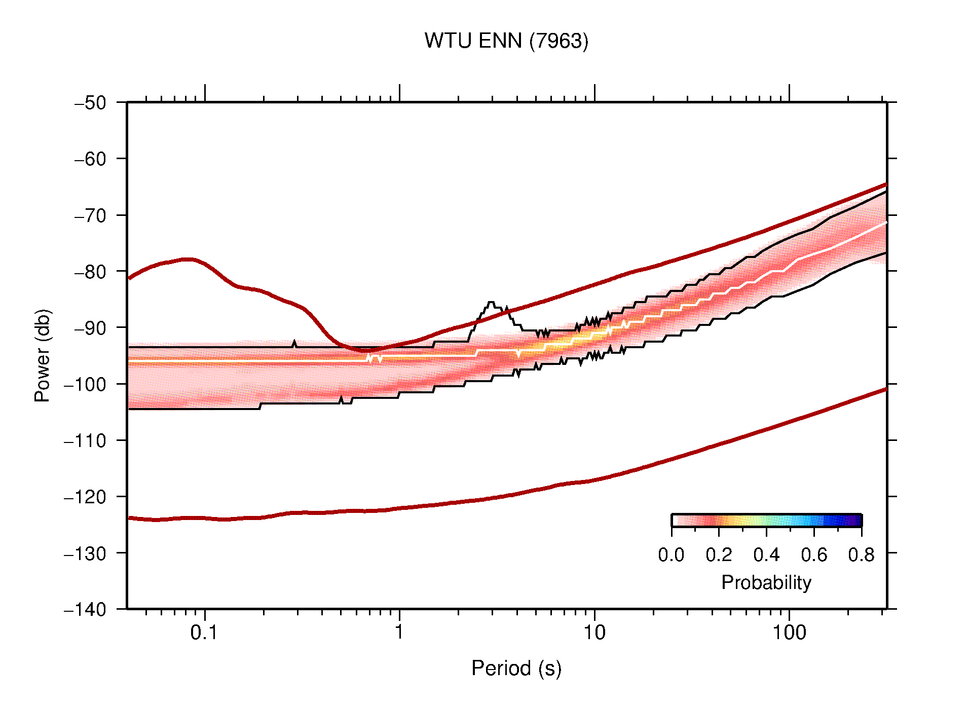 The following figures are full year PDFs for each of the 363 channels processed in this work. The same color scale is used thoughout. The black curves show 0.5 and 99.5 percentiles while the white curve shows the mode. The number of PSDs contributing to the PDF is shown in parentheses next to the station and channel names. The y-axes represent spectral acceleration amplitudes in units of db relative to 1 m/s2 [10log10(m2/s4/Hz)]. The five channels that were not included in the network PDF because of known problems were CCUT ENE,N,Z; HCSU ENE; and HER ENE.