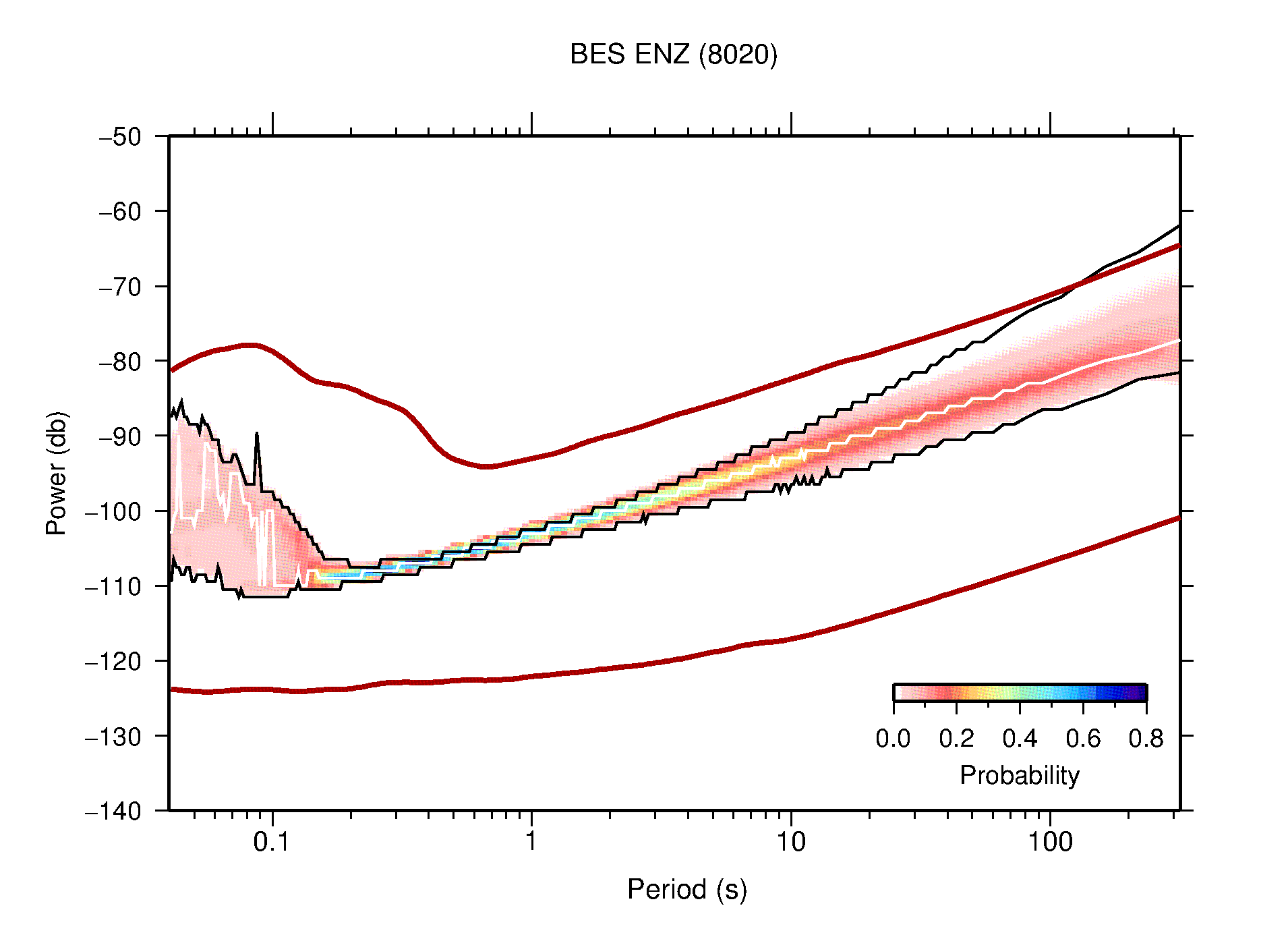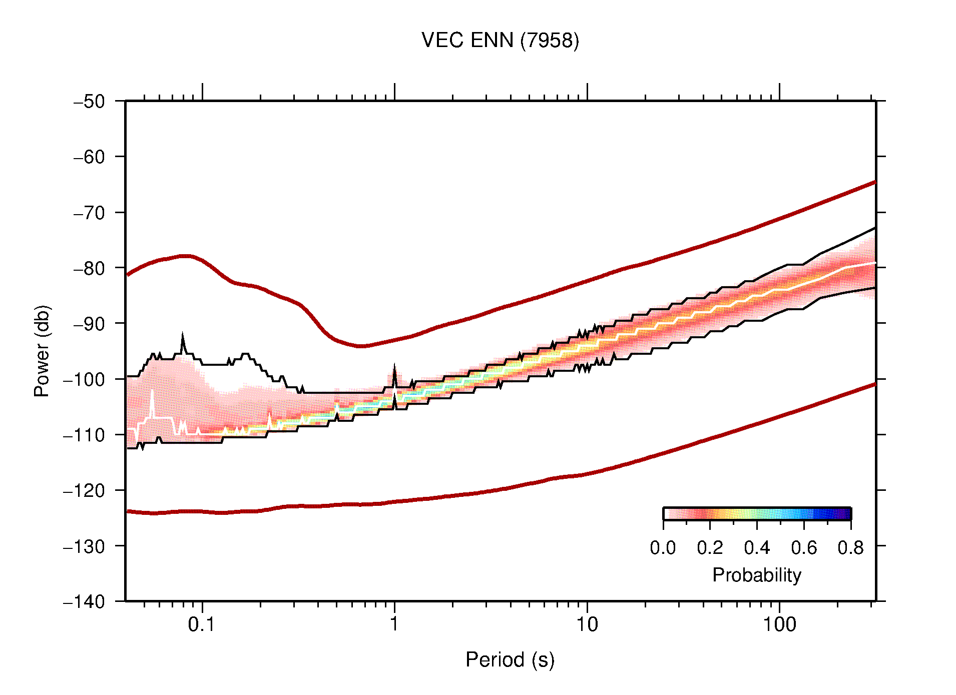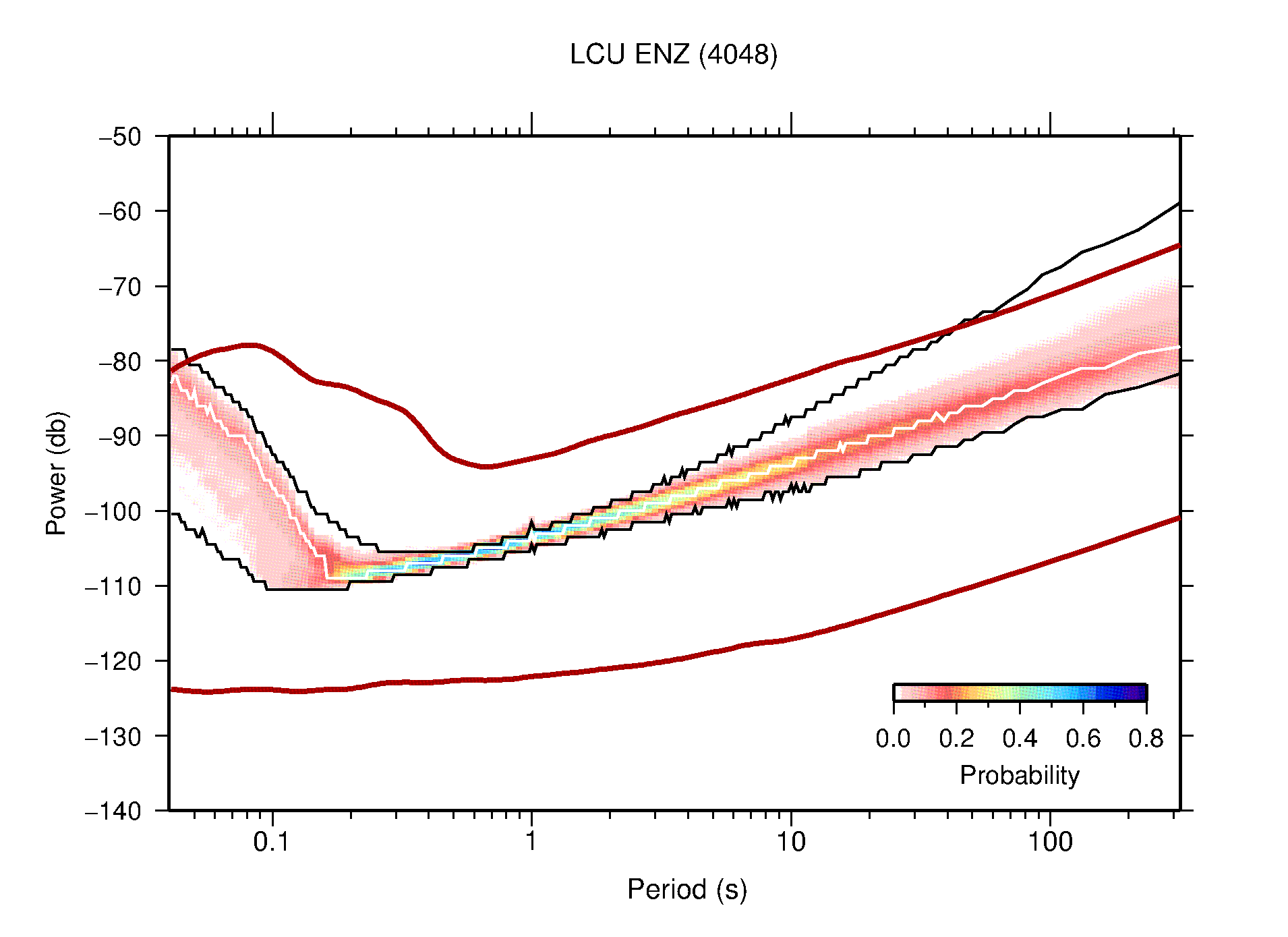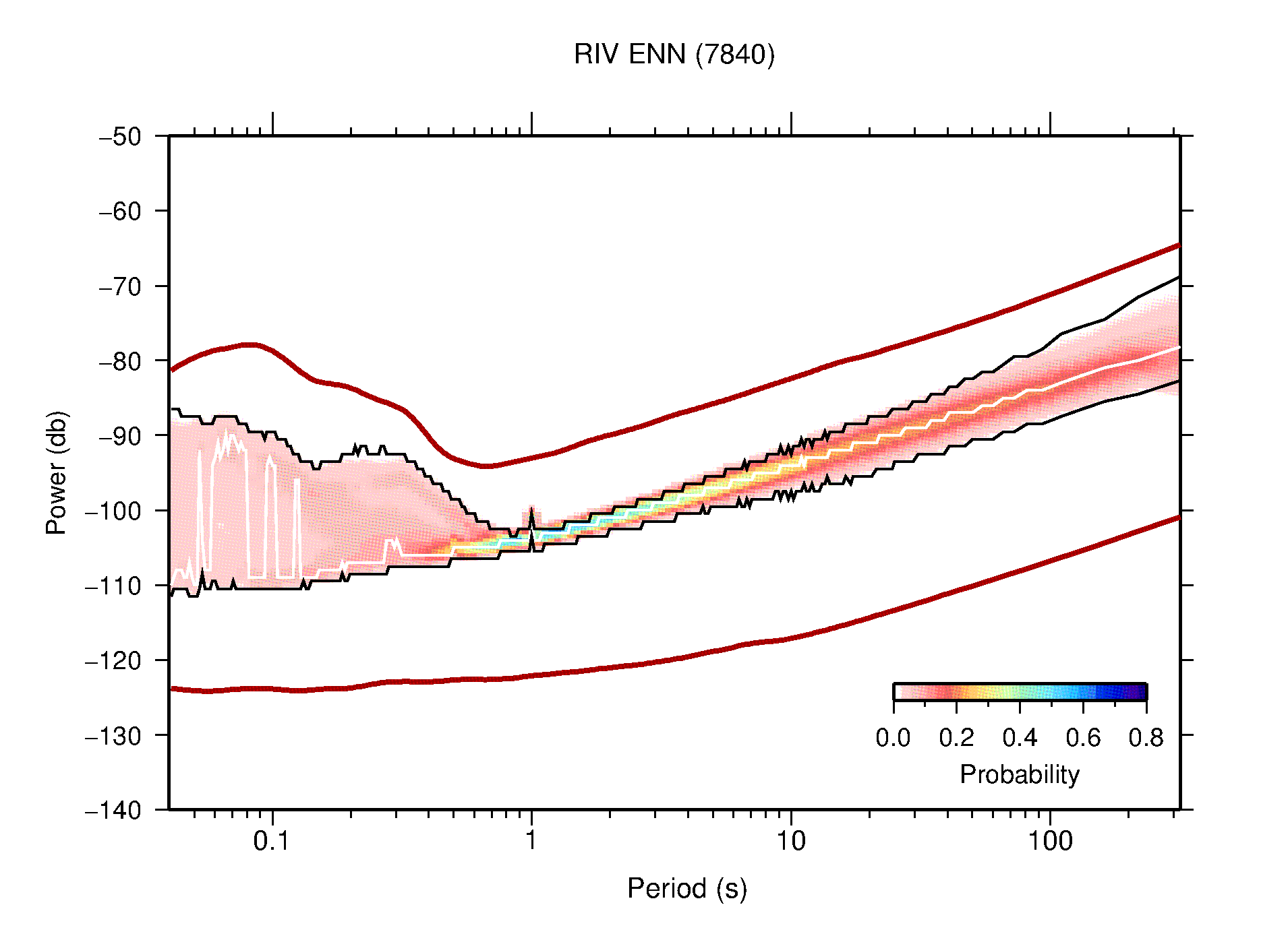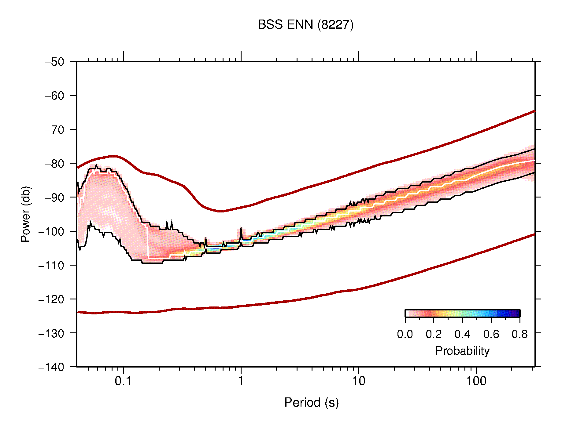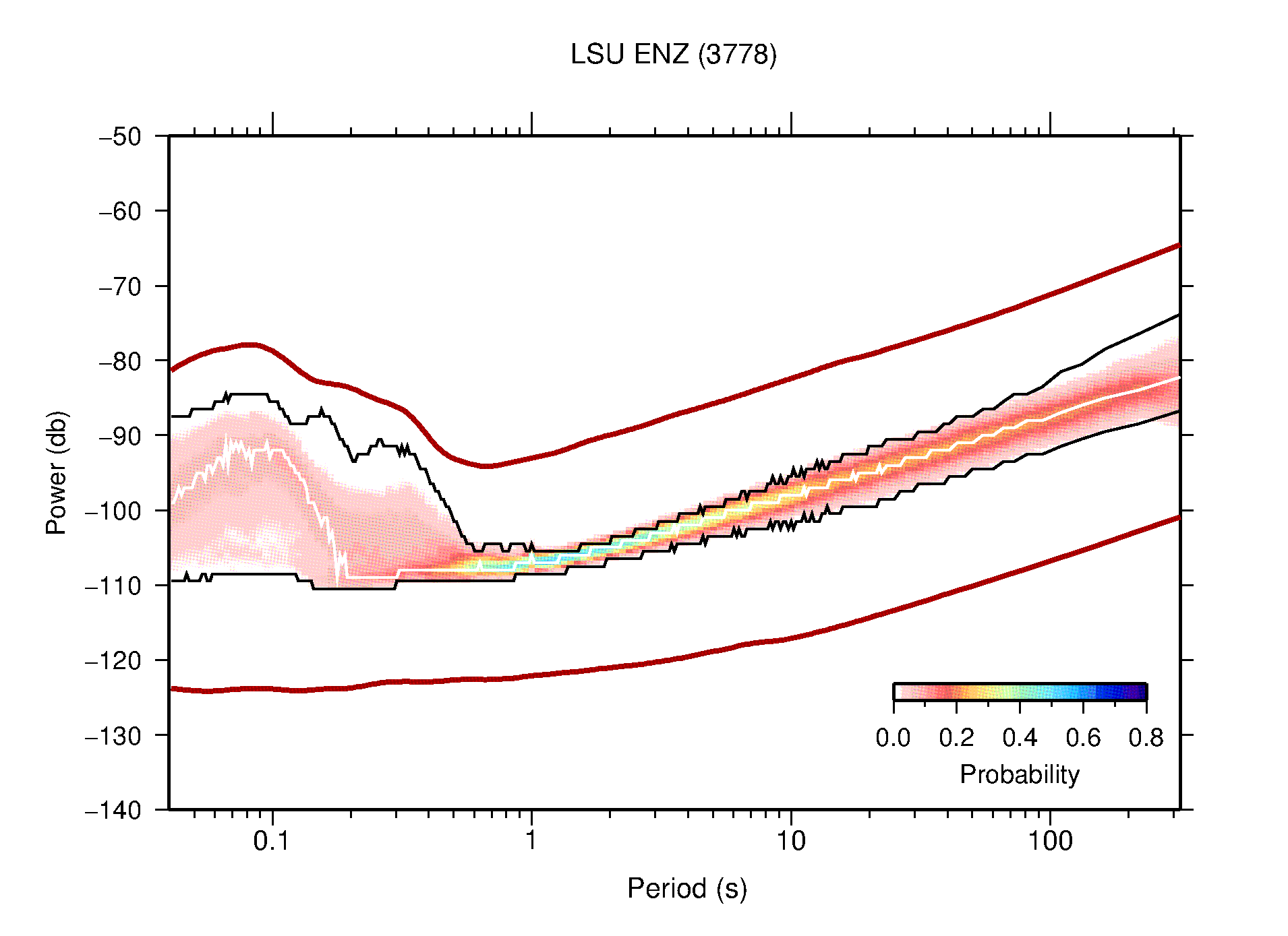 The following figures are full year PDFs for each of the 363 channels processed in this work. The same color scale is used thoughout. The black curves show 0.5 and 99.5 percentiles while the white curve shows the mode. The number of PSDs contributing to the PDF is shown in parentheses next to the station and channel names. The y-axes represent spectral acceleration amplitudes in units of db relative to 1 m/s2 [10log10(m2/s4/Hz)]. The five channels that were not included in the network PDF because of known problems were CCUT ENE,N,Z; HCSU ENE; and HER ENE.