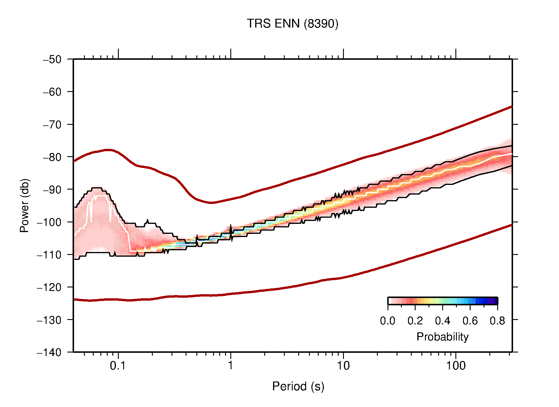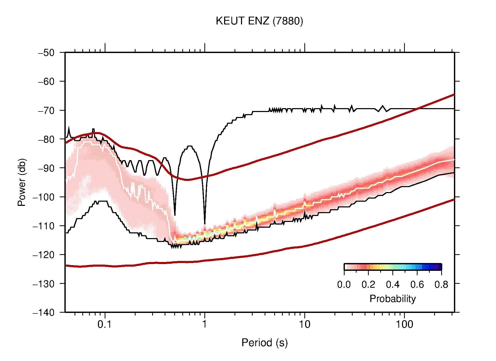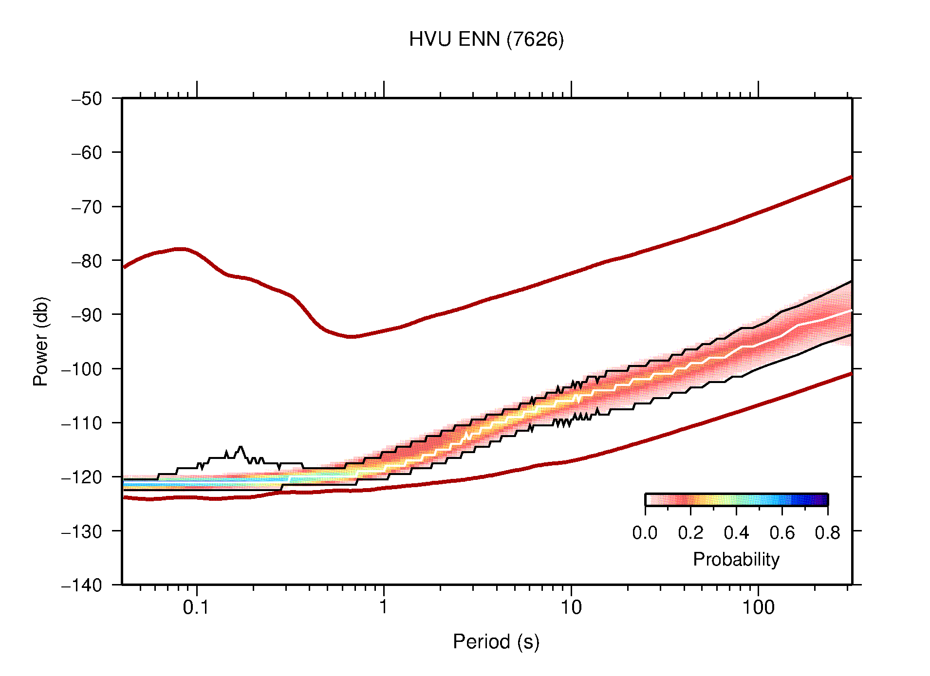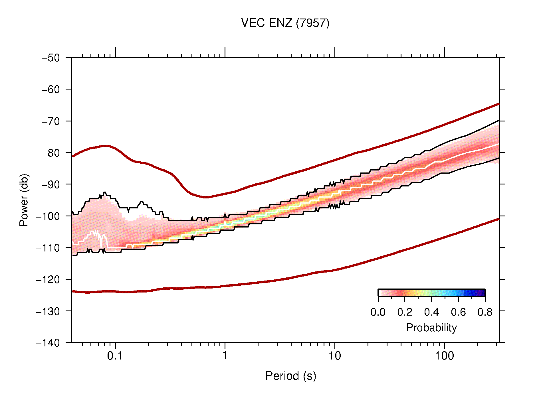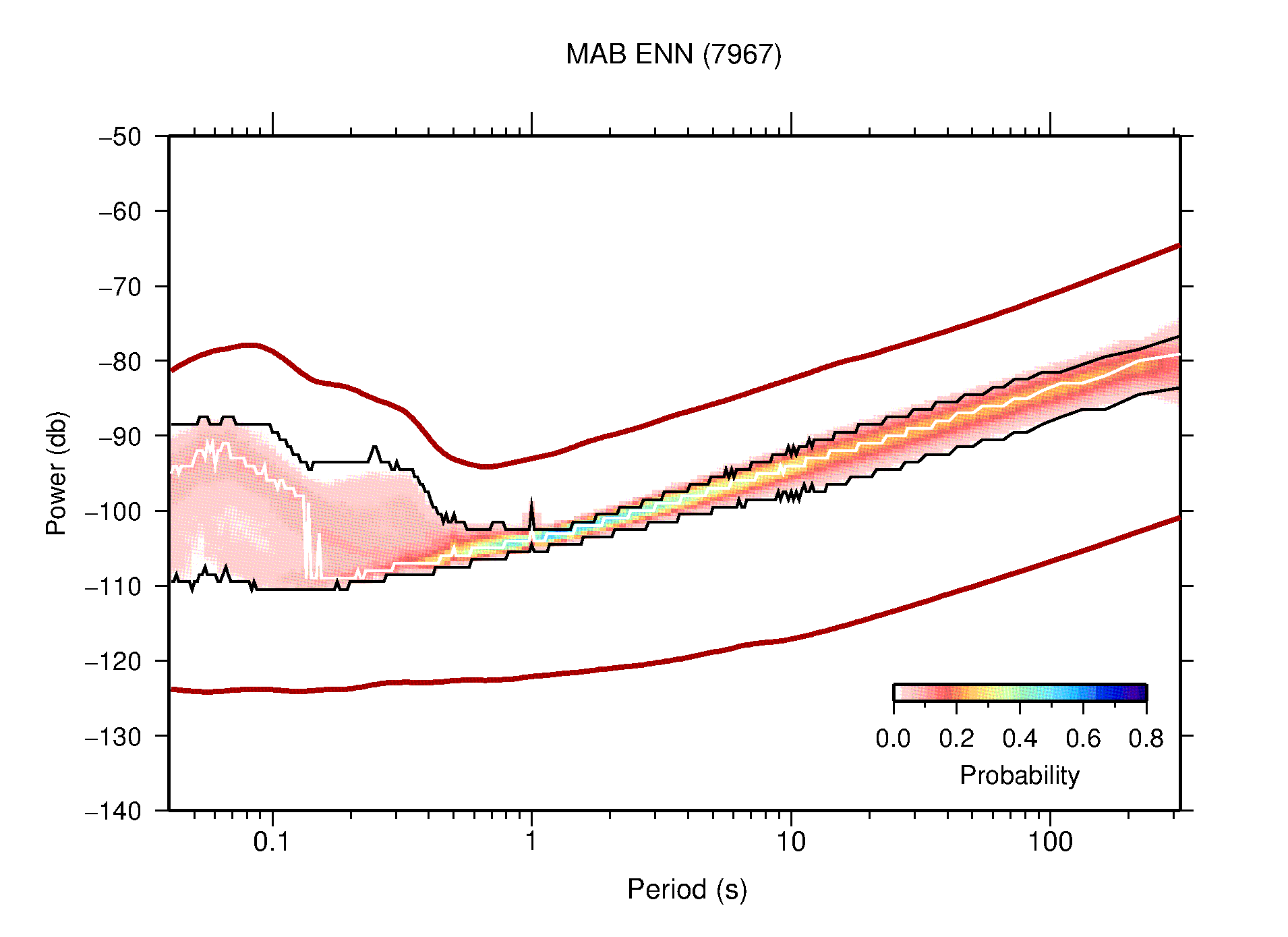 The following figures are full year PDFs for each of the 363 channels processed in this work. The same color scale is used thoughout. The black curves show 0.5 and 99.5 percentiles while the white curve shows the mode. The number of PSDs contributing to the PDF is shown in parentheses next to the station and channel names. The y-axes represent spectral acceleration amplitudes in units of db relative to 1 m/s2 [10log10(m2/s4/Hz)]. The five channels that were not included in the network PDF because of known problems were CCUT ENE,N,Z; HCSU ENE; and HER ENE.