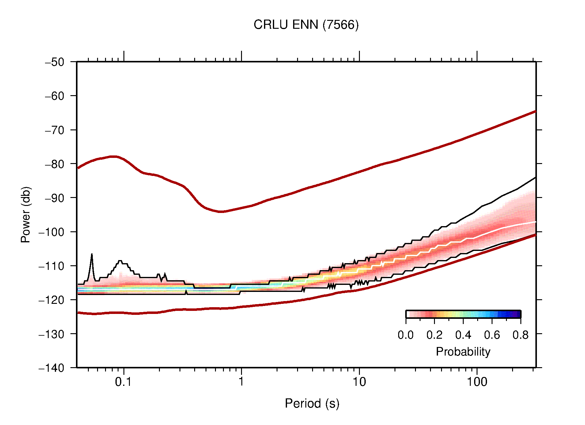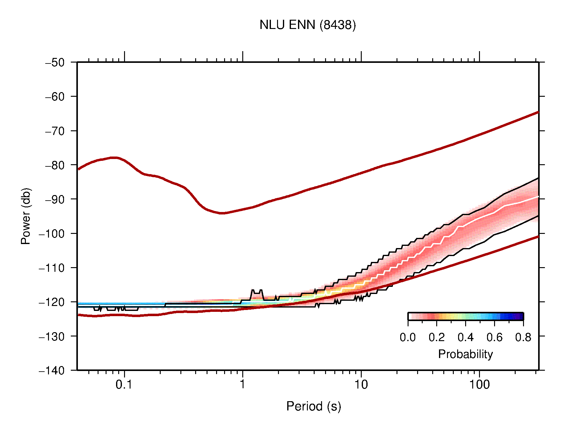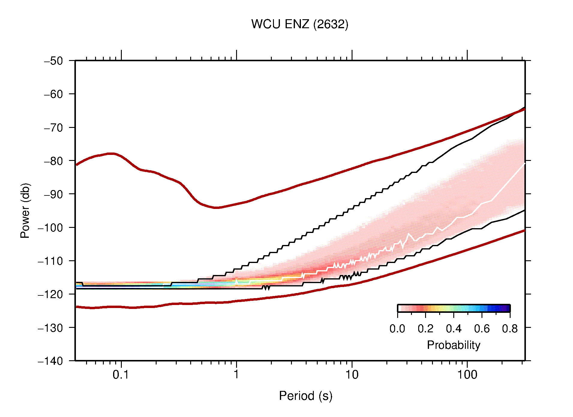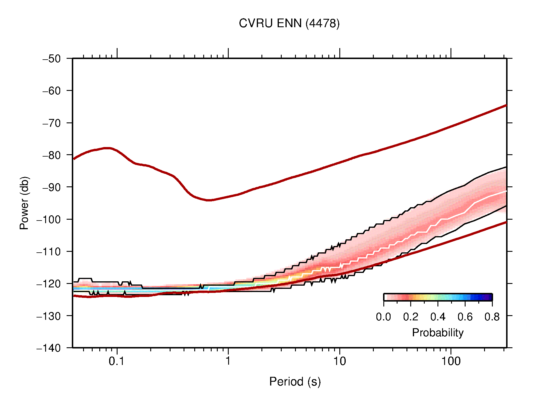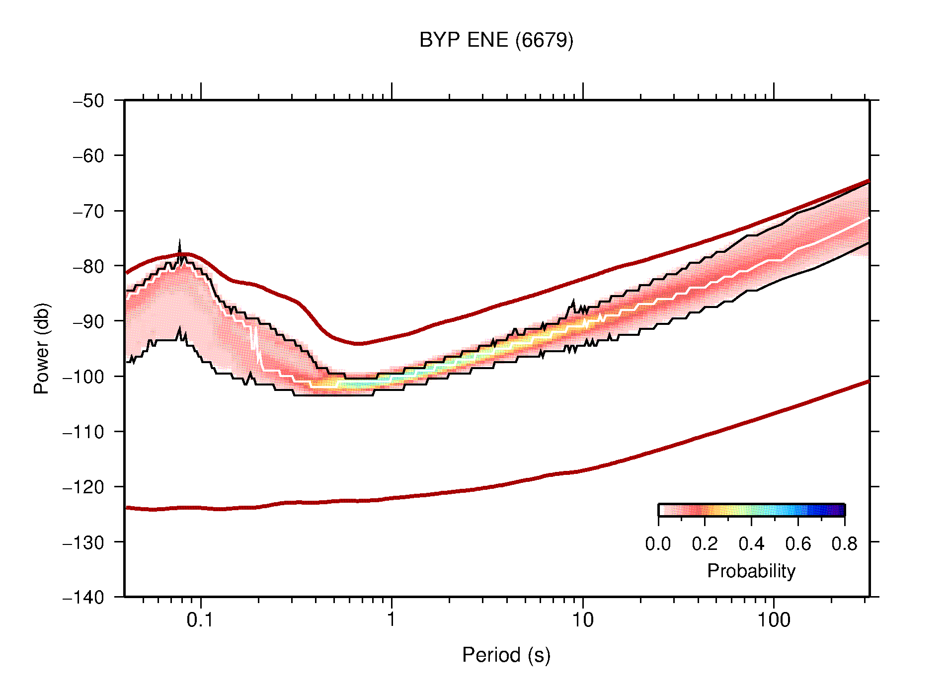 The following figures are full year PDFs for each of the 363 channels processed in this work. The same color scale is used thoughout. The black curves show 0.5 and 99.5 percentiles while the white curve shows the mode. The number of PSDs contributing to the PDF is shown in parentheses next to the station and channel names. The y-axes represent spectral acceleration amplitudes in units of db relative to 1 m/s2 [10log10(m2/s4/Hz)]. The five channels that were not included in the network PDF because of known problems were CCUT ENE,N,Z; HCSU ENE; and HER ENE.