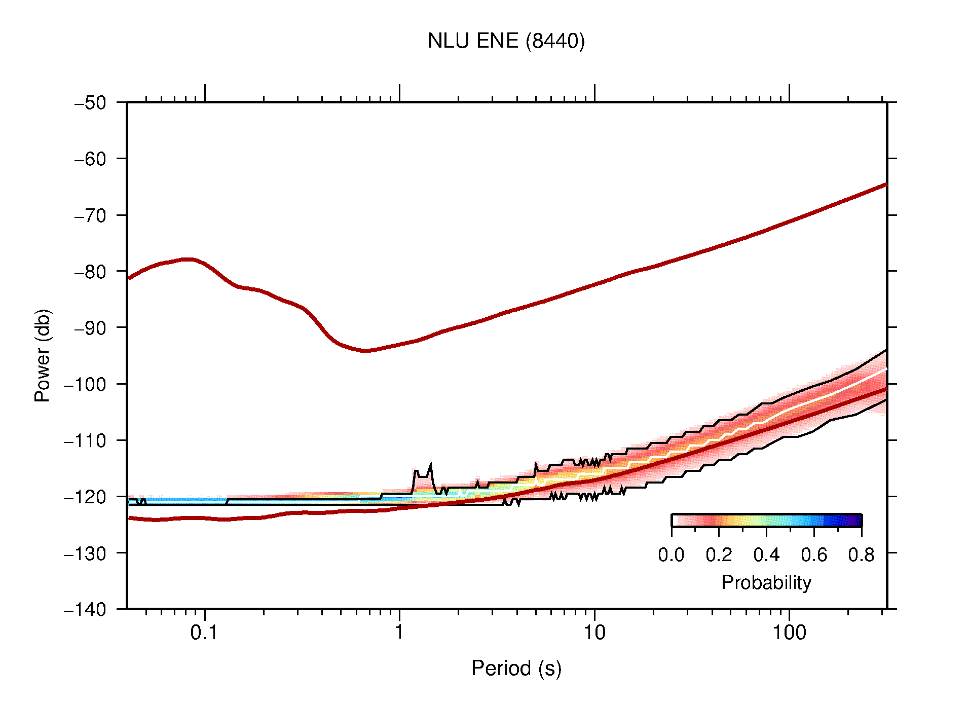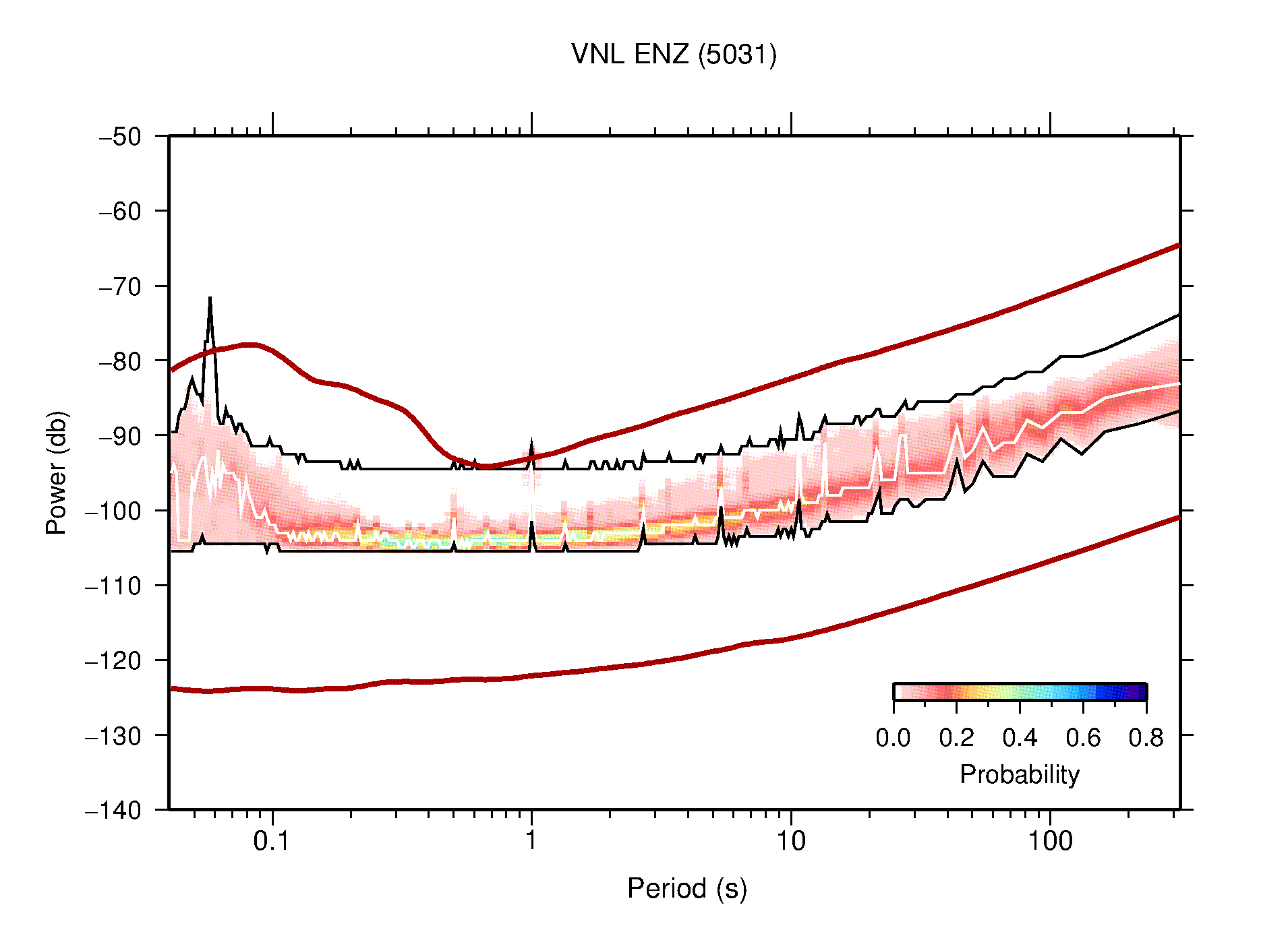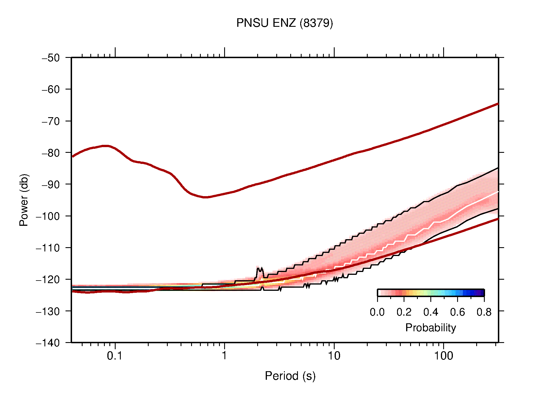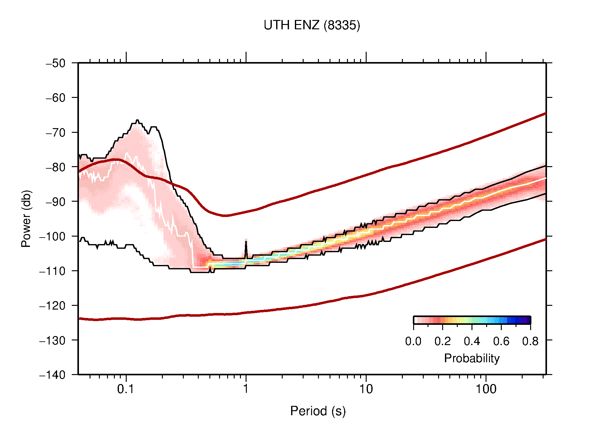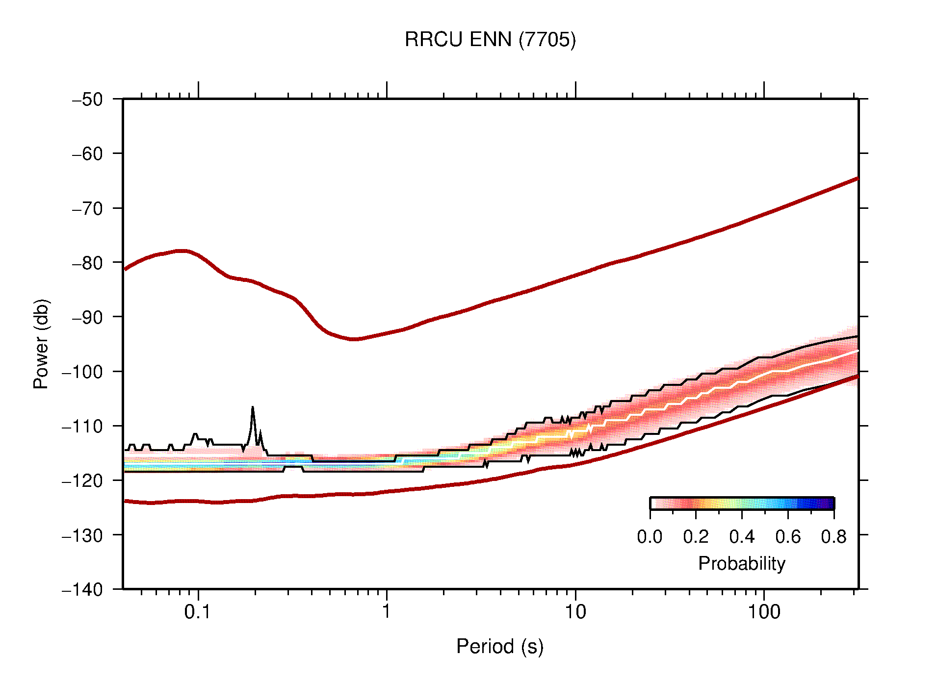The following figures are full year PDFs for each of the 363 channels processed in this work. The same color scale is used thoughout. The black curves show 0.5 and 99.5 percentiles while the white curve shows the mode. The number of PSDs contributing to the PDF is shown in parentheses next to the station and channel names. The y-axes represent spectral acceleration amplitudes in units of db relative to 1 m/s2 [10log10(m2/s4/Hz)]. The five channels that were not included in the network PDF because of known problems were CCUT ENE,N,Z; HCSU ENE; and HER ENE.