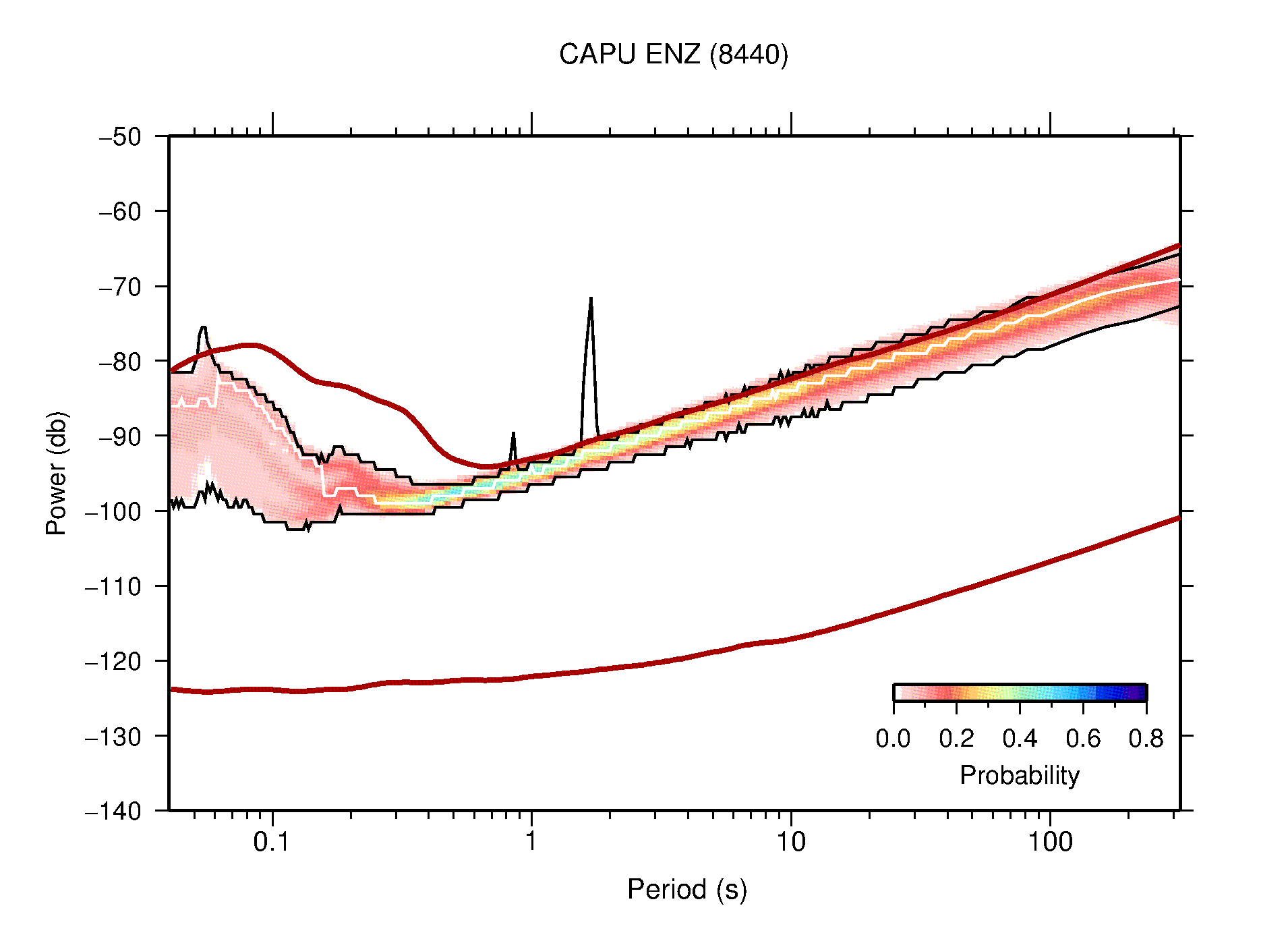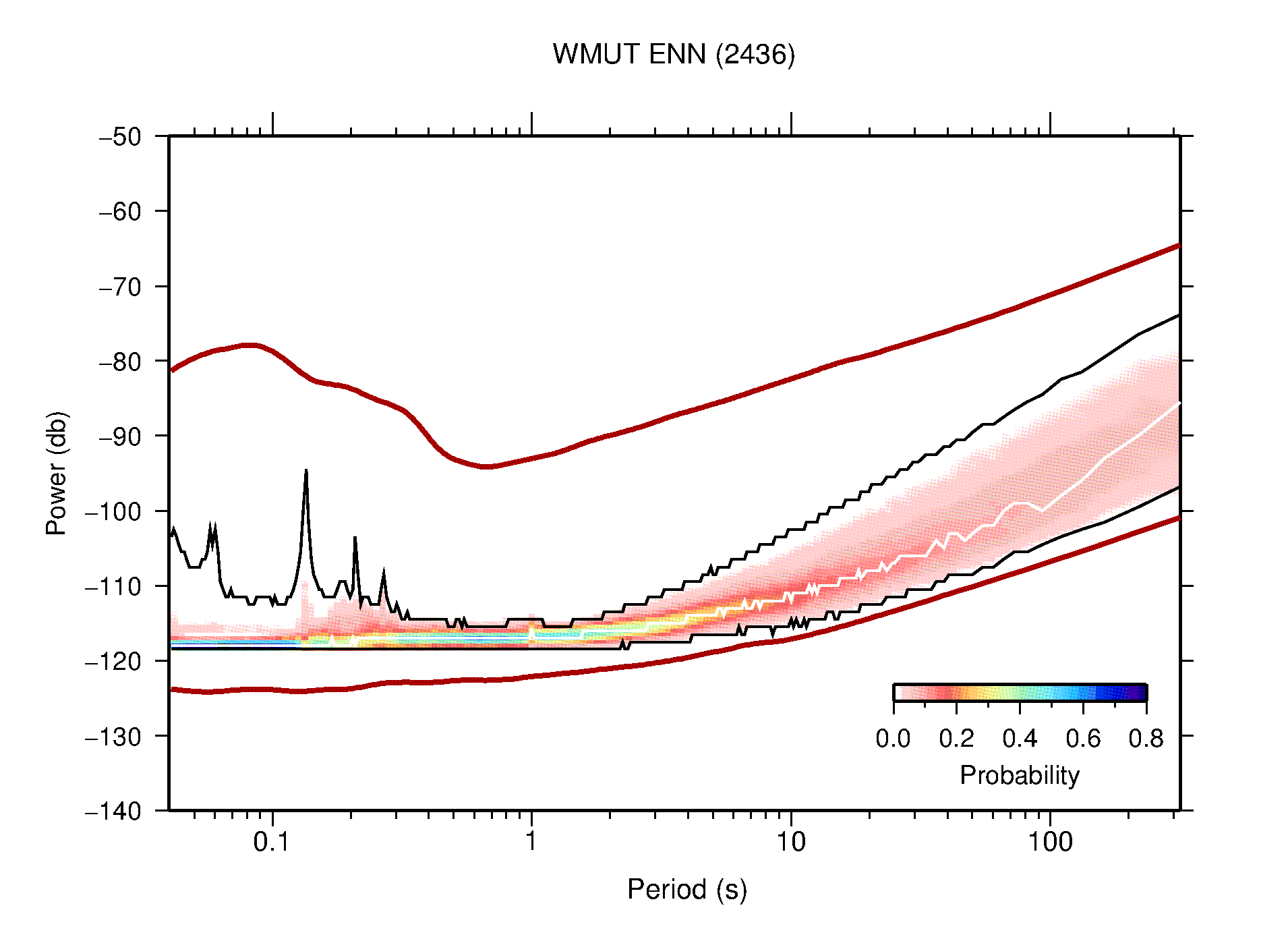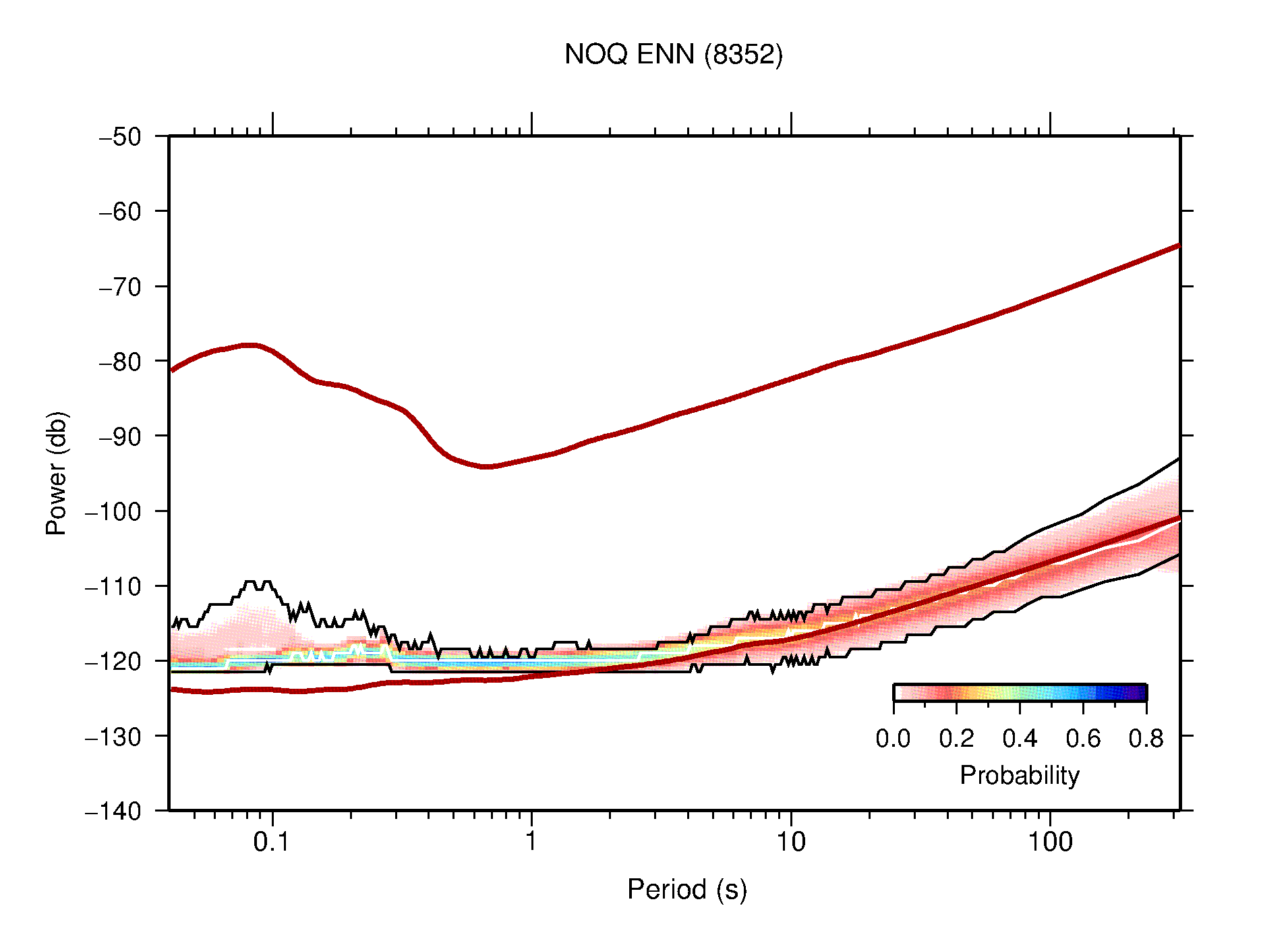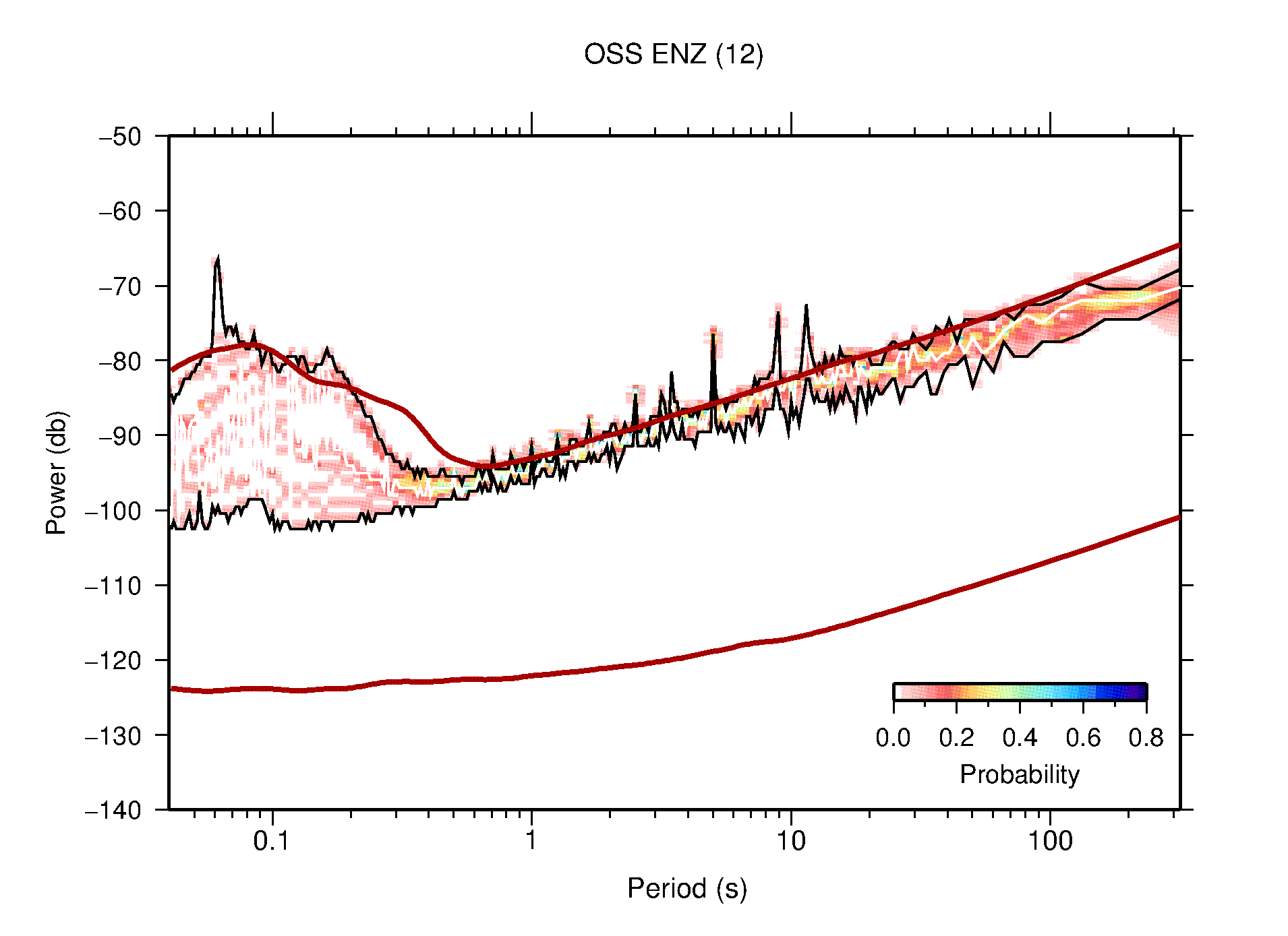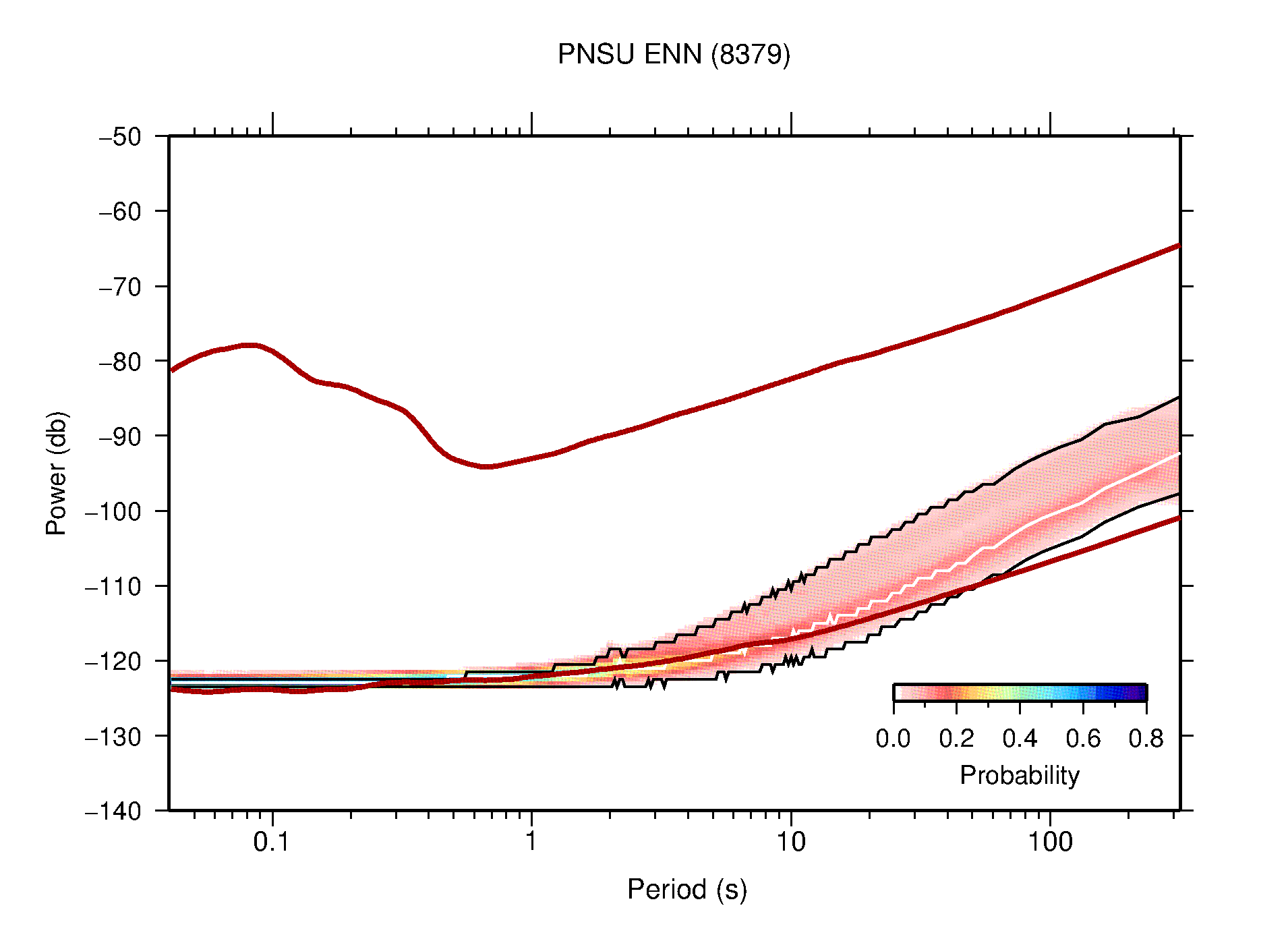 The following figures are full year PDFs for each of the 363 channels processed in this work. The same color scale is used thoughout. The black curves show 0.5 and 99.5 percentiles while the white curve shows the mode. The number of PSDs contributing to the PDF is shown in parentheses next to the station and channel names. The y-axes represent spectral acceleration amplitudes in units of db relative to 1 m/s2 [10log10(m2/s4/Hz)]. The five channels that were not included in the network PDF because of known problems were CCUT ENE,N,Z; HCSU ENE; and HER ENE.