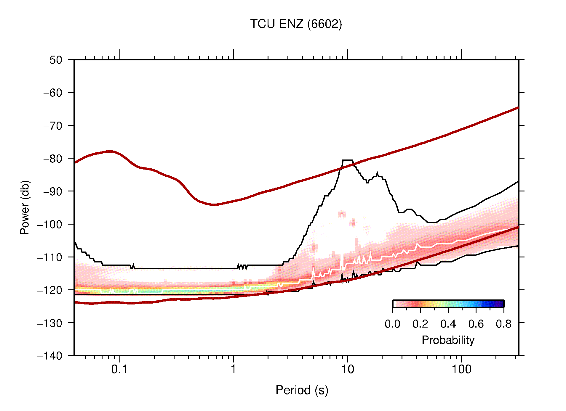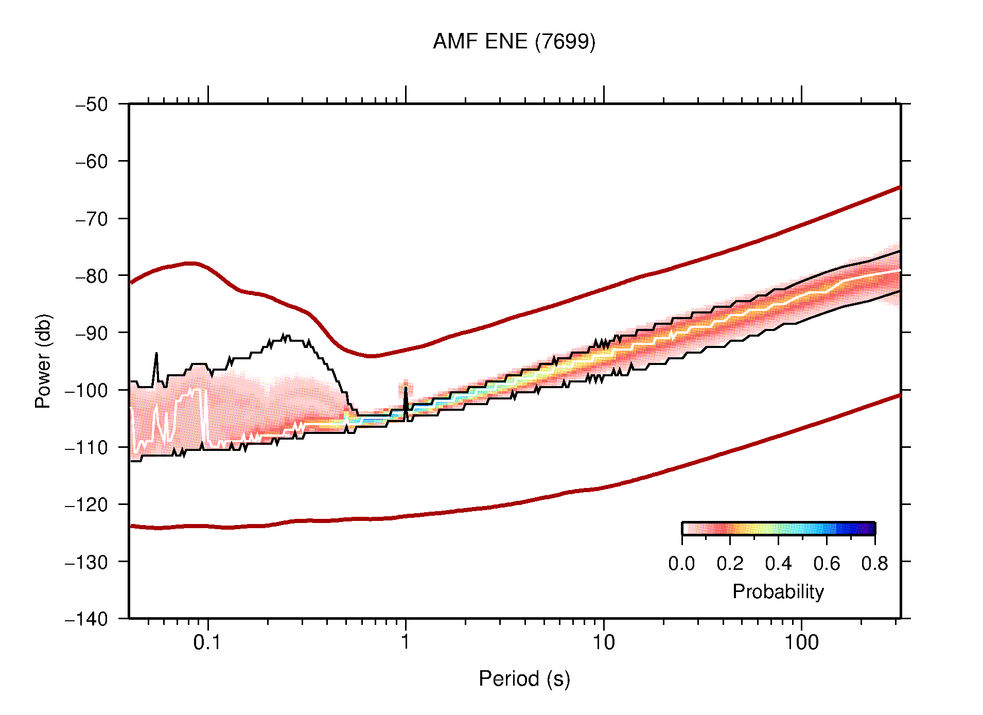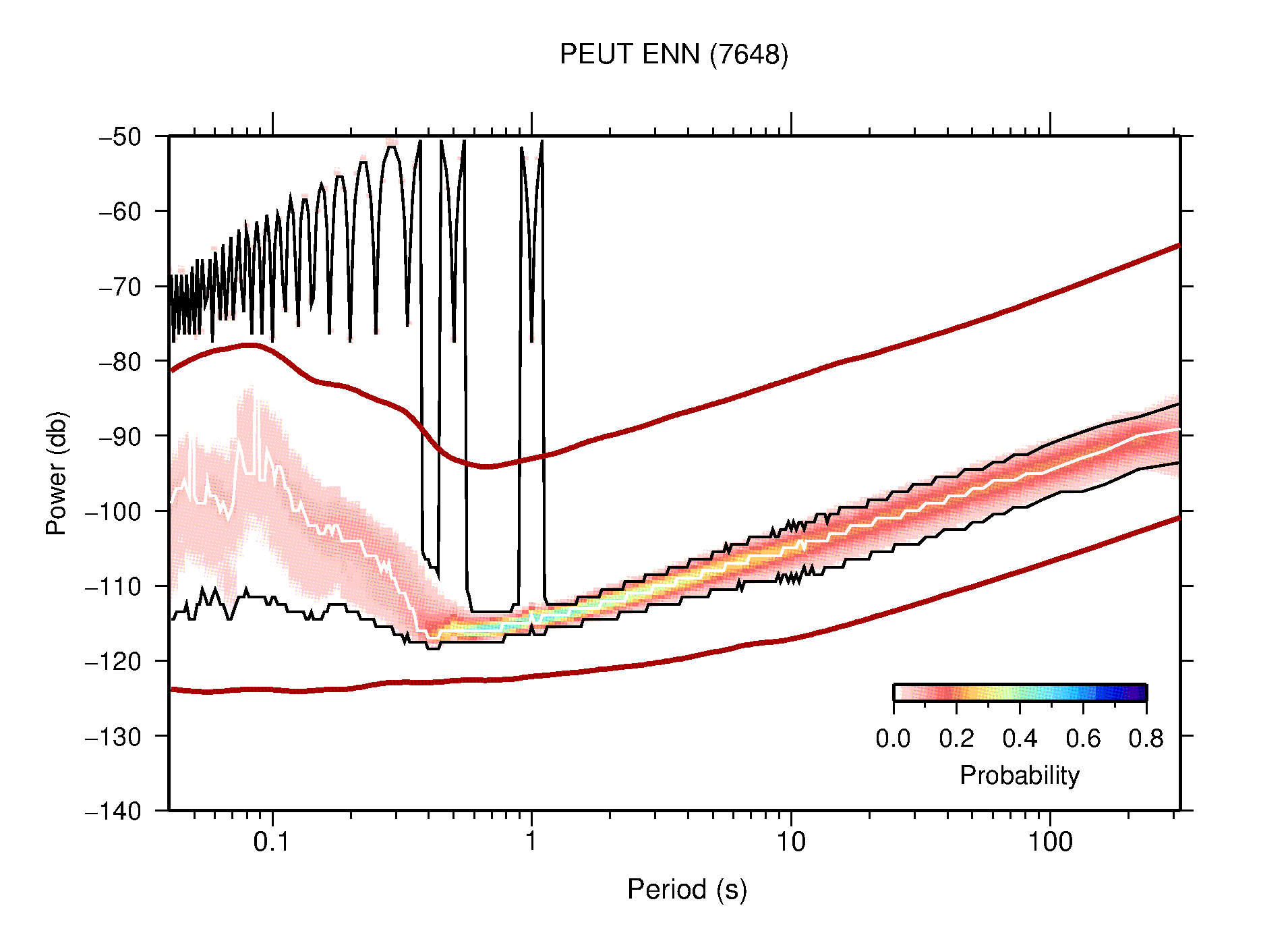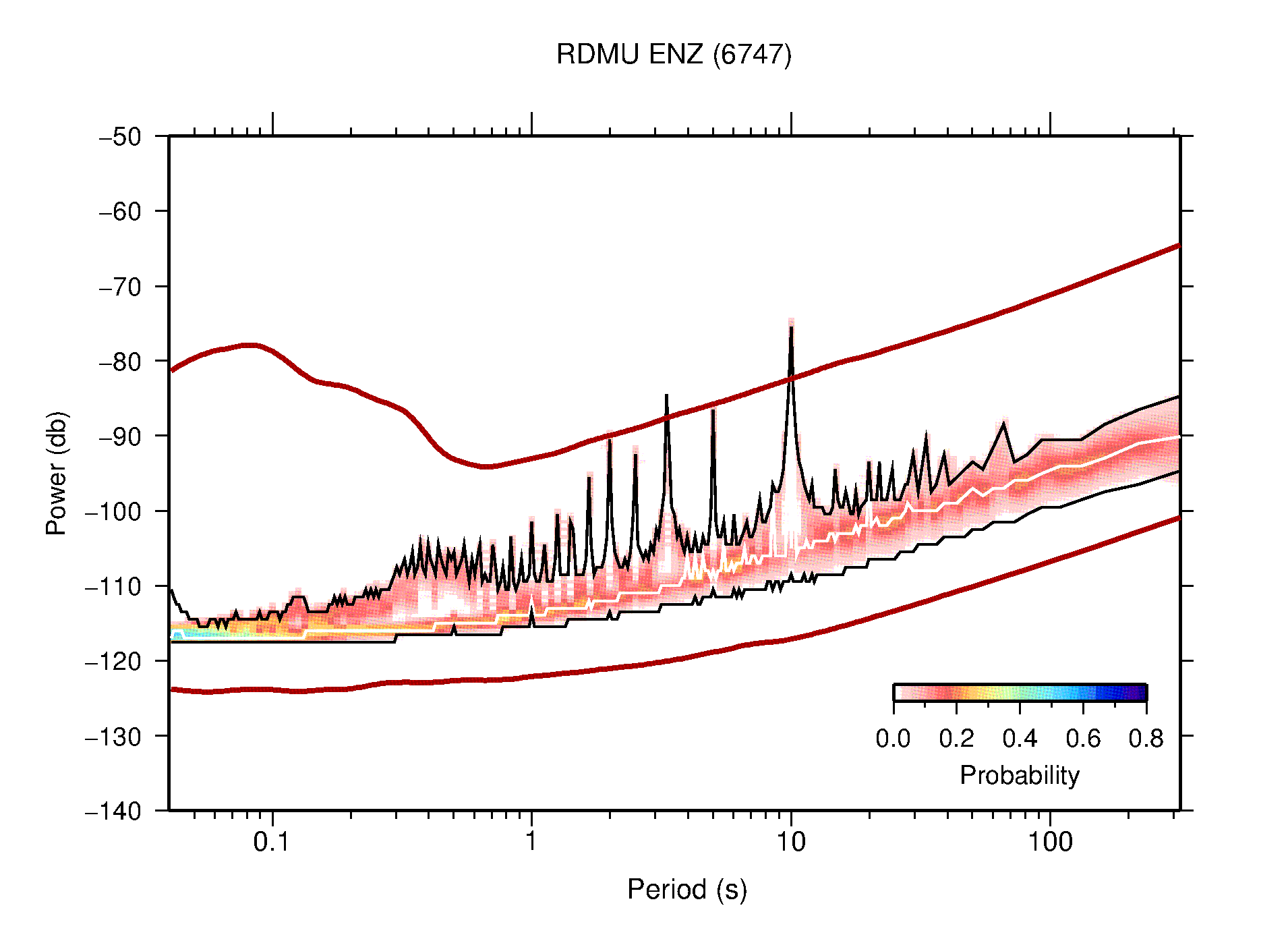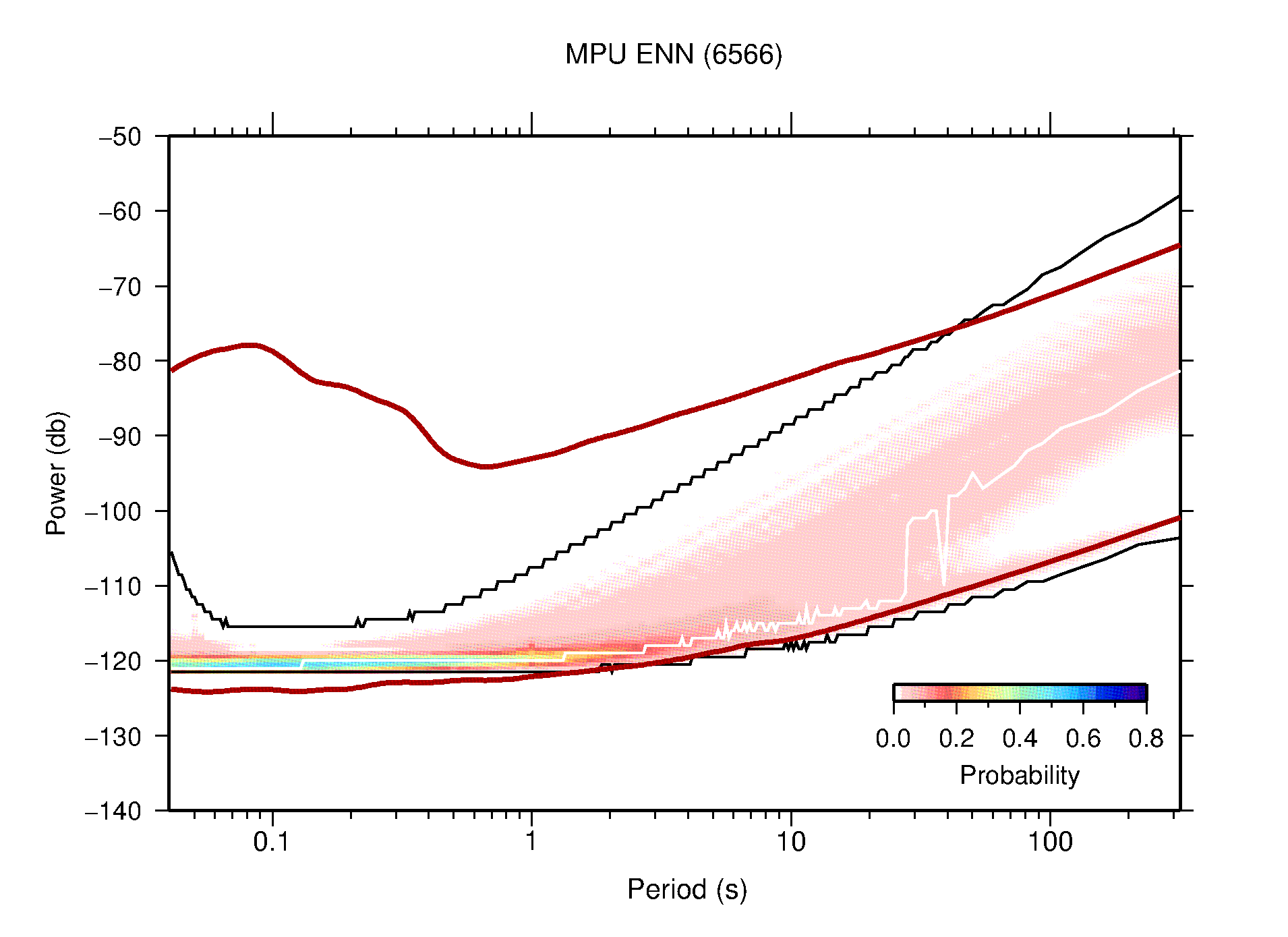 The following figures are full year PDFs for each of the 363 channels processed in this work. The same color scale is used thoughout. The black curves show 0.5 and 99.5 percentiles while the white curve shows the mode. The number of PSDs contributing to the PDF is shown in parentheses next to the station and channel names. The y-axes represent spectral acceleration amplitudes in units of db relative to 1 m/s2 [10log10(m2/s4/Hz)]. The five channels that were not included in the network PDF because of known problems were CCUT ENE,N,Z; HCSU ENE; and HER ENE.