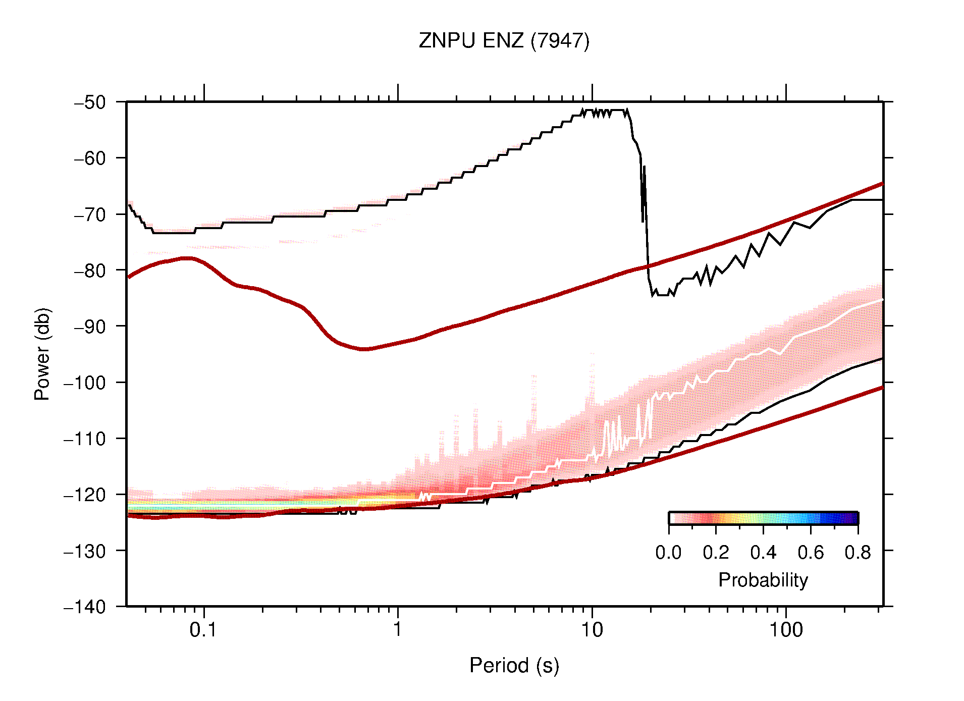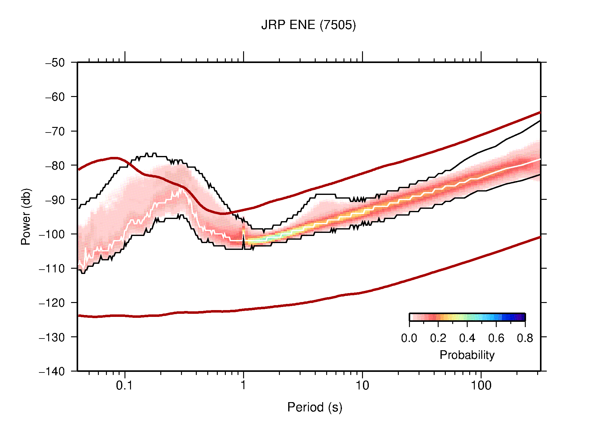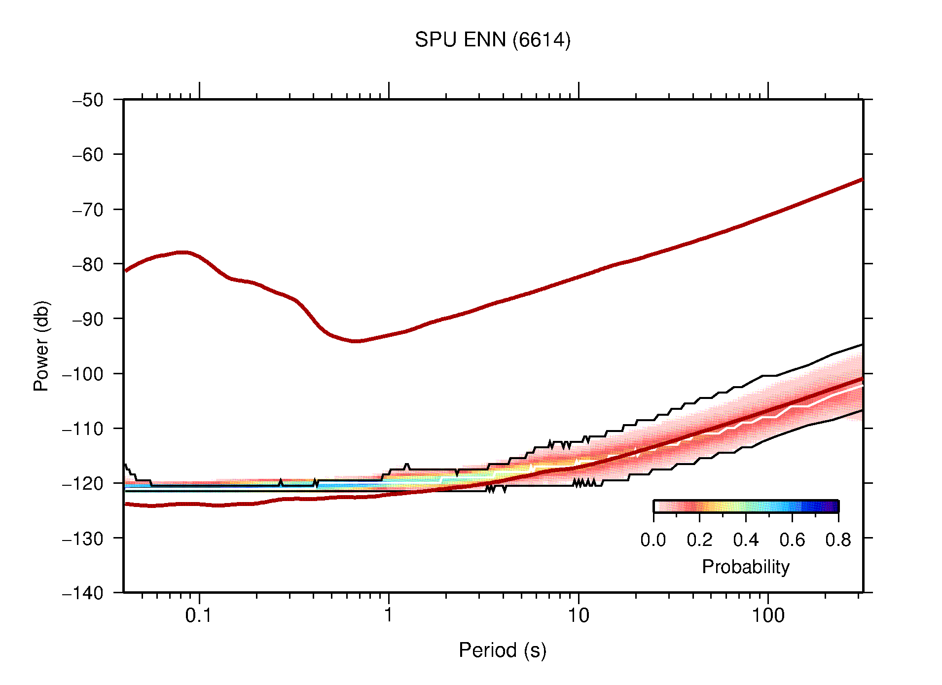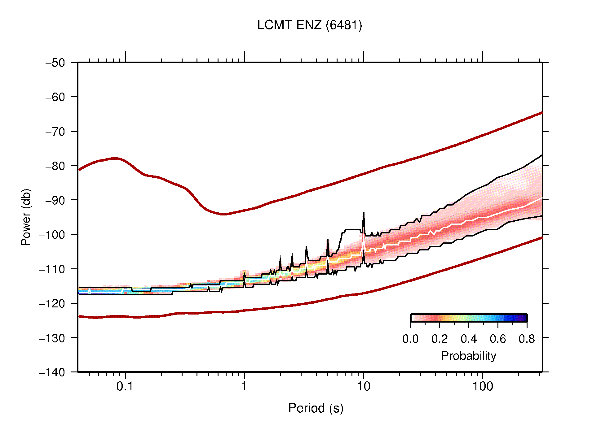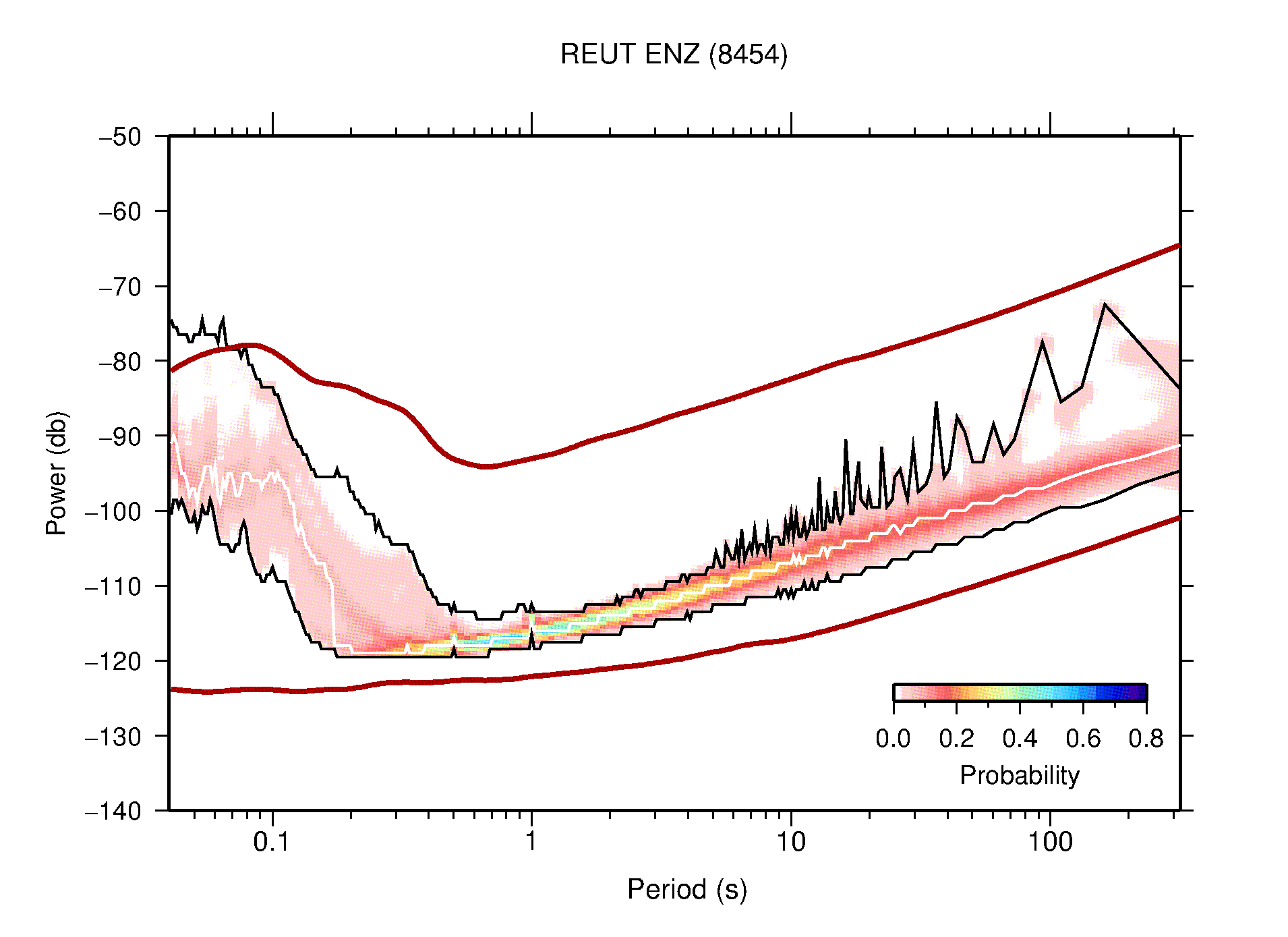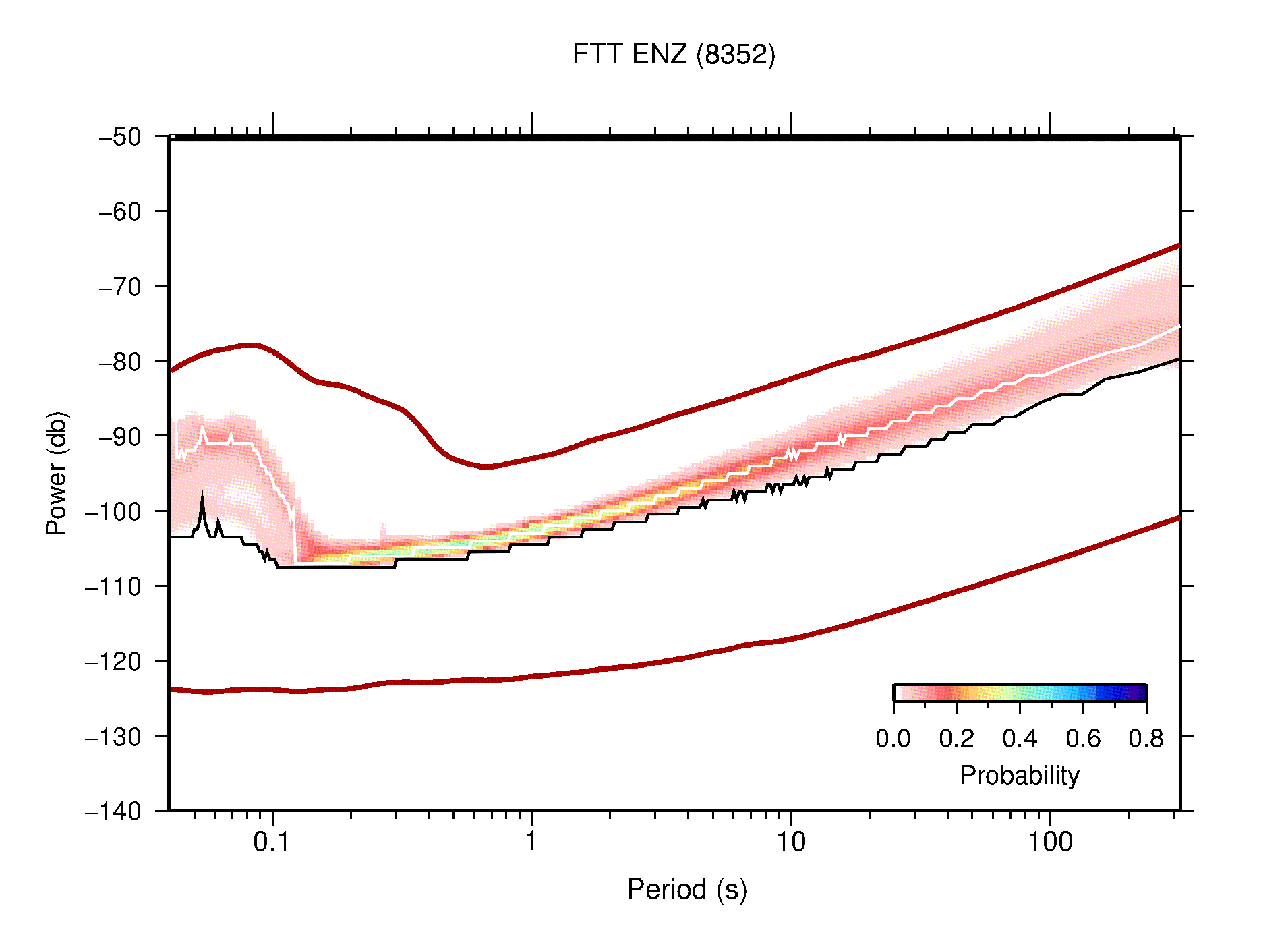 The following figures are full year PDFs for each of the 363 channels processed in this work. The same color scale is used thoughout. The black curves show 0.5 and 99.5 percentiles while the white curve shows the mode. The number of PSDs contributing to the PDF is shown in parentheses next to the station and channel names. The y-axes represent spectral acceleration amplitudes in units of db relative to 1 m/s2 [10log10(m2/s4/Hz)]. The five channels that were not included in the network PDF because of known problems were CCUT ENE,N,Z; HCSU ENE; and HER ENE.