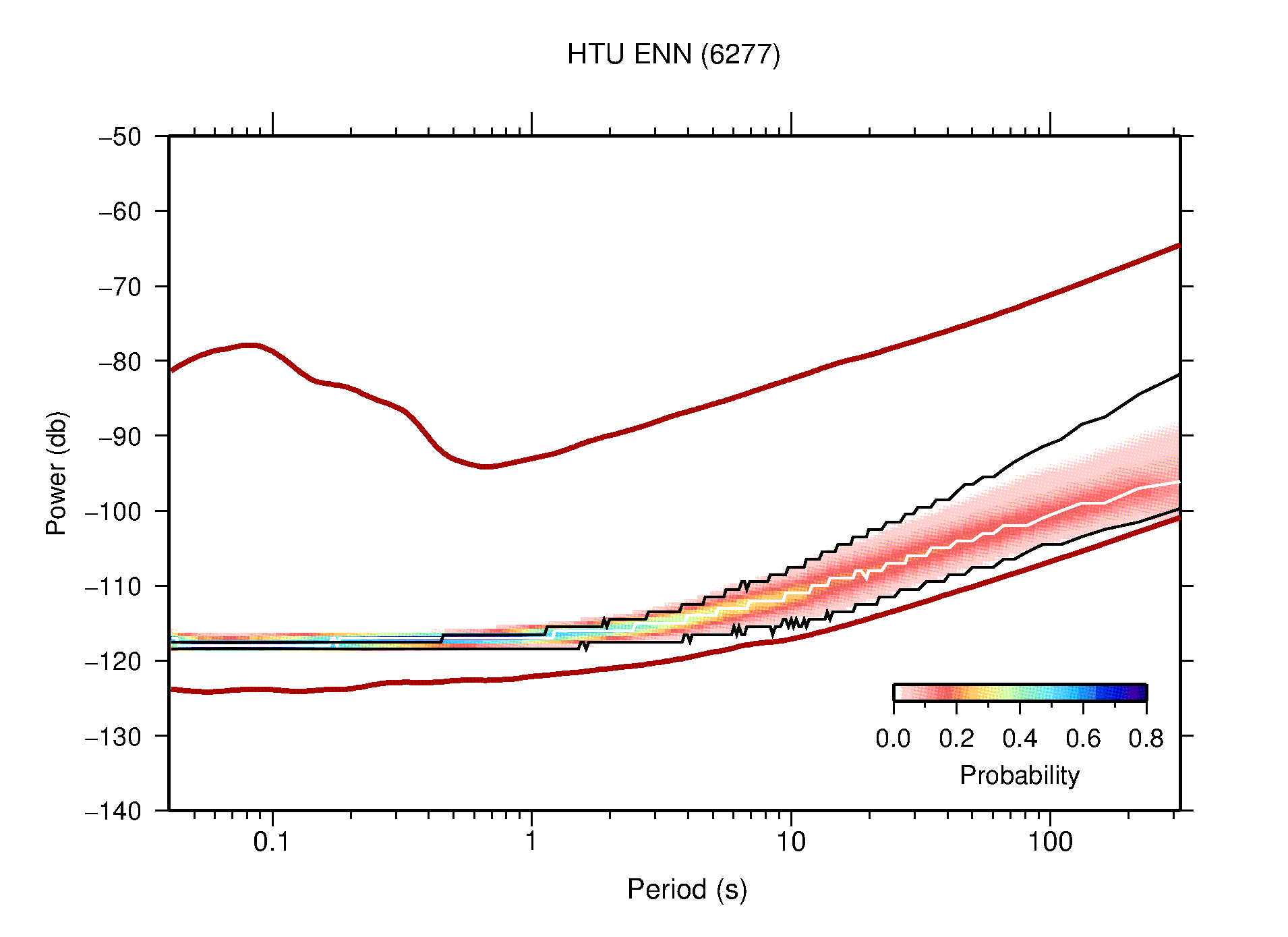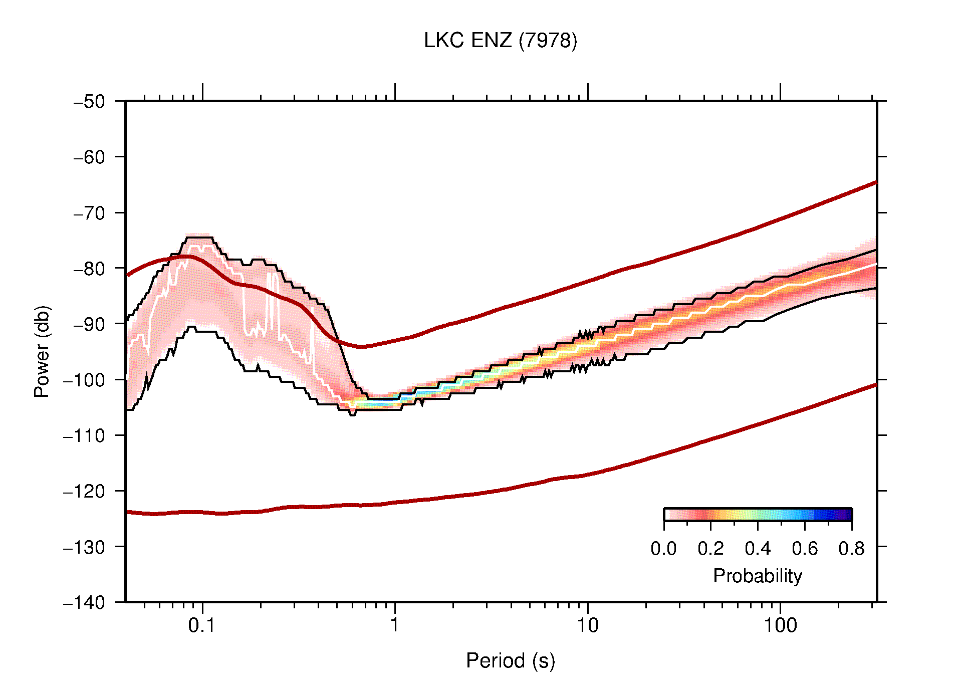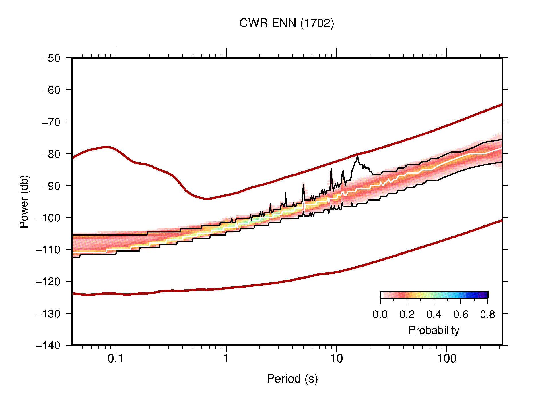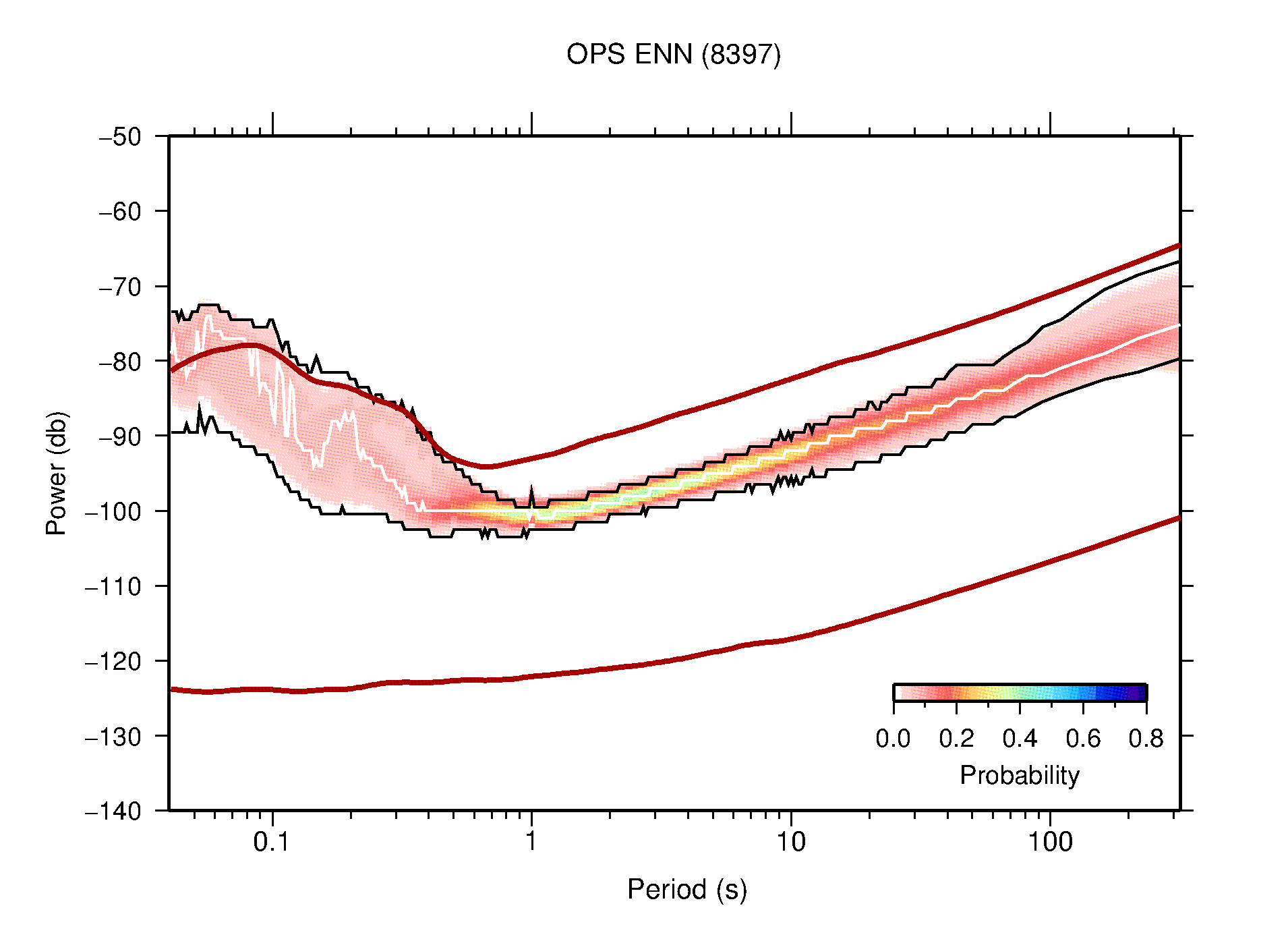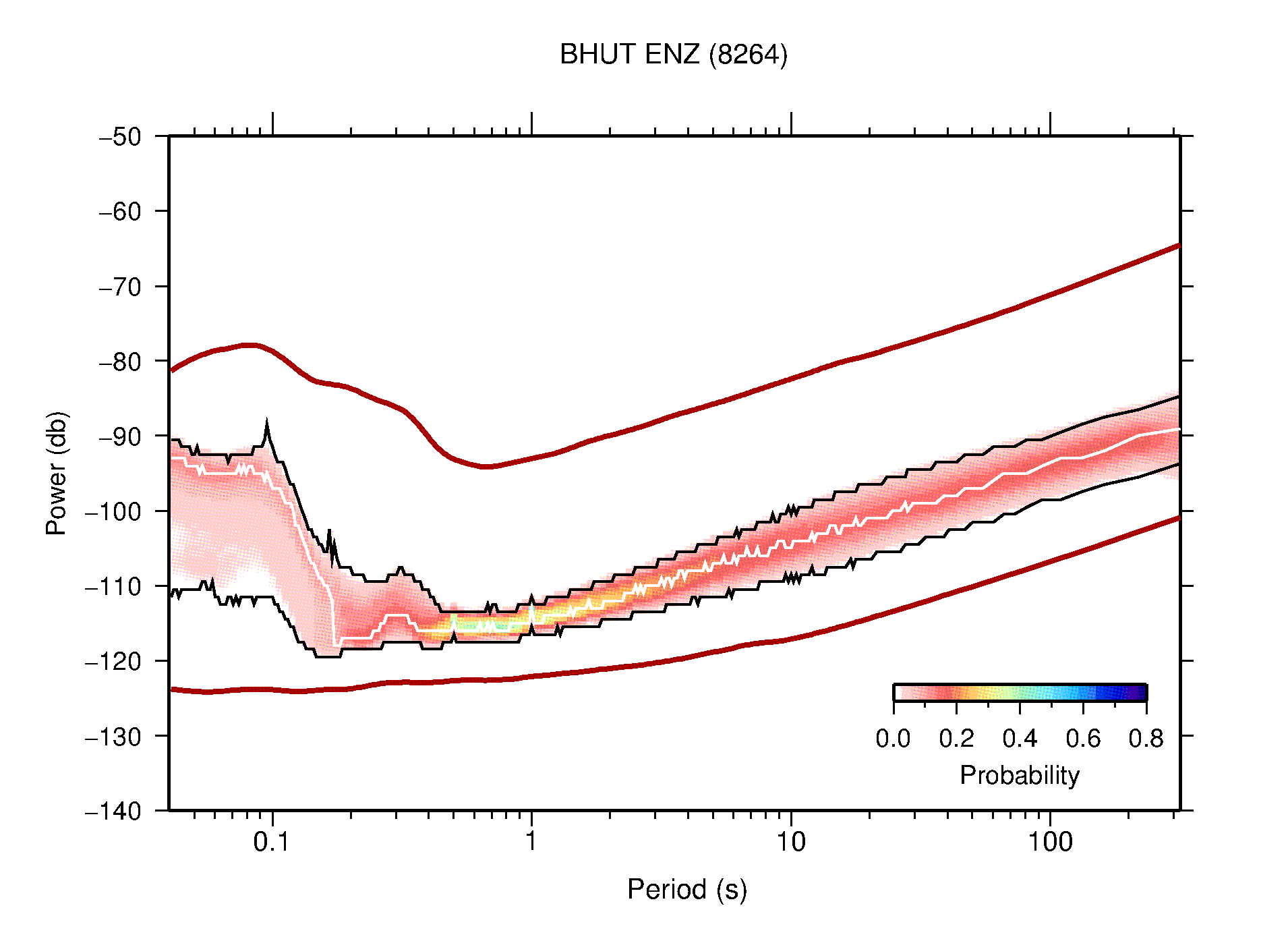 The following figures are full year PDFs for each of the 363 channels processed in this work. The same color scale is used thoughout. The black curves show 0.5 and 99.5 percentiles while the white curve shows the mode. The number of PSDs contributing to the PDF is shown in parentheses next to the station and channel names. The y-axes represent spectral acceleration amplitudes in units of db relative to 1 m/s2 [10log10(m2/s4/Hz)]. The five channels that were not included in the network PDF because of known problems were CCUT ENE,N,Z; HCSU ENE; and HER ENE.