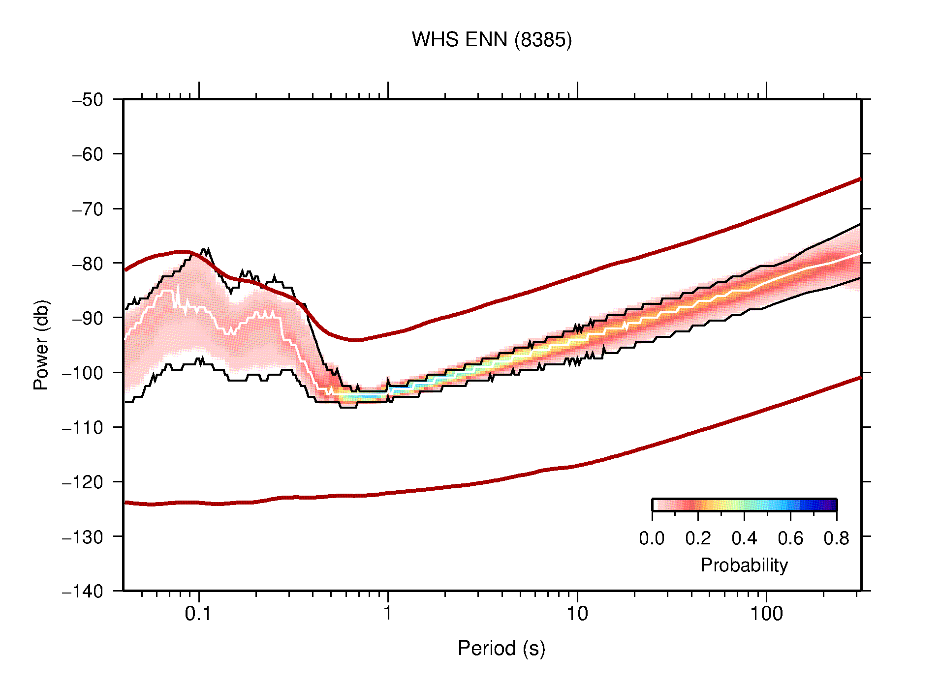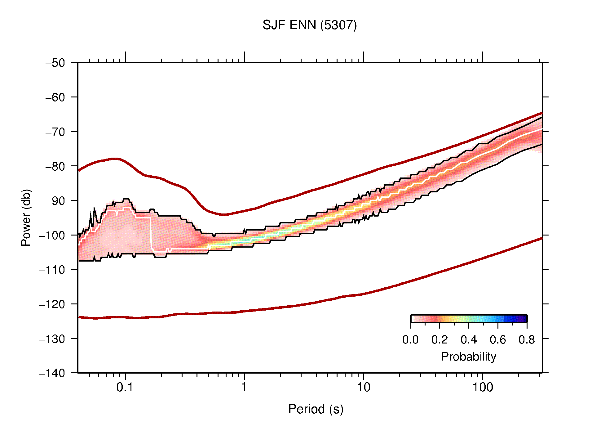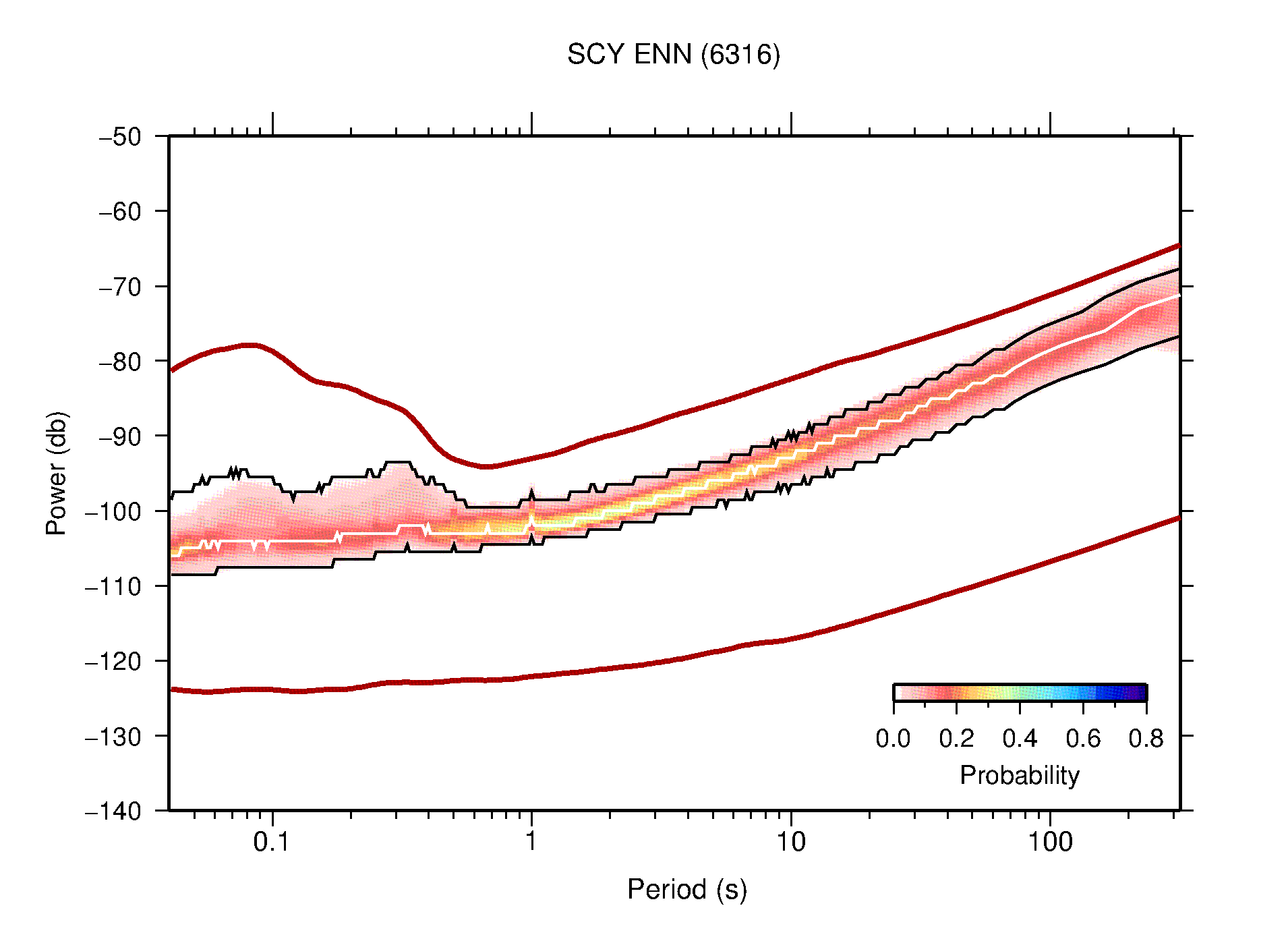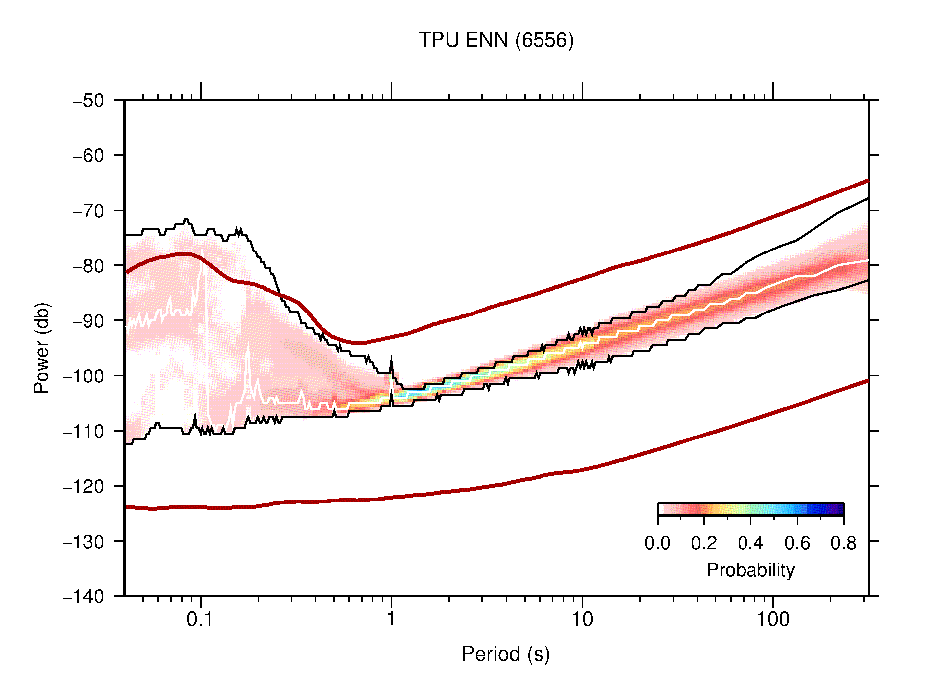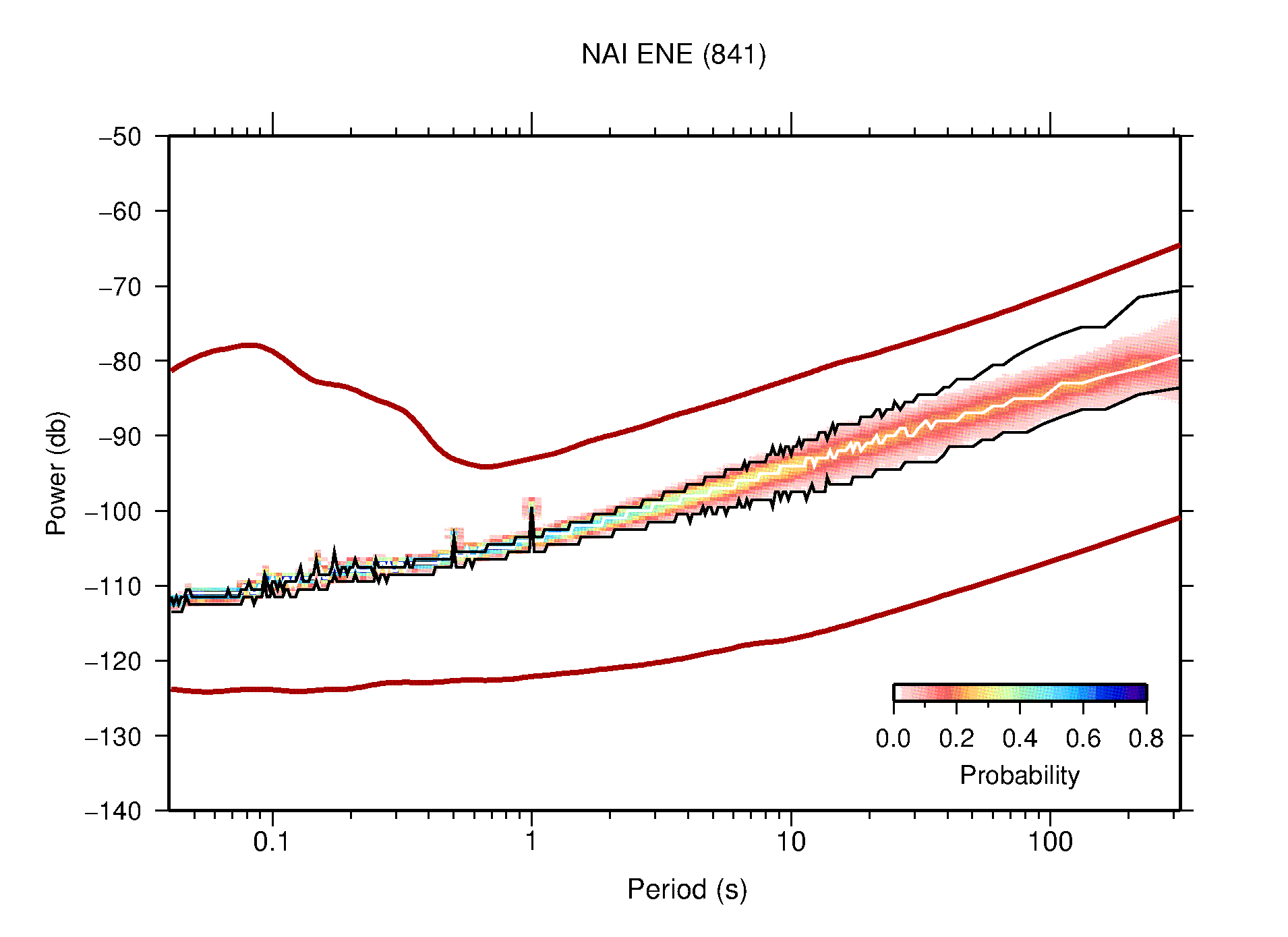 The following figures are full year PDFs for each of the 363 channels processed in this work. The same color scale is used thoughout. The black curves show 0.5 and 99.5 percentiles while the white curve shows the mode. The number of PSDs contributing to the PDF is shown in parentheses next to the station and channel names. The y-axes represent spectral acceleration amplitudes in units of db relative to 1 m/s2 [10log10(m2/s4/Hz)]. The five channels that were not included in the network PDF because of known problems were CCUT ENE,N,Z; HCSU ENE; and HER ENE.