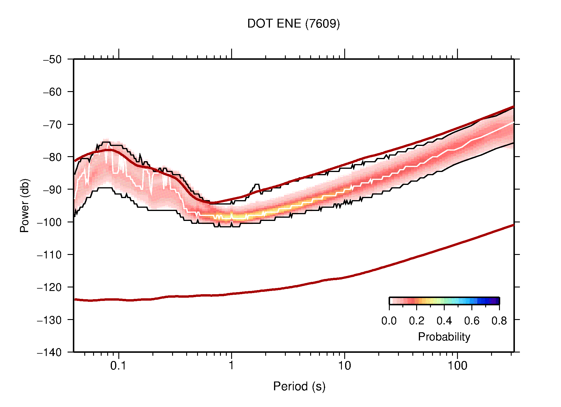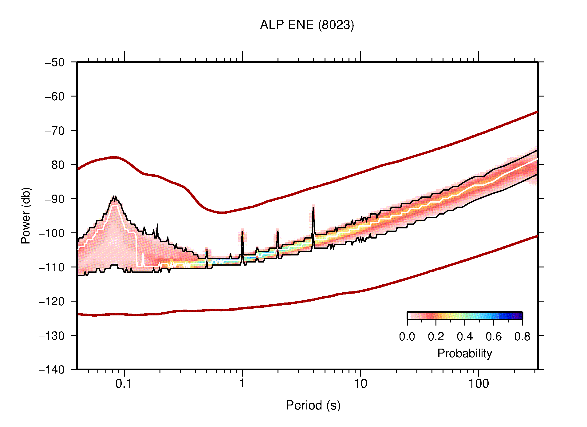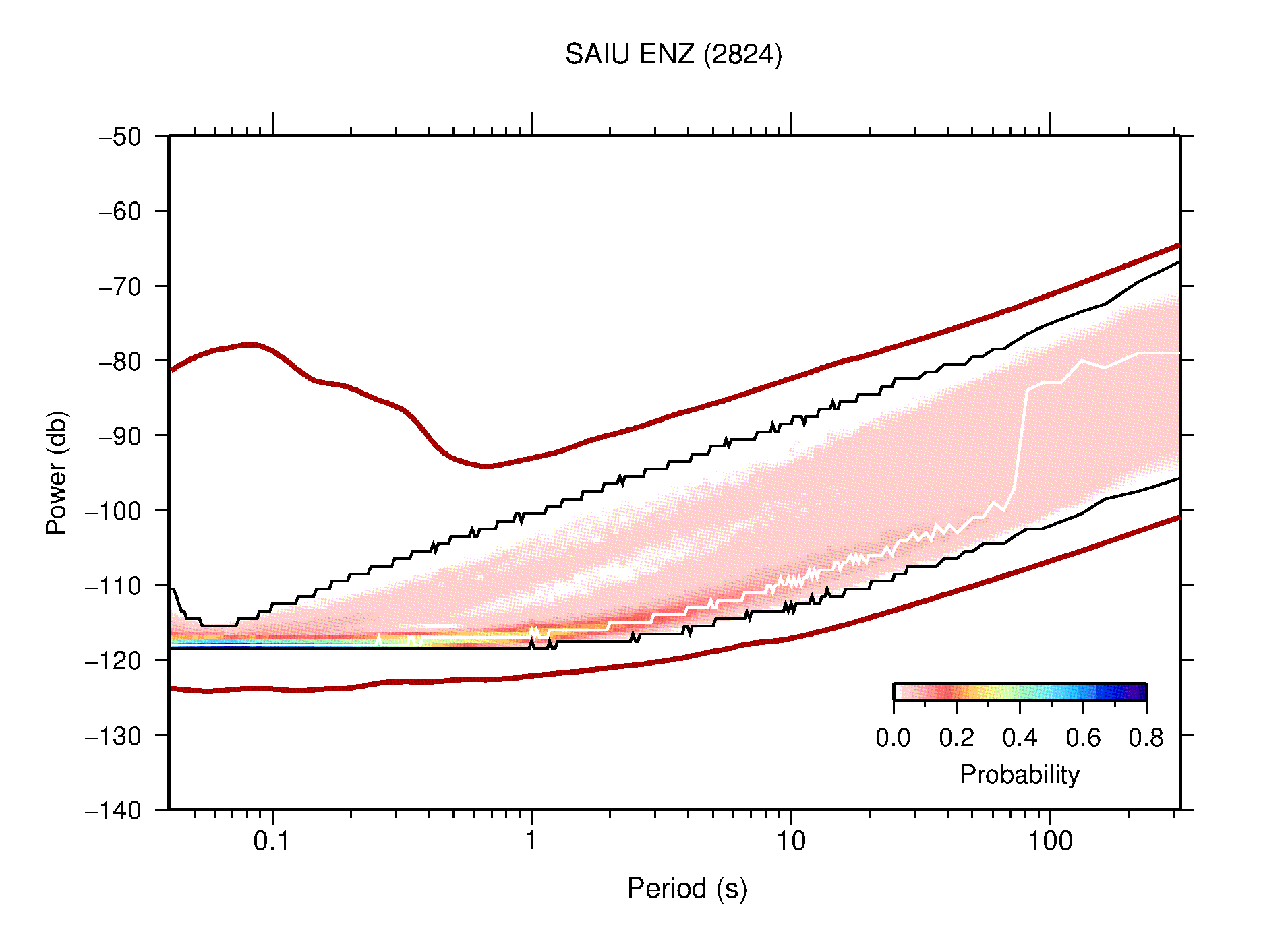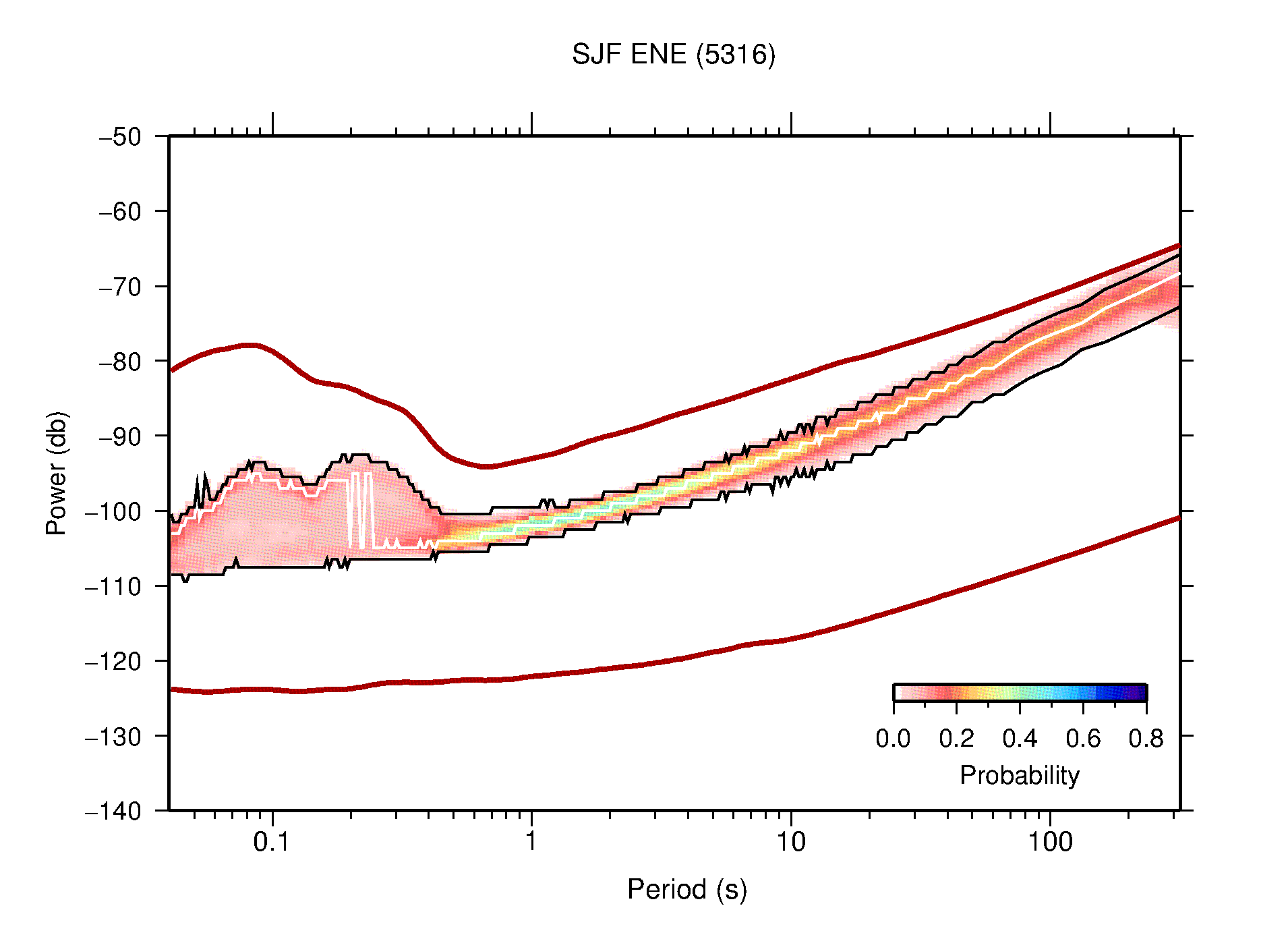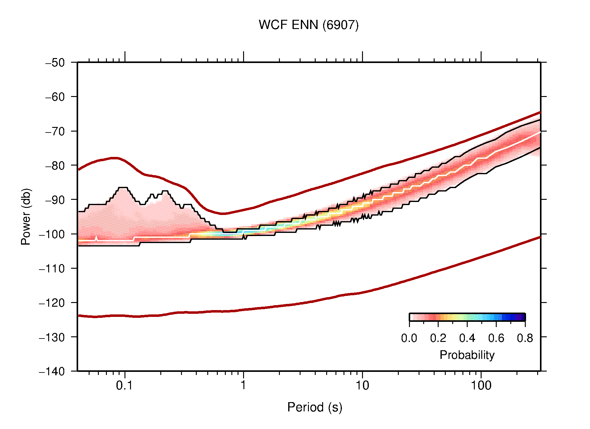 The following figures are full year PDFs for each of the 363 channels processed in this work. The same color scale is used thoughout. The black curves show 0.5 and 99.5 percentiles while the white curve shows the mode. The number of PSDs contributing to the PDF is shown in parentheses next to the station and channel names. The y-axes represent spectral acceleration amplitudes in units of db relative to 1 m/s2 [10log10(m2/s4/Hz)]. The five channels that were not included in the network PDF because of known problems were CCUT ENE,N,Z; HCSU ENE; and HER ENE.