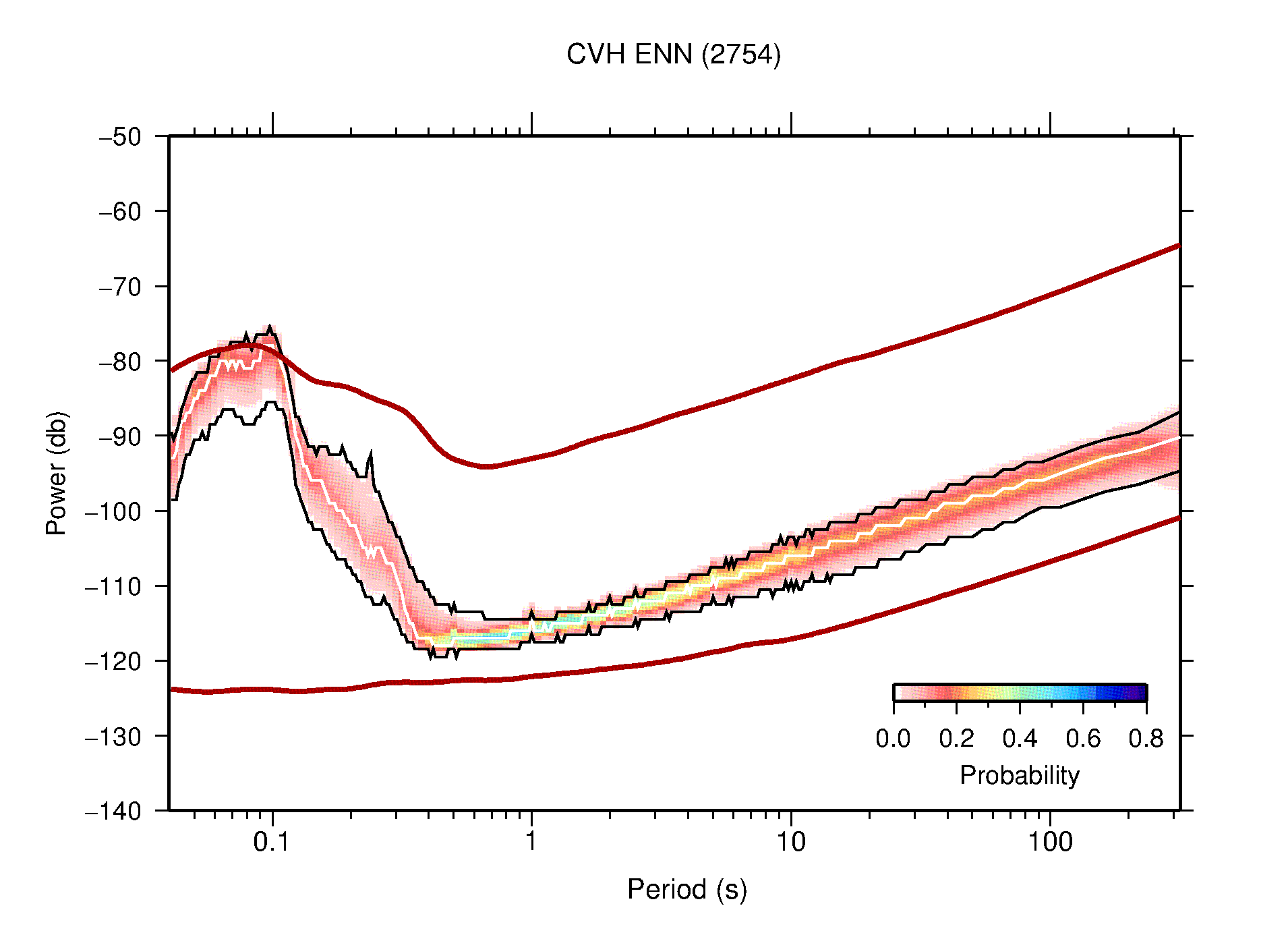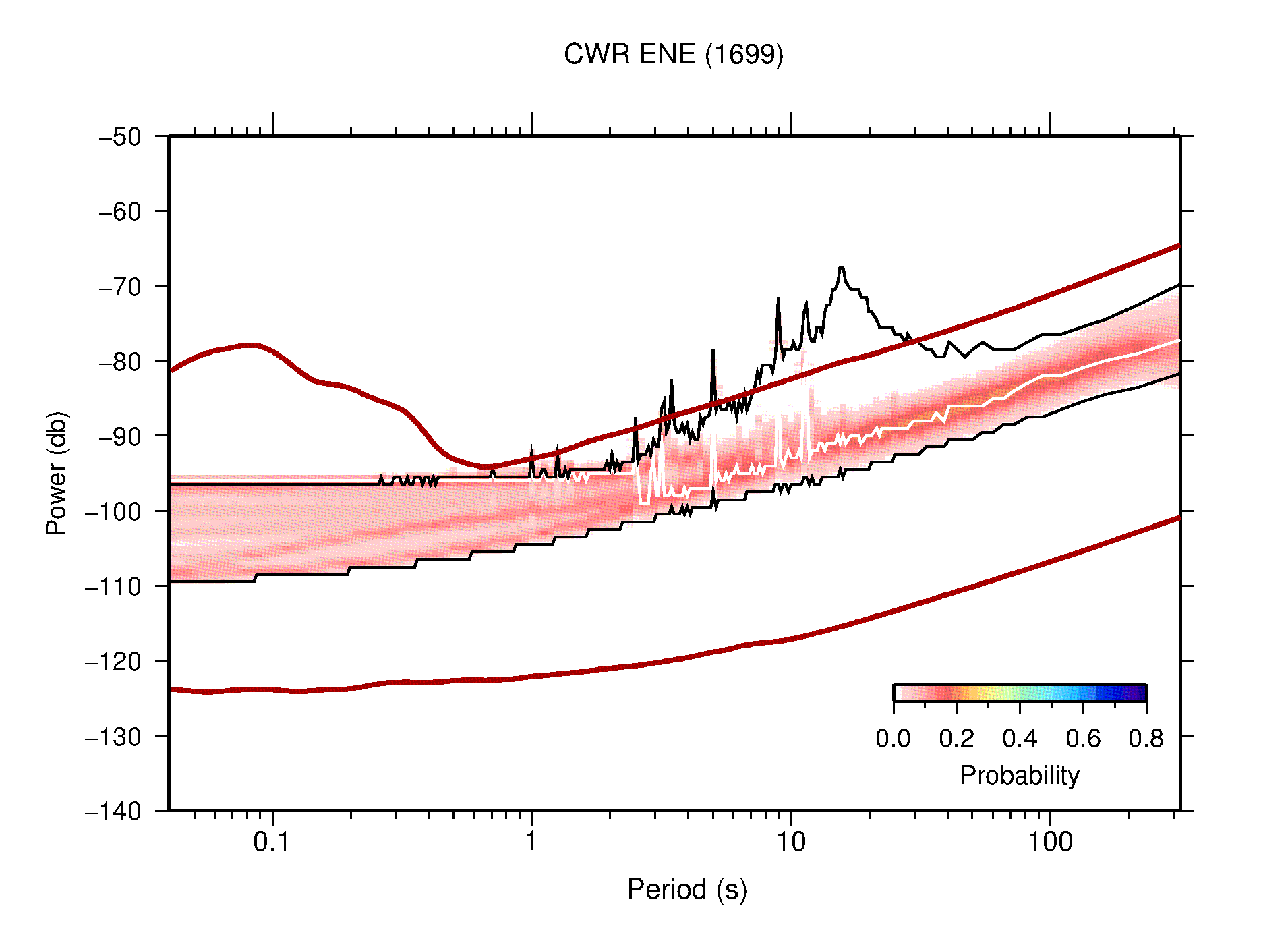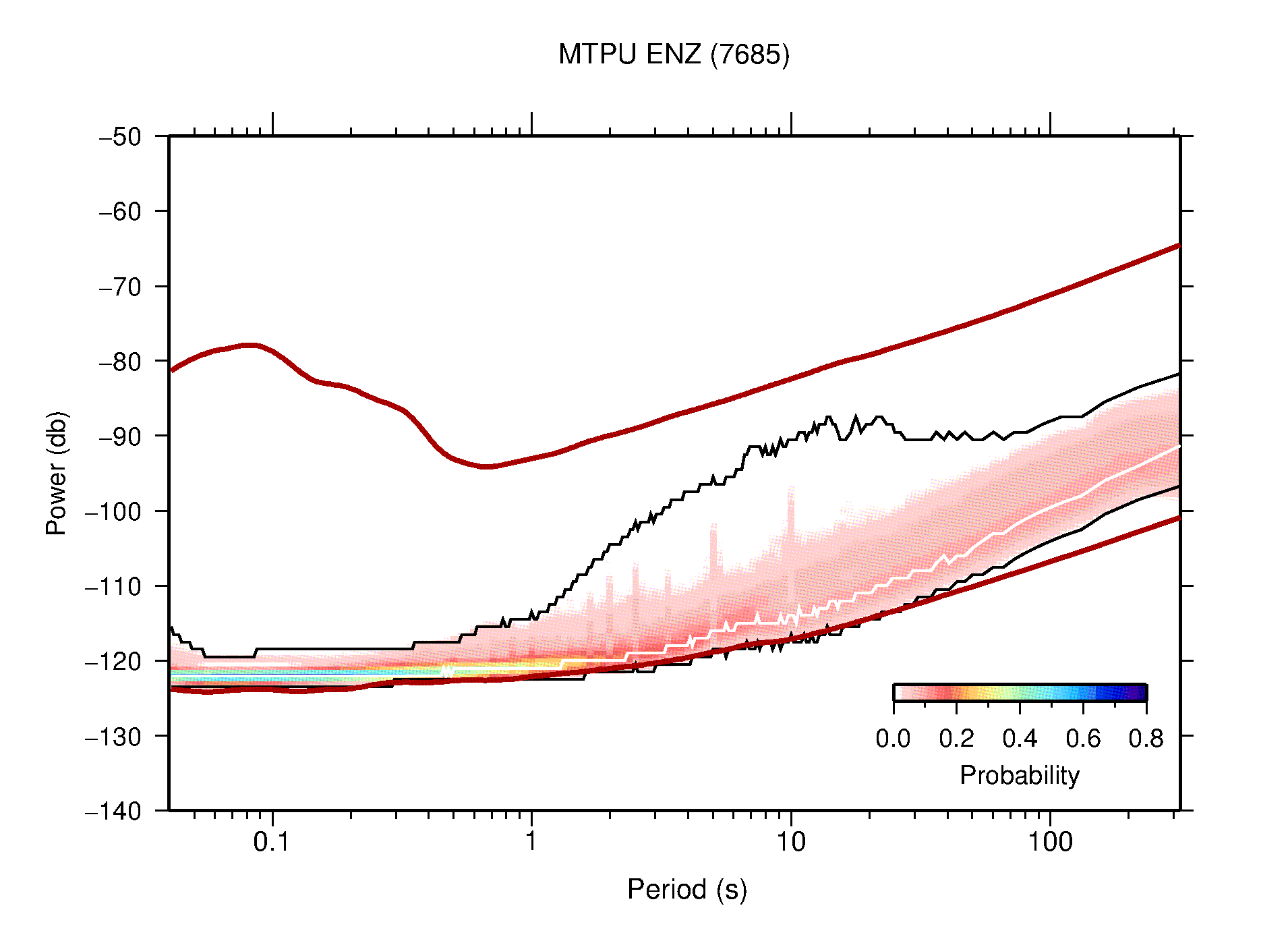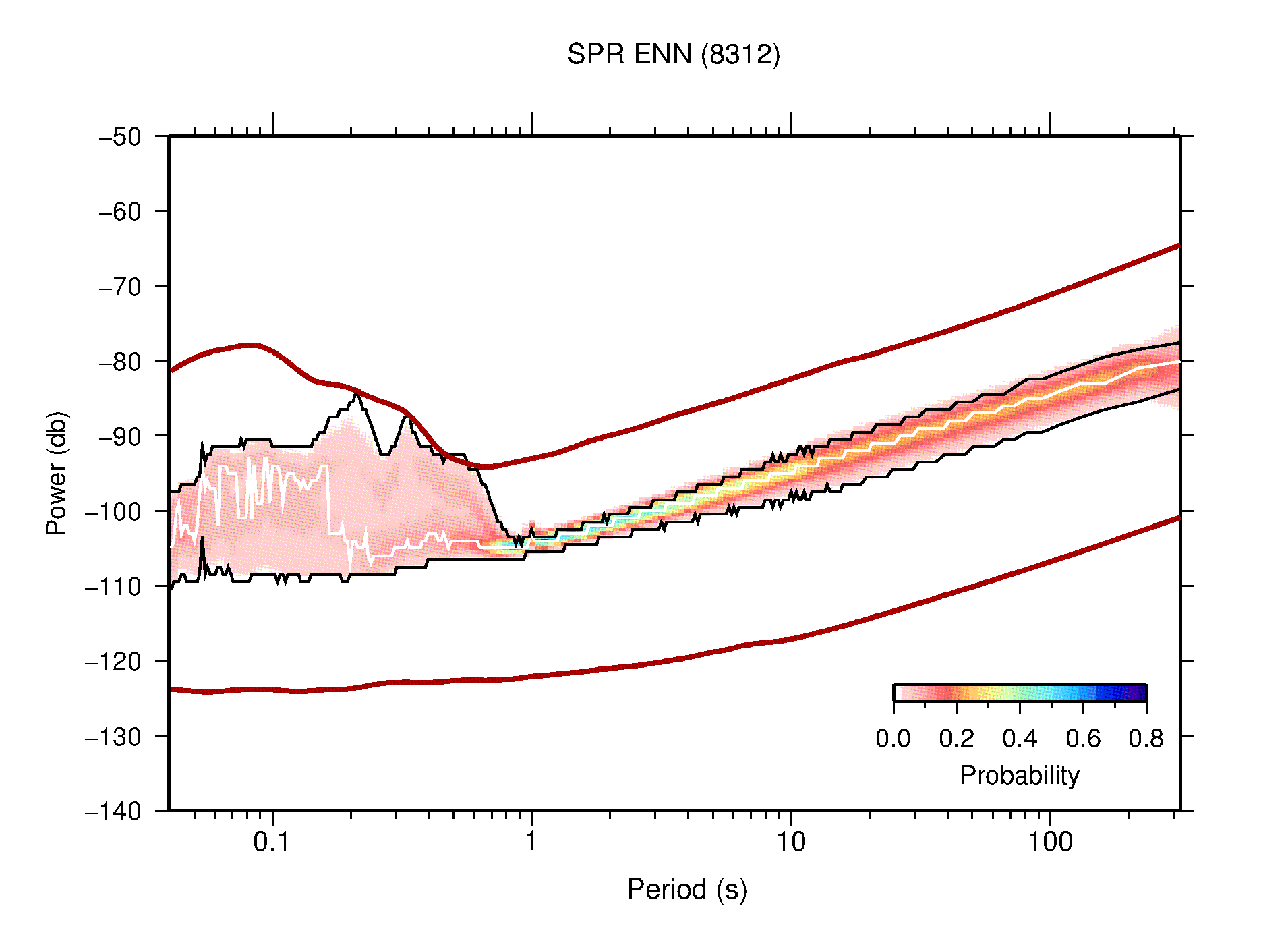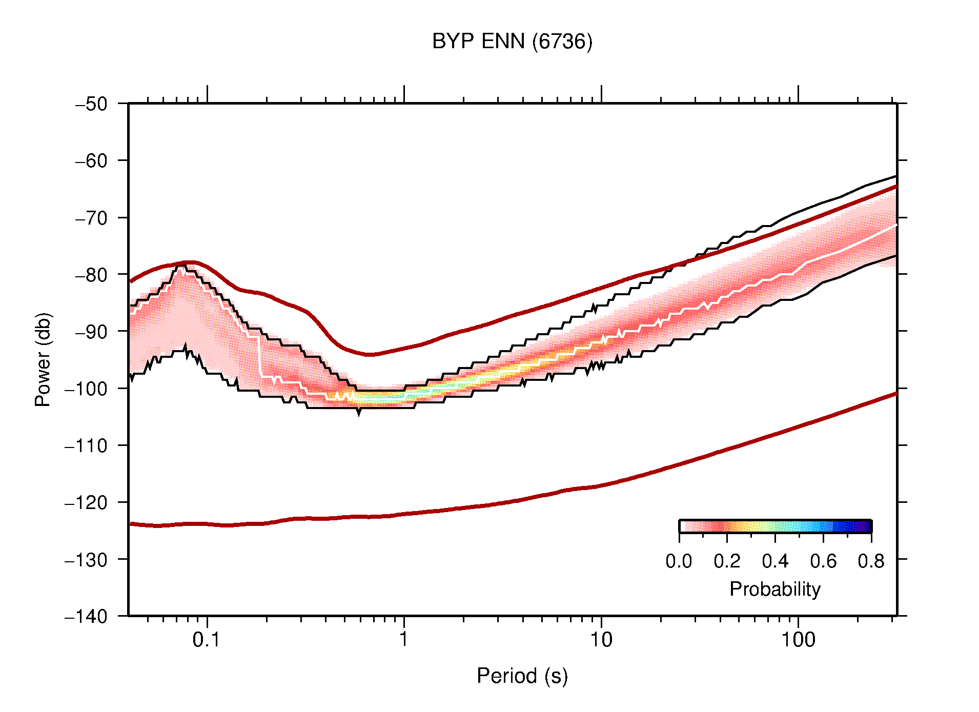 The following figures are full year PDFs for each of the 363 channels processed in this work. The same color scale is used thoughout. The black curves show 0.5 and 99.5 percentiles while the white curve shows the mode. The number of PSDs contributing to the PDF is shown in parentheses next to the station and channel names. The y-axes represent spectral acceleration amplitudes in units of db relative to 1 m/s2 [10log10(m2/s4/Hz)]. The five channels that were not included in the network PDF because of known problems were CCUT ENE,N,Z; HCSU ENE; and HER ENE.