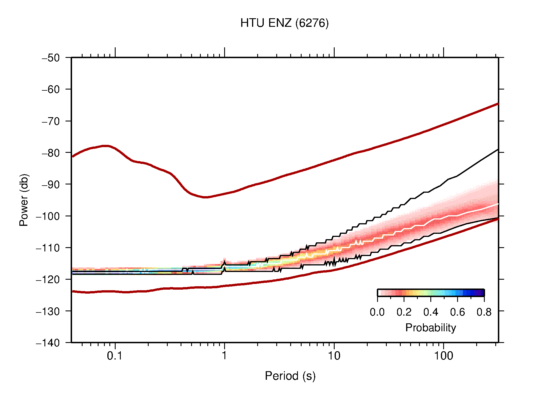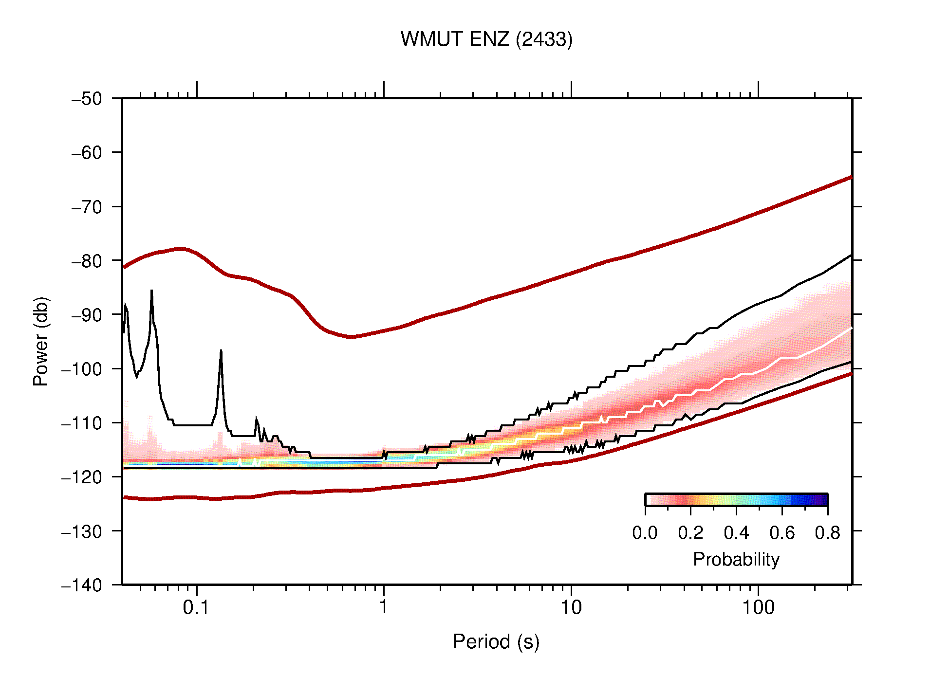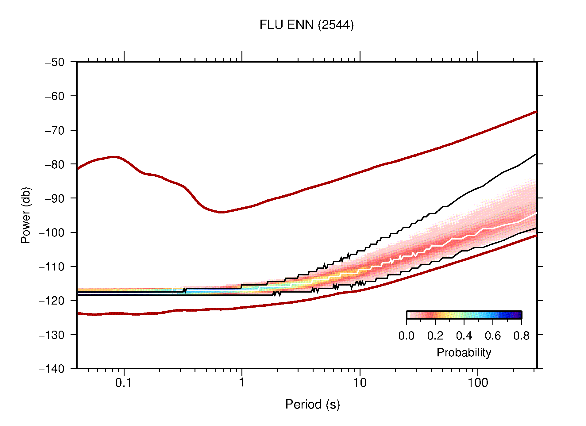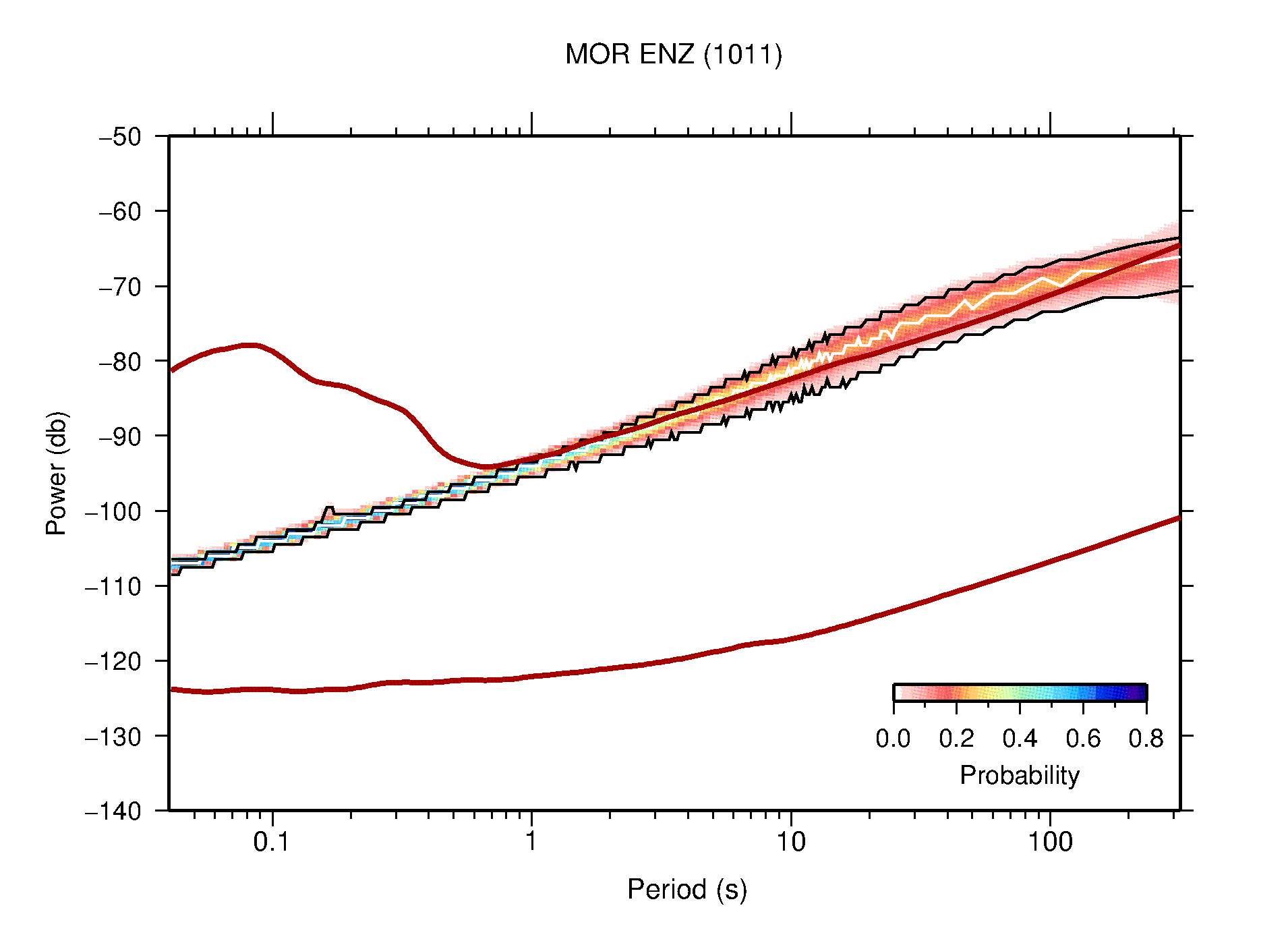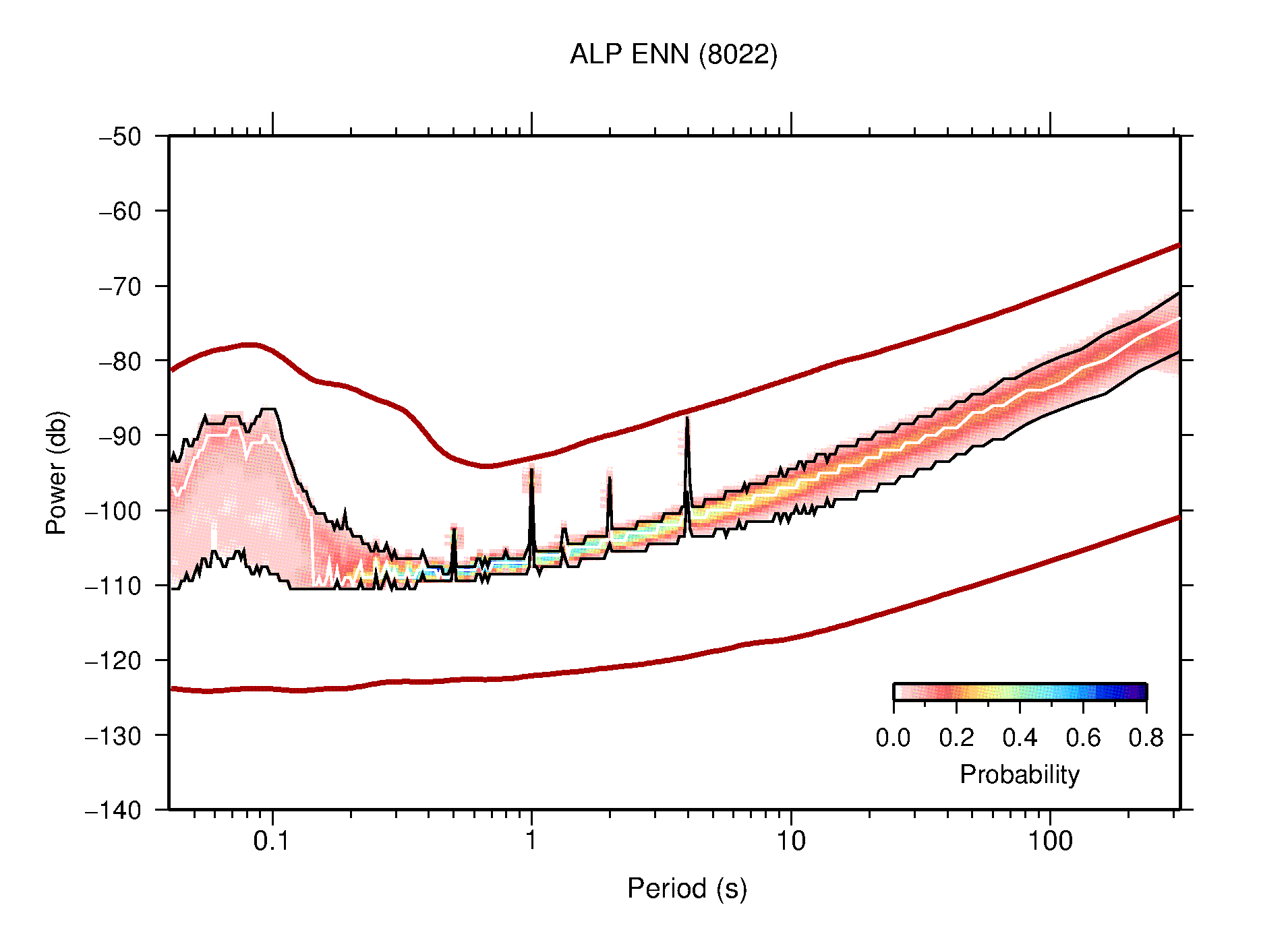 The following figures are full year PDFs for each of the 363 channels processed in this work. The same color scale is used thoughout. The black curves show 0.5 and 99.5 percentiles while the white curve shows the mode. The number of PSDs contributing to the PDF is shown in parentheses next to the station and channel names. The y-axes represent spectral acceleration amplitudes in units of db relative to 1 m/s2 [10log10(m2/s4/Hz)]. The five channels that were not included in the network PDF because of known problems were CCUT ENE,N,Z; HCSU ENE; and HER ENE.
