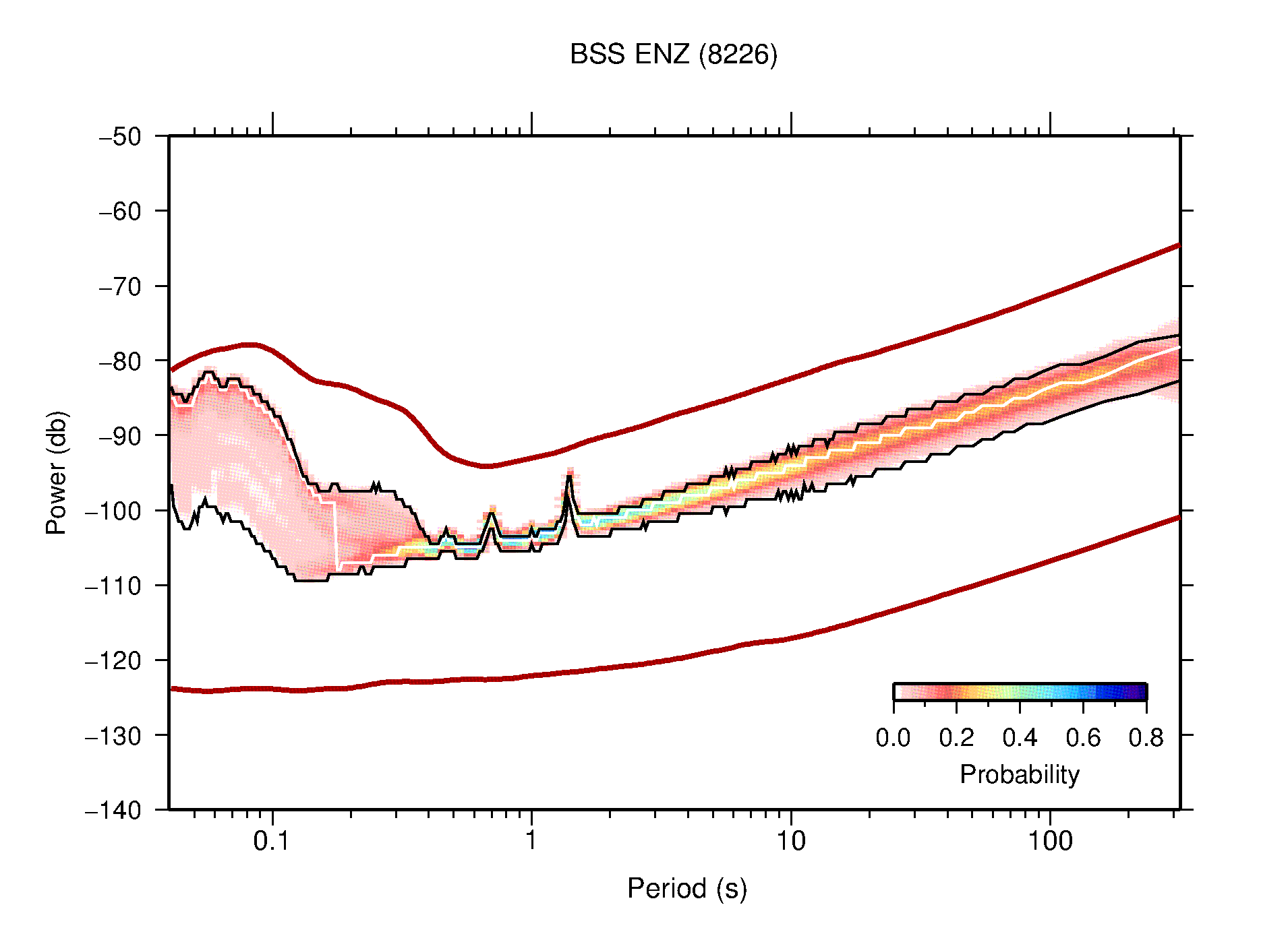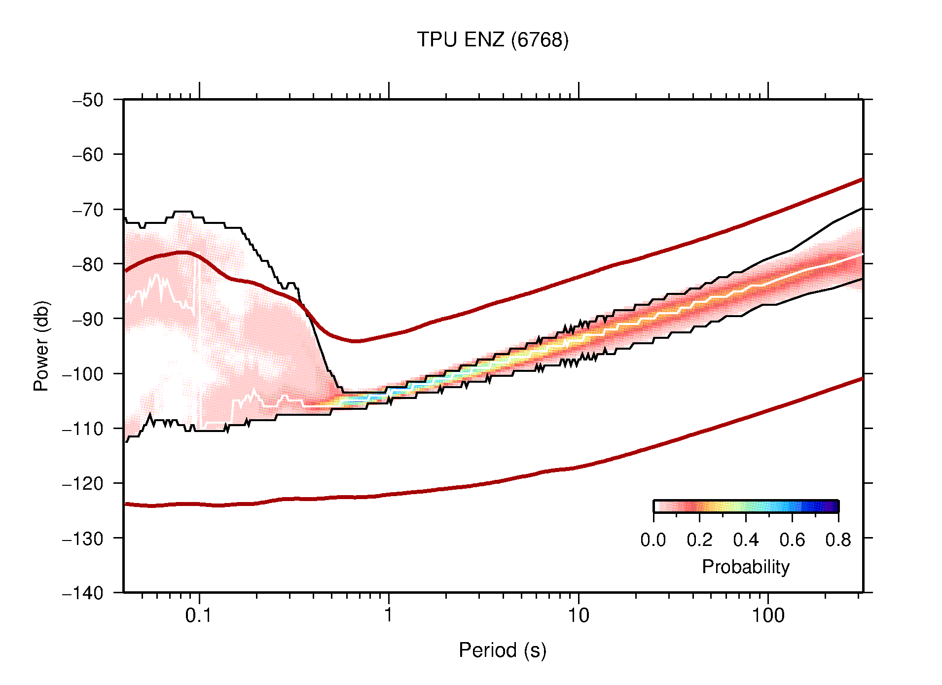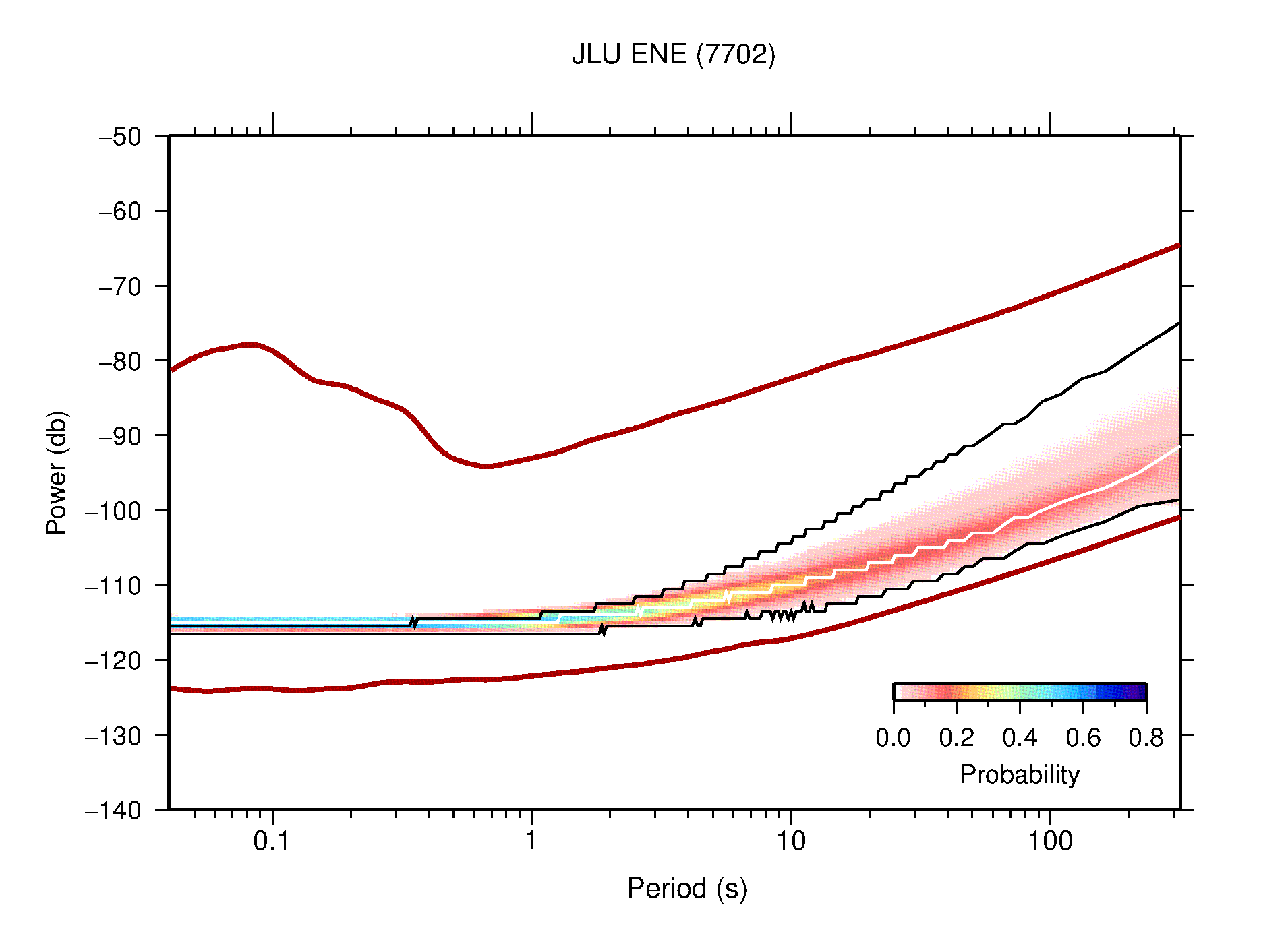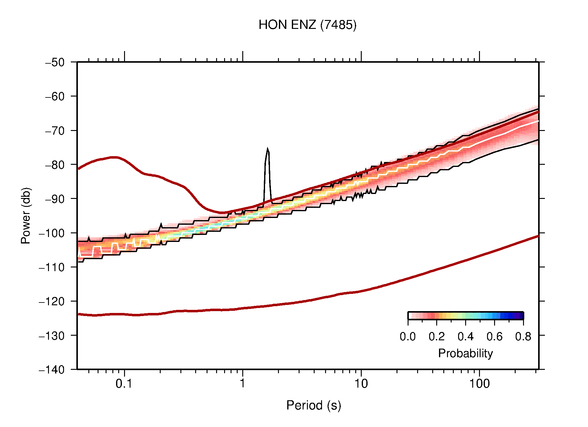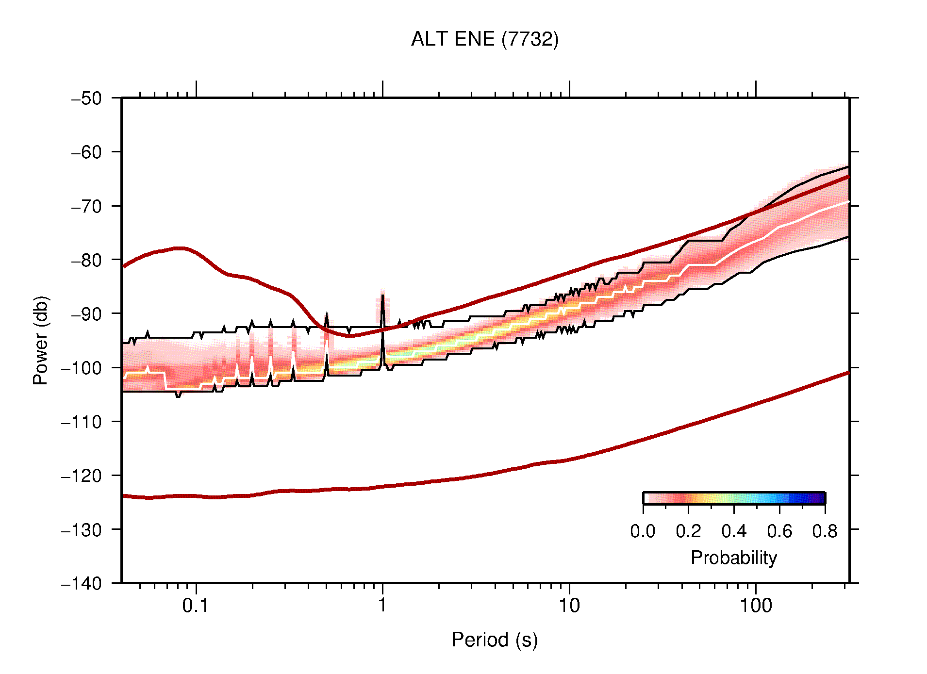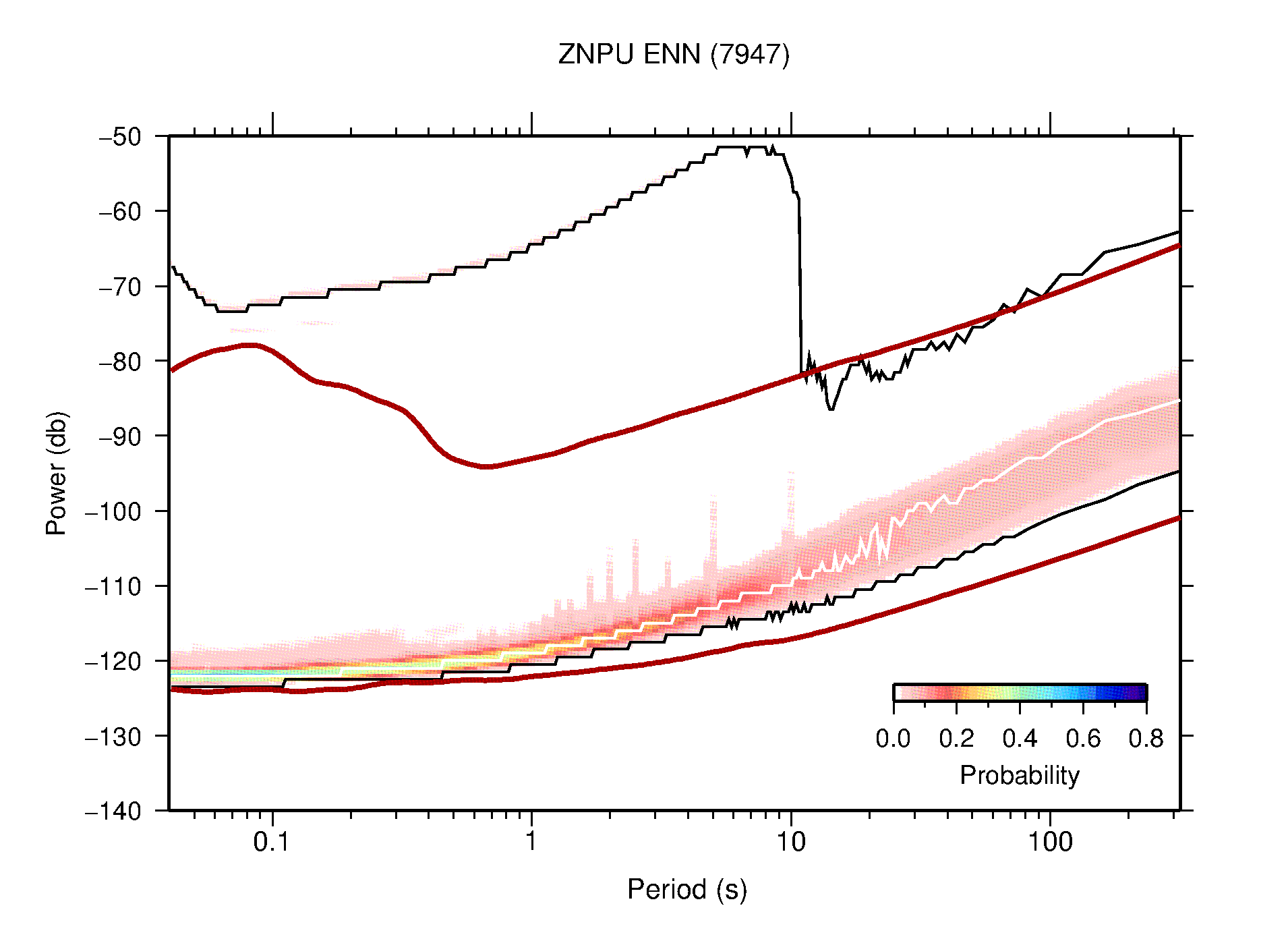 The following figures are full year PDFs for each of the 363 channels processed in this work. The same color scale is used thoughout. The black curves show 0.5 and 99.5 percentiles while the white curve shows the mode. The number of PSDs contributing to the PDF is shown in parentheses next to the station and channel names. The y-axes represent spectral acceleration amplitudes in units of db relative to 1 m/s2 [10log10(m2/s4/Hz)]. The five channels that were not included in the network PDF because of known problems were CCUT ENE,N,Z; HCSU ENE; and HER ENE.