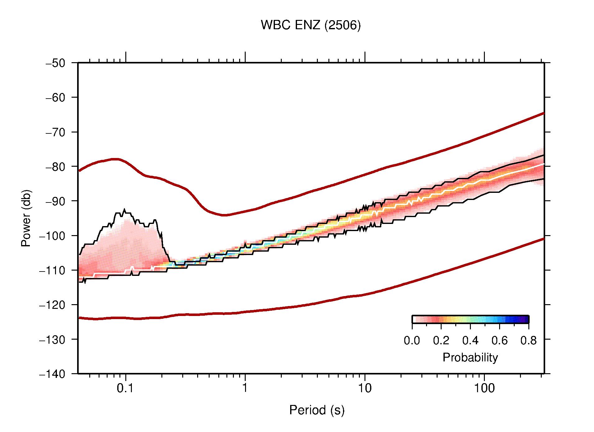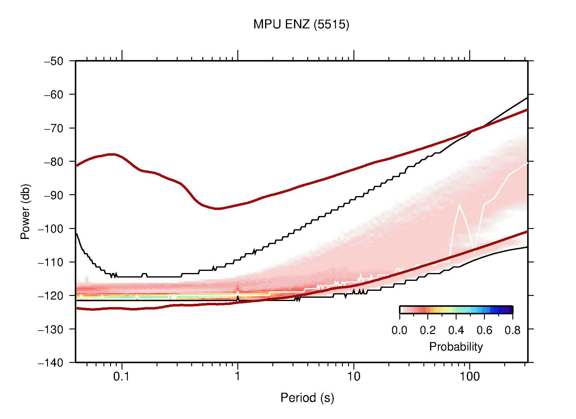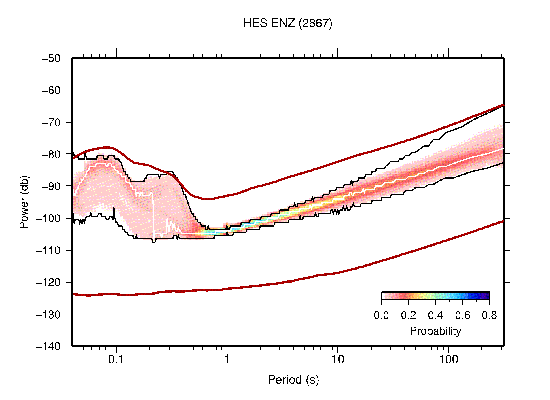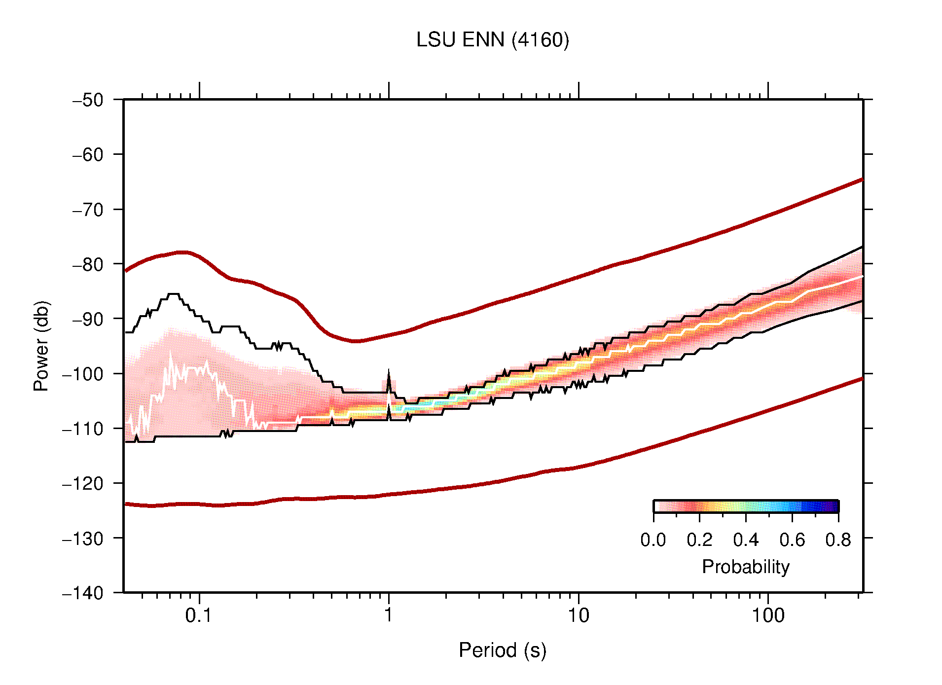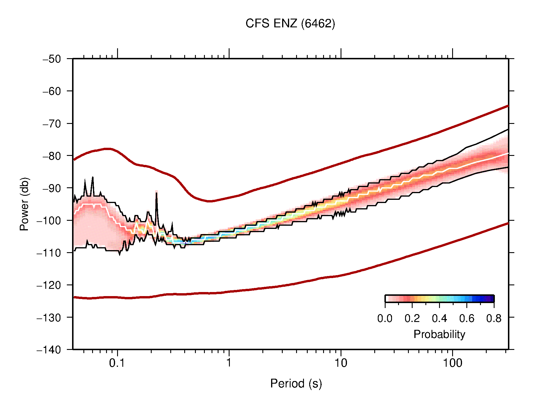The following figures are full year PDFs for each of the 363 channels processed in this work. The same color scale is used thoughout. The black curves show 0.5 and 99.5 percentiles while the white curve shows the mode. The number of PSDs contributing to the PDF is shown in parentheses next to the station and channel names. The y-axes represent spectral acceleration amplitudes in units of db relative to 1 m/s2 [10log10(m2/s4/Hz)]. The five channels that were not included in the network PDF because of known problems were CCUT ENE,N,Z; HCSU ENE; and HER ENE.