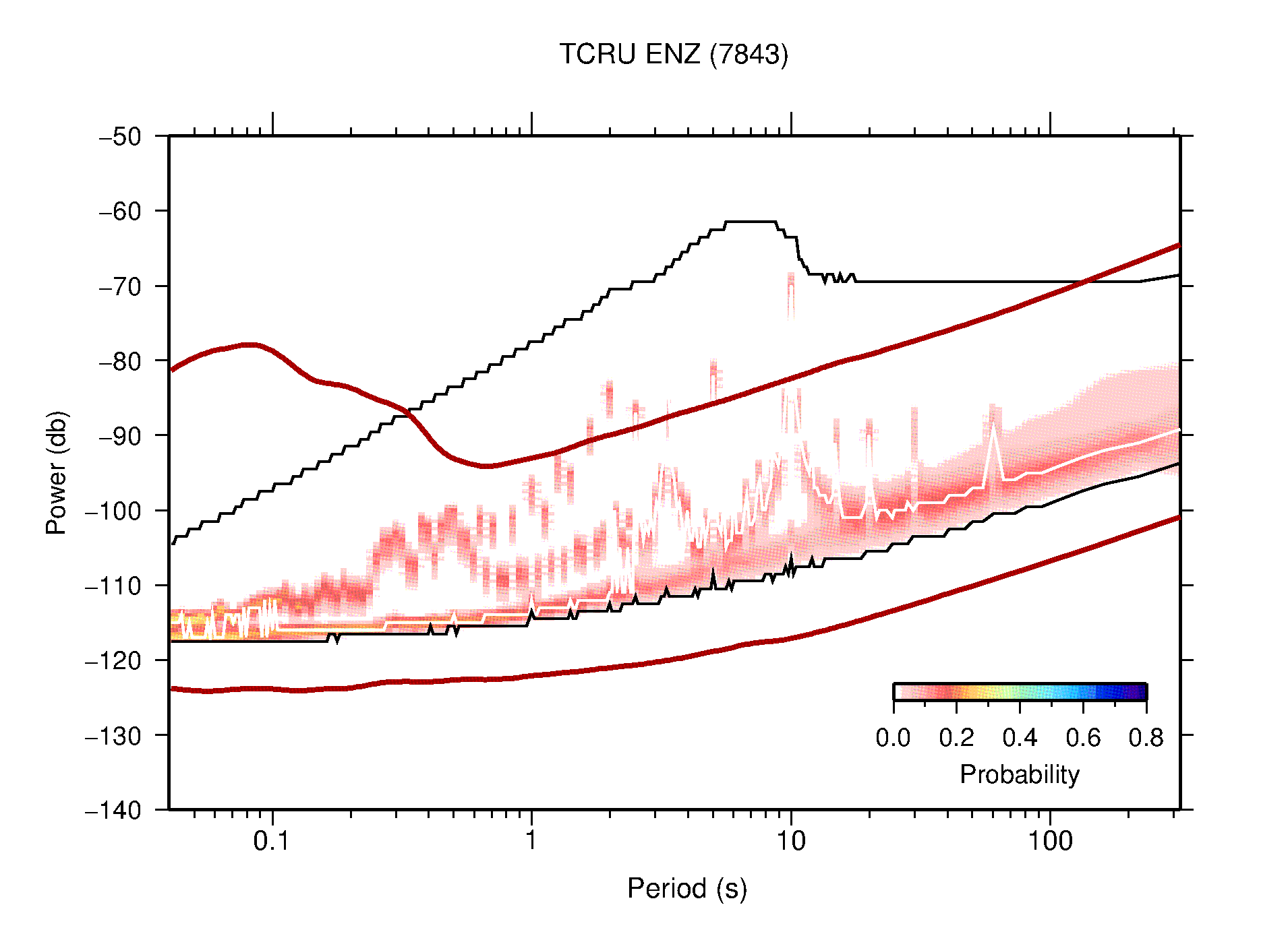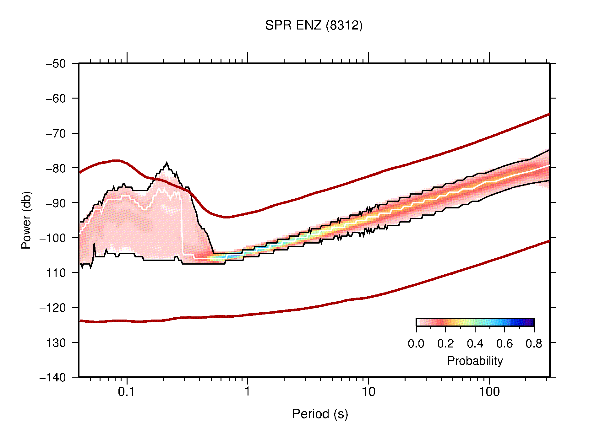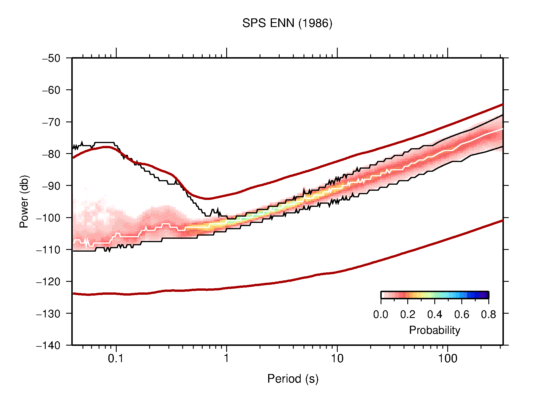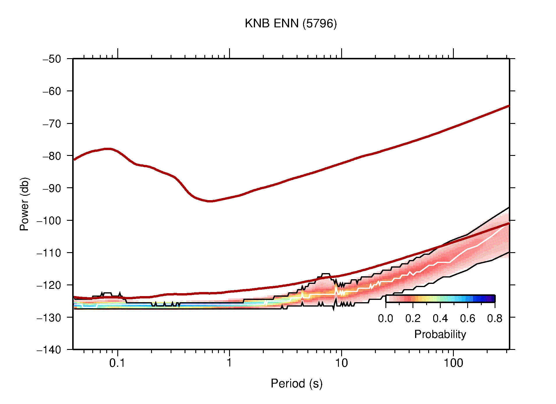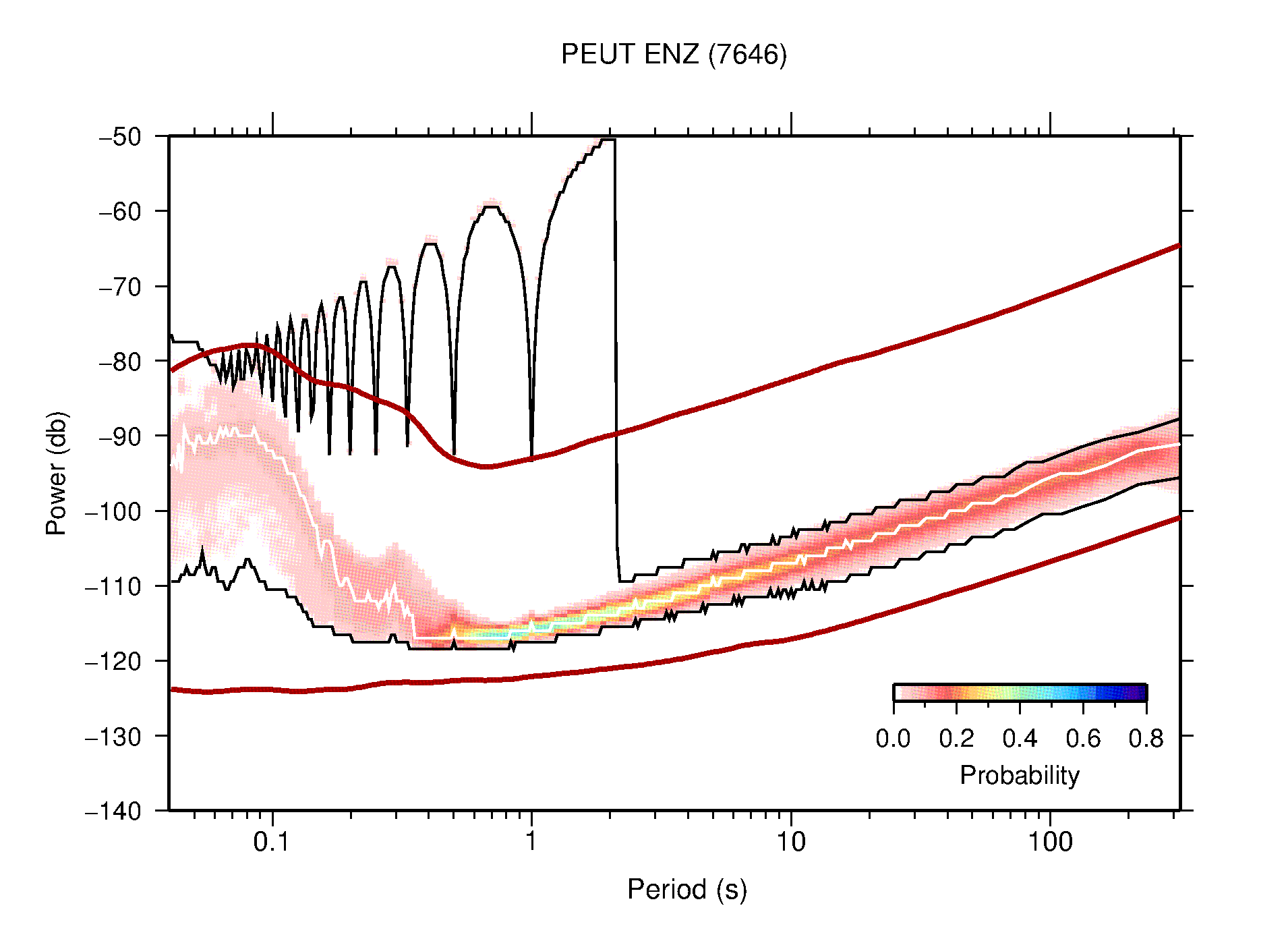 The following figures are full year PDFs for each of the 363 channels processed in this work. The same color scale is used thoughout. The black curves show 0.5 and 99.5 percentiles while the white curve shows the mode. The number of PSDs contributing to the PDF is shown in parentheses next to the station and channel names. The y-axes represent spectral acceleration amplitudes in units of db relative to 1 m/s2 [10log10(m2/s4/Hz)]. The five channels that were not included in the network PDF because of known problems were CCUT ENE,N,Z; HCSU ENE; and HER ENE.