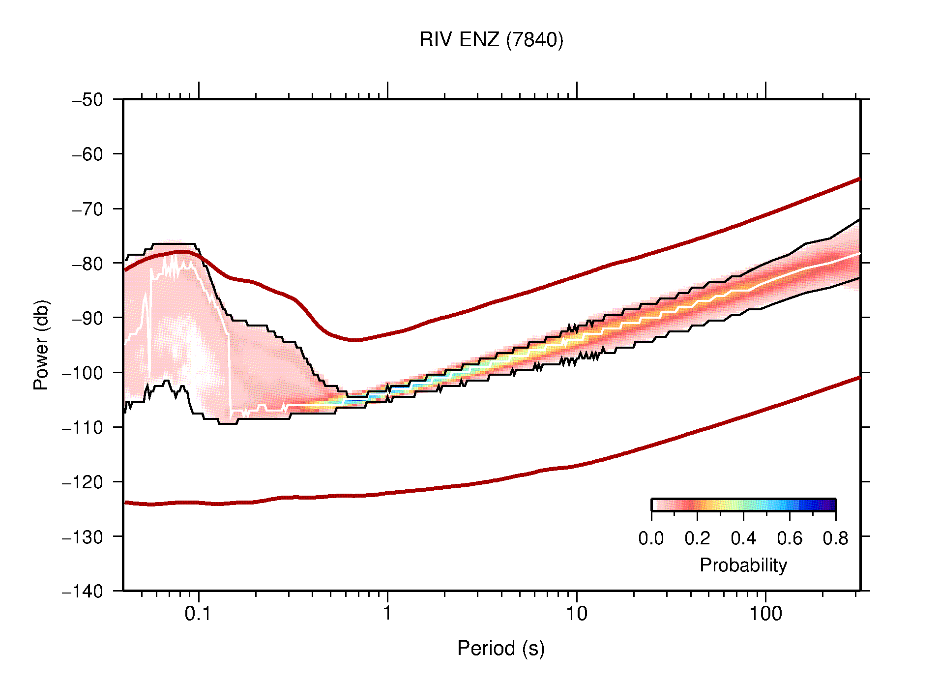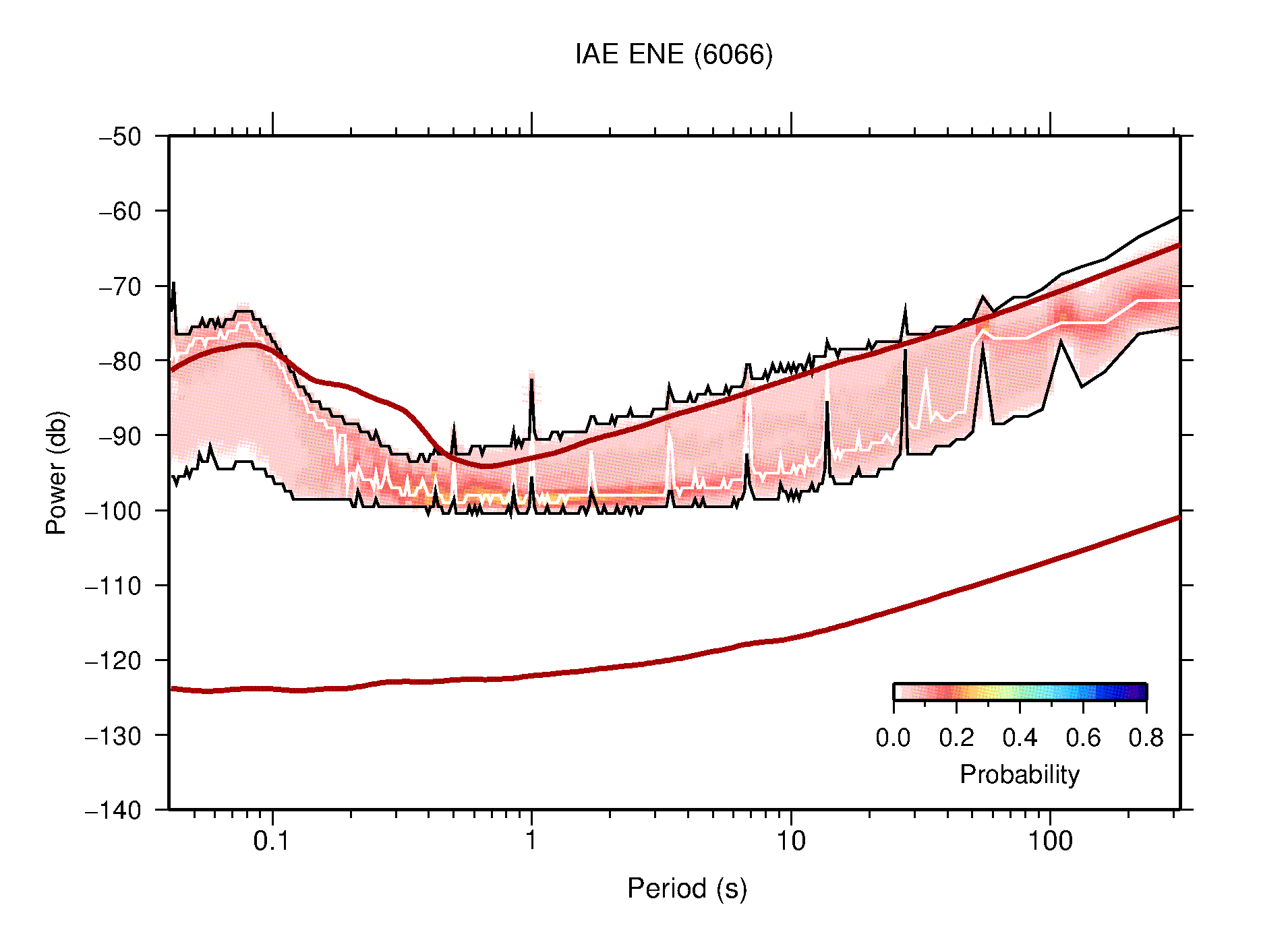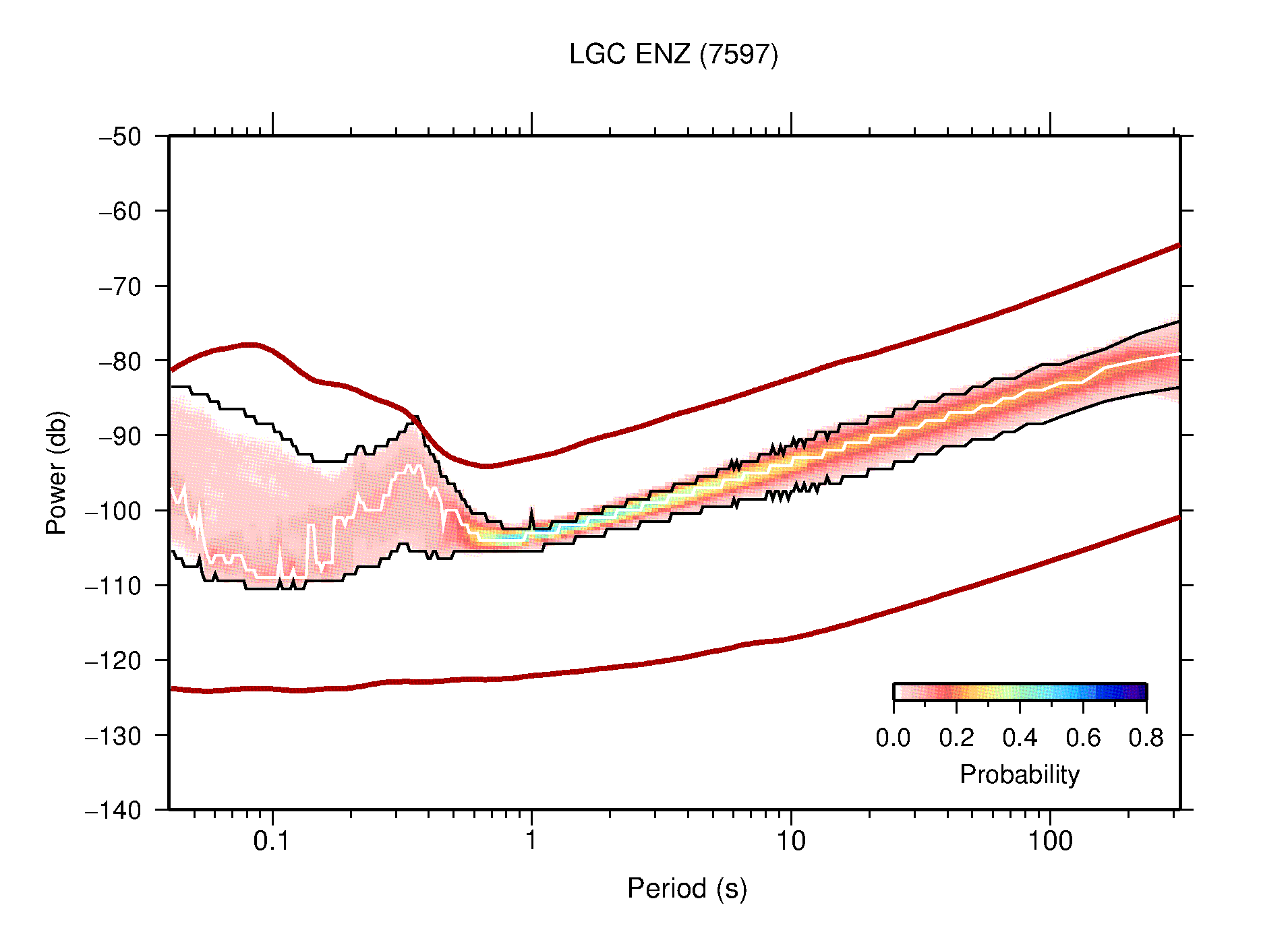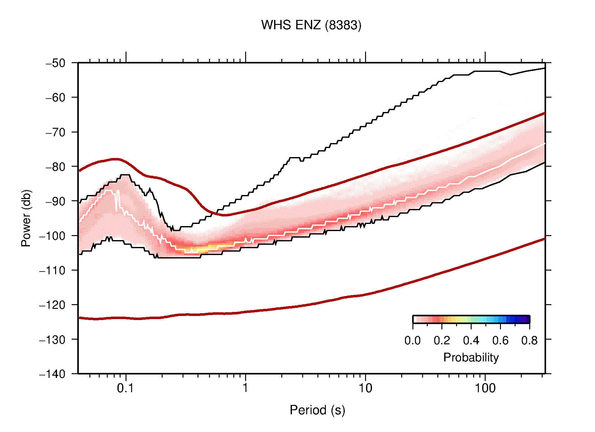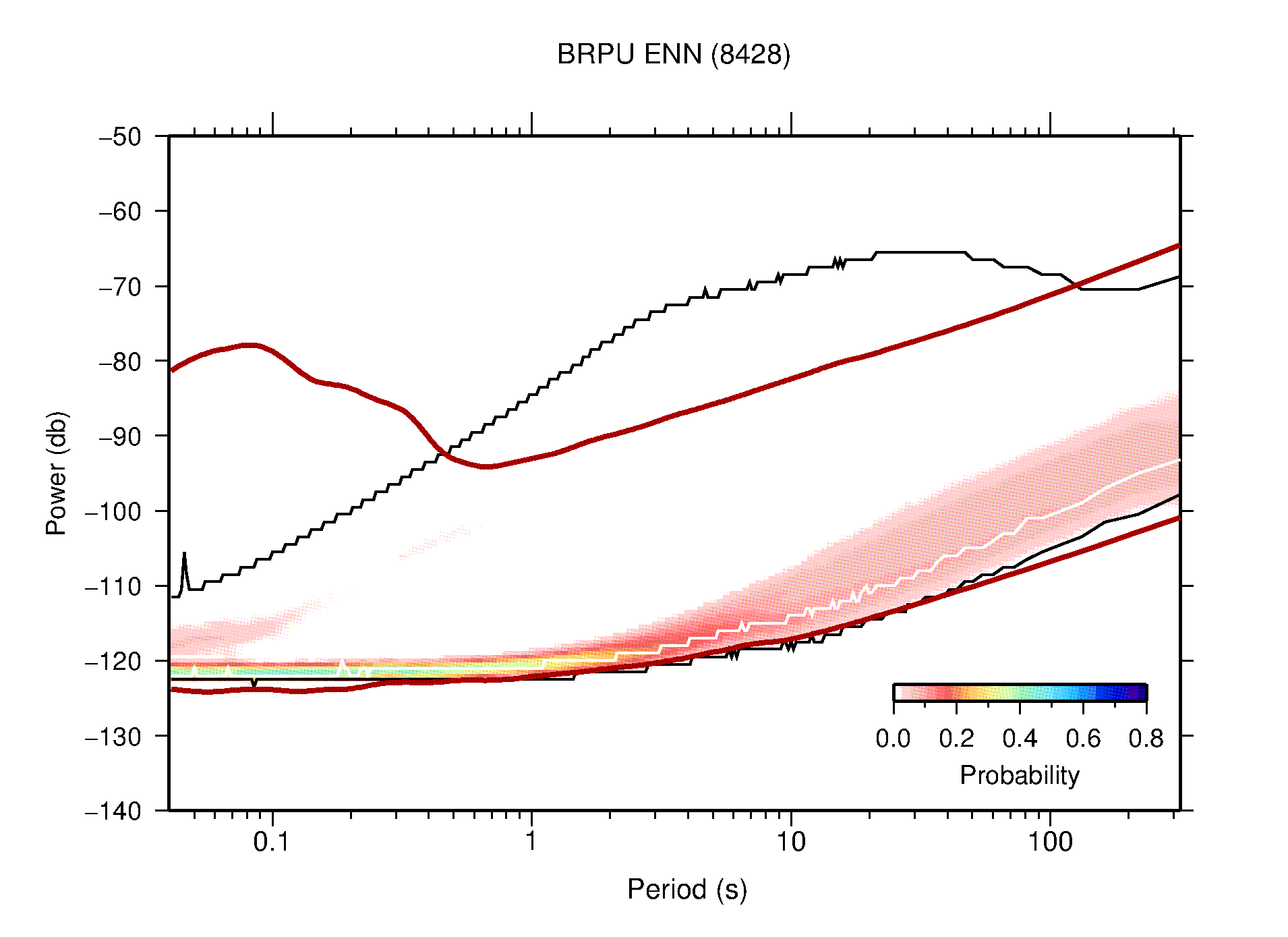 The following figures are full year PDFs for each of the 363 channels processed in this work. The same color scale is used thoughout. The black curves show 0.5 and 99.5 percentiles while the white curve shows the mode. The number of PSDs contributing to the PDF is shown in parentheses next to the station and channel names. The y-axes represent spectral acceleration amplitudes in units of db relative to 1 m/s2 [10log10(m2/s4/Hz)]. The five channels that were not included in the network PDF because of known problems were CCUT ENE,N,Z; HCSU ENE; and HER ENE.