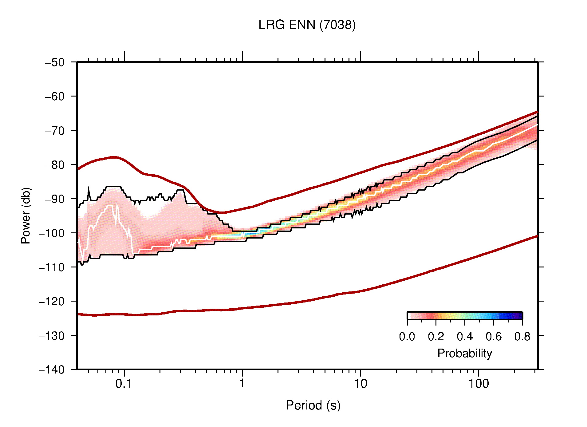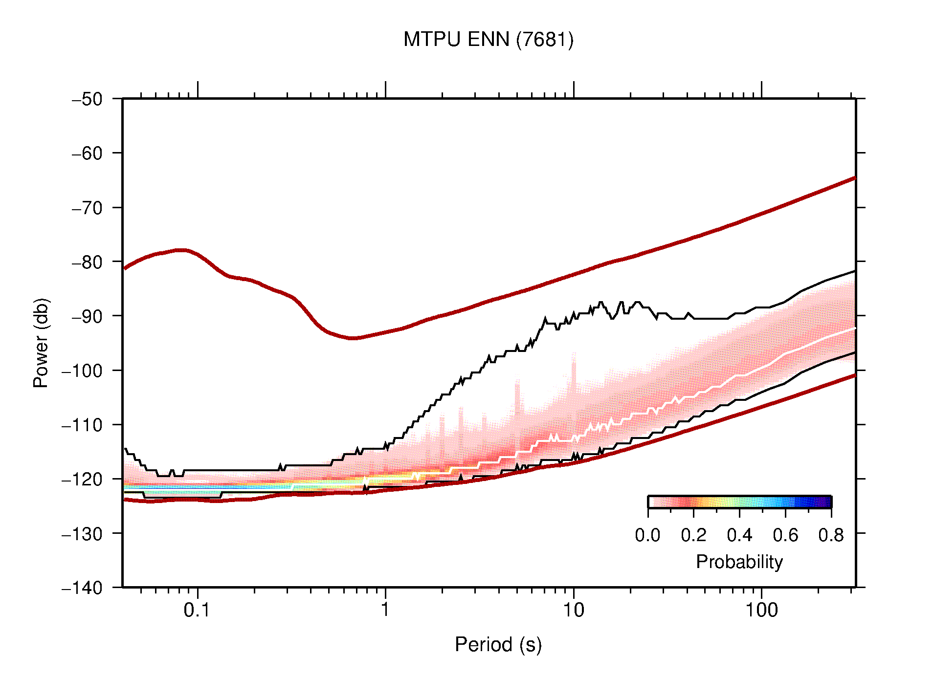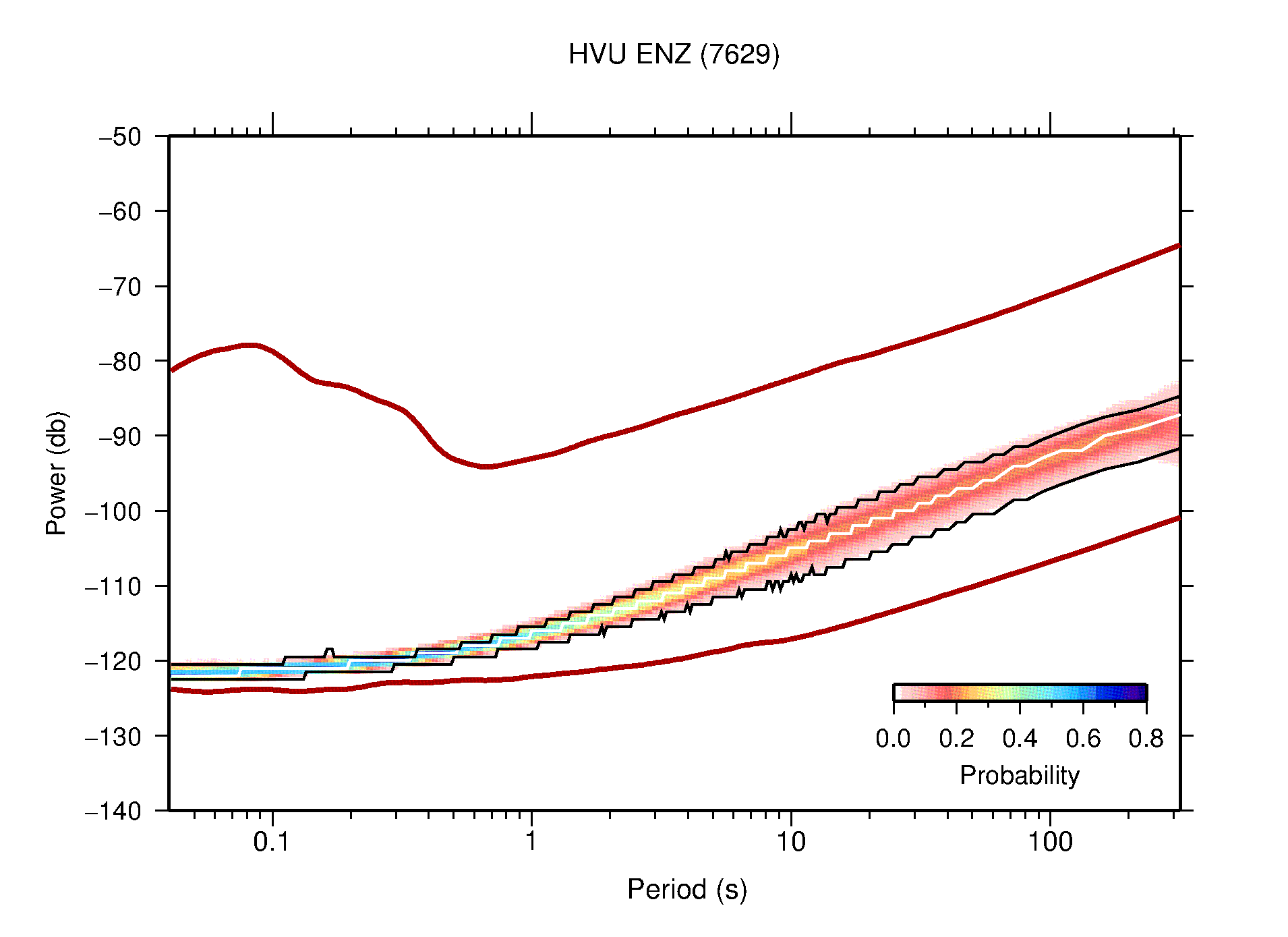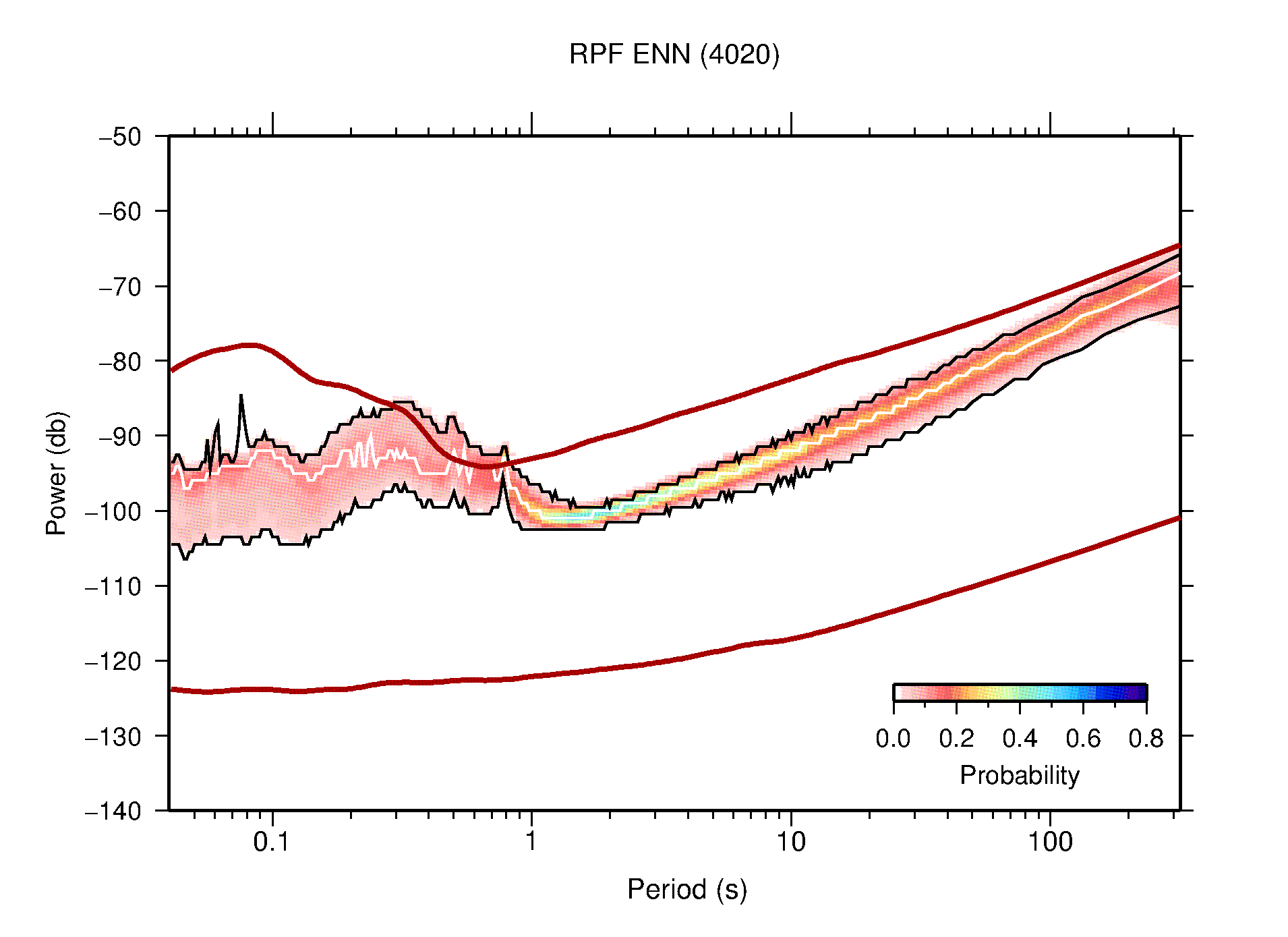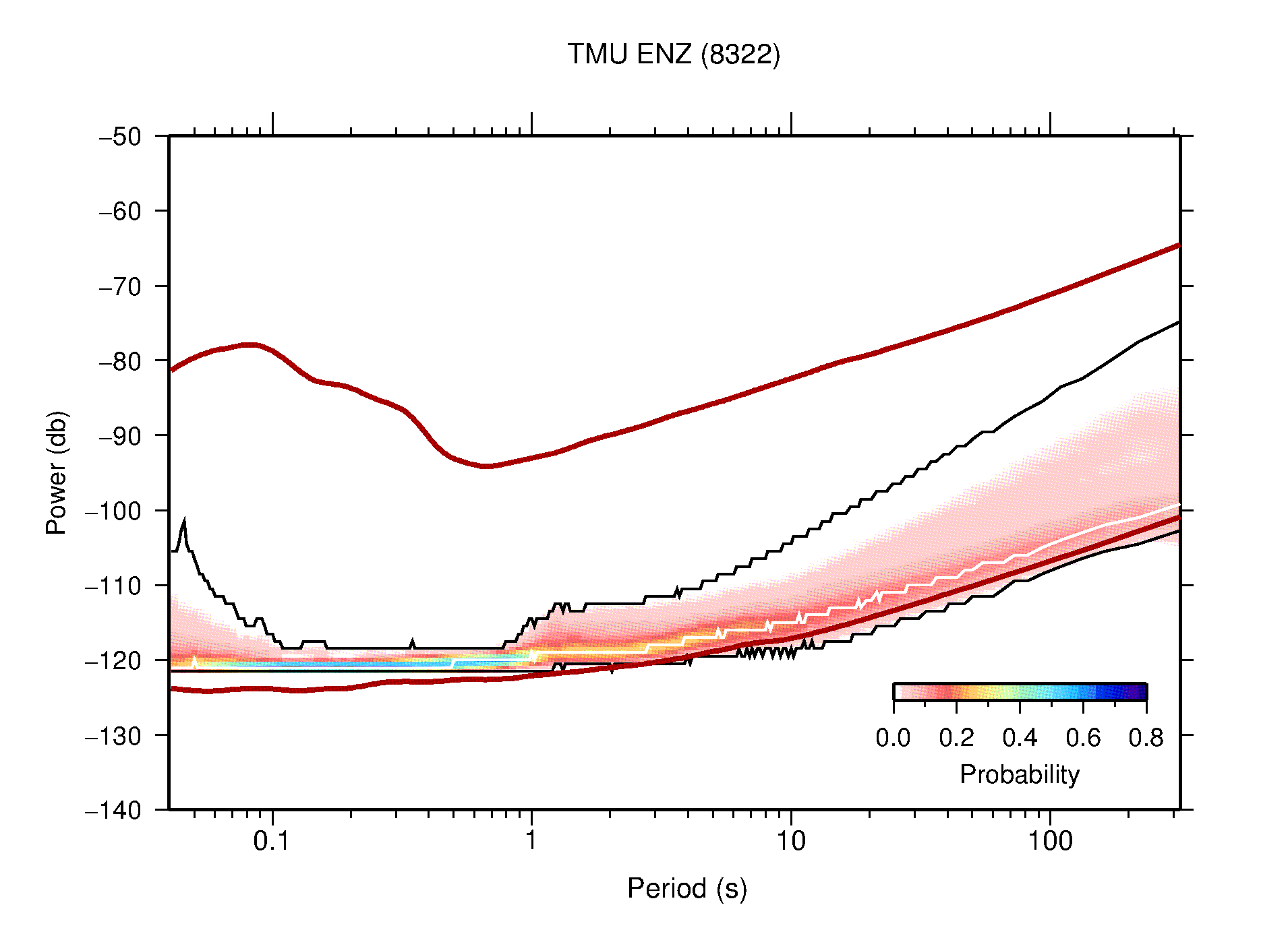 The following figures are full year PDFs for each of the 363 channels processed in this work. The same color scale is used thoughout. The black curves show 0.5 and 99.5 percentiles while the white curve shows the mode. The number of PSDs contributing to the PDF is shown in parentheses next to the station and channel names. The y-axes represent spectral acceleration amplitudes in units of db relative to 1 m/s2 [10log10(m2/s4/Hz)]. The five channels that were not included in the network PDF because of known problems were CCUT ENE,N,Z; HCSU ENE; and HER ENE.