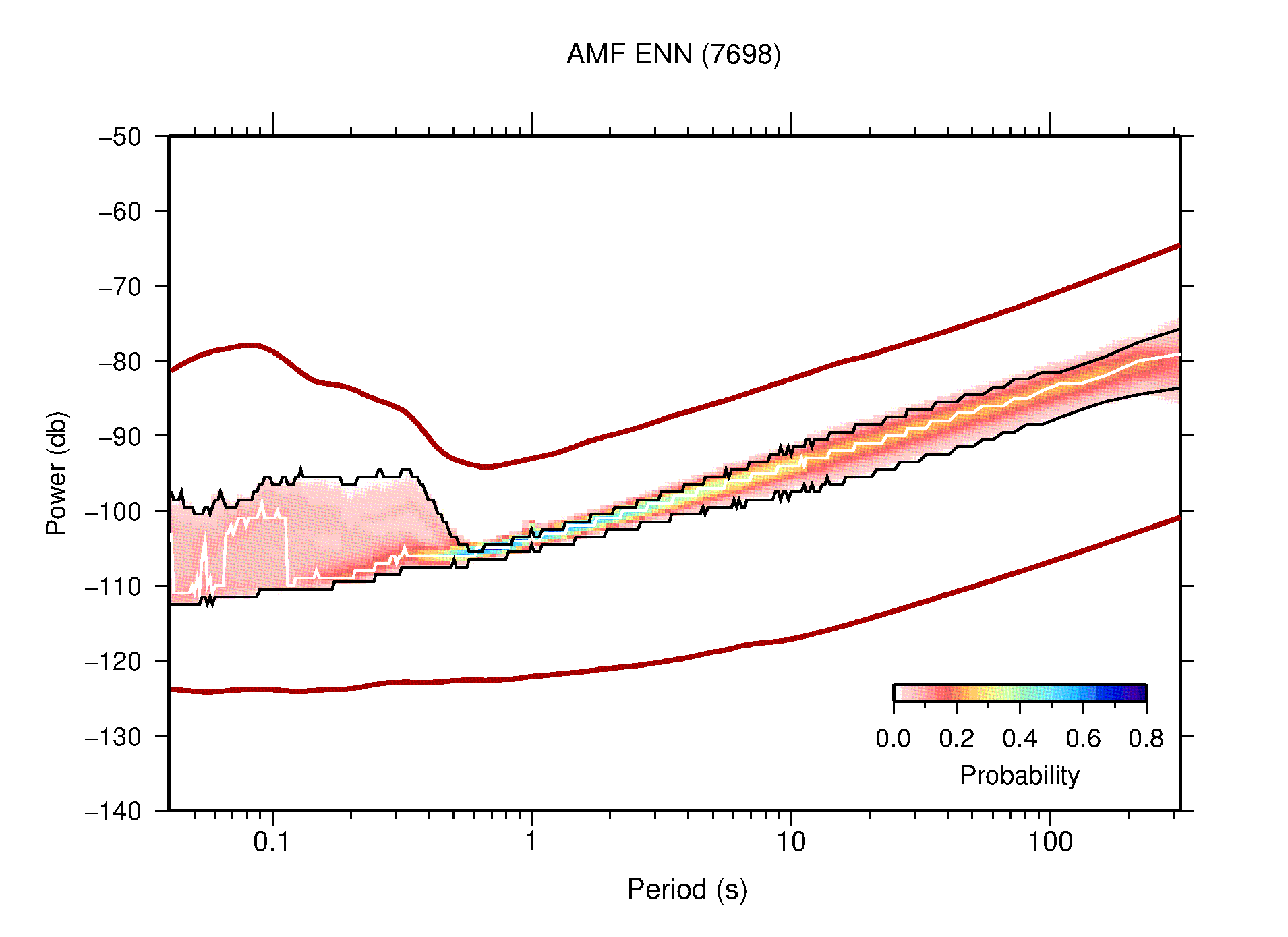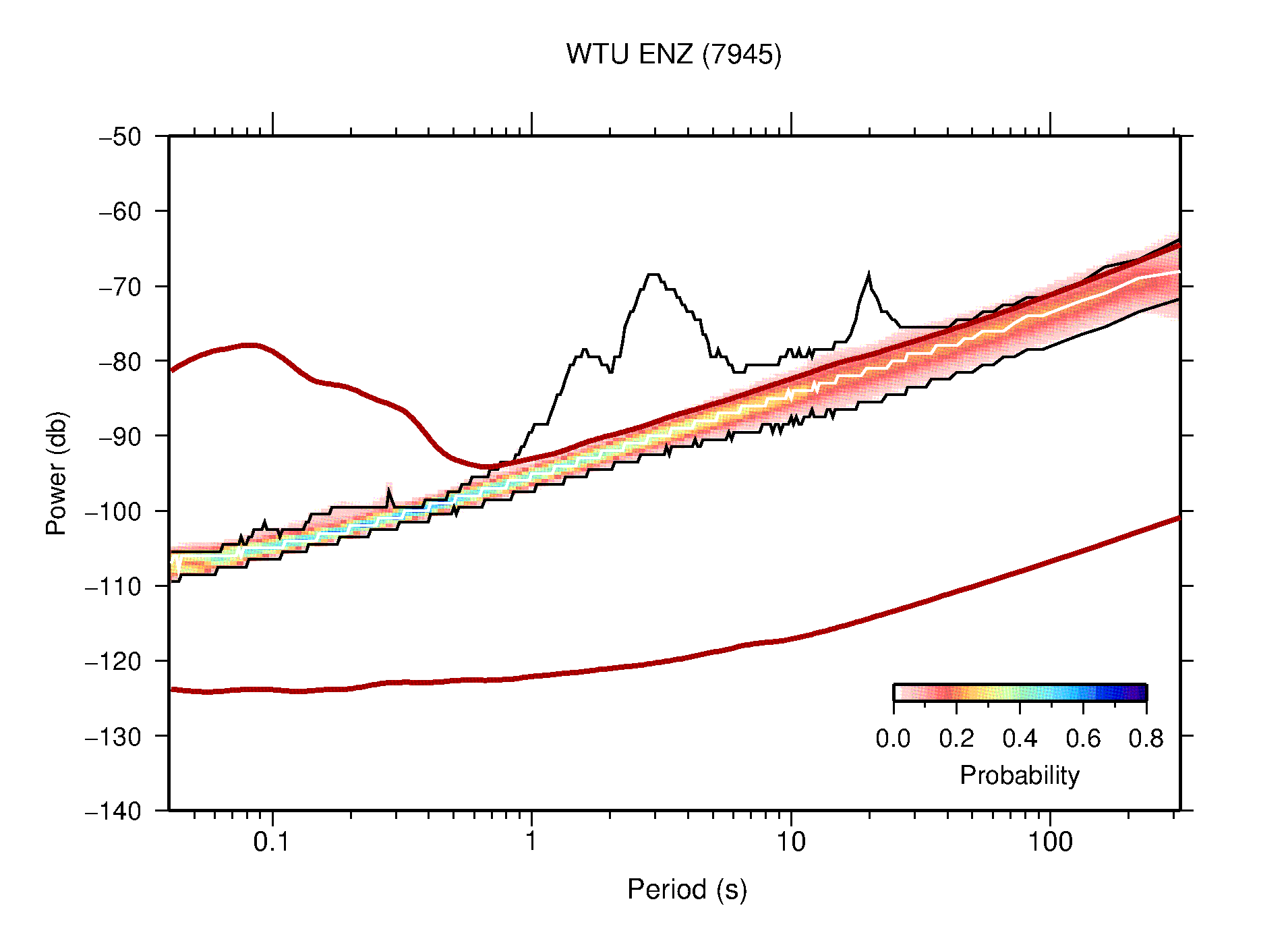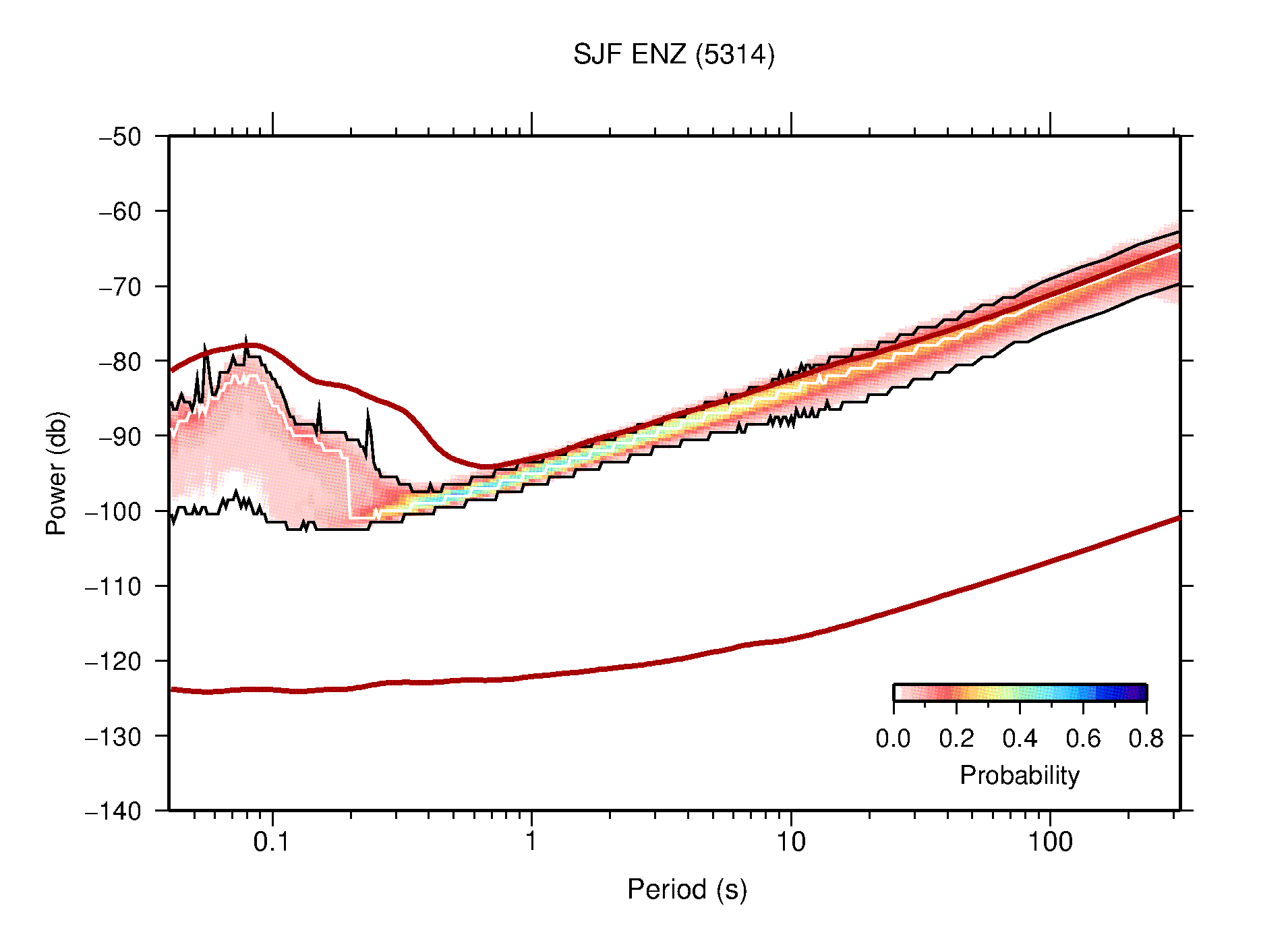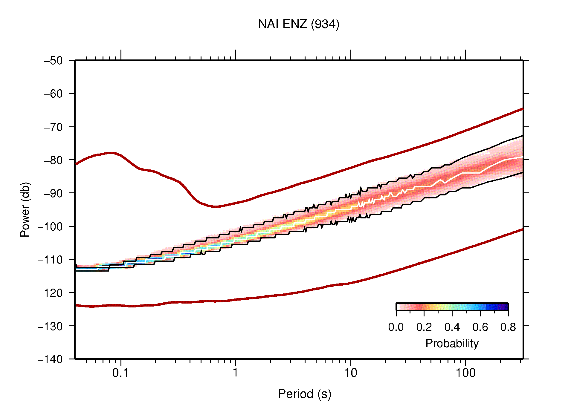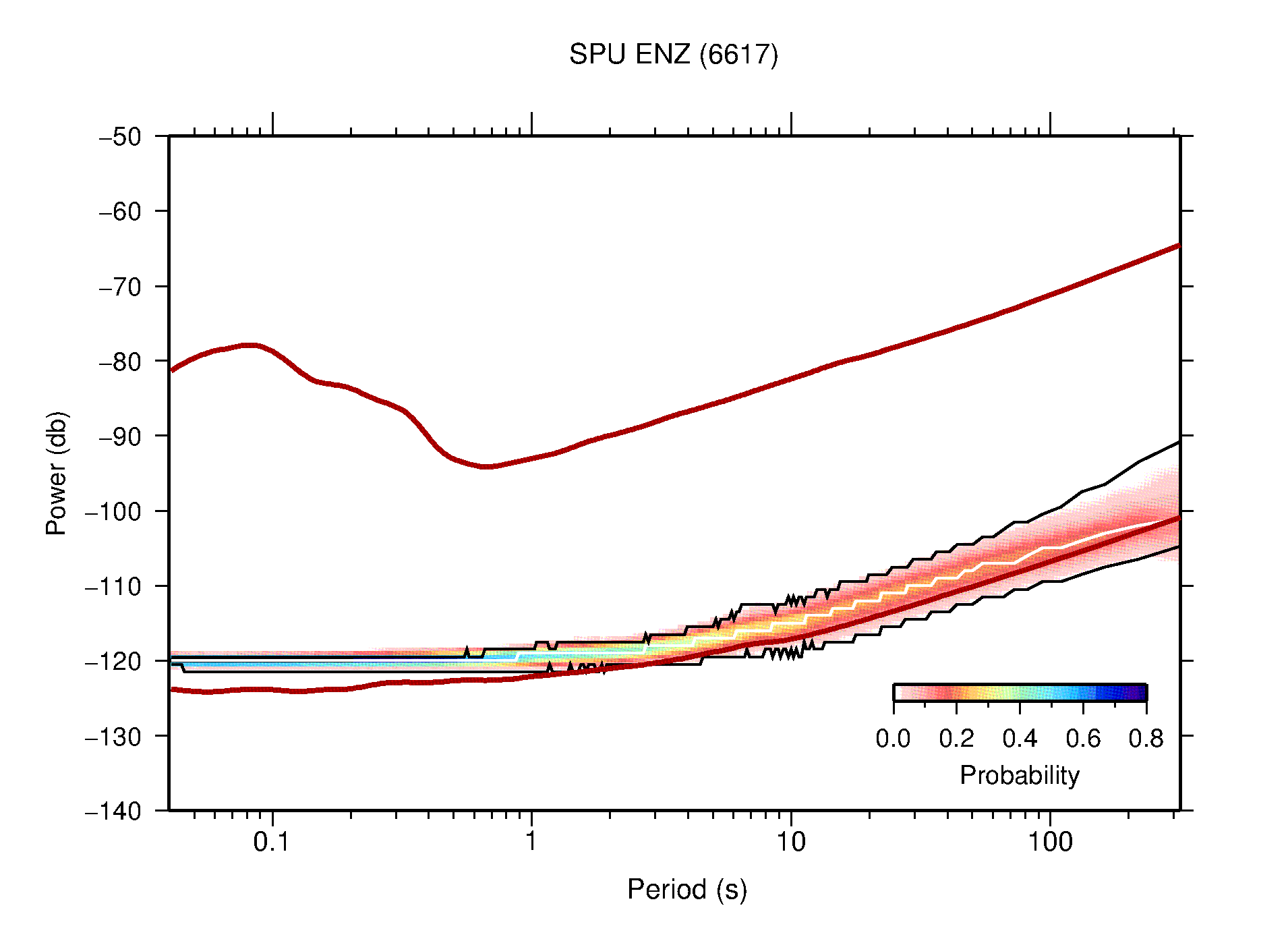 The following figures are full year PDFs for each of the 363 channels processed in this work. The same color scale is used thoughout. The black curves show 0.5 and 99.5 percentiles while the white curve shows the mode. The number of PSDs contributing to the PDF is shown in parentheses next to the station and channel names. The y-axes represent spectral acceleration amplitudes in units of db relative to 1 m/s2 [10log10(m2/s4/Hz)]. The five channels that were not included in the network PDF because of known problems were CCUT ENE,N,Z; HCSU ENE; and HER ENE.