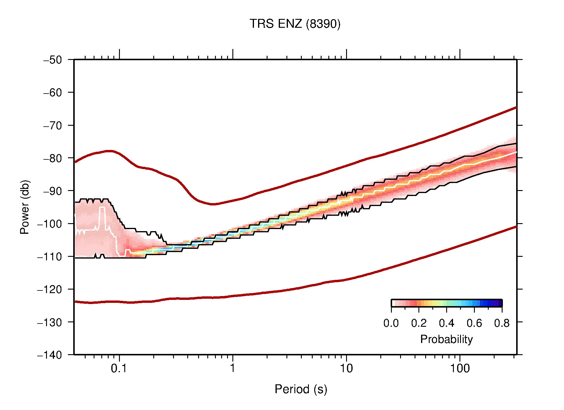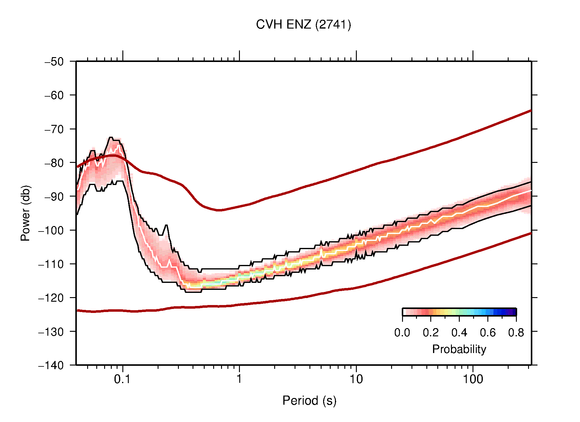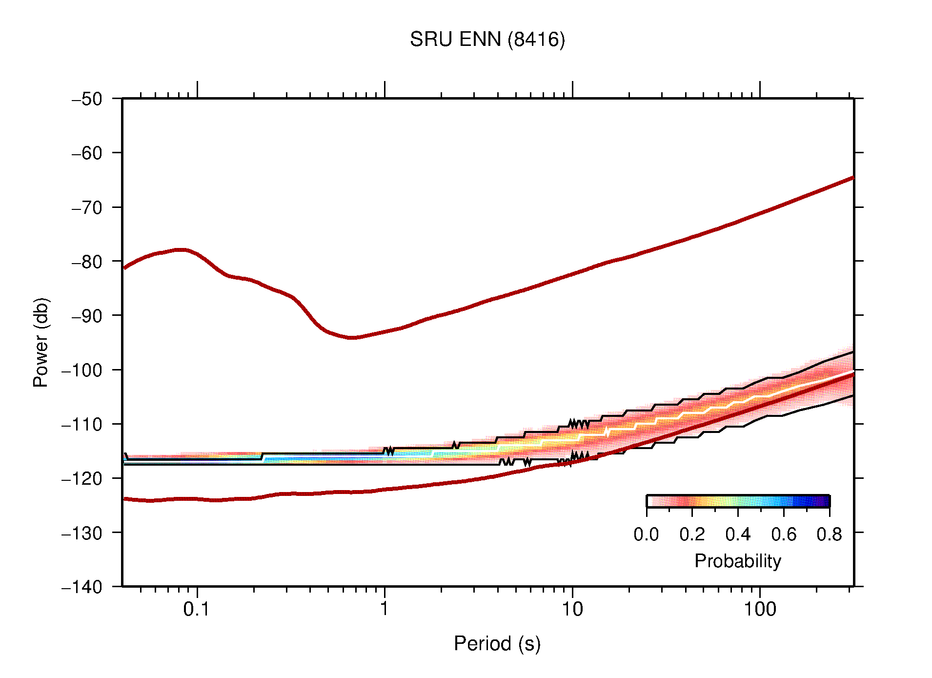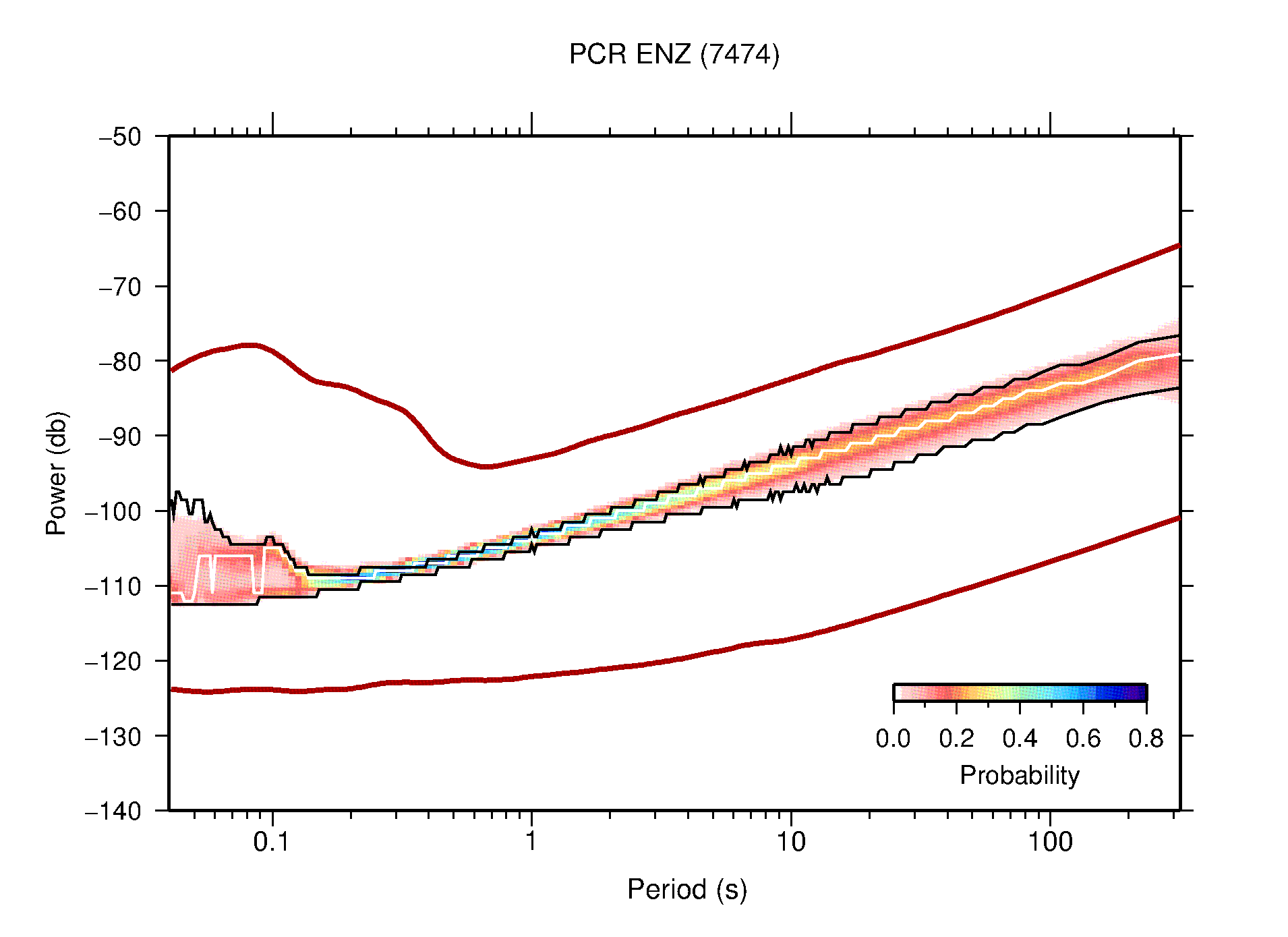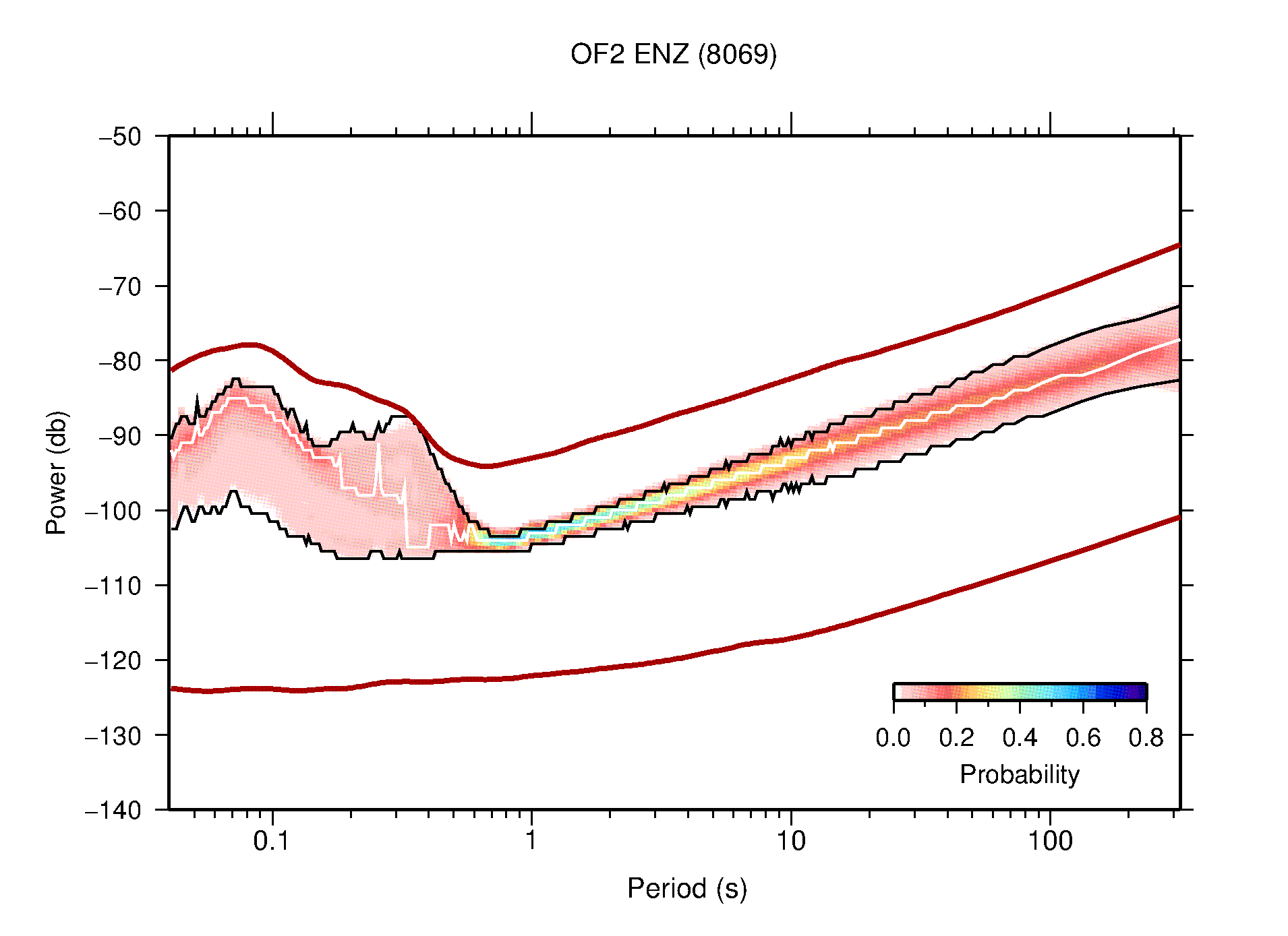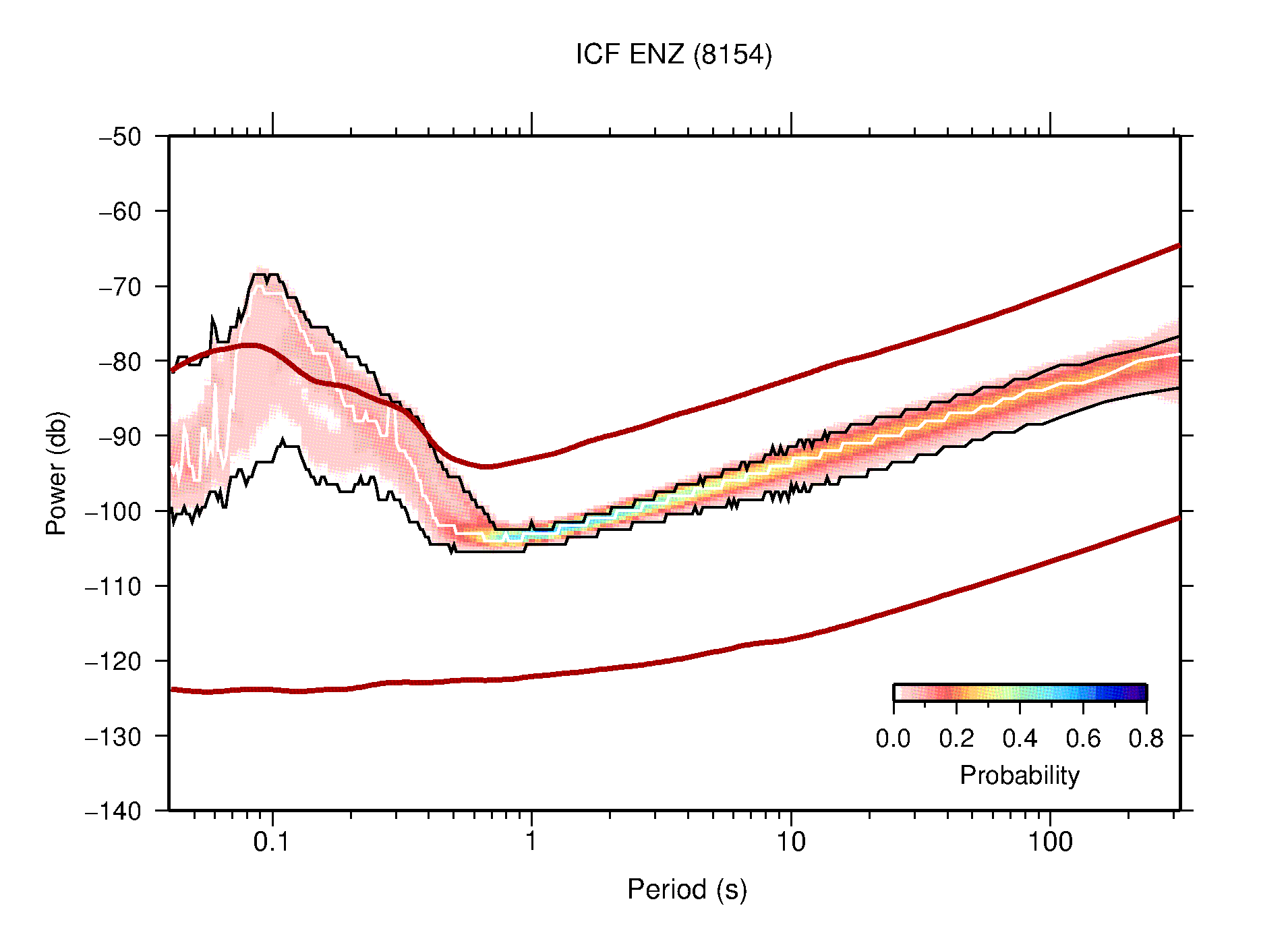 The following figures are full year PDFs for each of the 363 channels processed in this work. The same color scale is used thoughout. The black curves show 0.5 and 99.5 percentiles while the white curve shows the mode. The number of PSDs contributing to the PDF is shown in parentheses next to the station and channel names. The y-axes represent spectral acceleration amplitudes in units of db relative to 1 m/s2 [10log10(m2/s4/Hz)]. The five channels that were not included in the network PDF because of known problems were CCUT ENE,N,Z; HCSU ENE; and HER ENE.