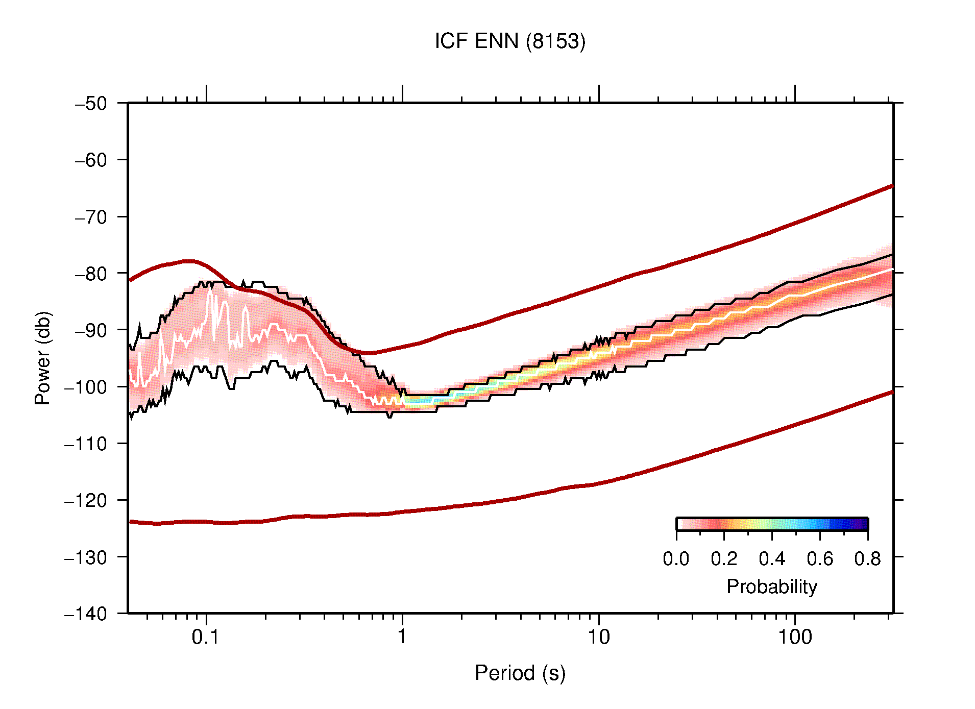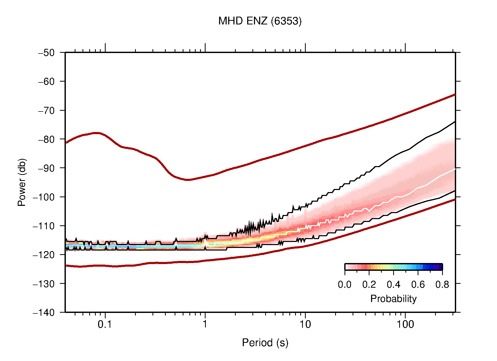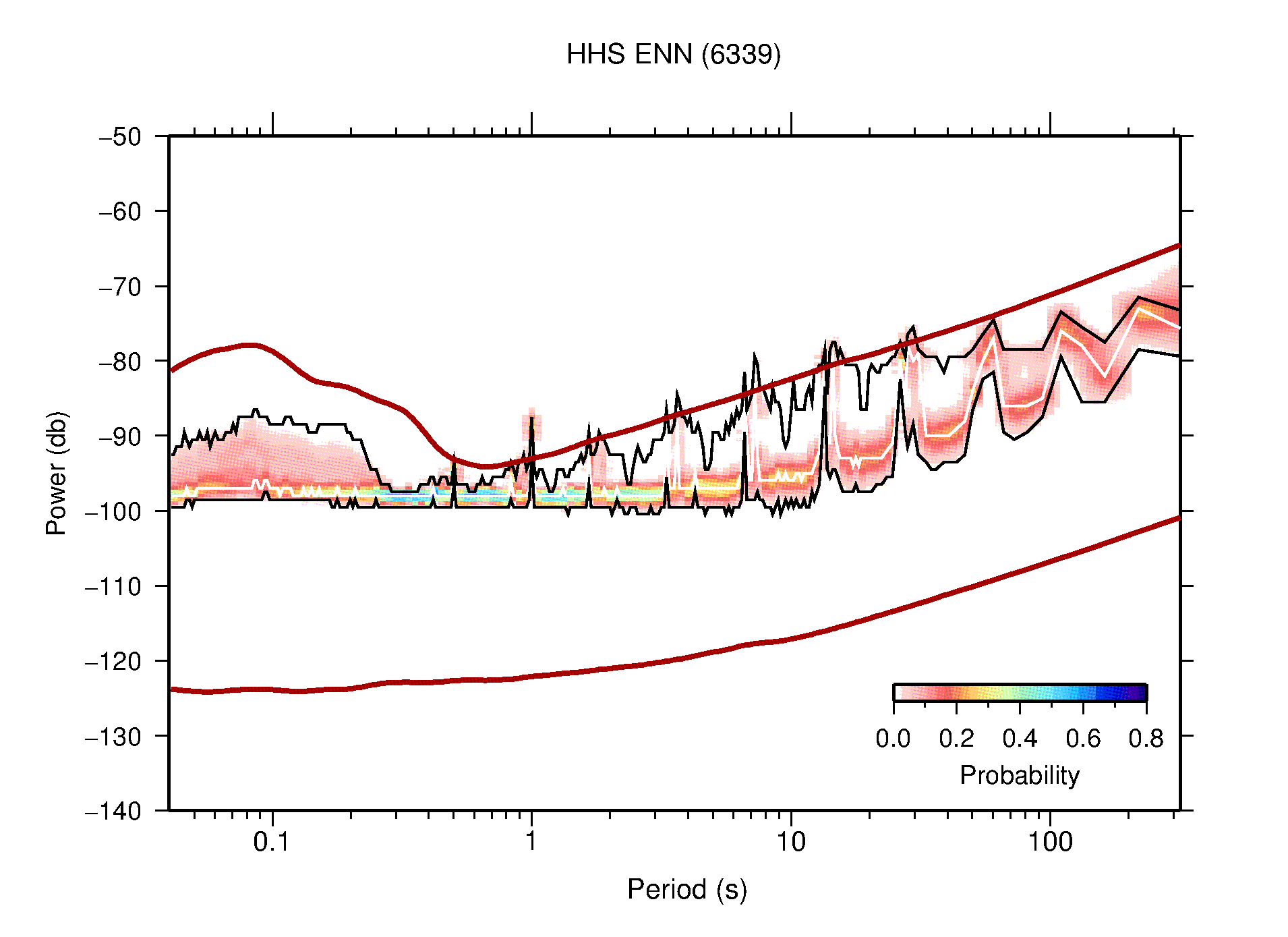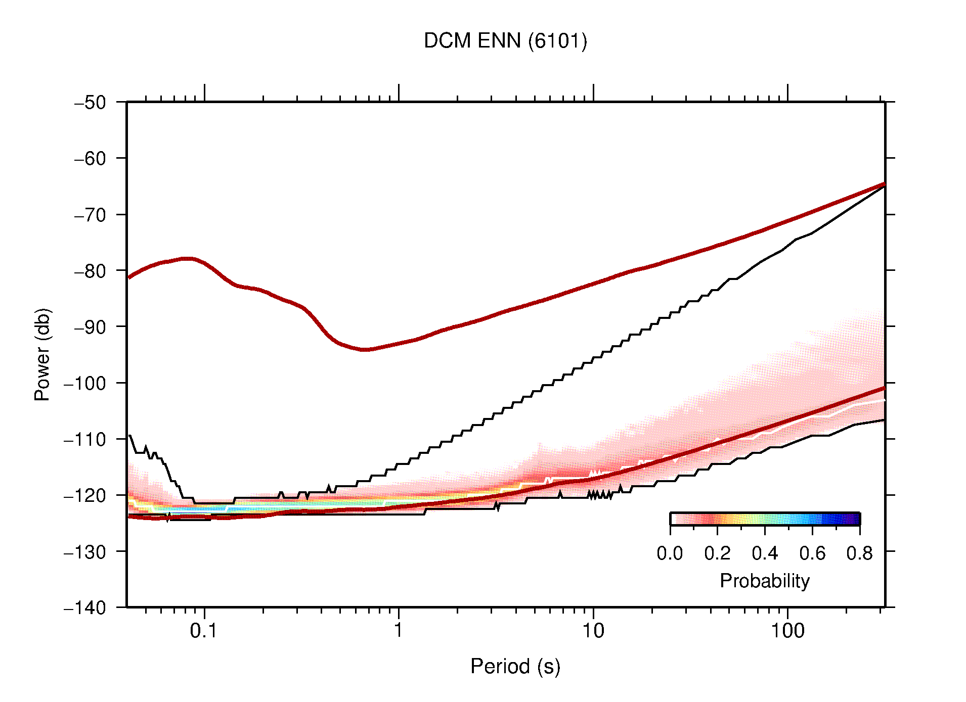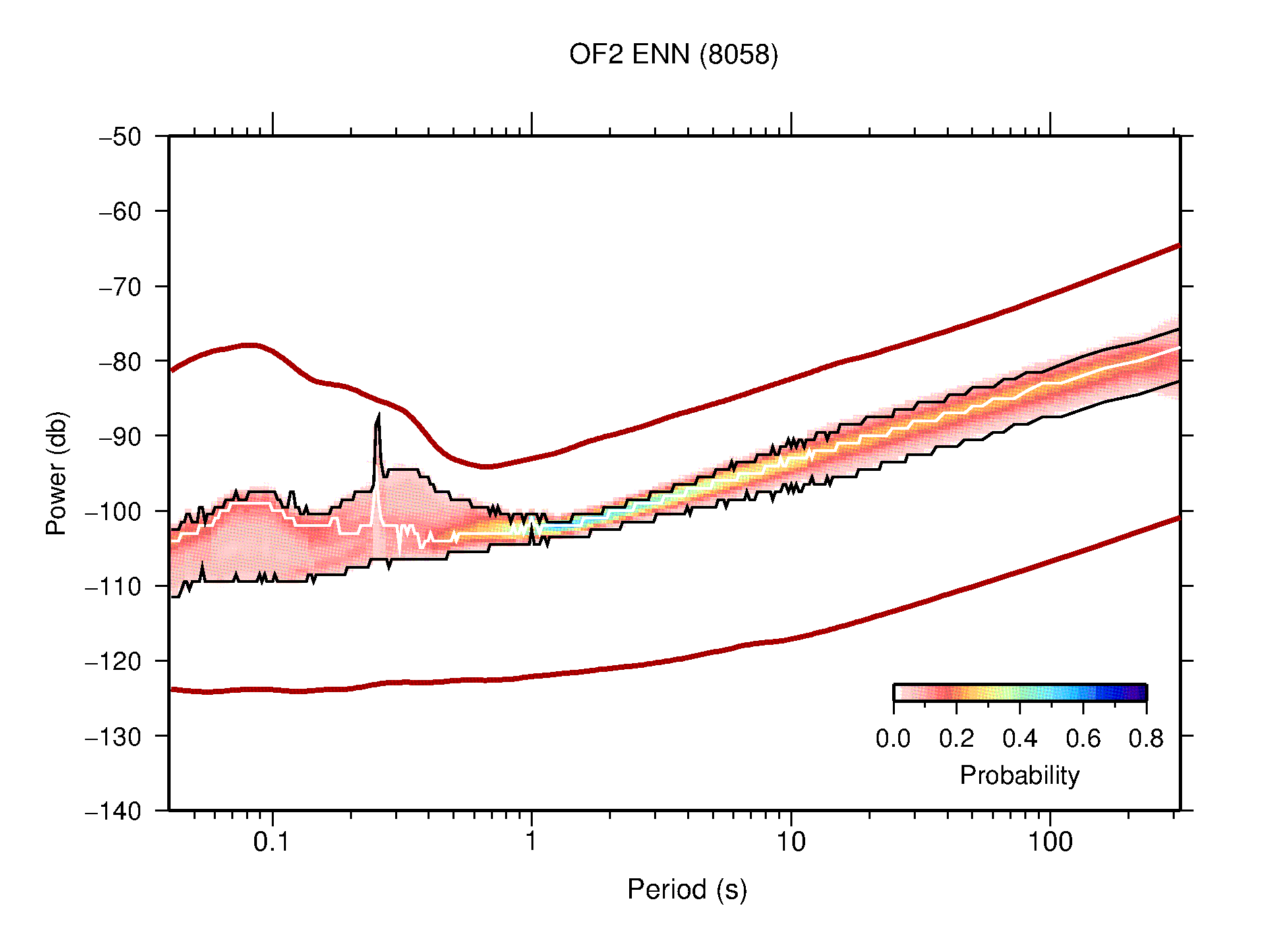 The following figures are full year PDFs for each of the 363 channels processed in this work. The same color scale is used thoughout. The black curves show 0.5 and 99.5 percentiles while the white curve shows the mode. The number of PSDs contributing to the PDF is shown in parentheses next to the station and channel names. The y-axes represent spectral acceleration amplitudes in units of db relative to 1 m/s2 [10log10(m2/s4/Hz)]. The five channels that were not included in the network PDF because of known problems were CCUT ENE,N,Z; HCSU ENE; and HER ENE.