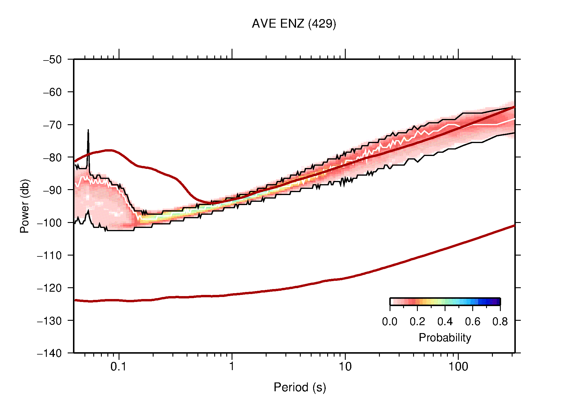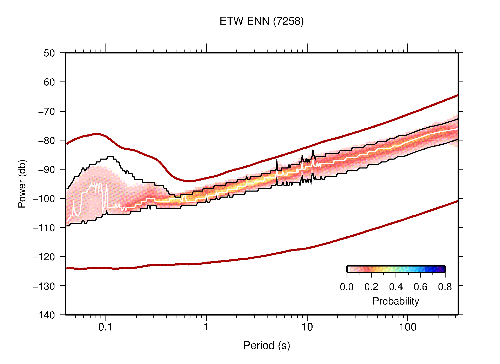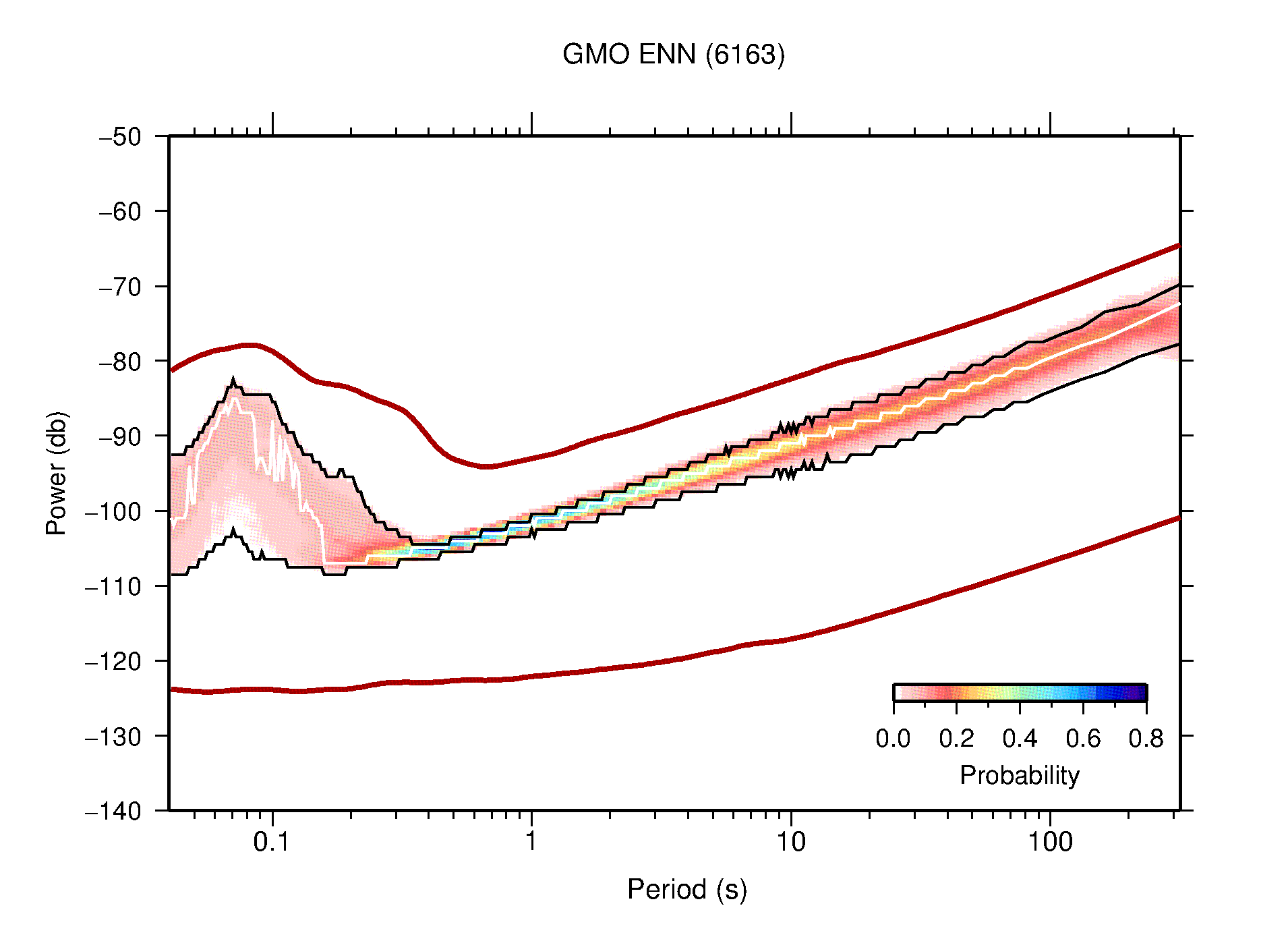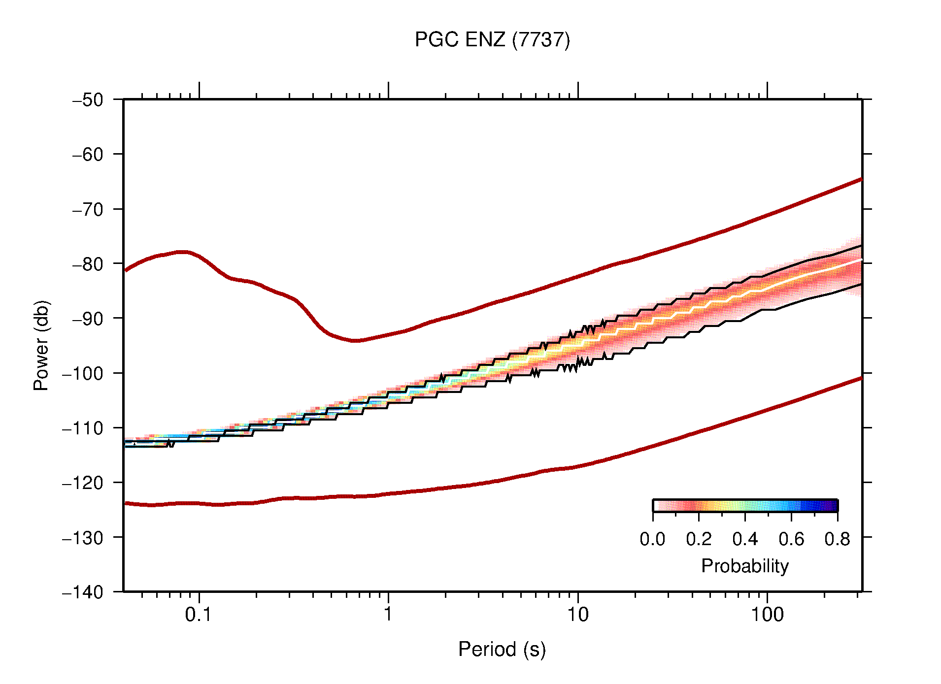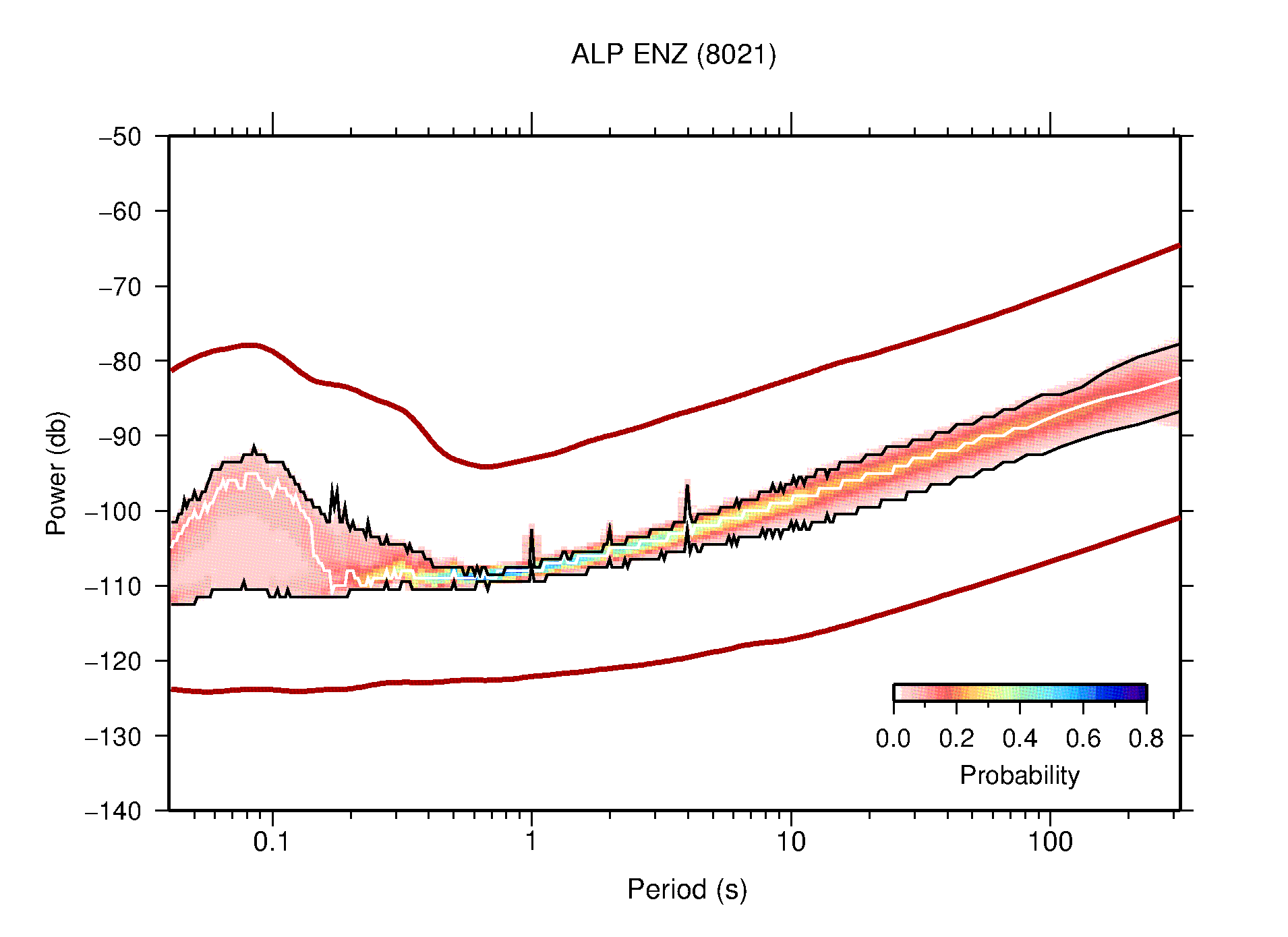 The following figures are full year PDFs for each of the 363 channels processed in this work. The same color scale is used thoughout. The black curves show 0.5 and 99.5 percentiles while the white curve shows the mode. The number of PSDs contributing to the PDF is shown in parentheses next to the station and channel names. The y-axes represent spectral acceleration amplitudes in units of db relative to 1 m/s2 [10log10(m2/s4/Hz)]. The five channels that were not included in the network PDF because of known problems were CCUT ENE,N,Z; HCSU ENE; and HER ENE.