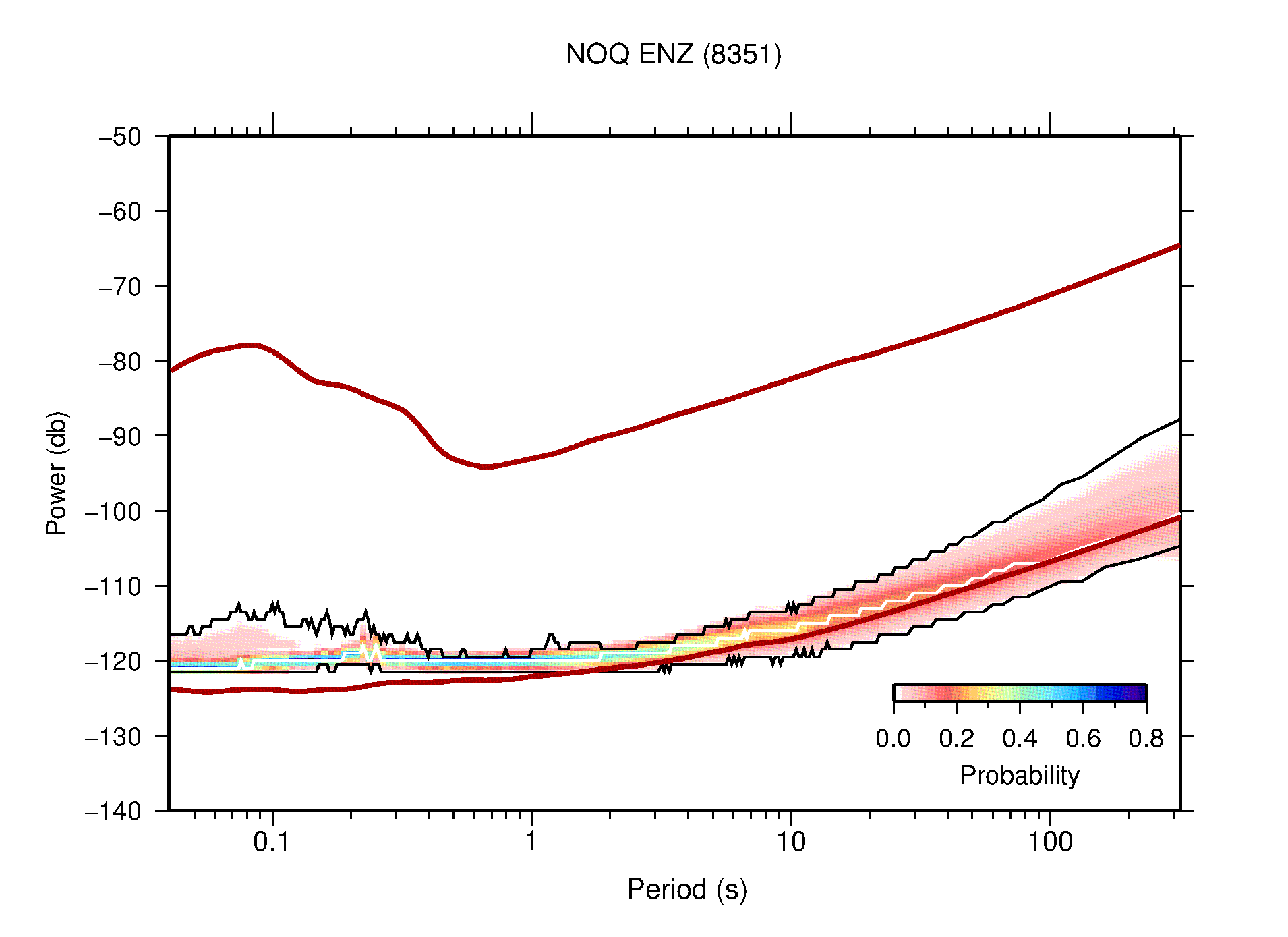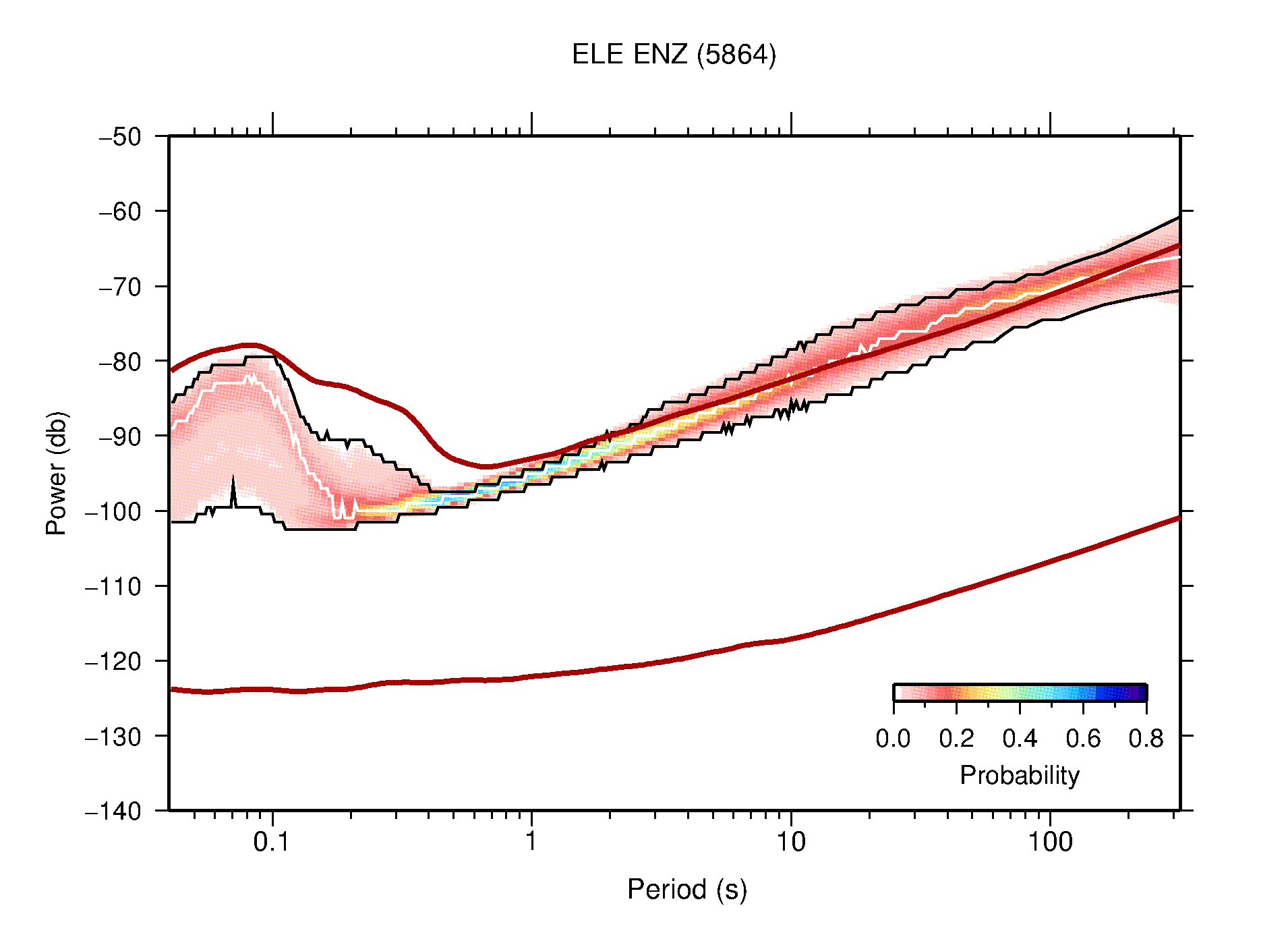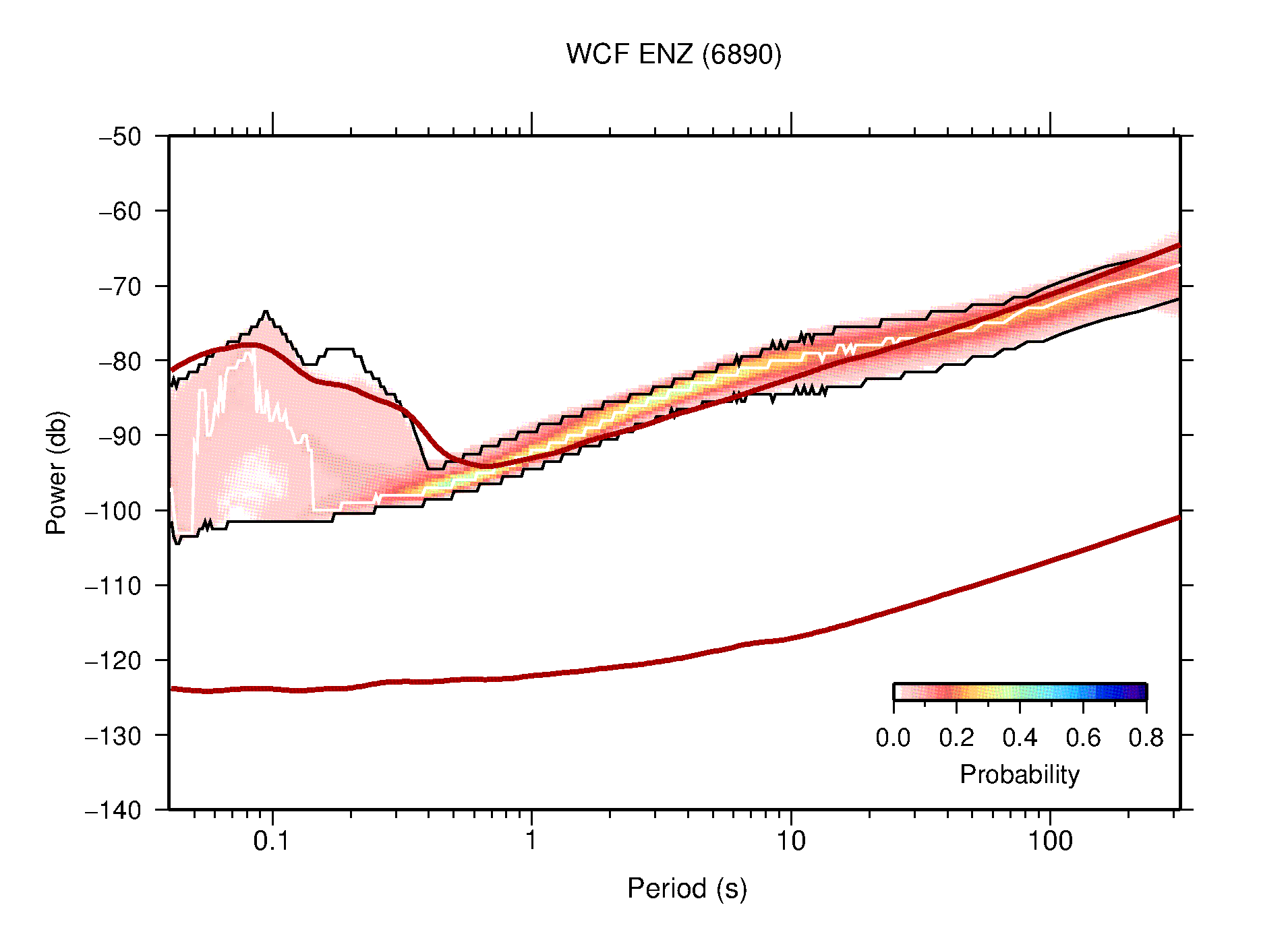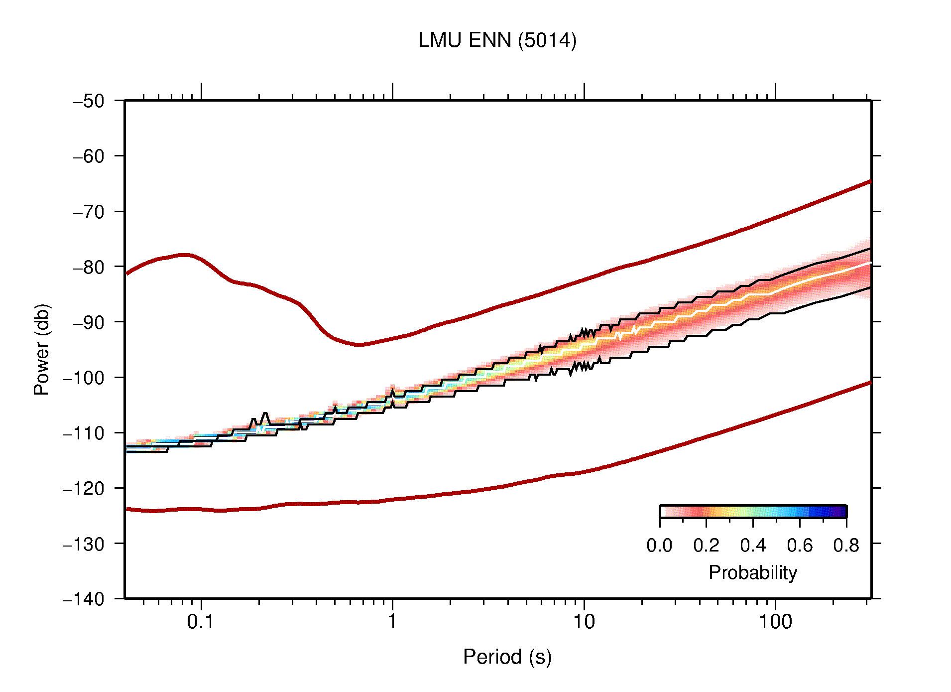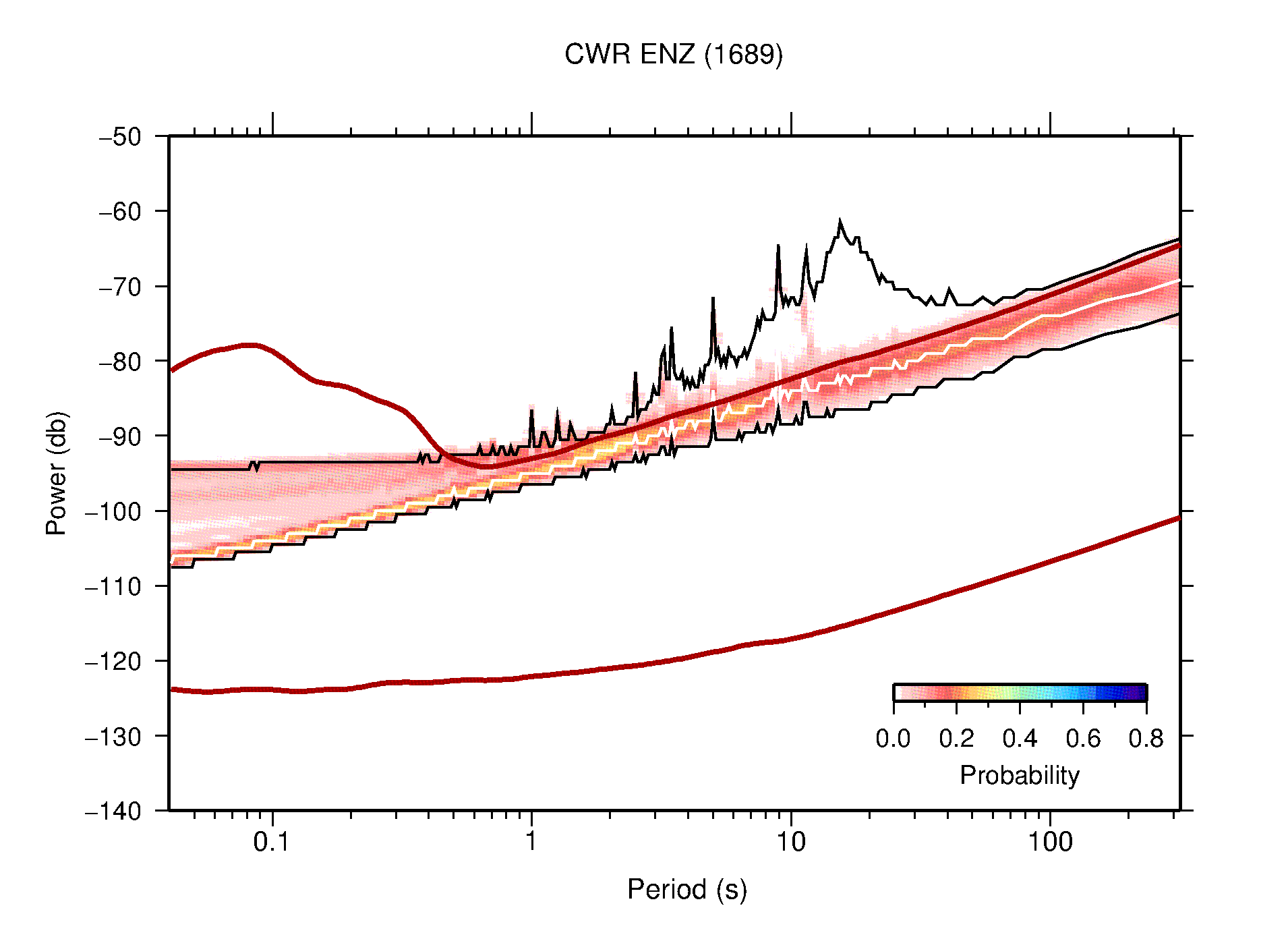 The following figures are full year PDFs for each of the 363 channels processed in this work. The same color scale is used thoughout. The black curves show 0.5 and 99.5 percentiles while the white curve shows the mode. The number of PSDs contributing to the PDF is shown in parentheses next to the station and channel names. The y-axes represent spectral acceleration amplitudes in units of db relative to 1 m/s2 [10log10(m2/s4/Hz)]. The five channels that were not included in the network PDF because of known problems were CCUT ENE,N,Z; HCSU ENE; and HER ENE.