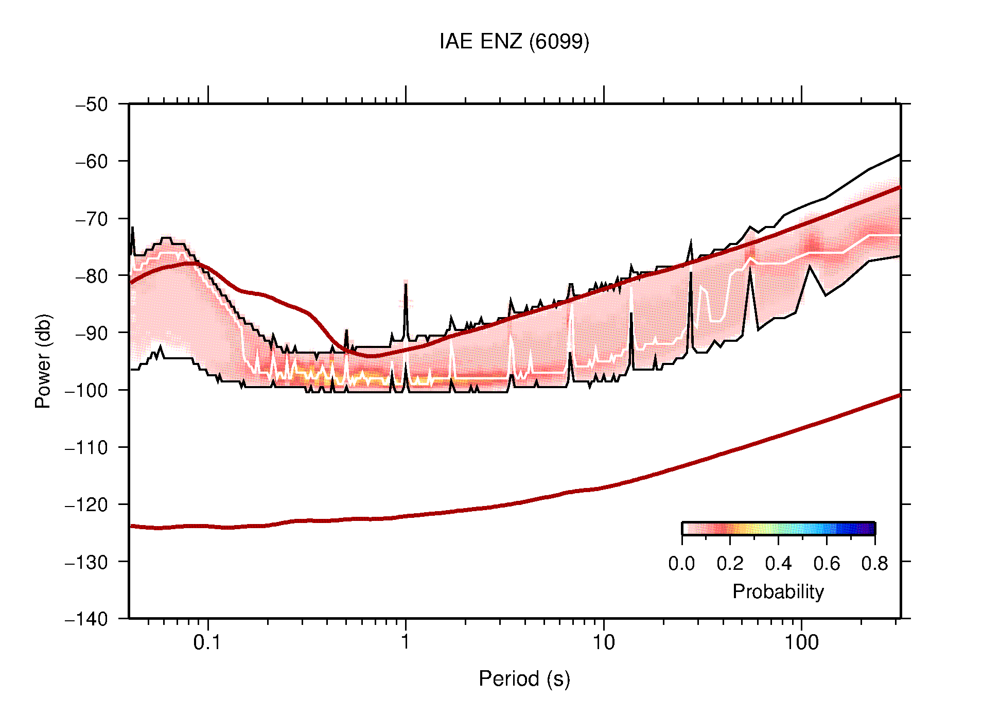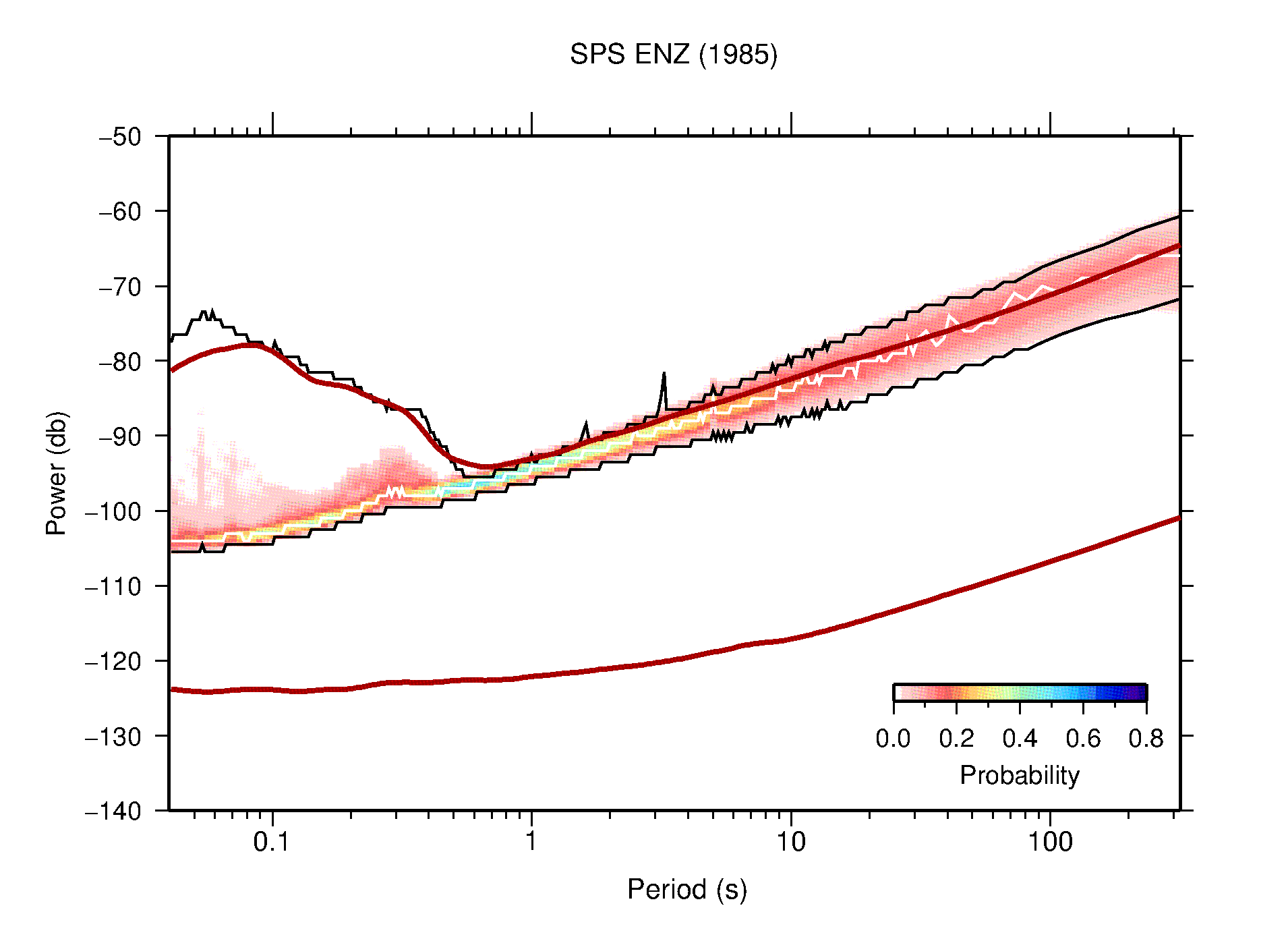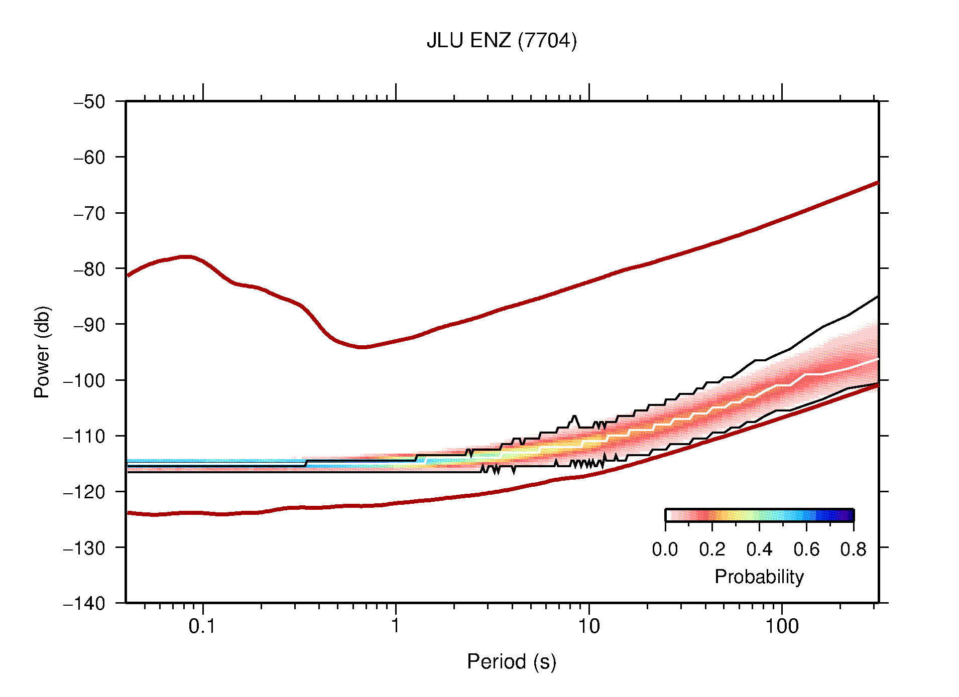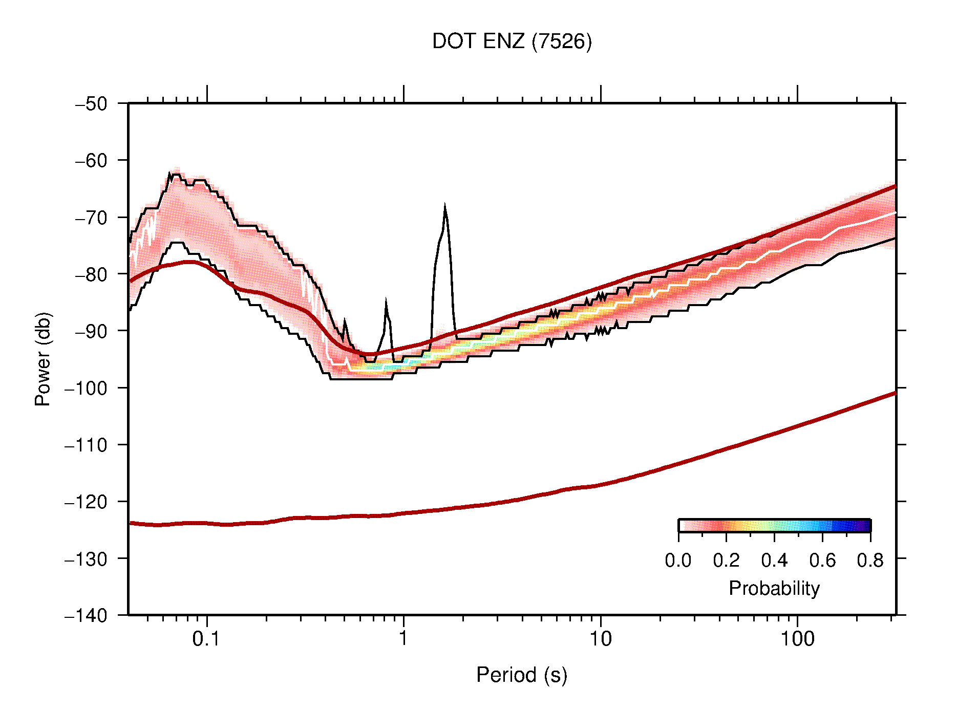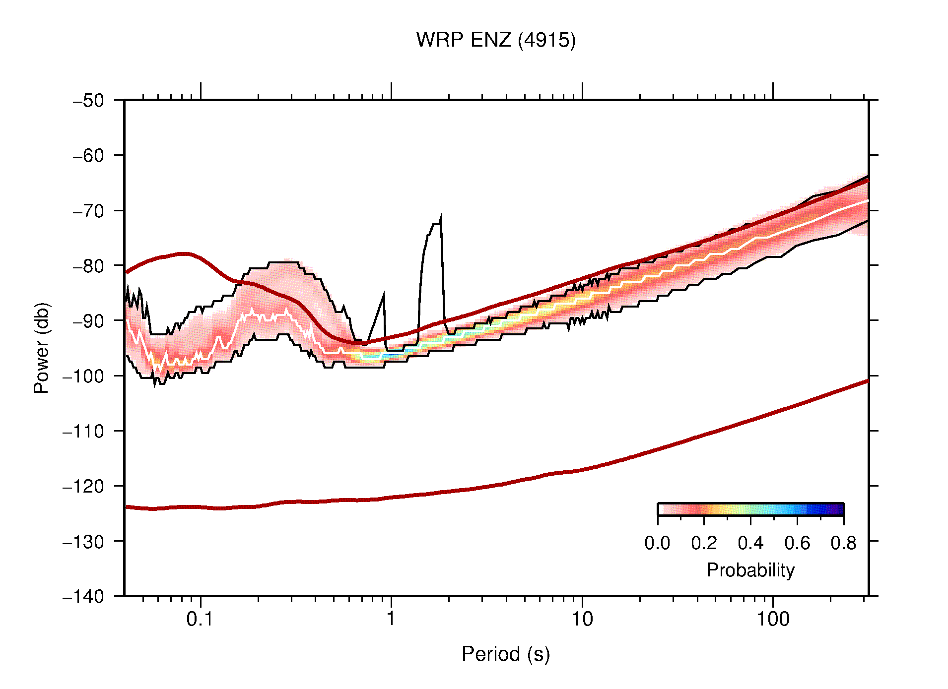 The following figures are full year PDFs for each of the 363 channels processed in this work. The same color scale is used thoughout. The black curves show 0.5 and 99.5 percentiles while the white curve shows the mode. The number of PSDs contributing to the PDF is shown in parentheses next to the station and channel names. The y-axes represent spectral acceleration amplitudes in units of db relative to 1 m/s2 [10log10(m2/s4/Hz)]. The five channels that were not included in the network PDF because of known problems were CCUT ENE,N,Z; HCSU ENE; and HER ENE.