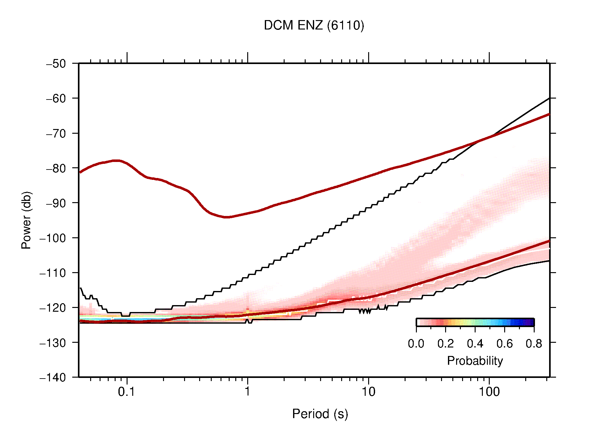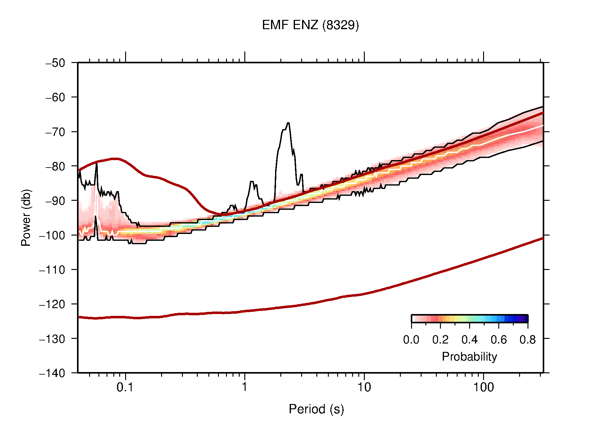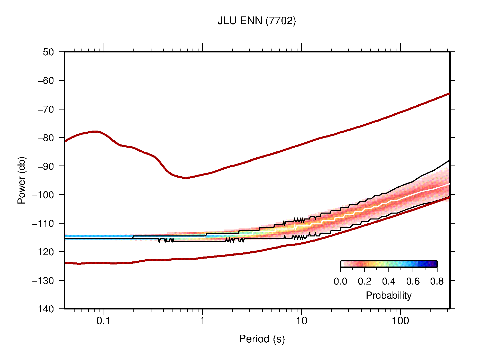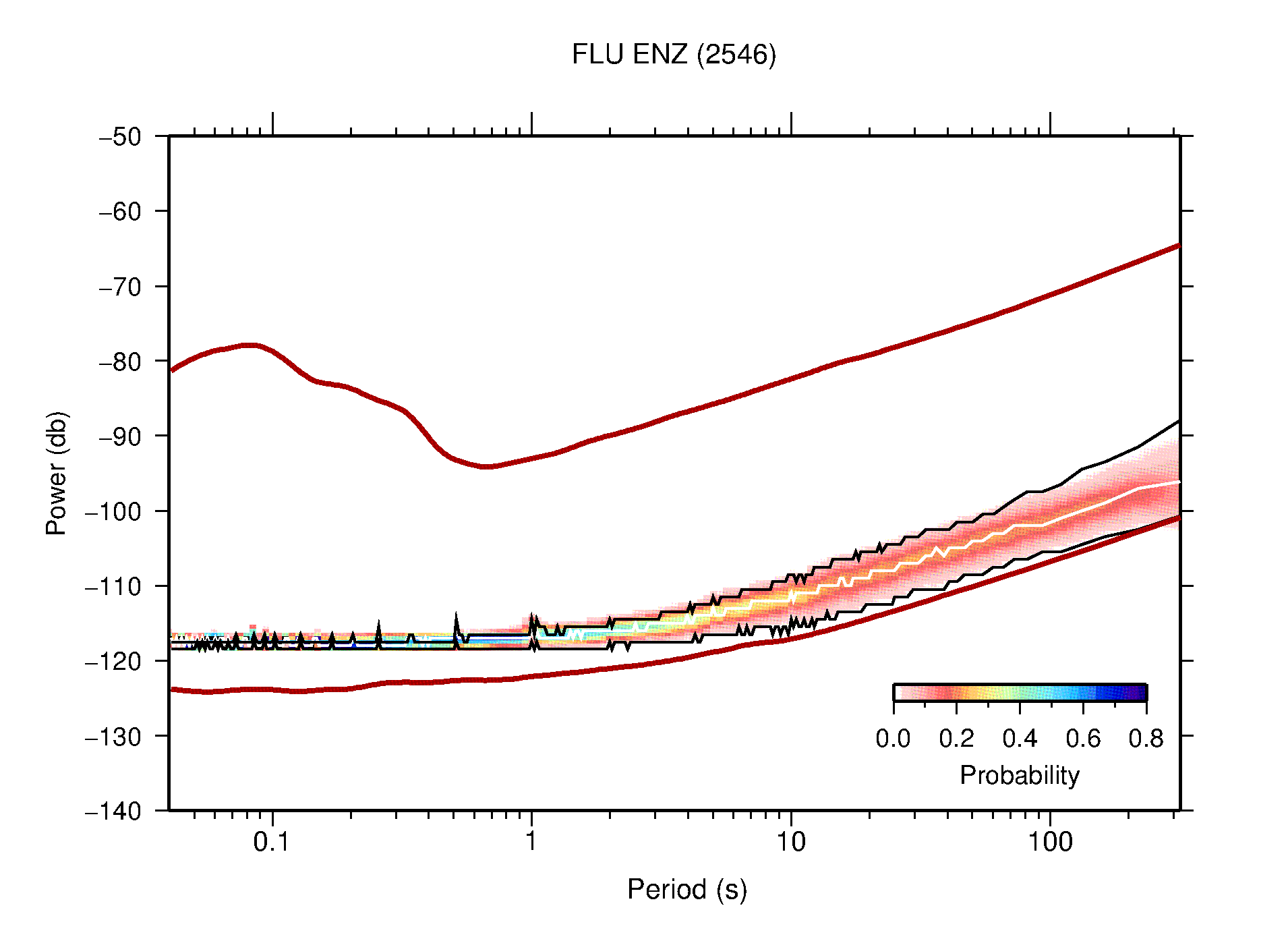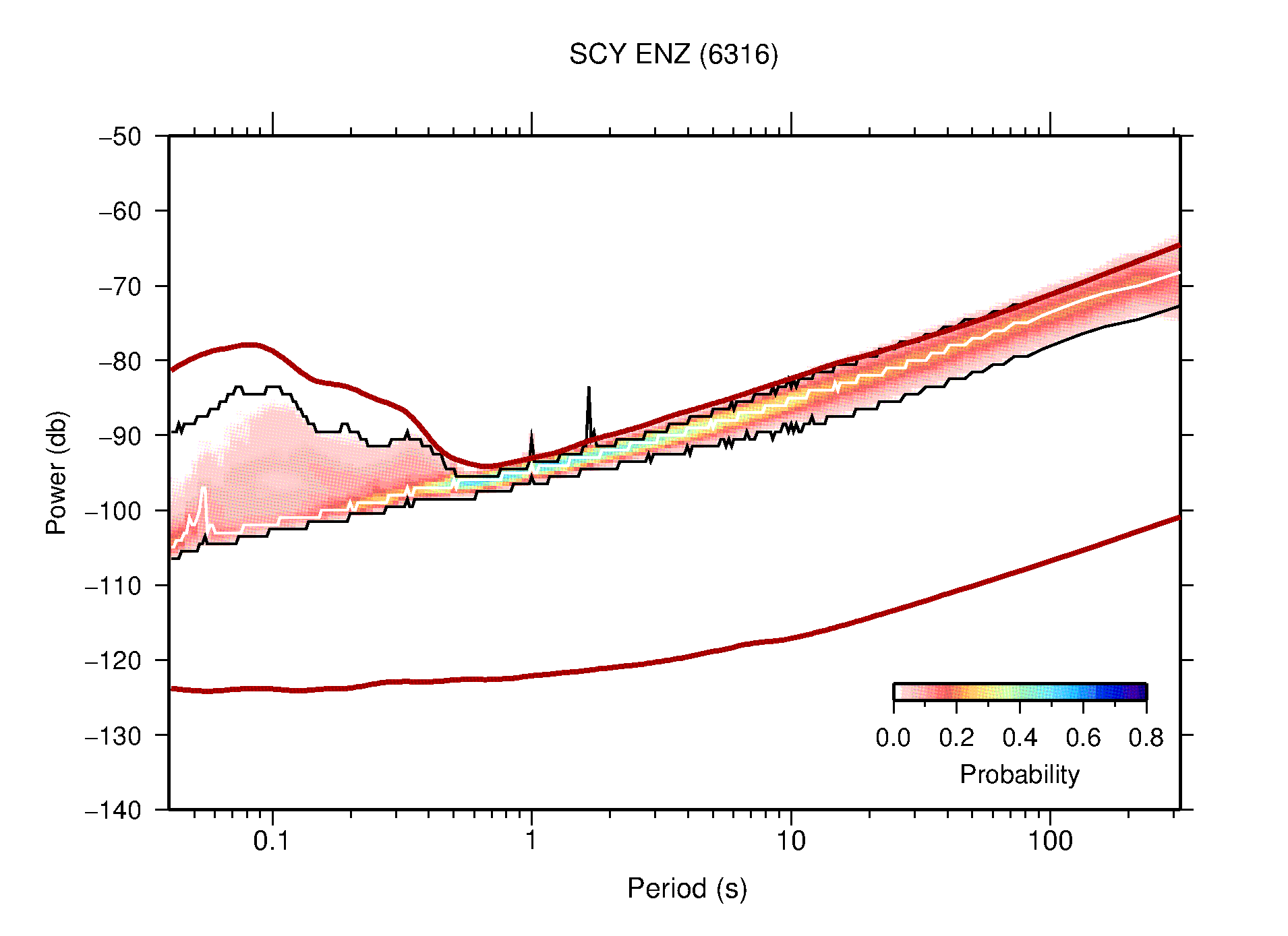 The following figures are full year PDFs for each of the 363 channels processed in this work. The same color scale is used thoughout. The black curves show 0.5 and 99.5 percentiles while the white curve shows the mode. The number of PSDs contributing to the PDF is shown in parentheses next to the station and channel names. The y-axes represent spectral acceleration amplitudes in units of db relative to 1 m/s2 [10log10(m2/s4/Hz)]. The five channels that were not included in the network PDF because of known problems were CCUT ENE,N,Z; HCSU ENE; and HER ENE.