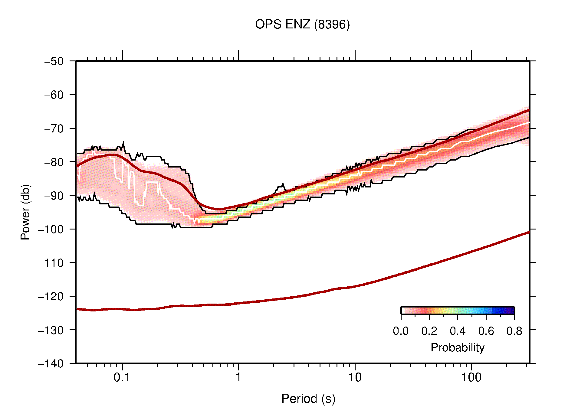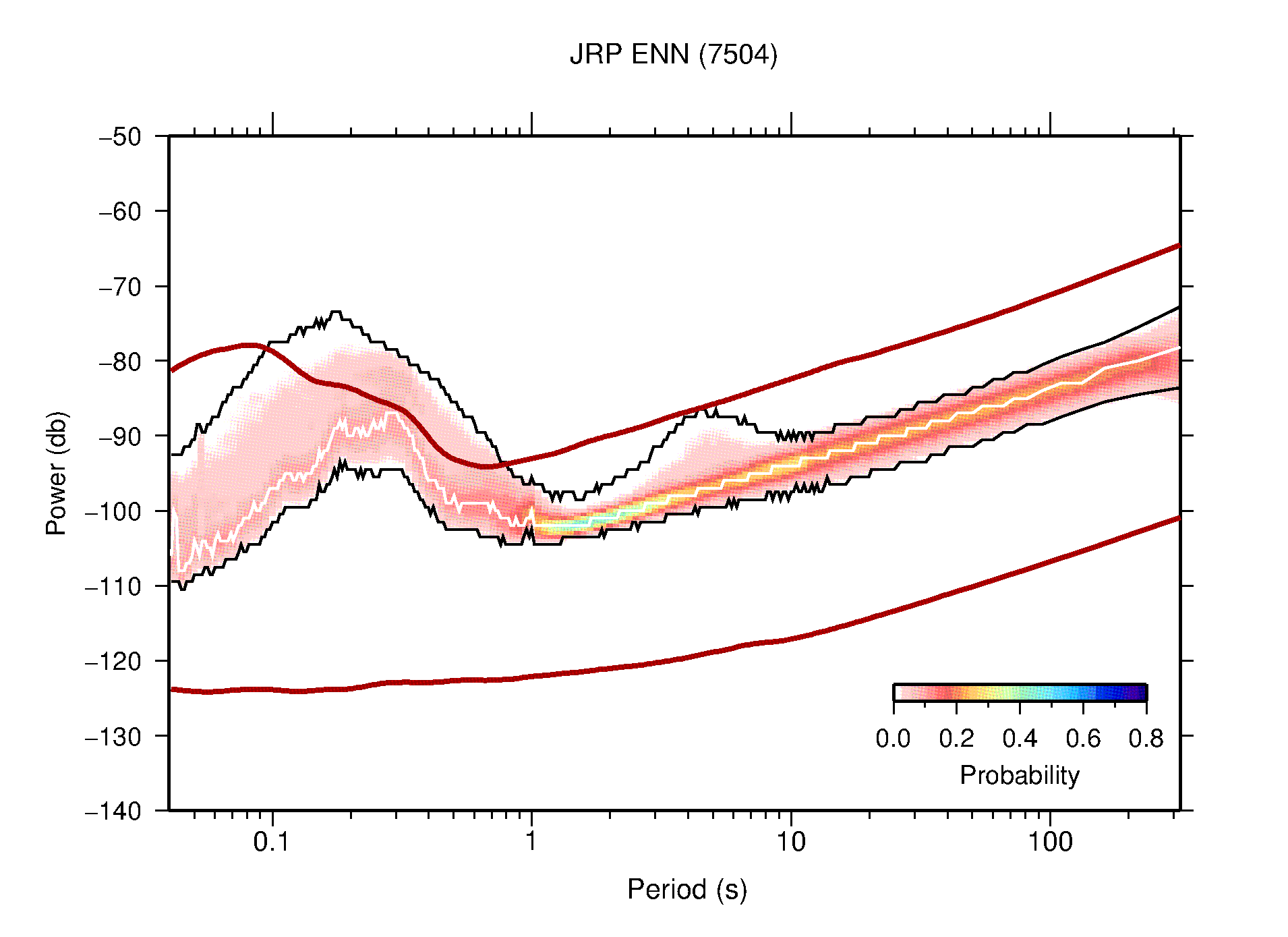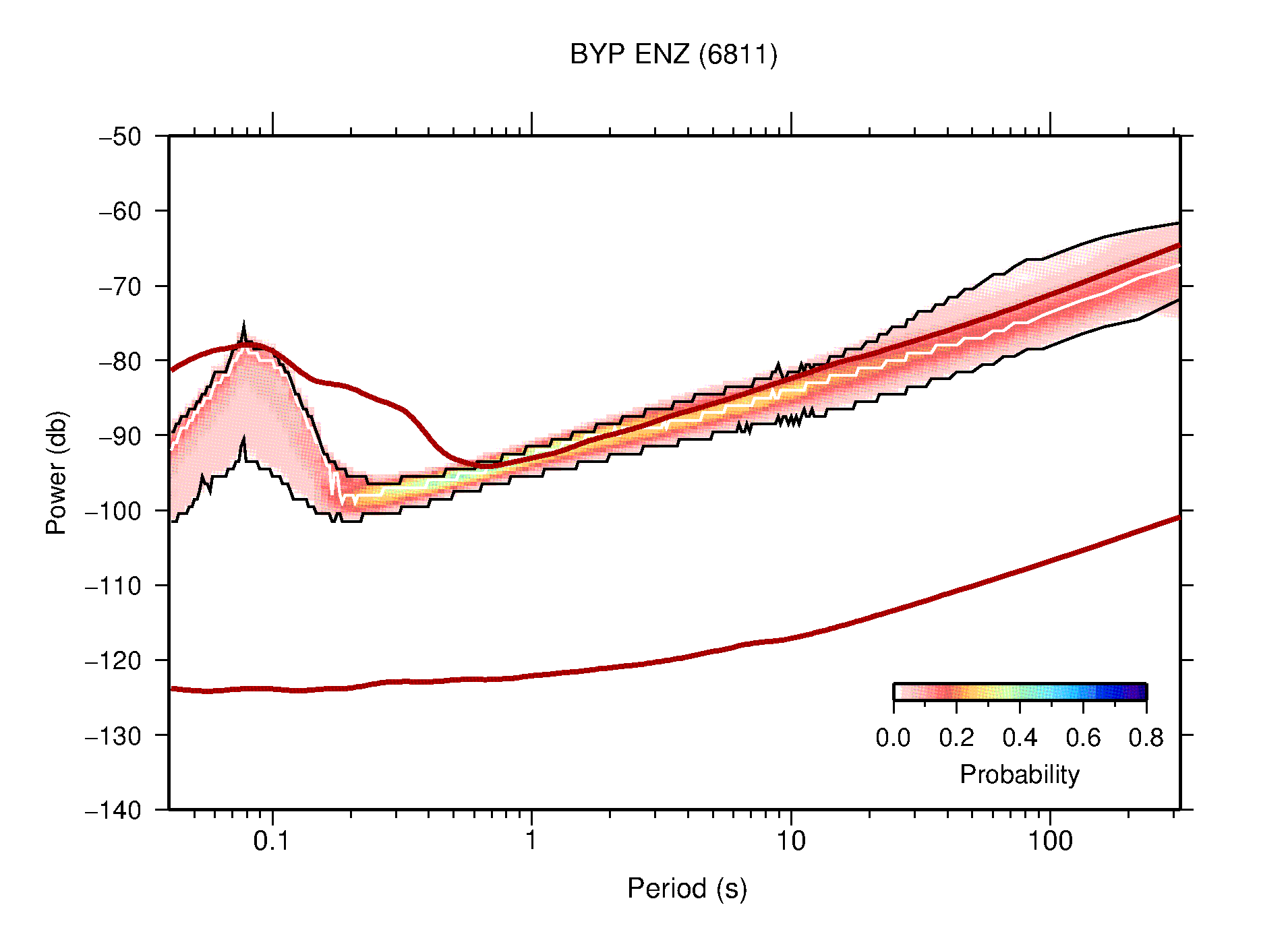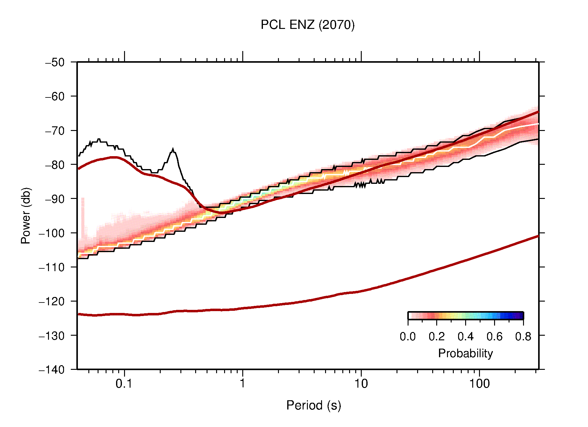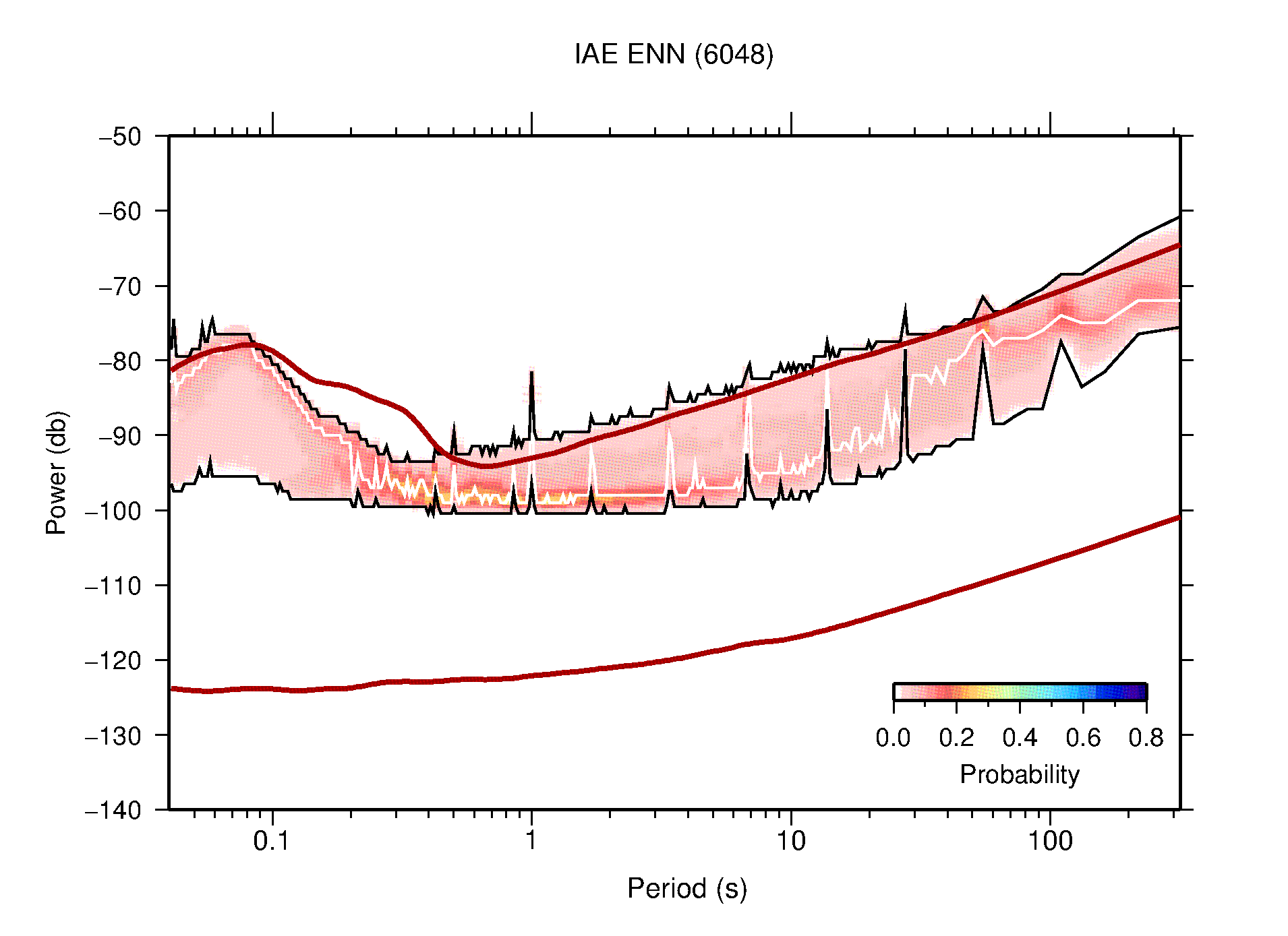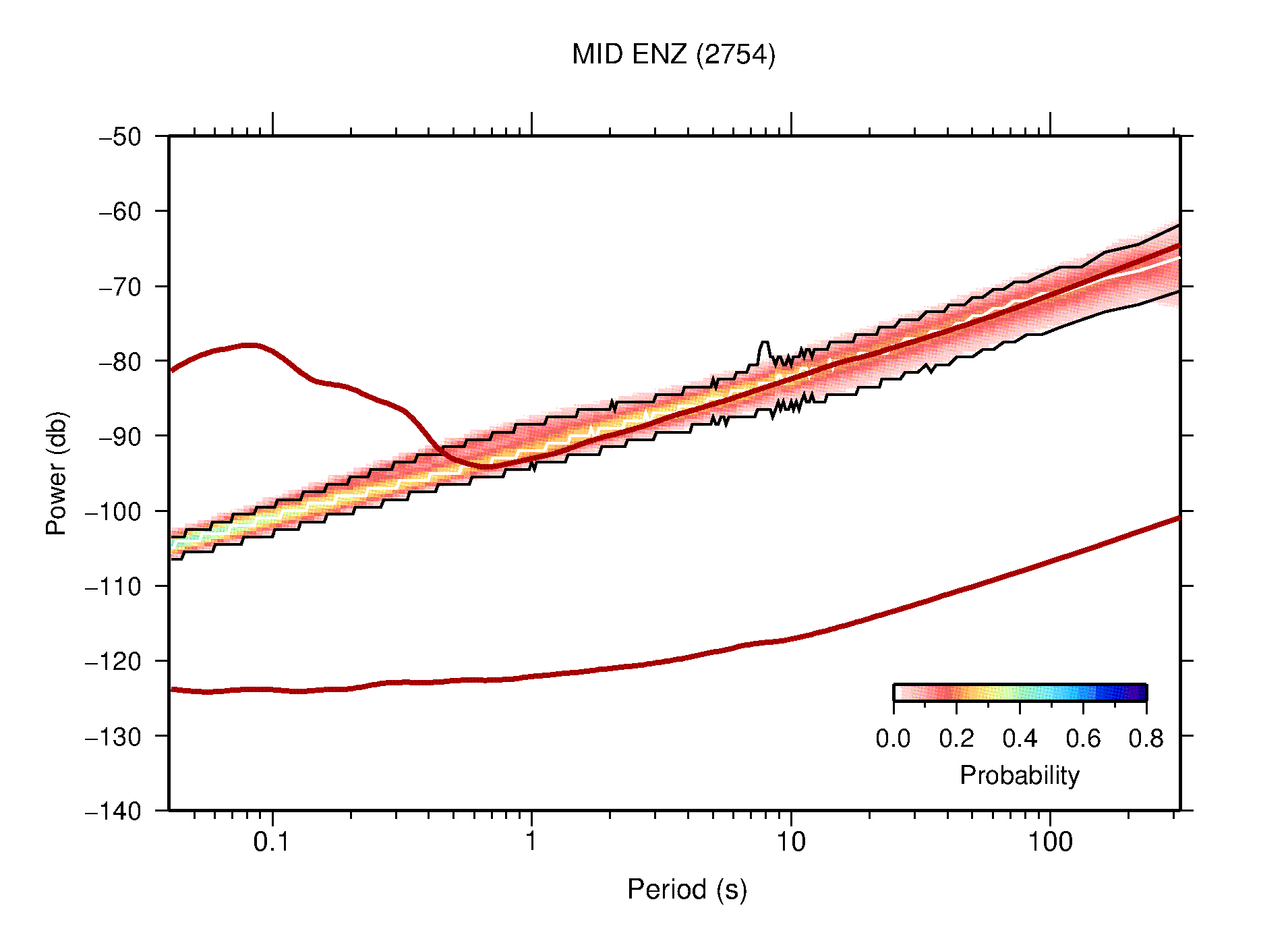 The following figures are full year PDFs for each of the 363 channels processed in this work. The same color scale is used thoughout. The black curves show 0.5 and 99.5 percentiles while the white curve shows the mode. The number of PSDs contributing to the PDF is shown in parentheses next to the station and channel names. The y-axes represent spectral acceleration amplitudes in units of db relative to 1 m/s2 [10log10(m2/s4/Hz)]. The five channels that were not included in the network PDF because of known problems were CCUT ENE,N,Z; HCSU ENE; and HER ENE.