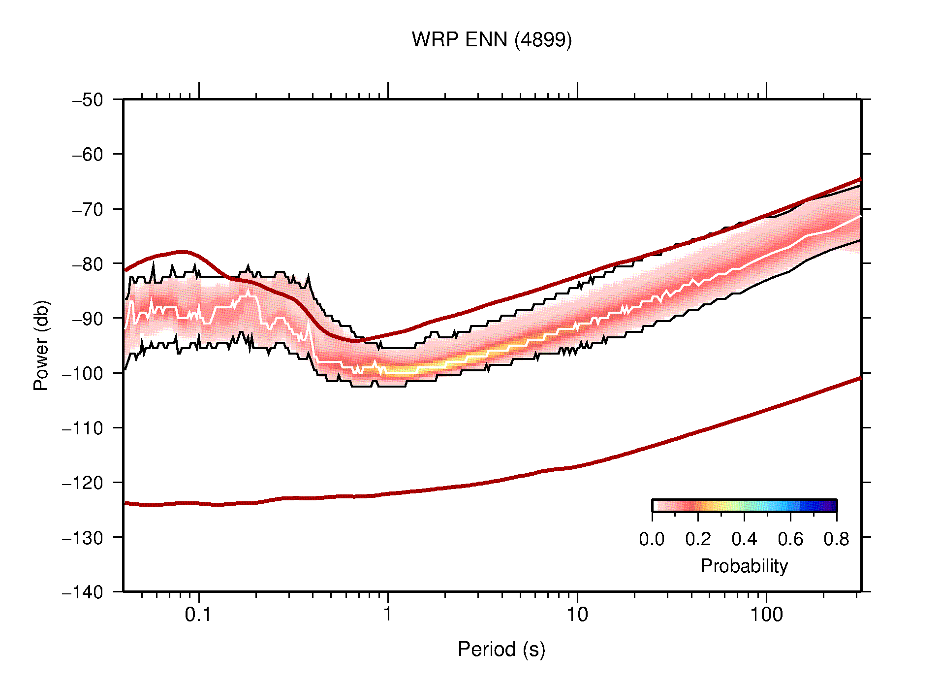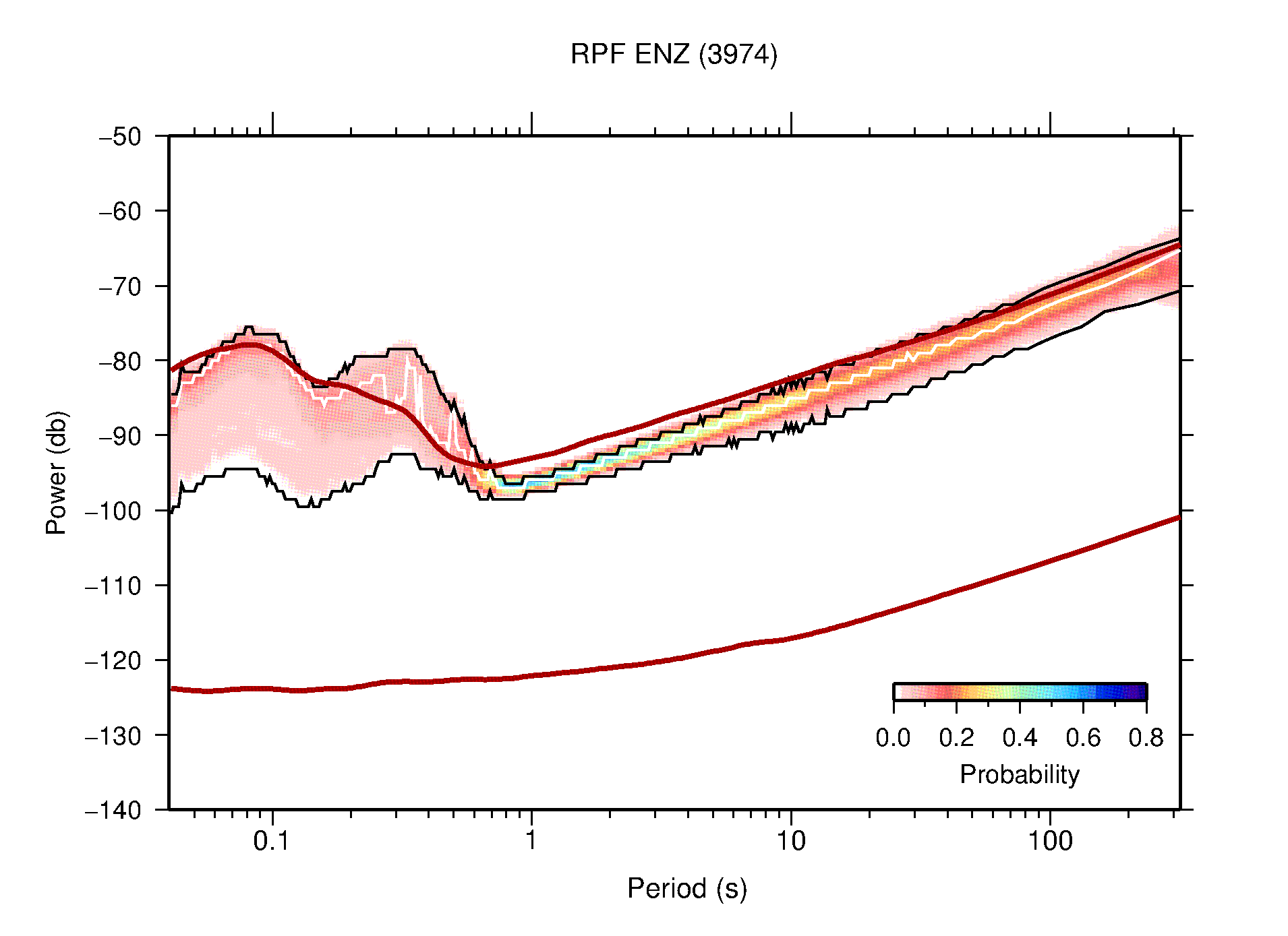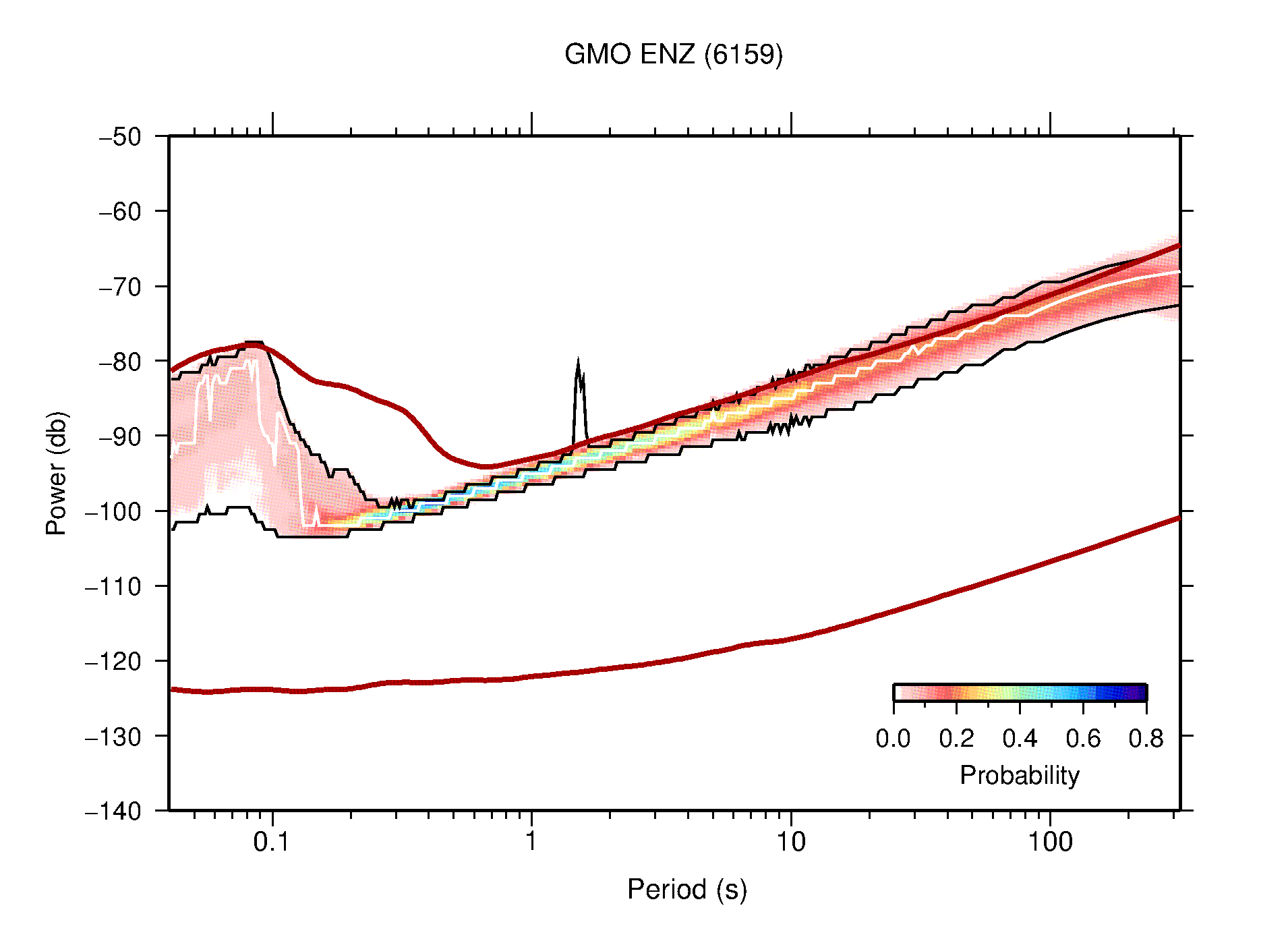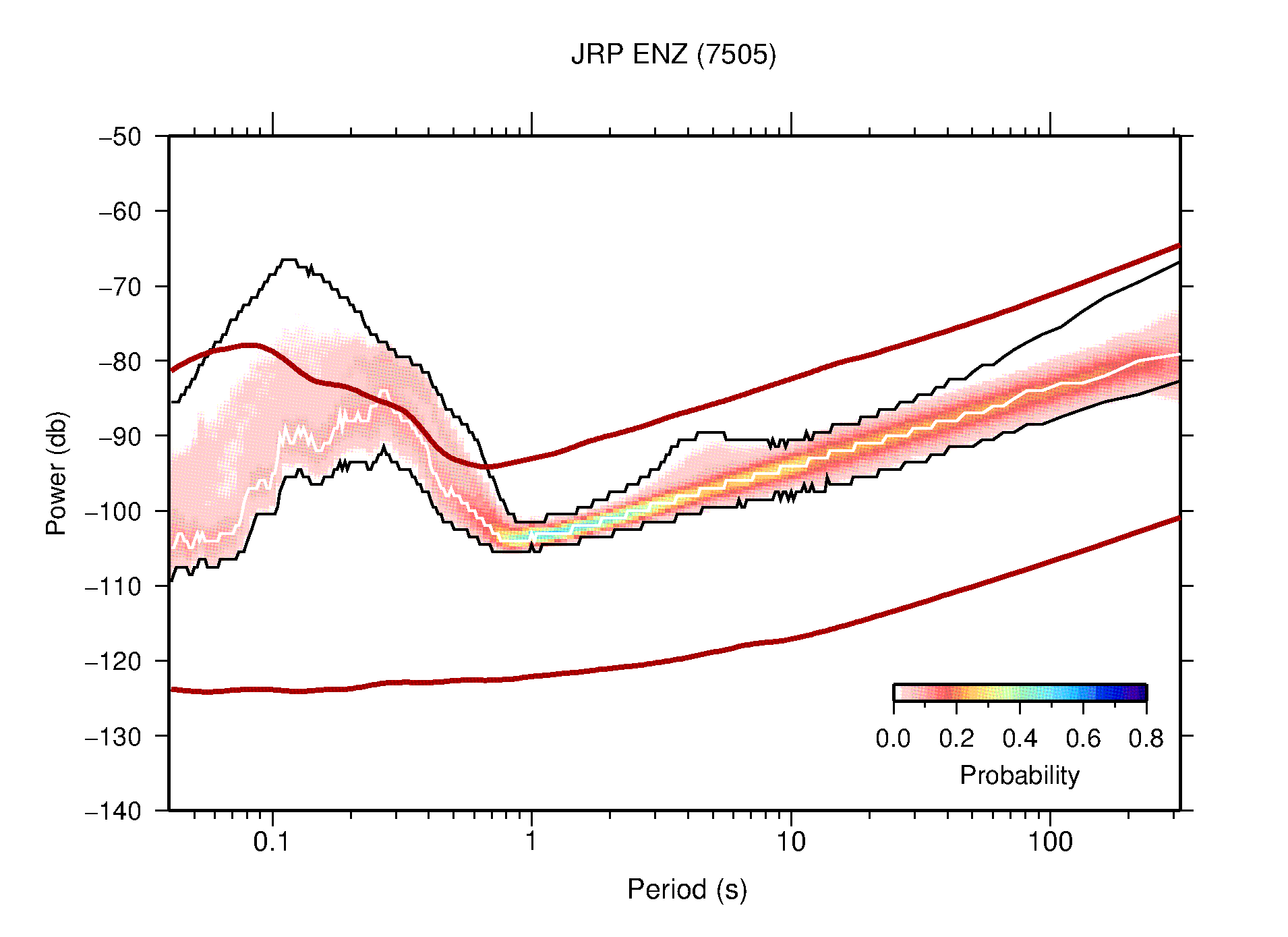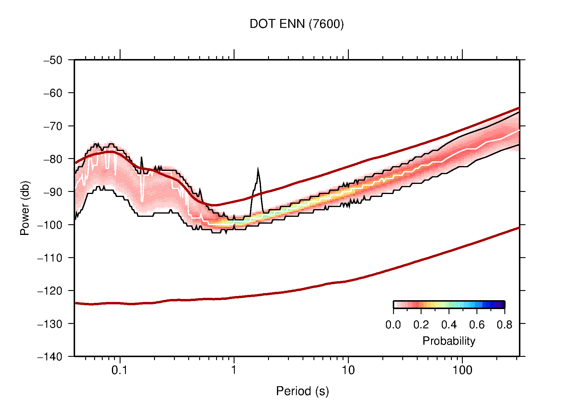 The following figures are full year PDFs for each of the 363 channels processed in this work. The same color scale is used thoughout. The black curves show 0.5 and 99.5 percentiles while the white curve shows the mode. The number of PSDs contributing to the PDF is shown in parentheses next to the station and channel names. The y-axes represent spectral acceleration amplitudes in units of db relative to 1 m/s2 [10log10(m2/s4/Hz)]. The five channels that were not included in the network PDF because of known problems were CCUT ENE,N,Z; HCSU ENE; and HER ENE.