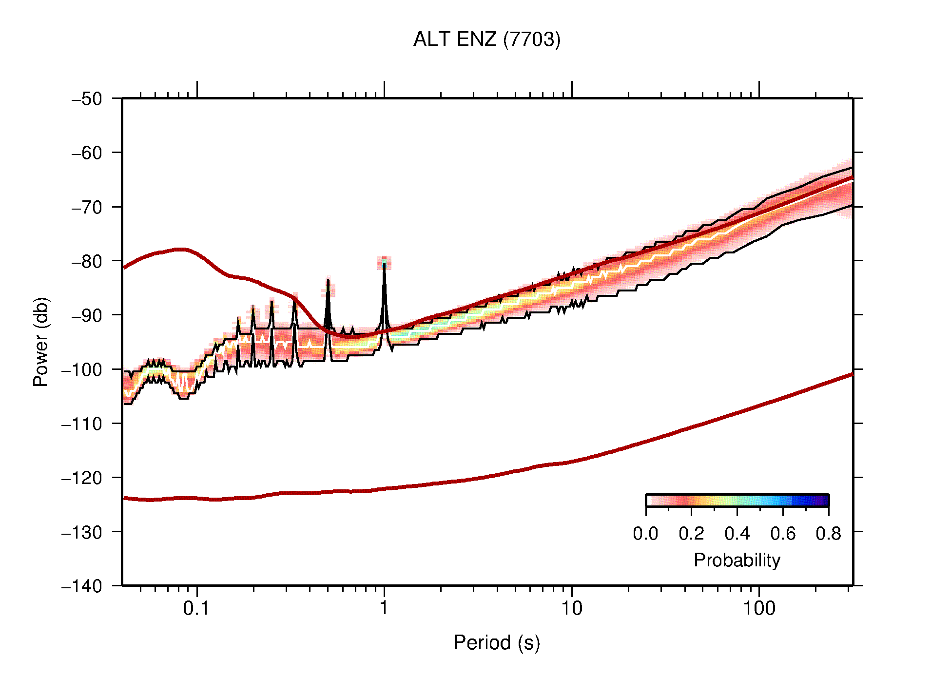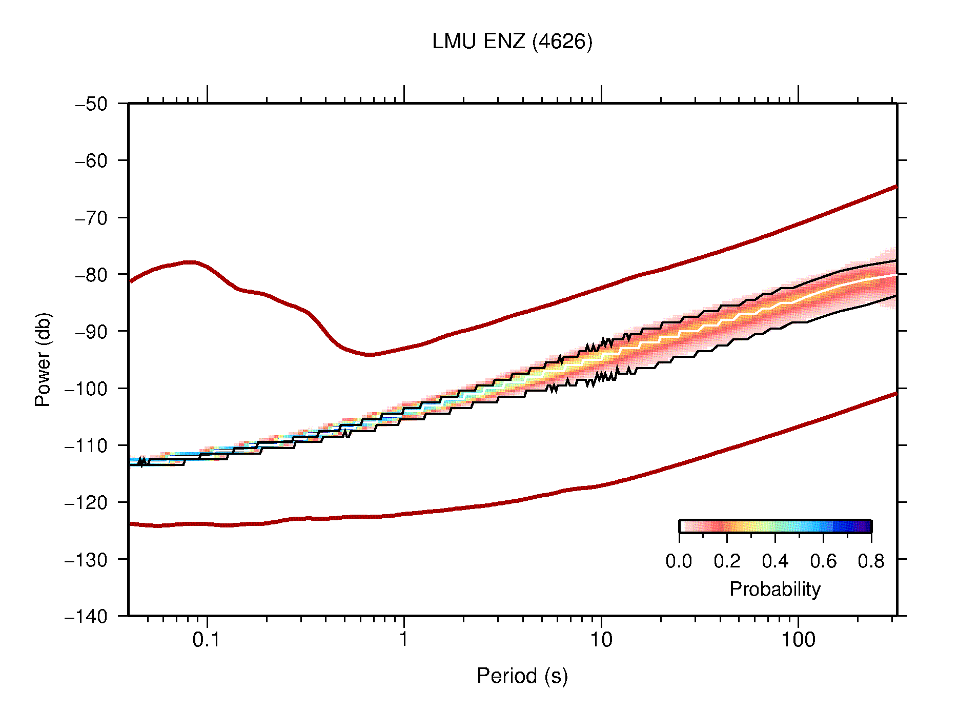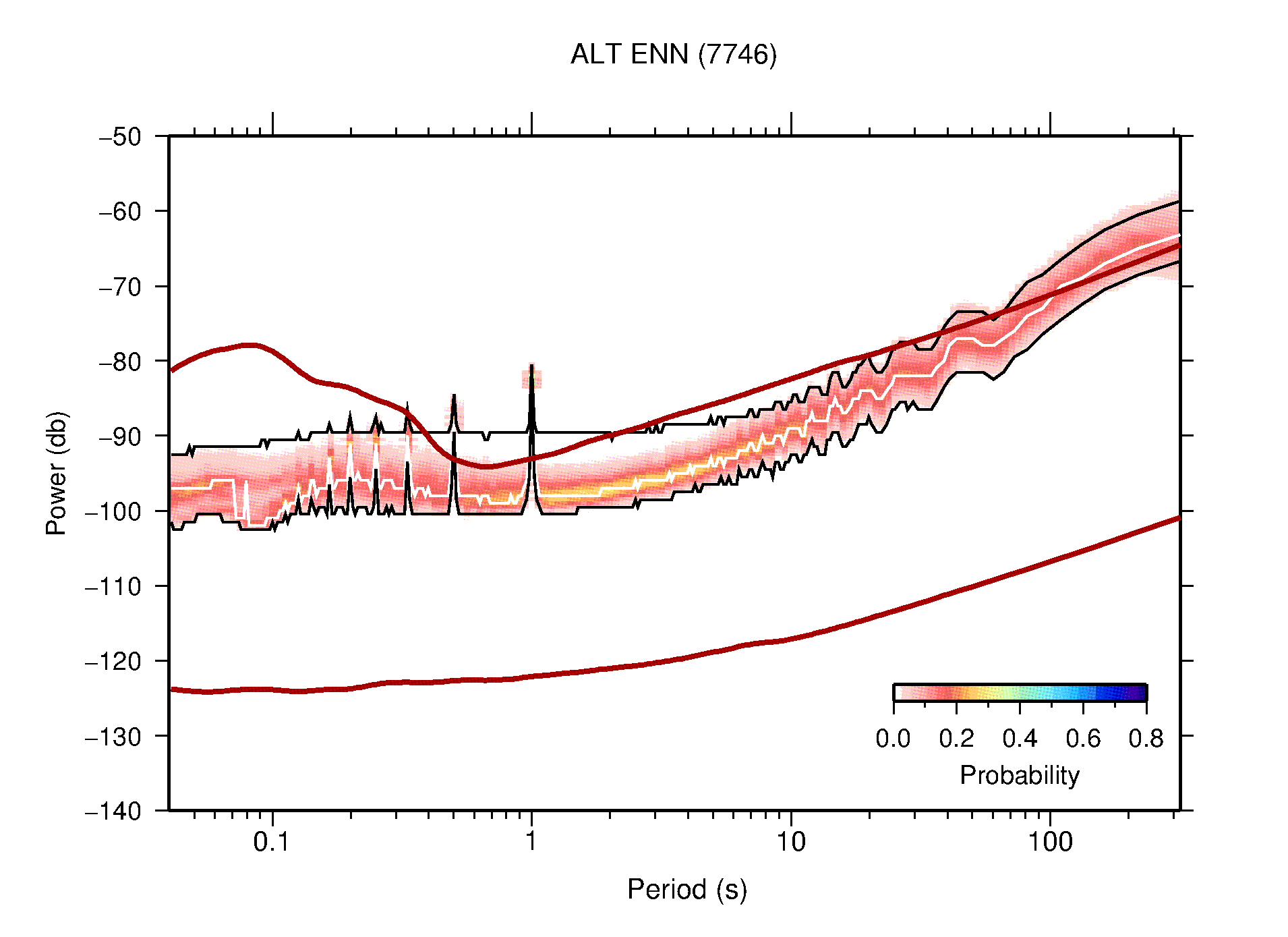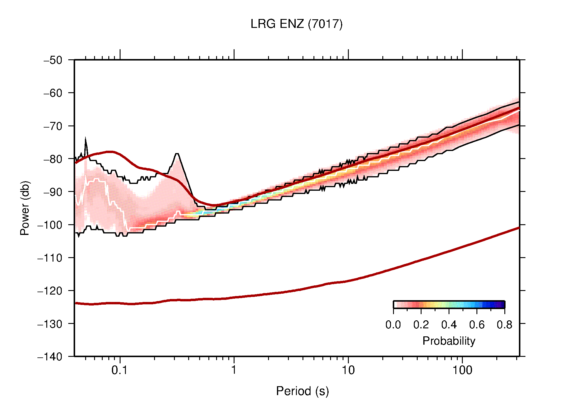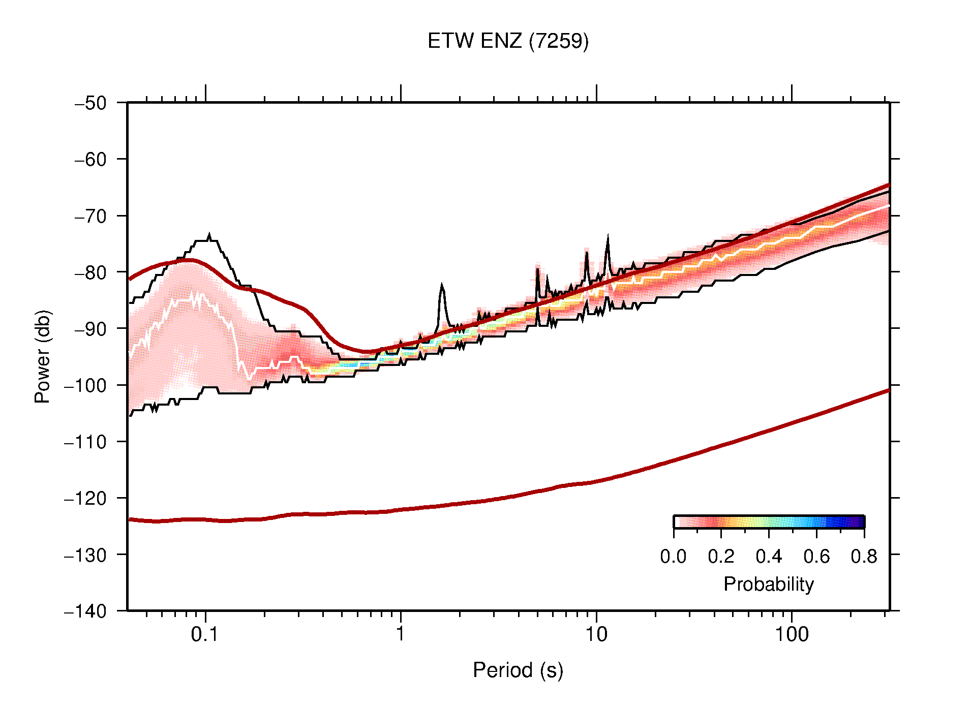 The following figures are full year PDFs for each of the 363 channels processed in this work. The same color scale is used thoughout. The black curves show 0.5 and 99.5 percentiles while the white curve shows the mode. The number of PSDs contributing to the PDF is shown in parentheses next to the station and channel names. The y-axes represent spectral acceleration amplitudes in units of db relative to 1 m/s2 [10log10(m2/s4/Hz)]. The five channels that were not included in the network PDF because of known problems were CCUT ENE,N,Z; HCSU ENE; and HER ENE.